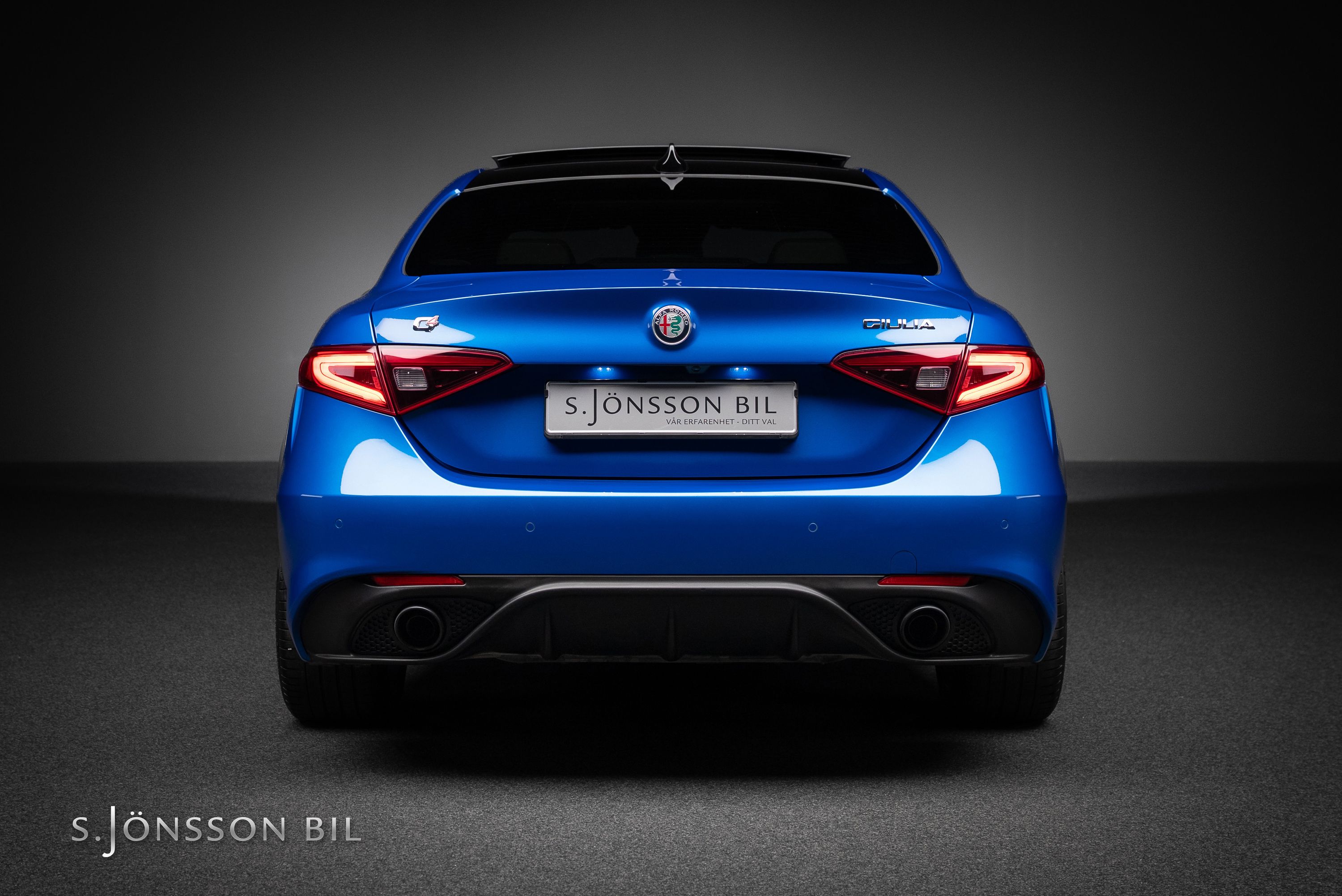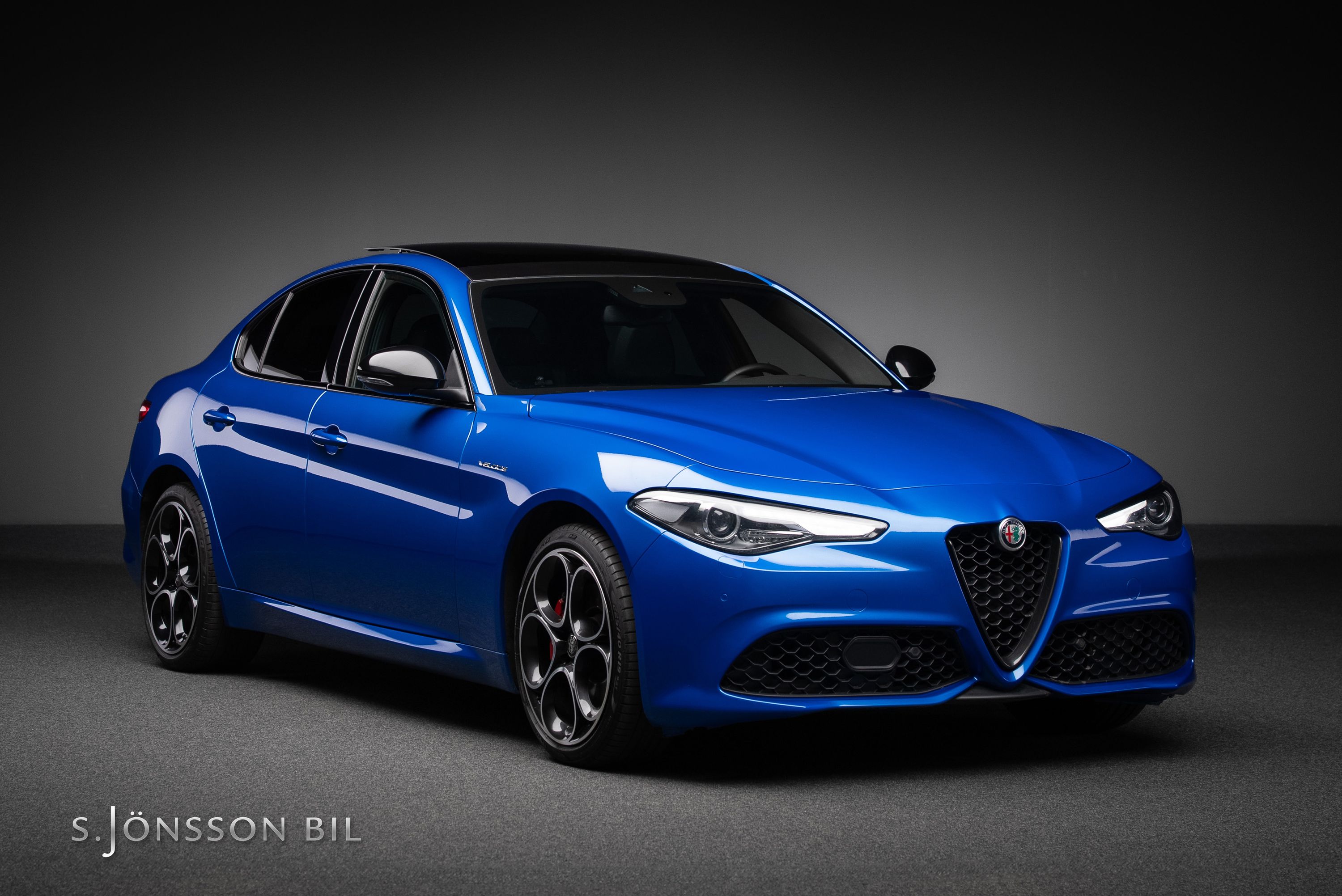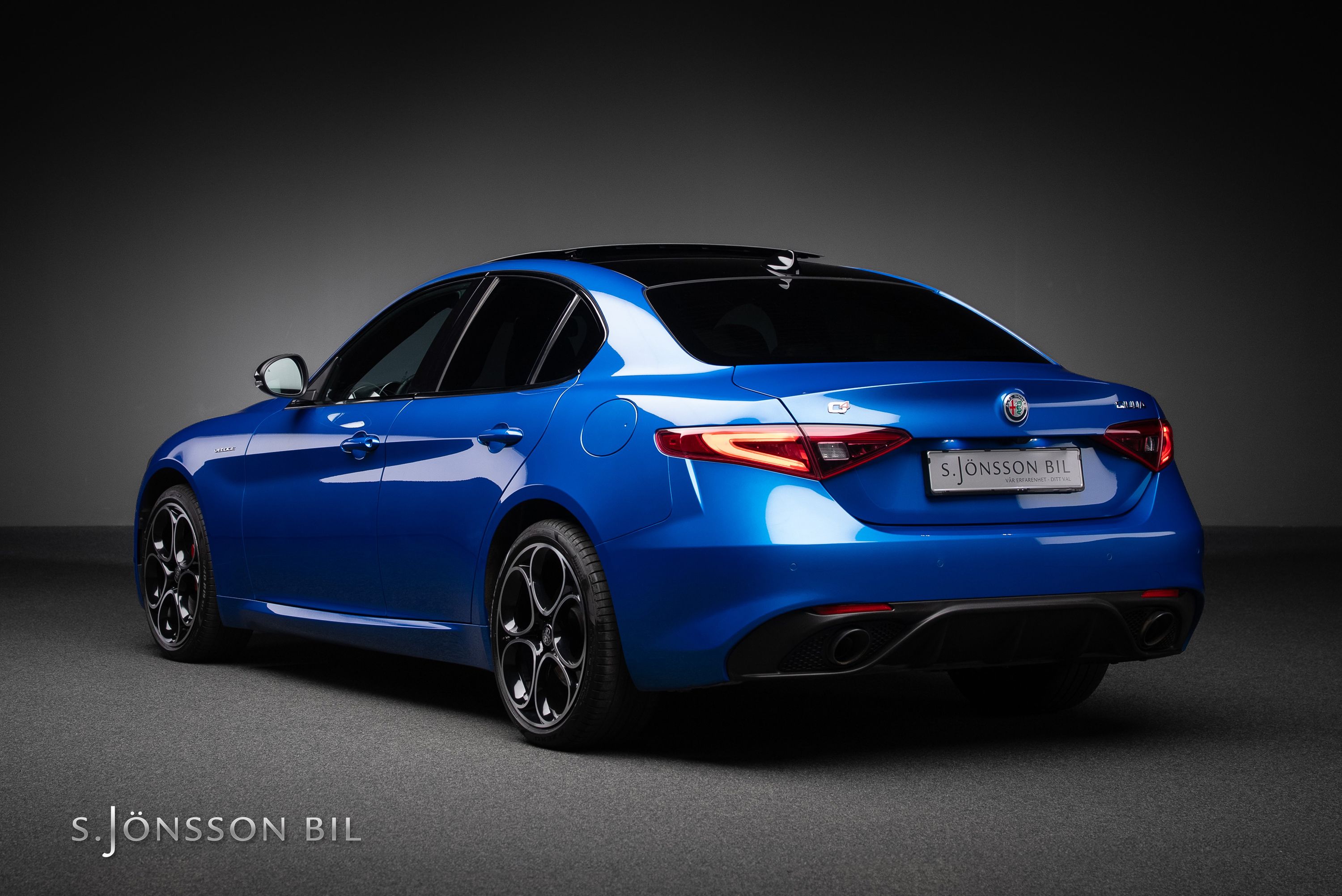 Alfa Romeo Giulia Veloce Q4 i facelift-utförande. Exteriör i fin Misanoblå metallic med elektriskt inställbara Veloce sportstolar i svart helläder samt de karaktäristiska Alfa Sport 19”- lättmetallfälgarna. Under huven hittar vi en 2-liters turbomatad bensinmotor med 280hk. Kraften skickas till alla fyra hjulen via en 8-växlad automatlåda. 0-100 km/h avverkas på dryga 5,2 sek. I enlighet med Alfa Romeos traditioner erbjuder Giulia Veloce Q4 en fantastisk väghållning och körglädje blandad med italiensk skönhet - som bara en Alfa kan ge.
