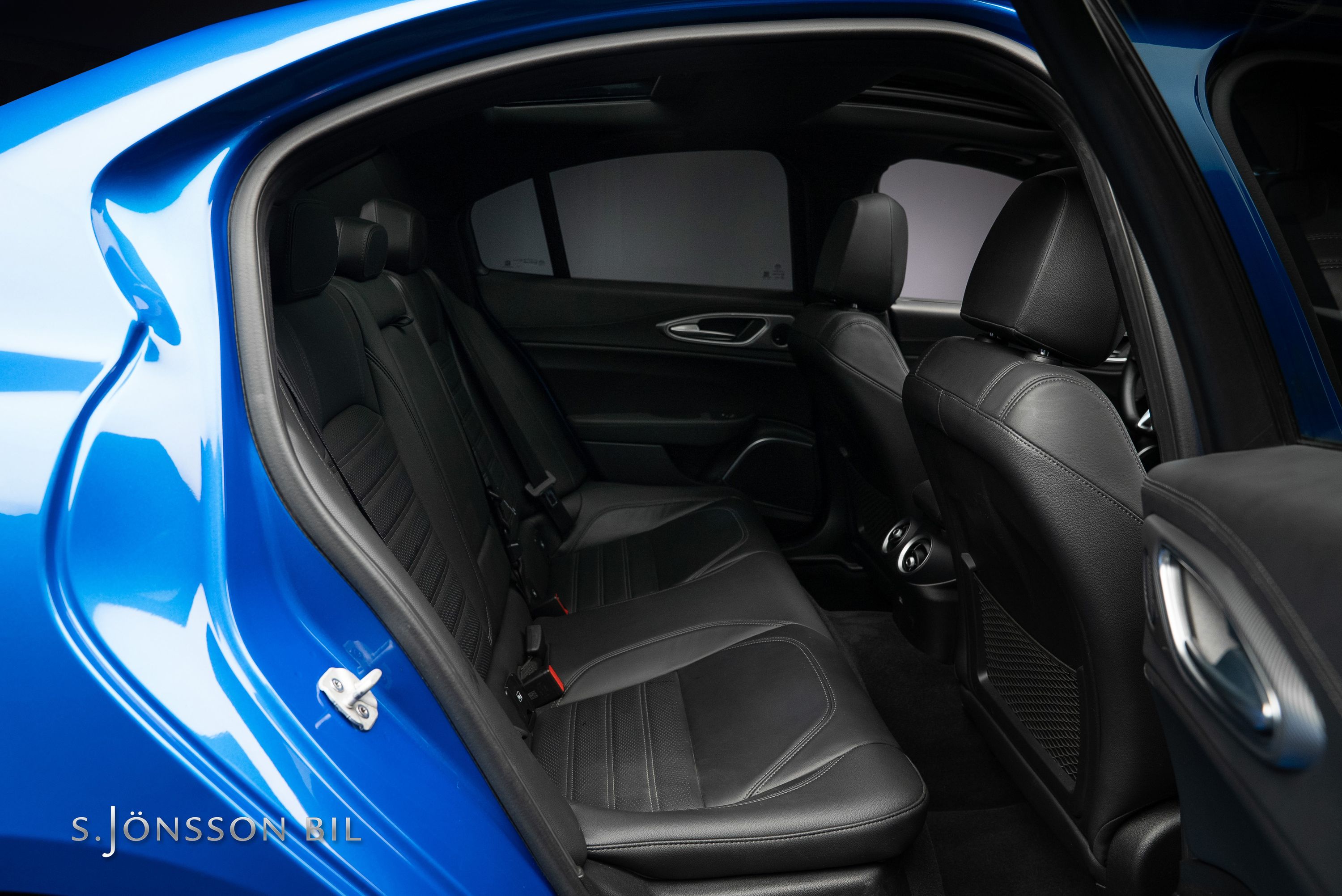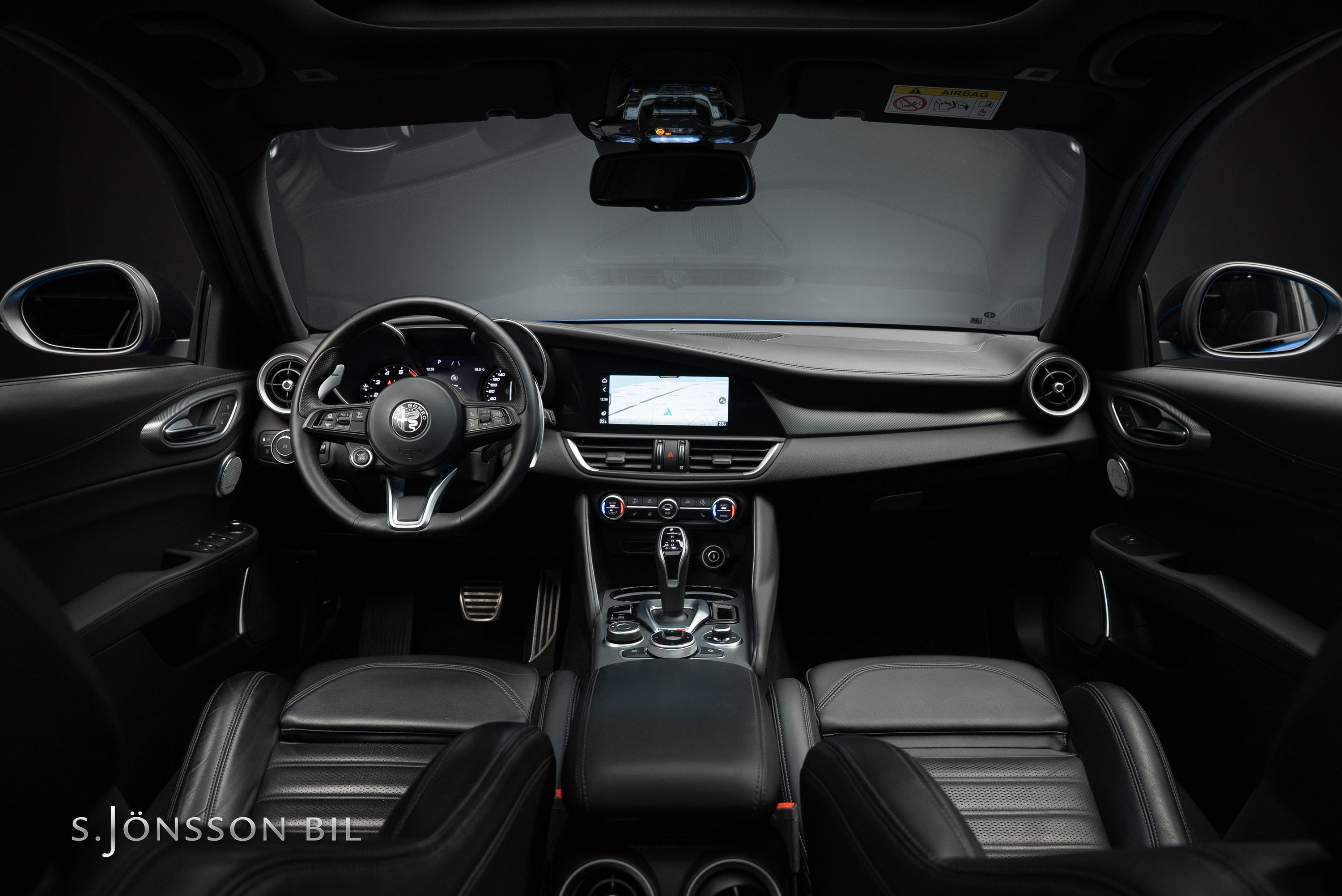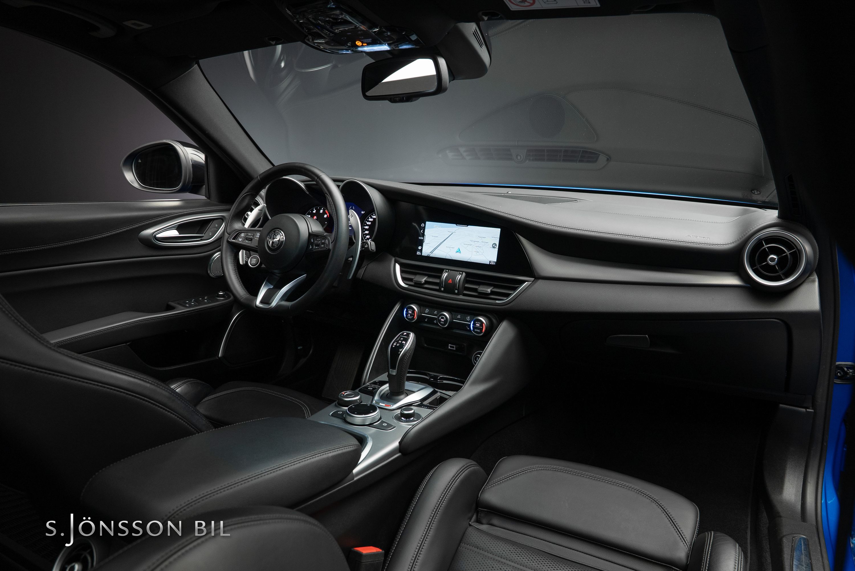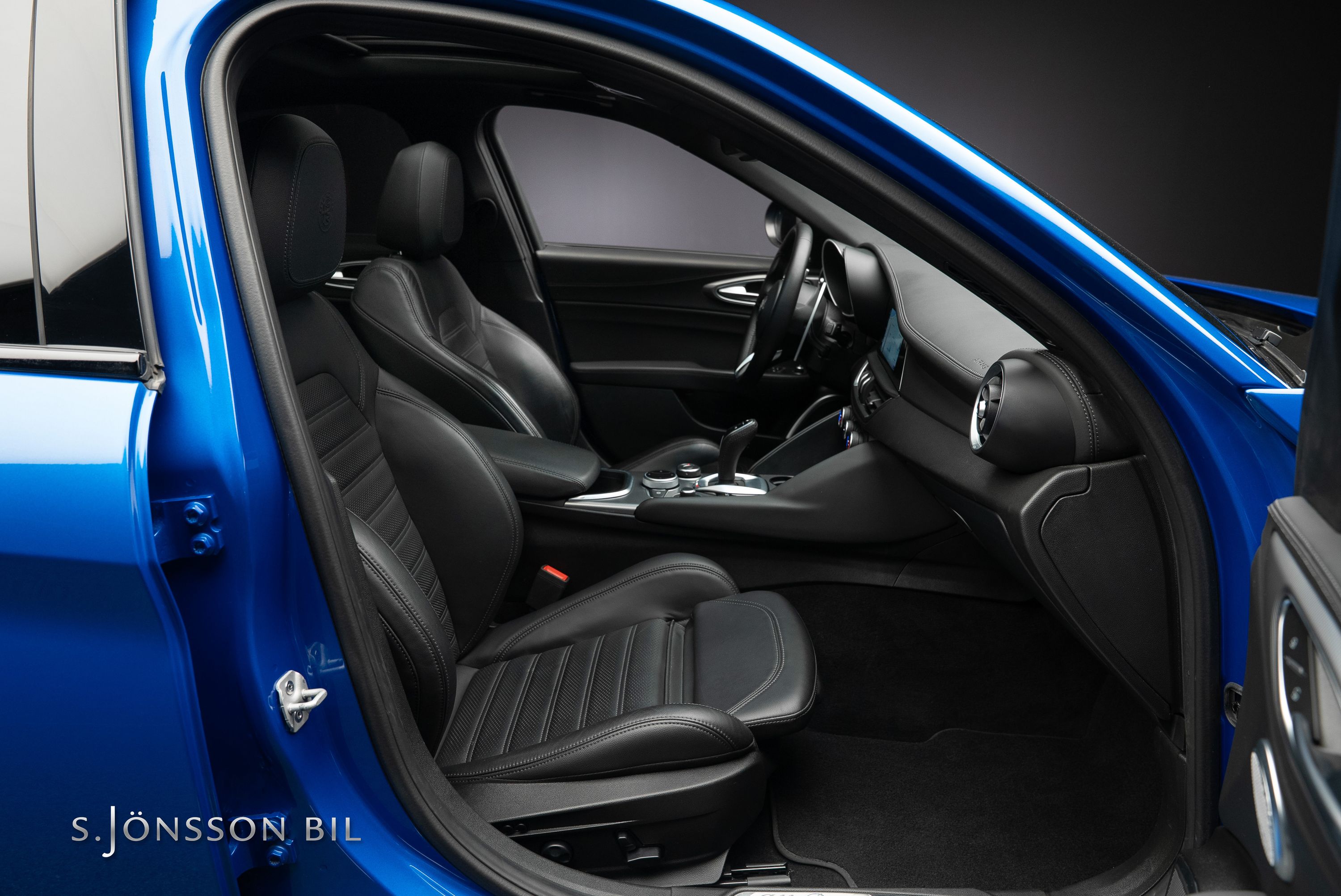 - Elektriskt inställbara ”Veloce” sportstolar 6-vägs i svart helläder med gråa kontrastsömmar inkl. Alfa Romeo-prägling i nackstöd