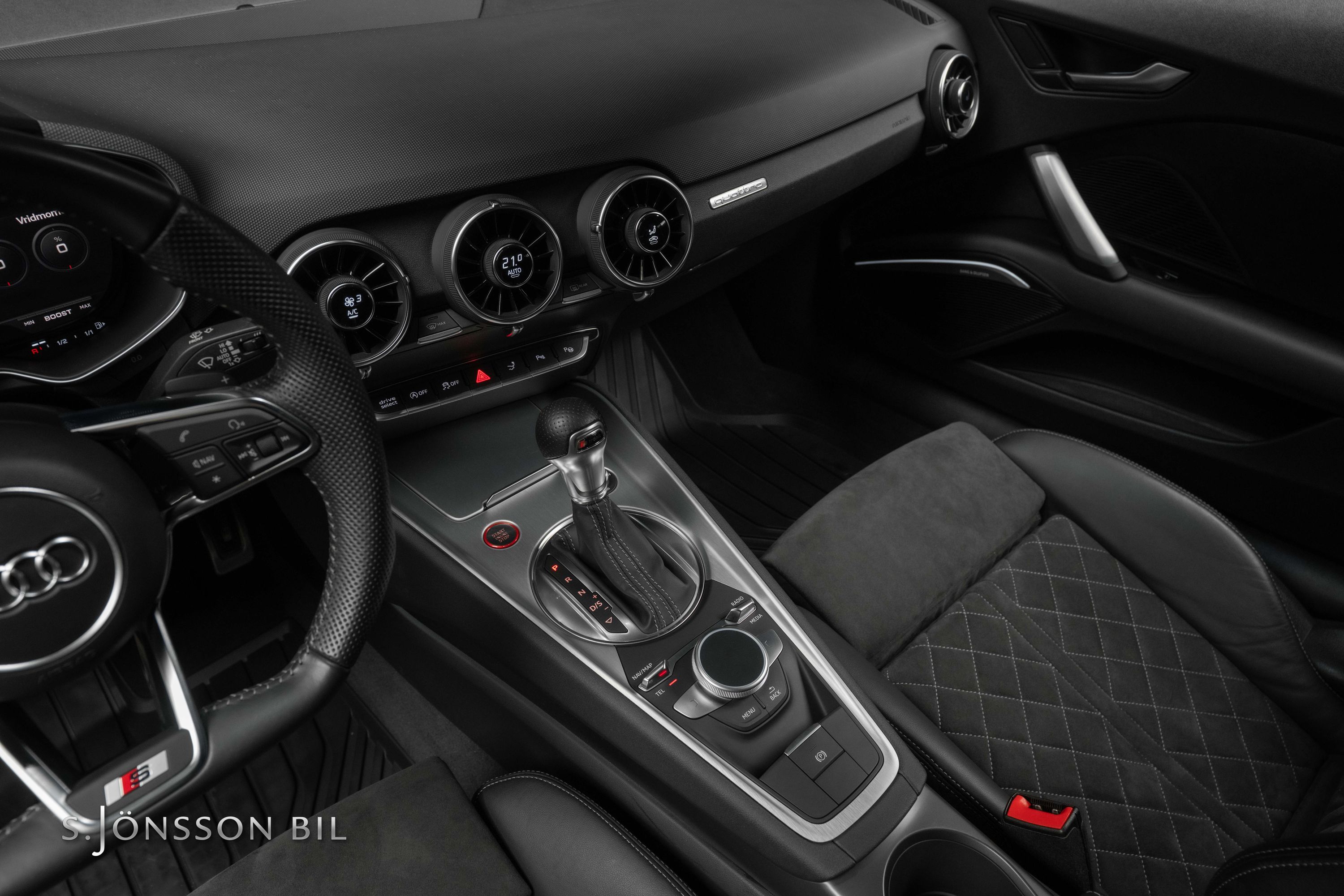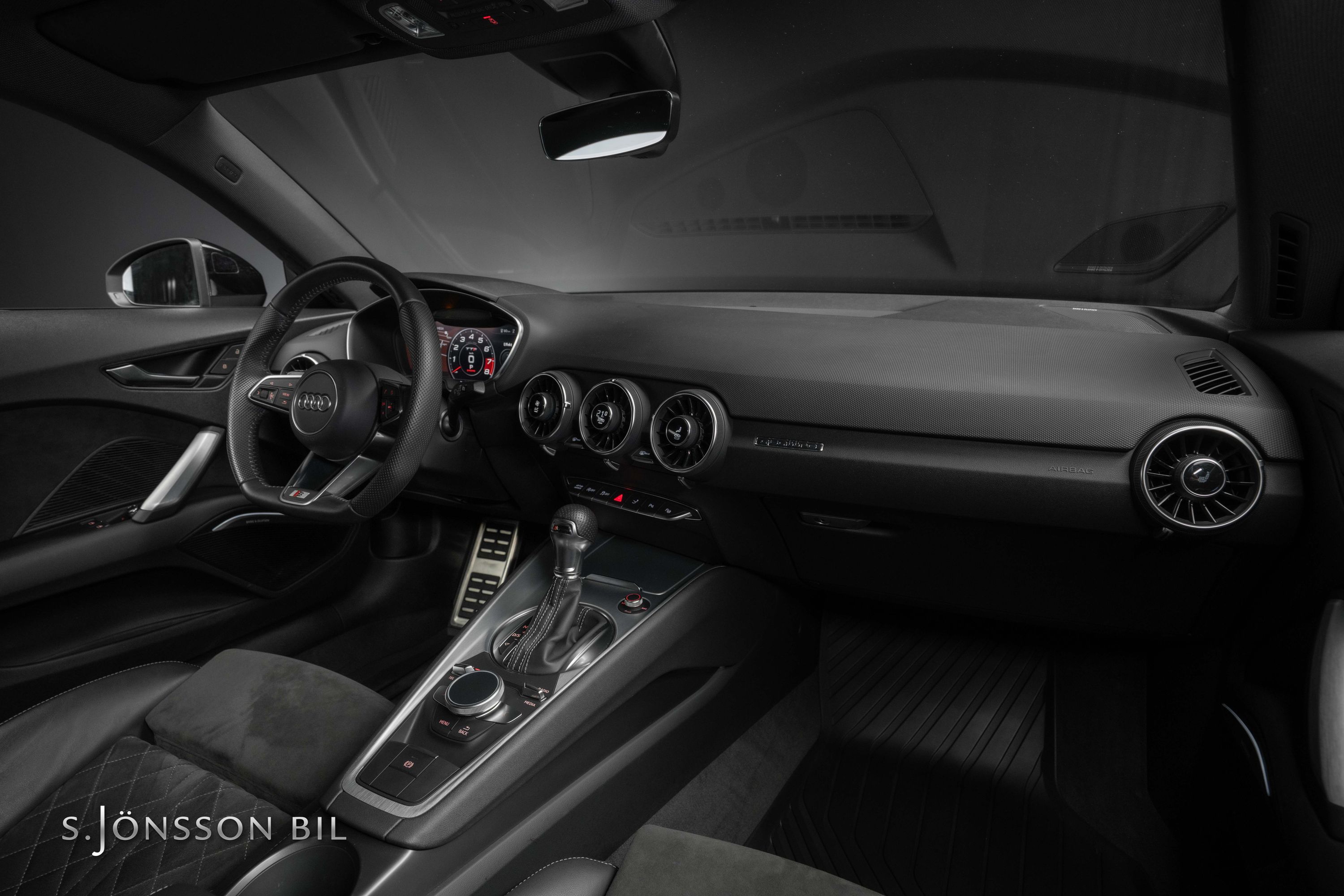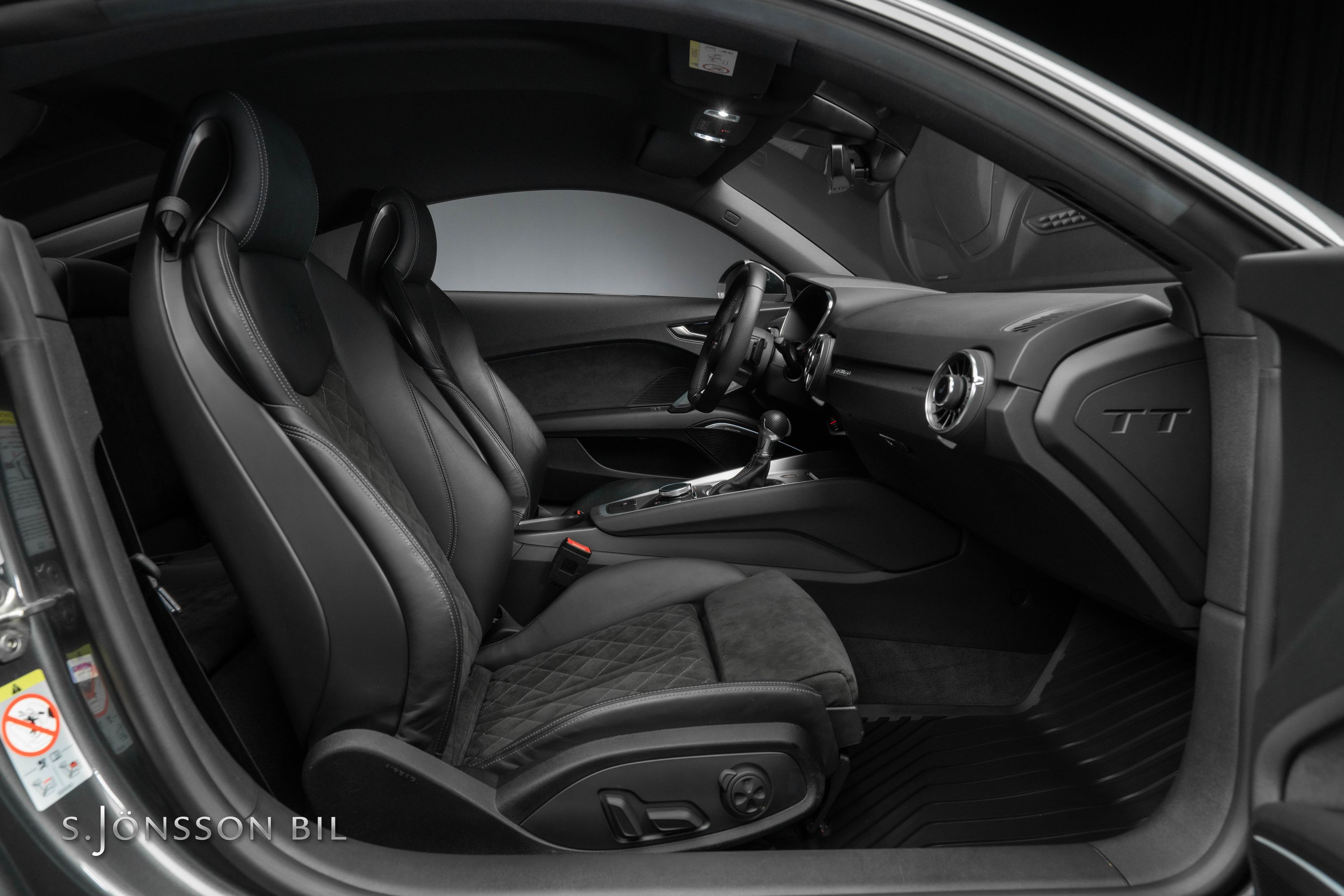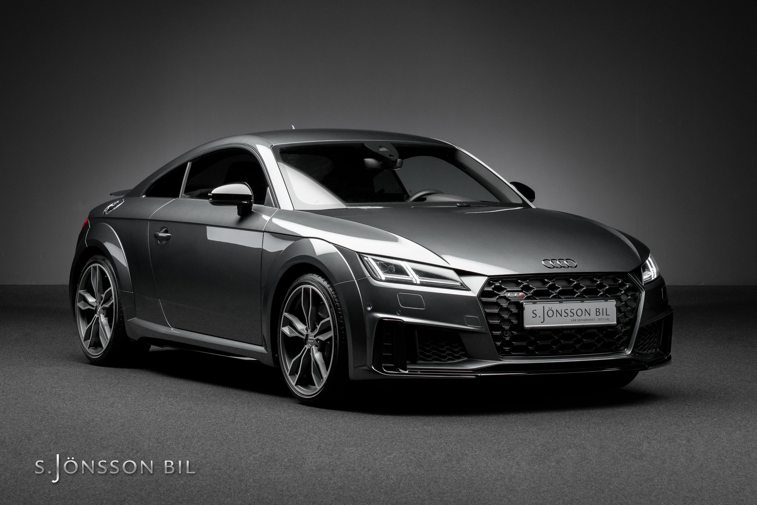 Audi TTS Coupé i snygga kulören Daytona grå metallic. Interiören är i läder och alcantara med grå kontrastsömmar. TTS har 306 hk och Quattro fyrhjulsdrift och klarar 0-100km/h på 4.5 sekunder.