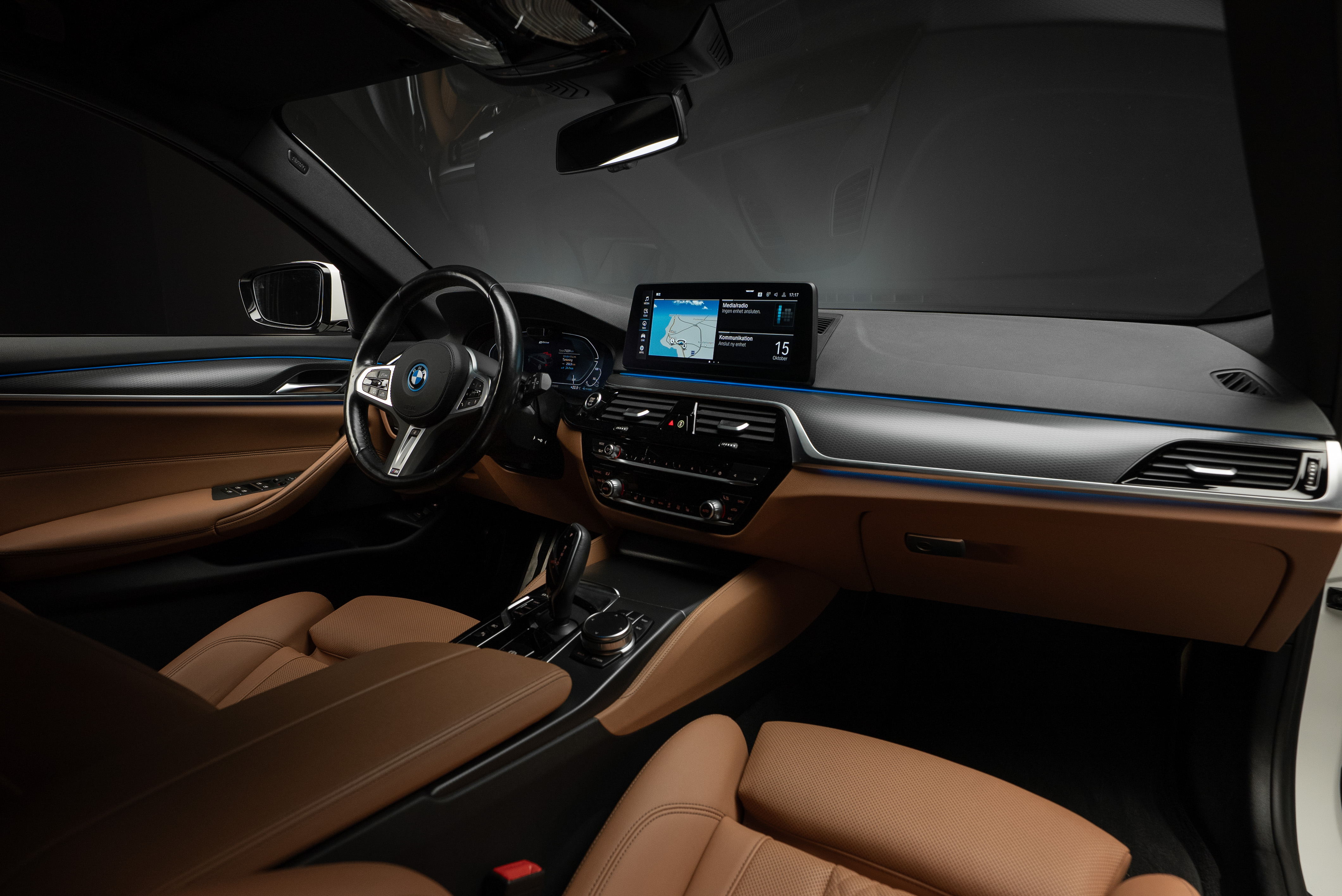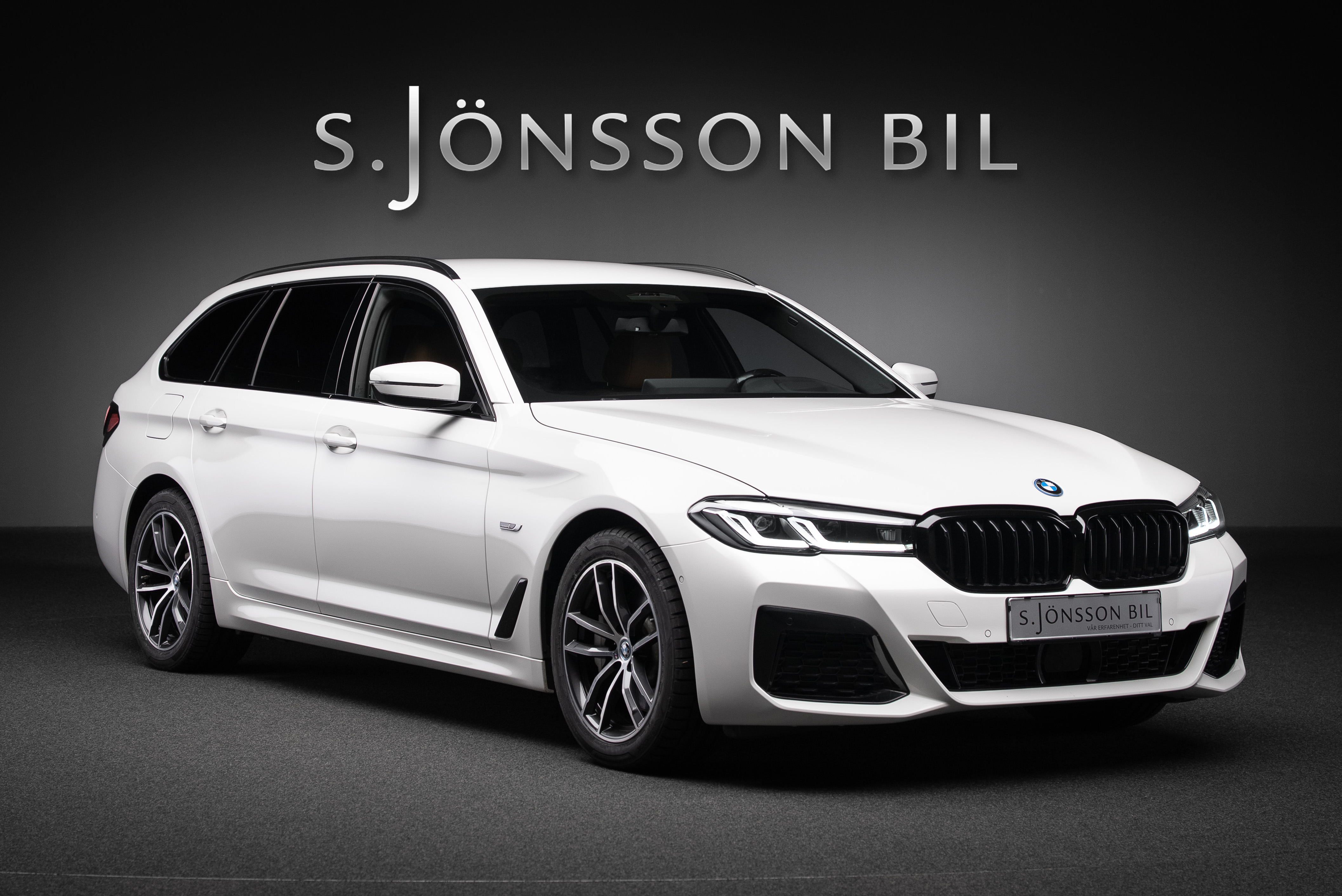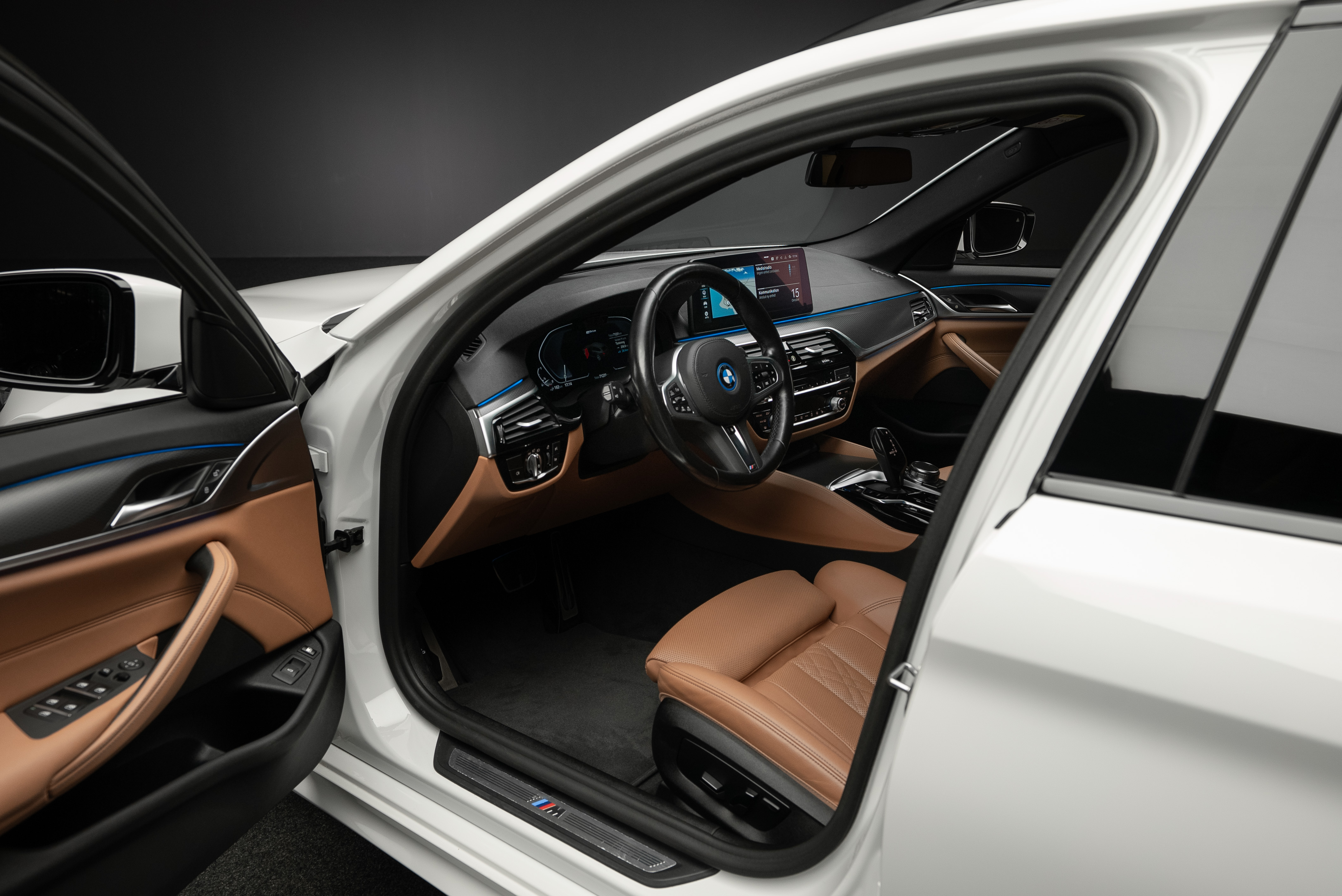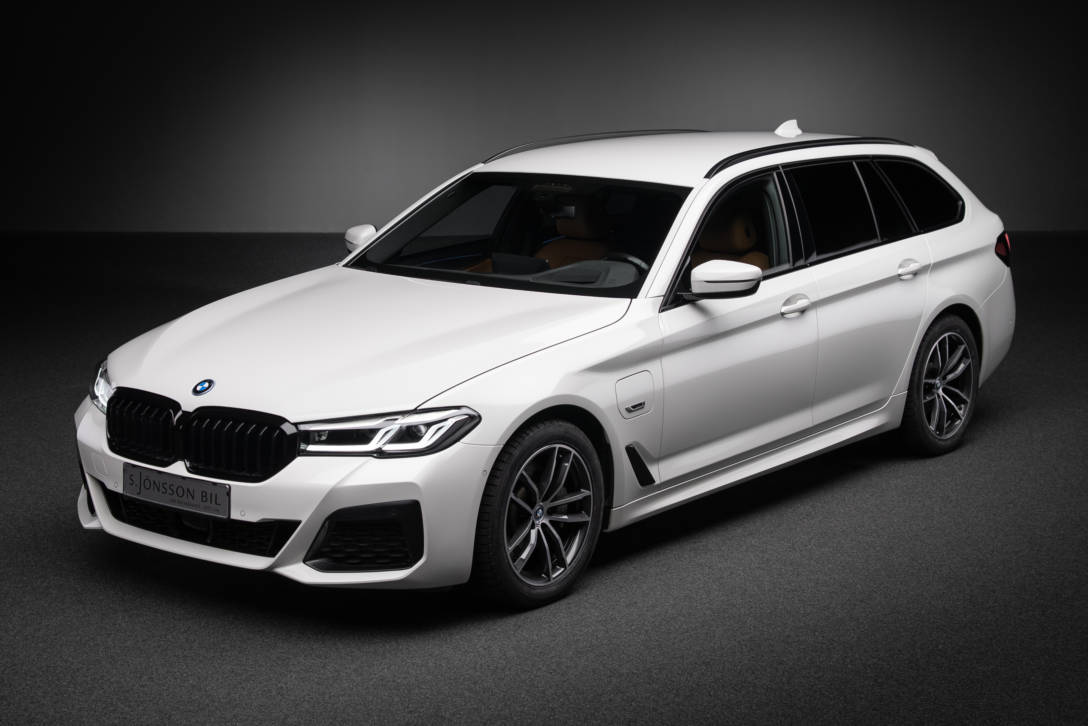BMW 530e xDrive Touring laddhybrid lackerad i vit med sportstolar i cognac läderinteriör.
