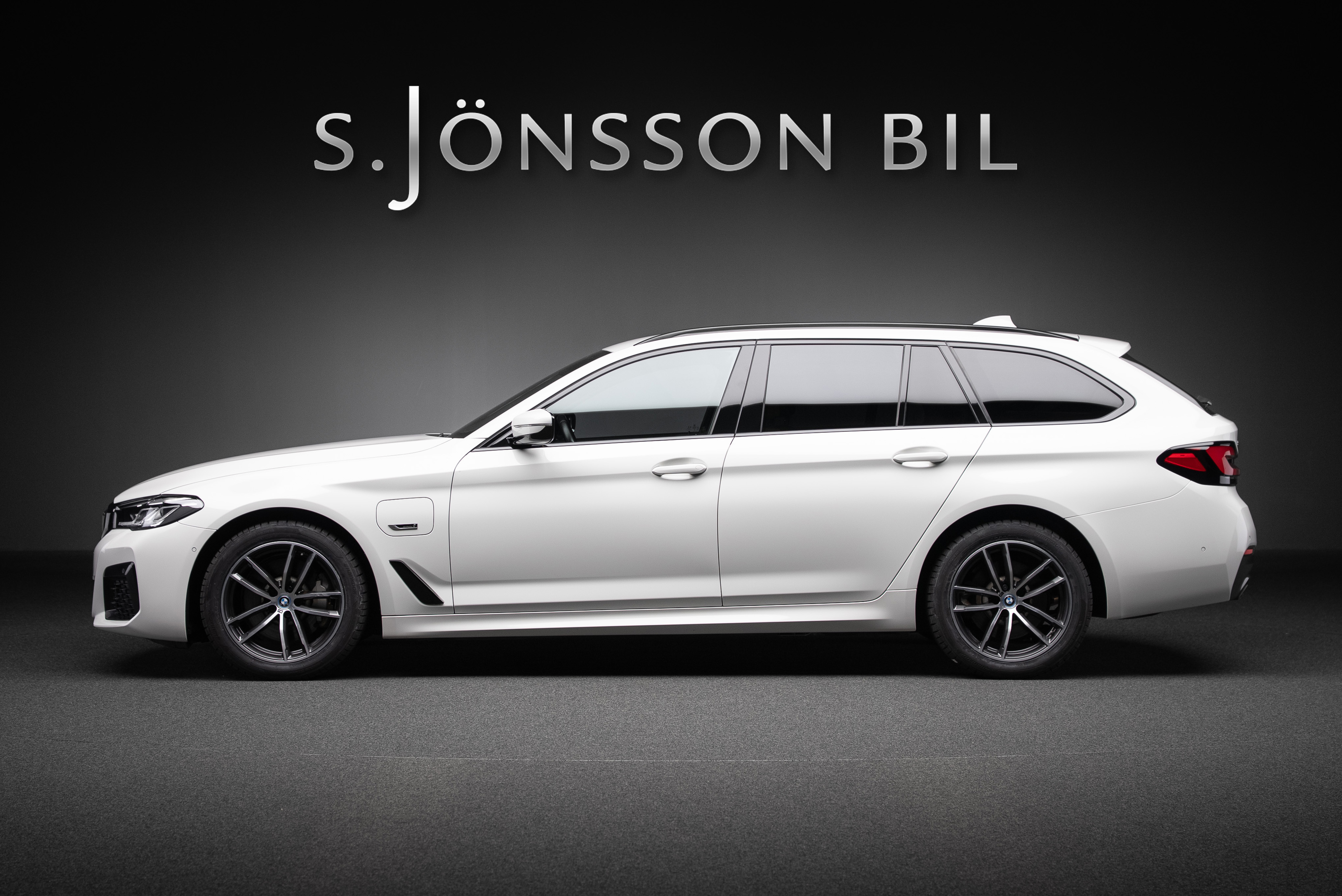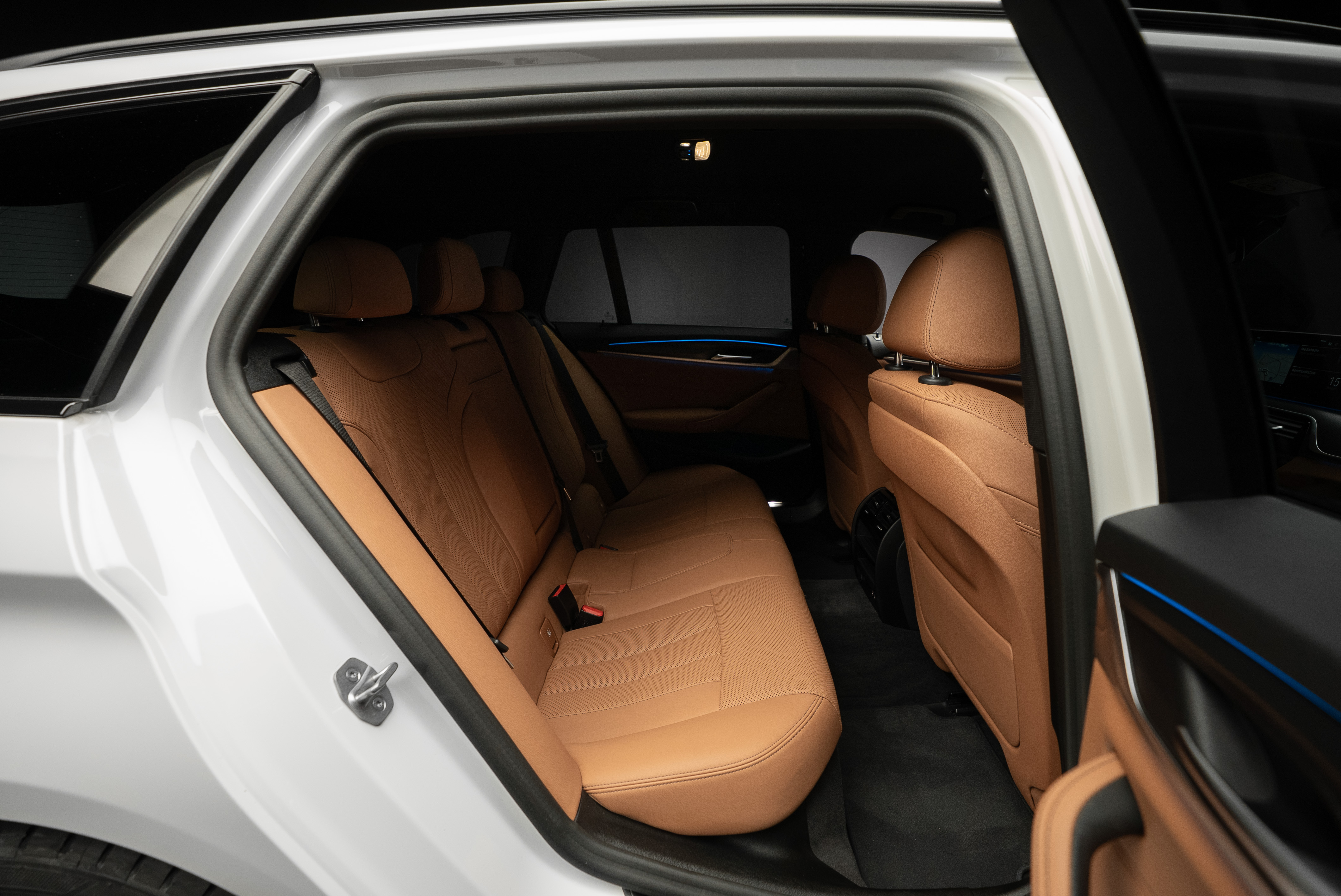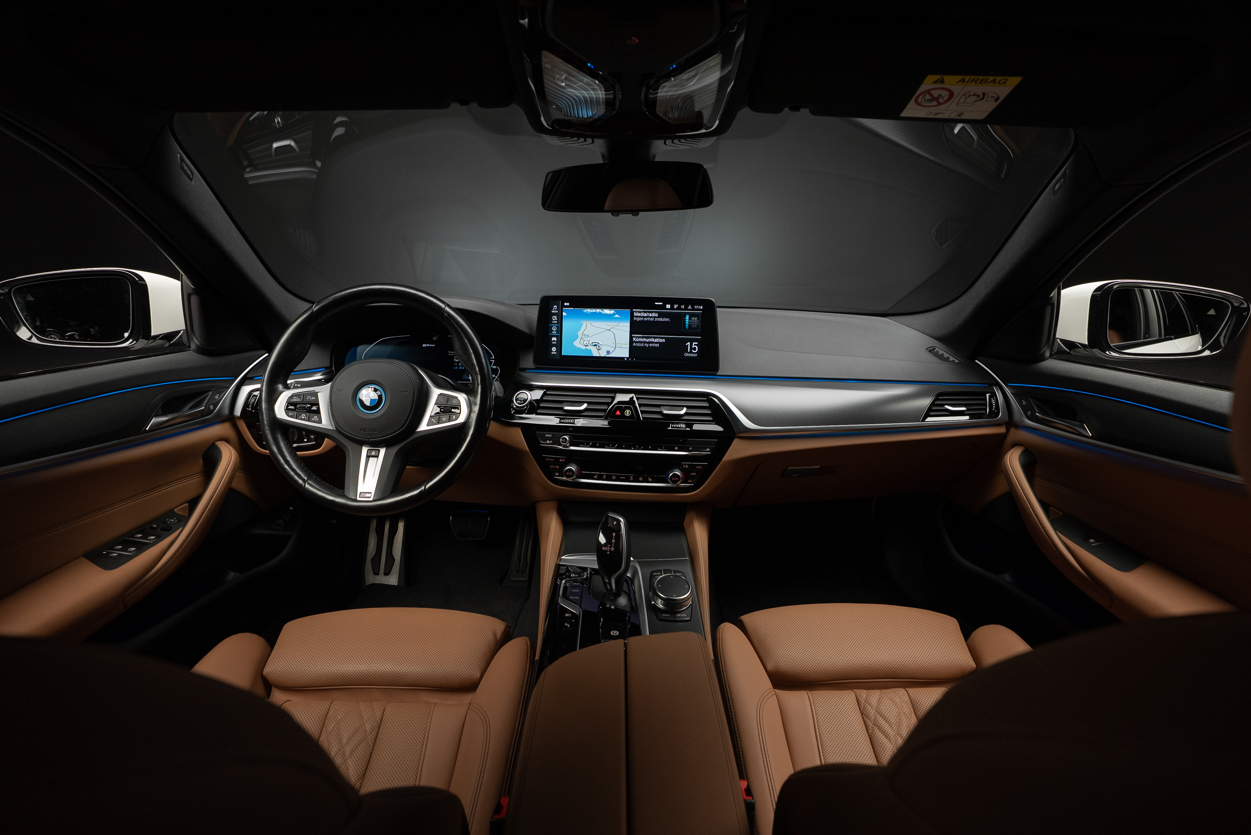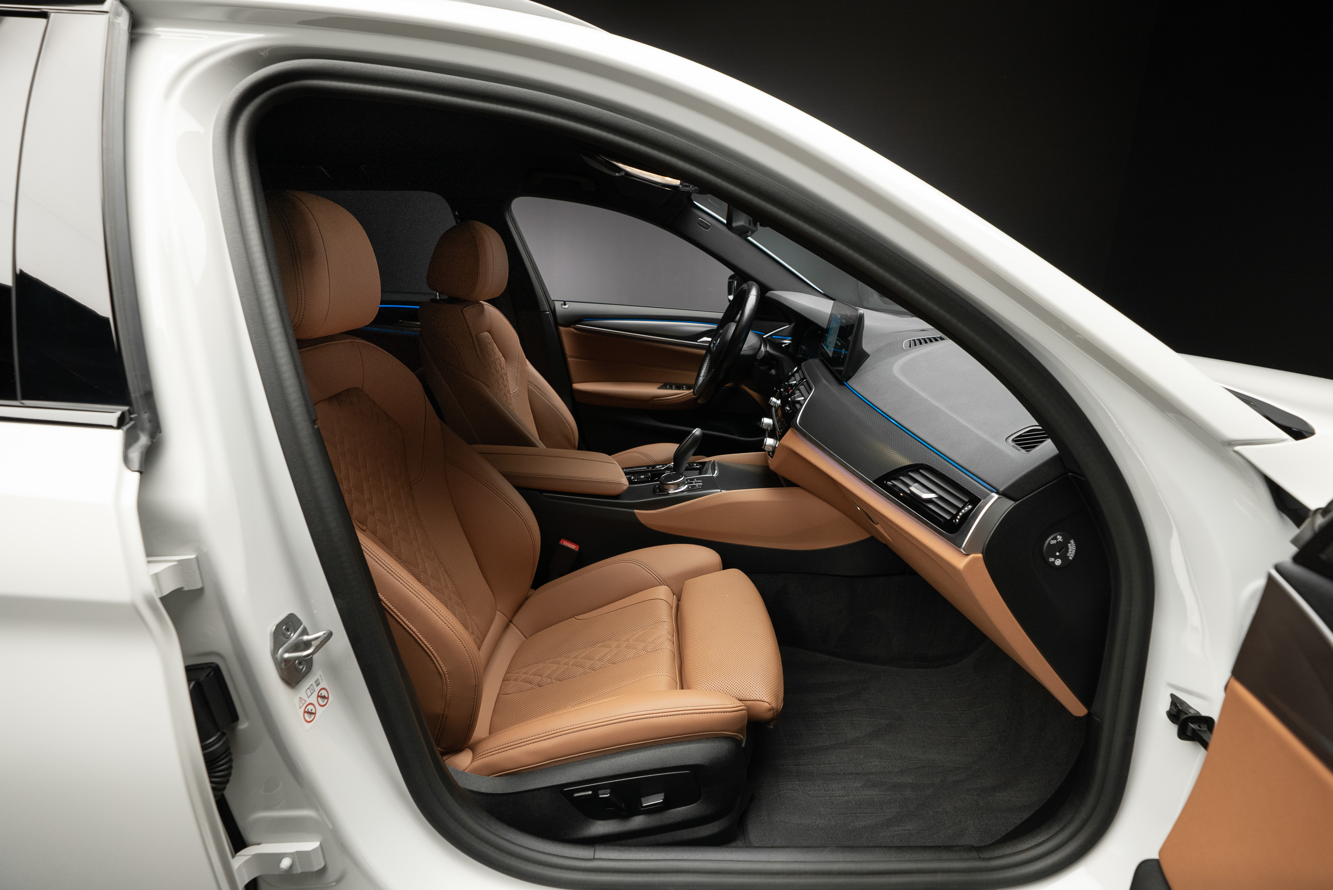 BMW 530e xDrive Touring laddhybrid lackerad i vit med sportstolar i cognac läderinteriör.