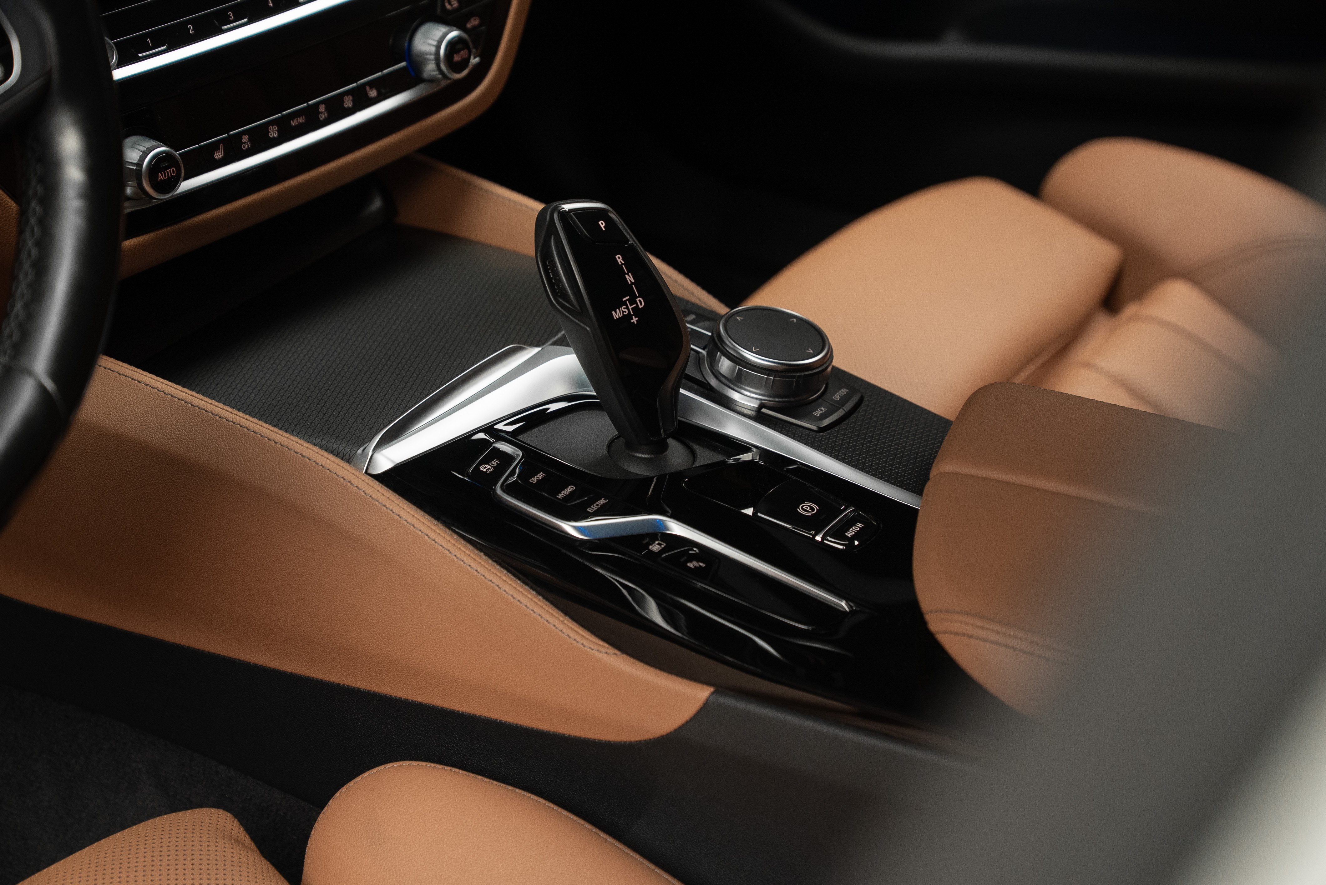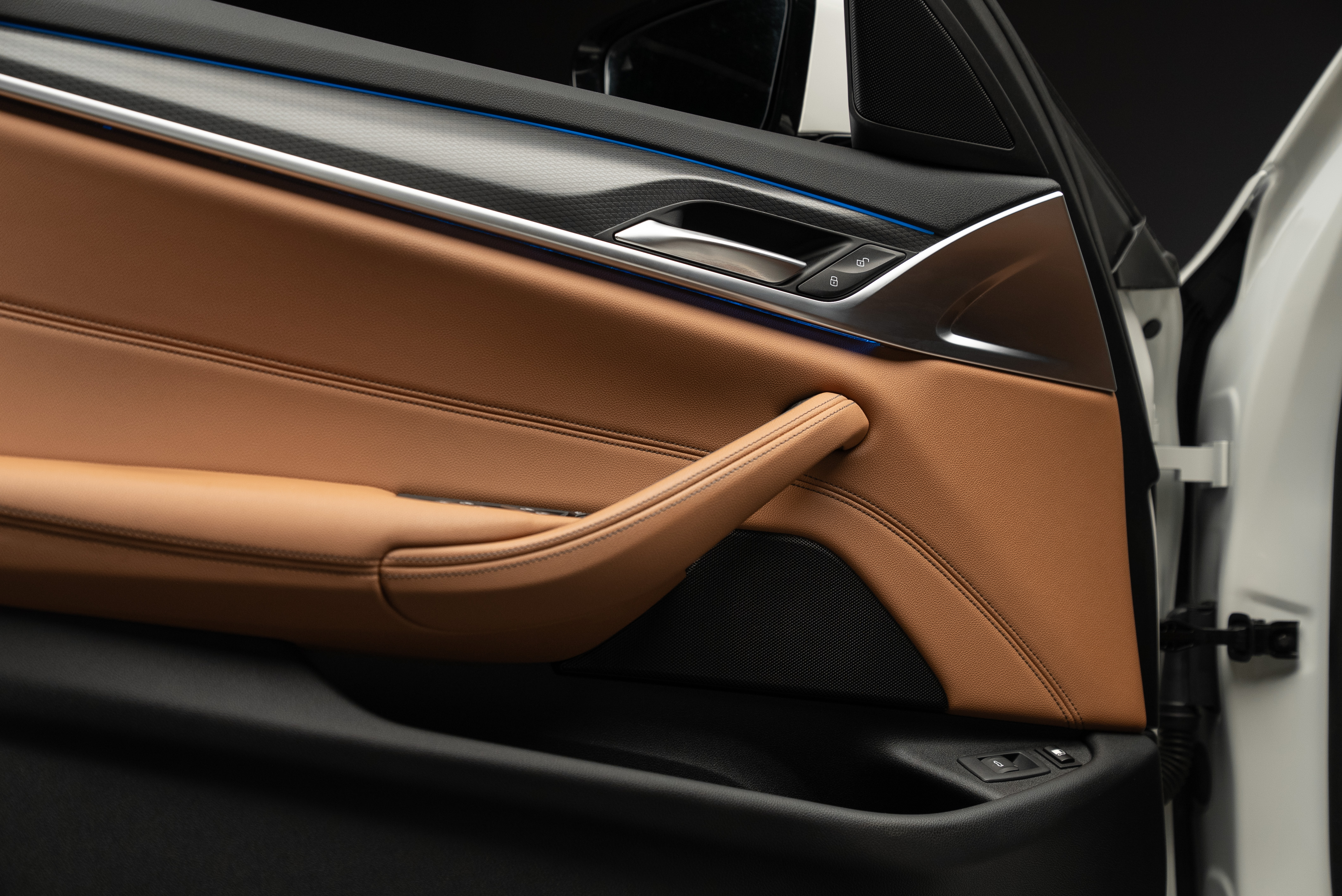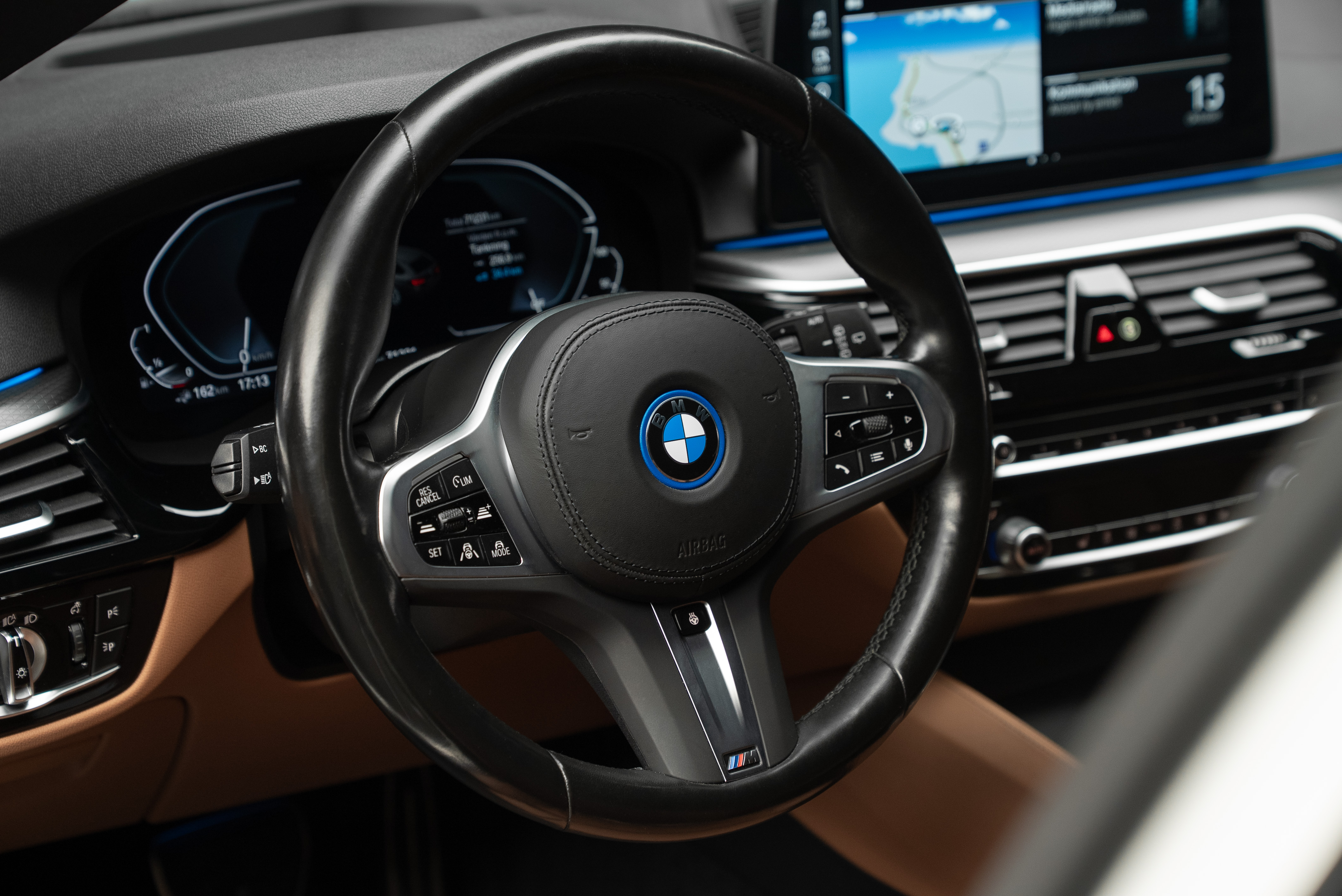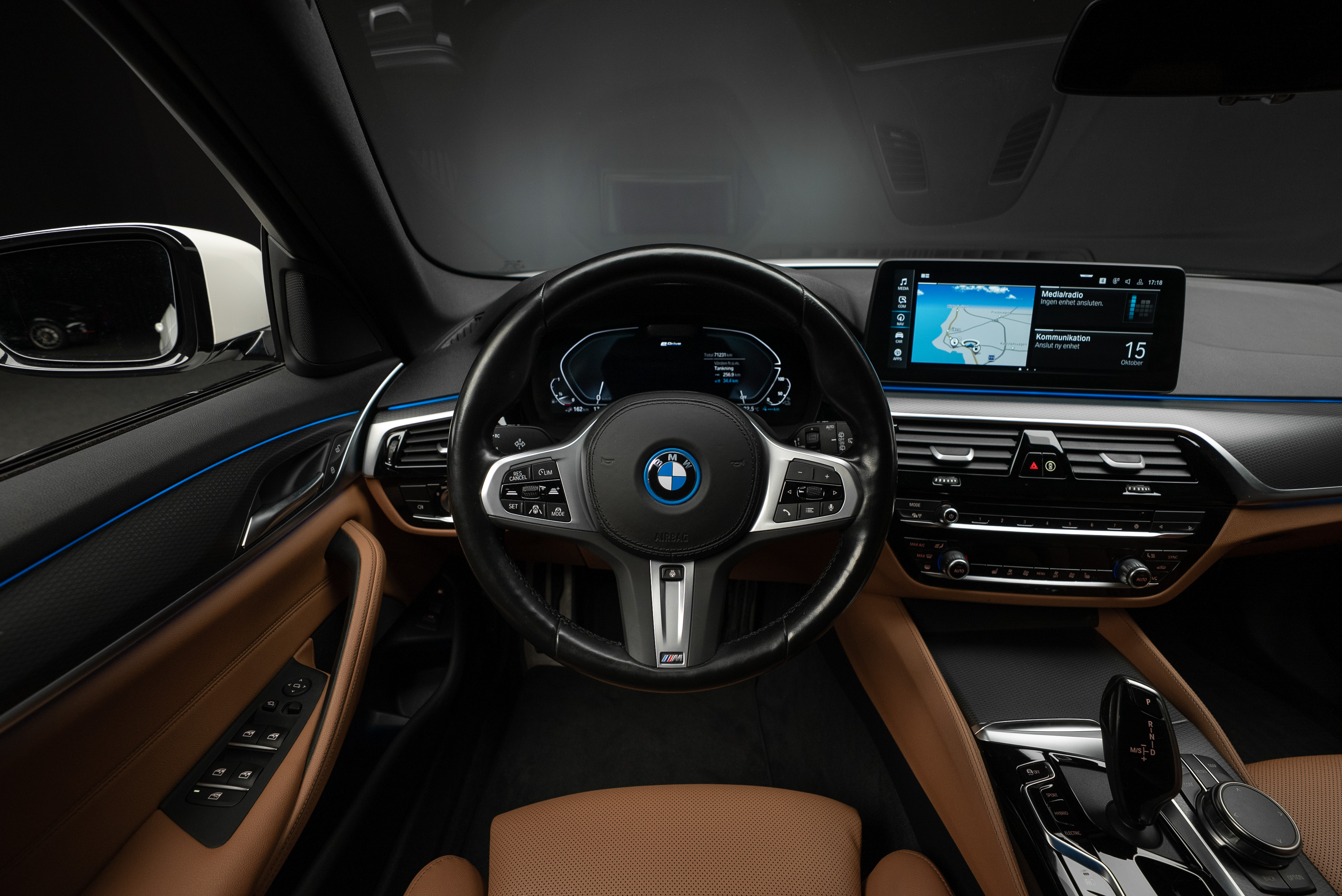 BMW 530e xDrive Touring laddhybrid lackerad i vit med sportstolar i cognac läderinteriör.