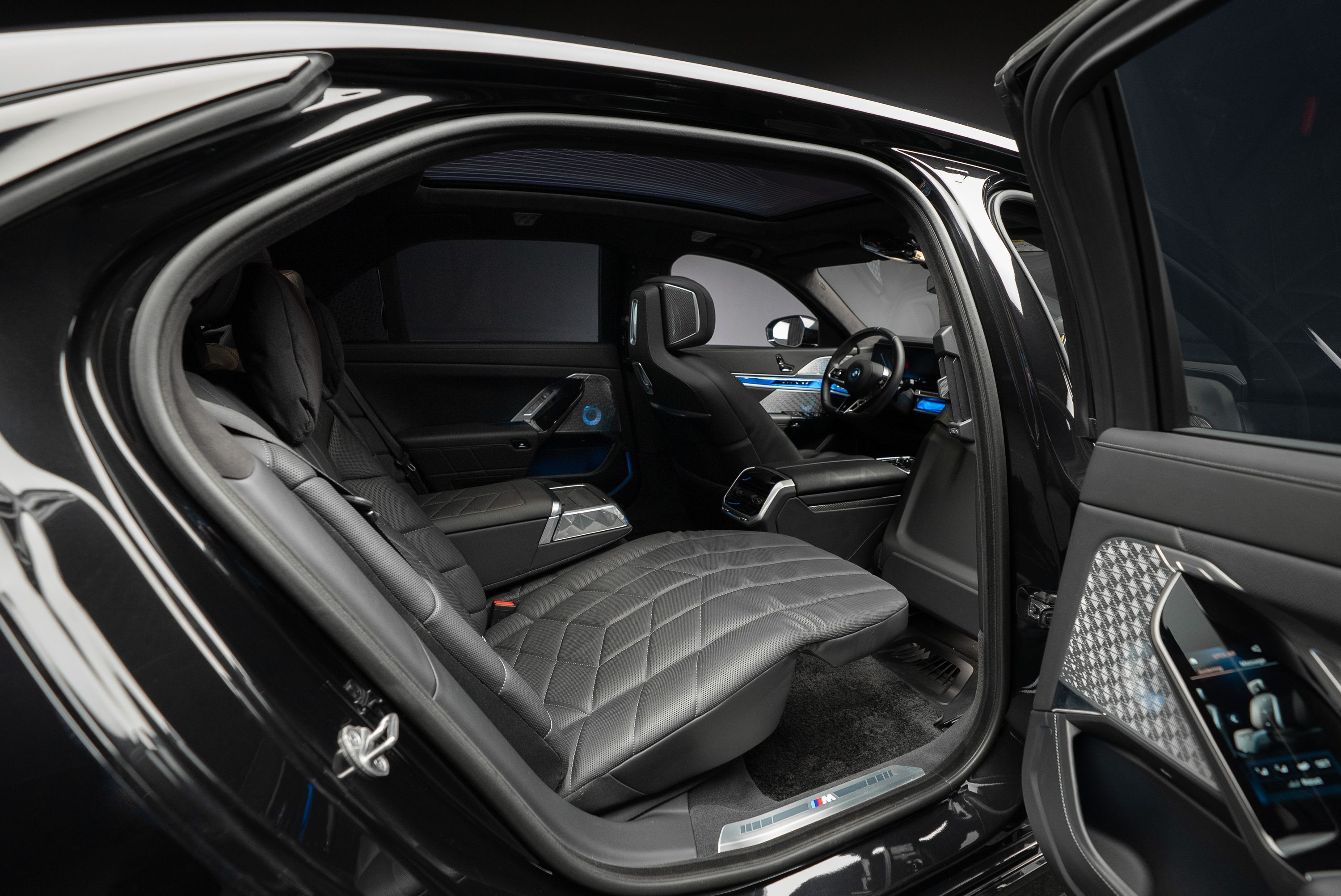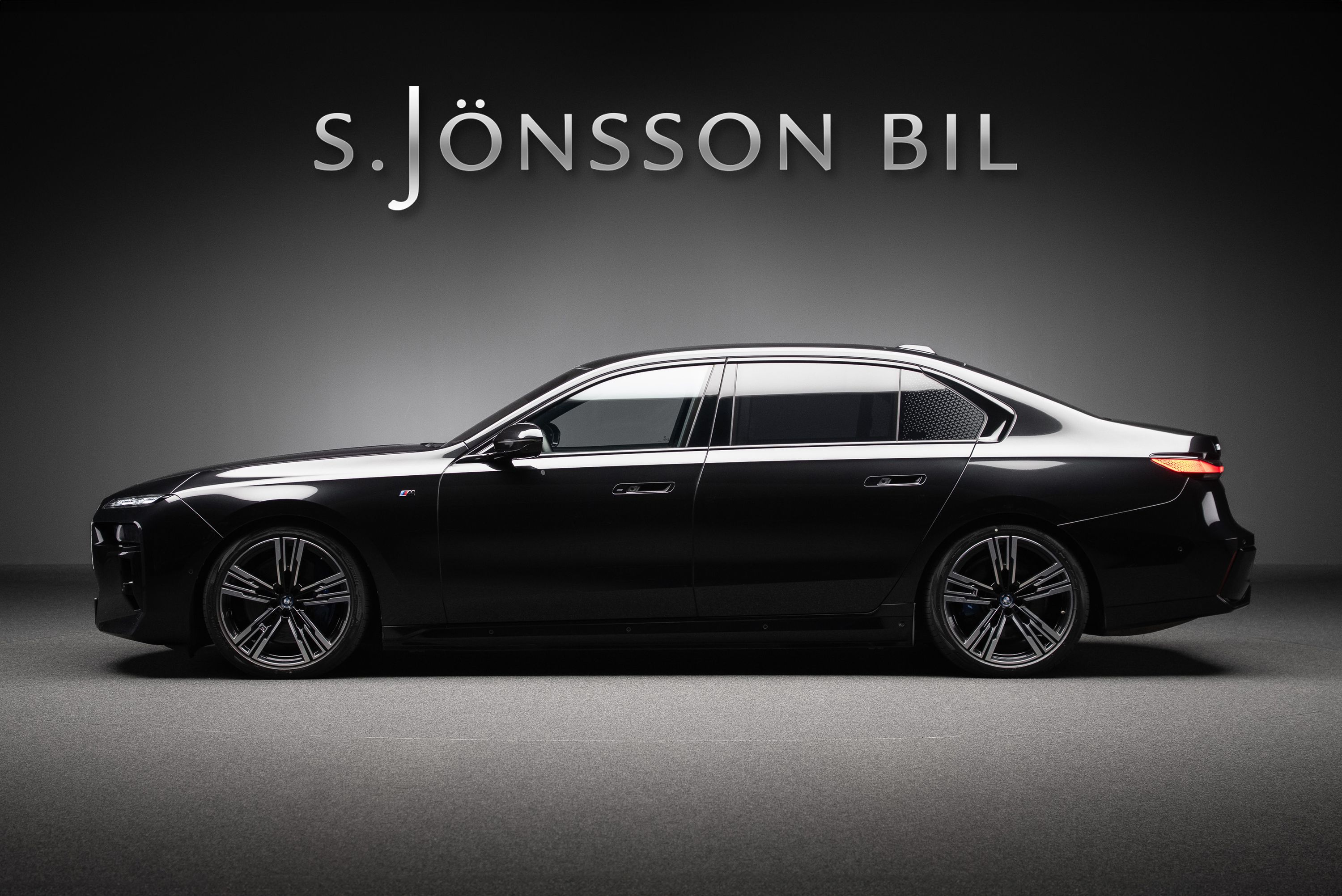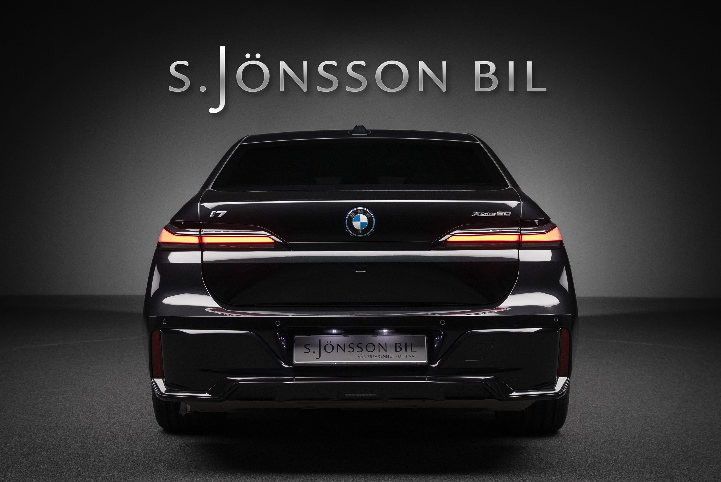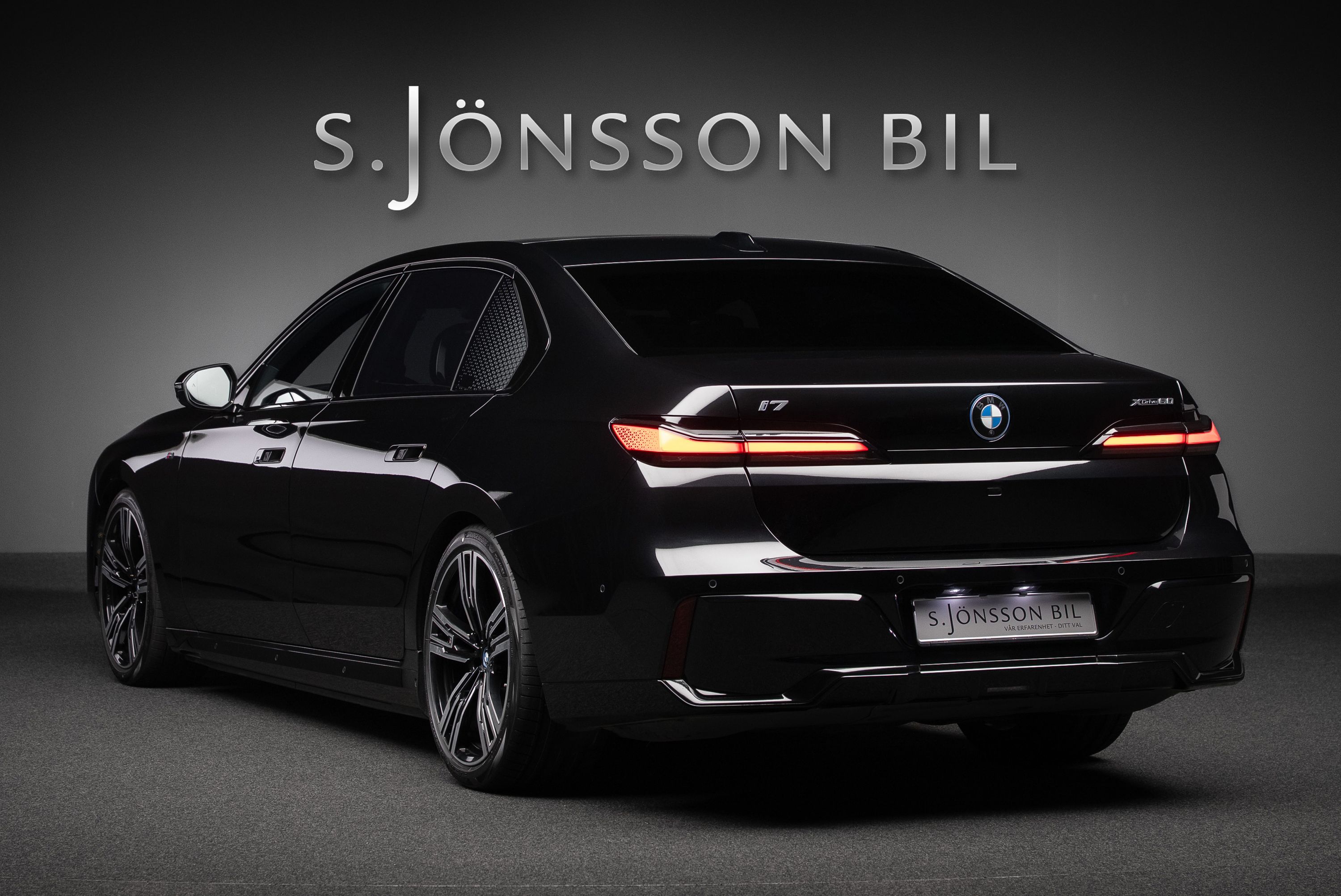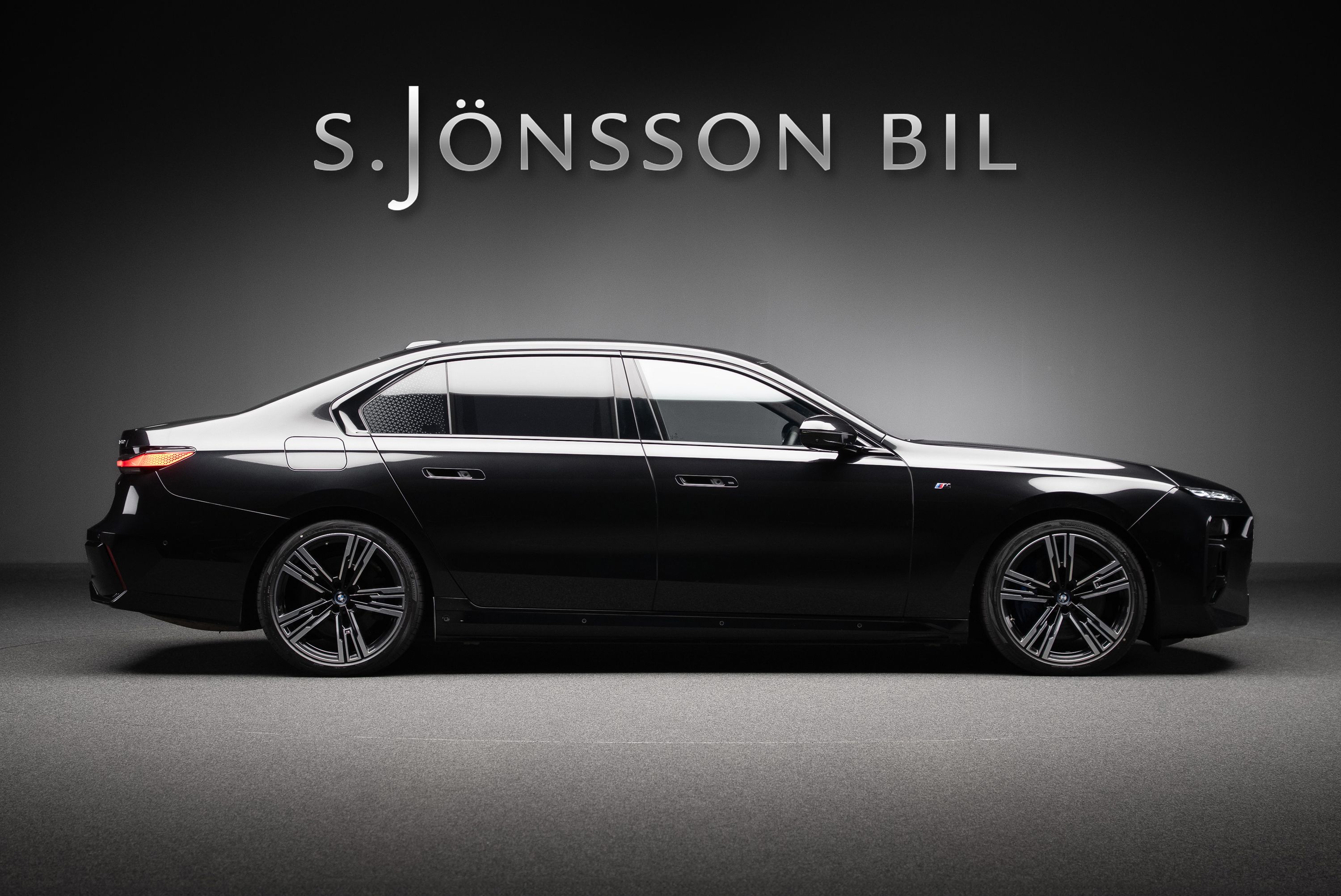 BMW i7 xDrive60 544hk i färgen black sapphire metallic med BMW Individual läder "Merino" interiör, extrautrustad för 512.200kr.