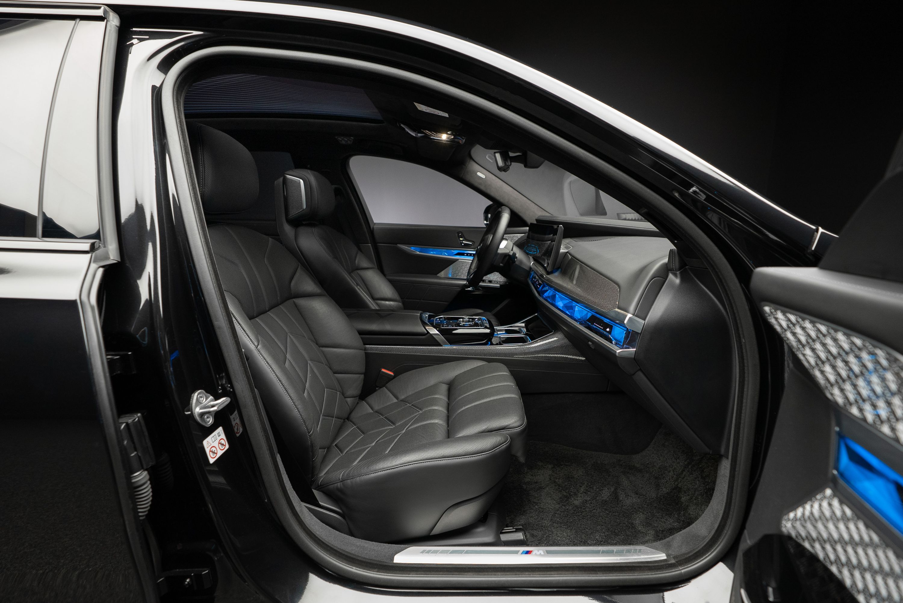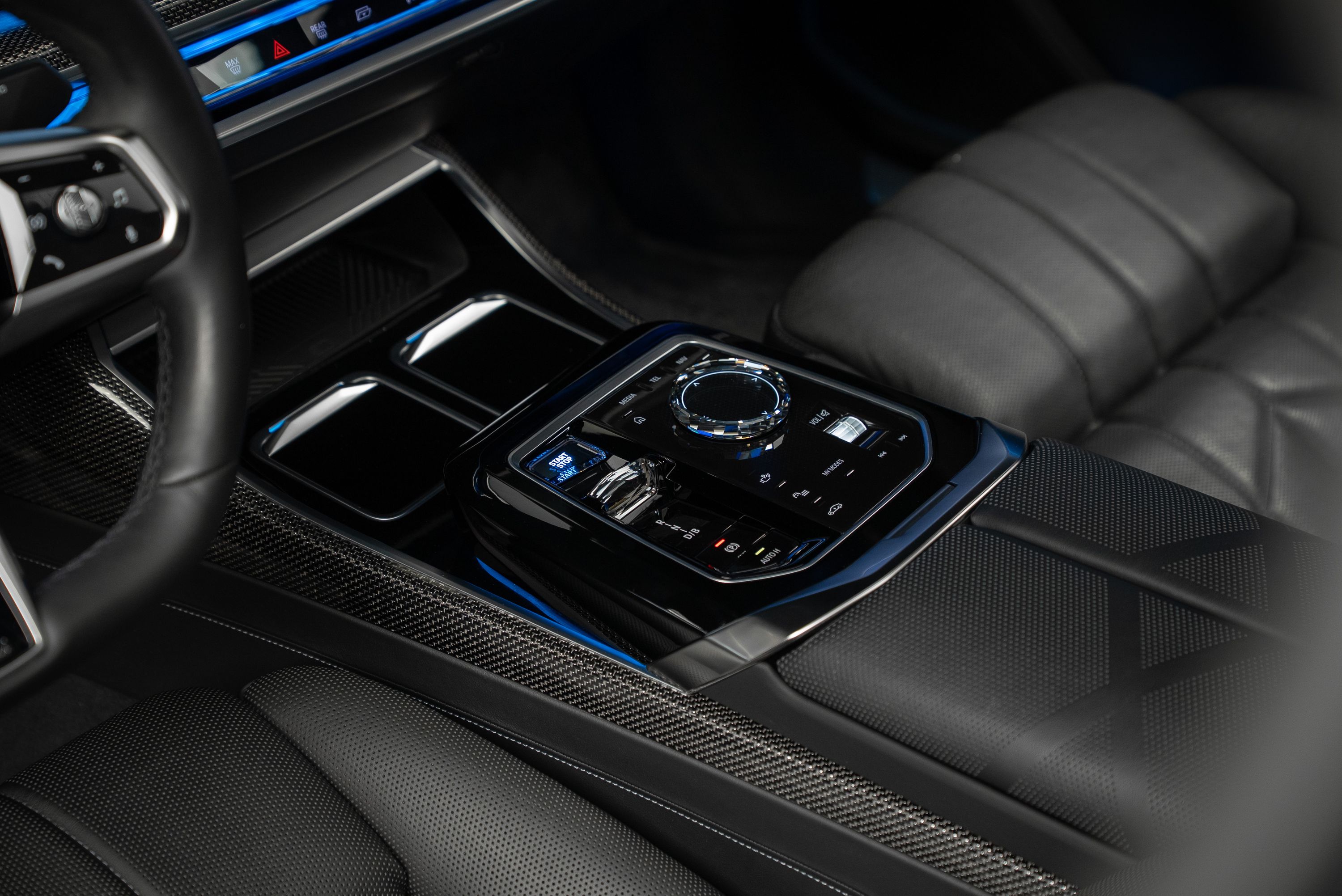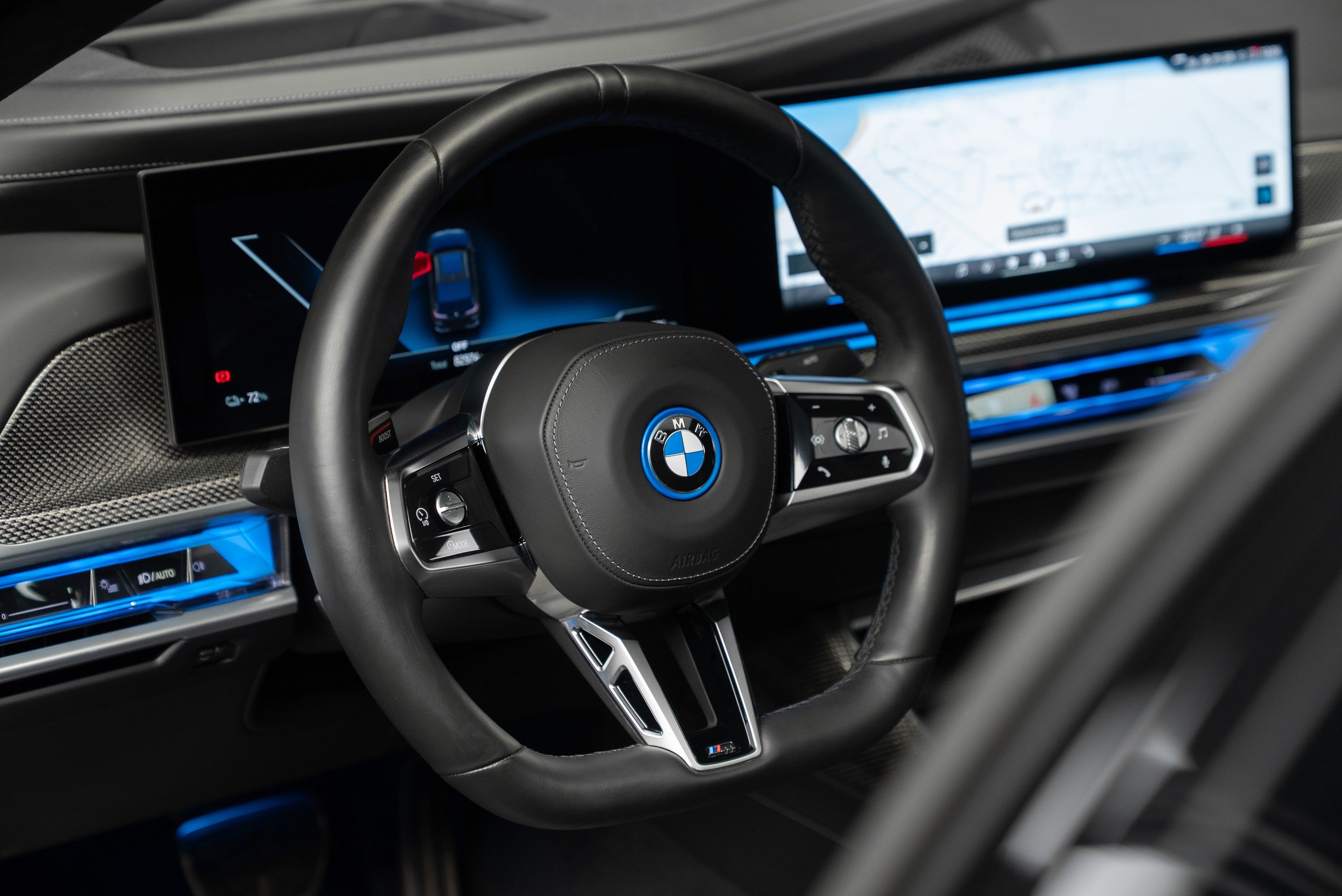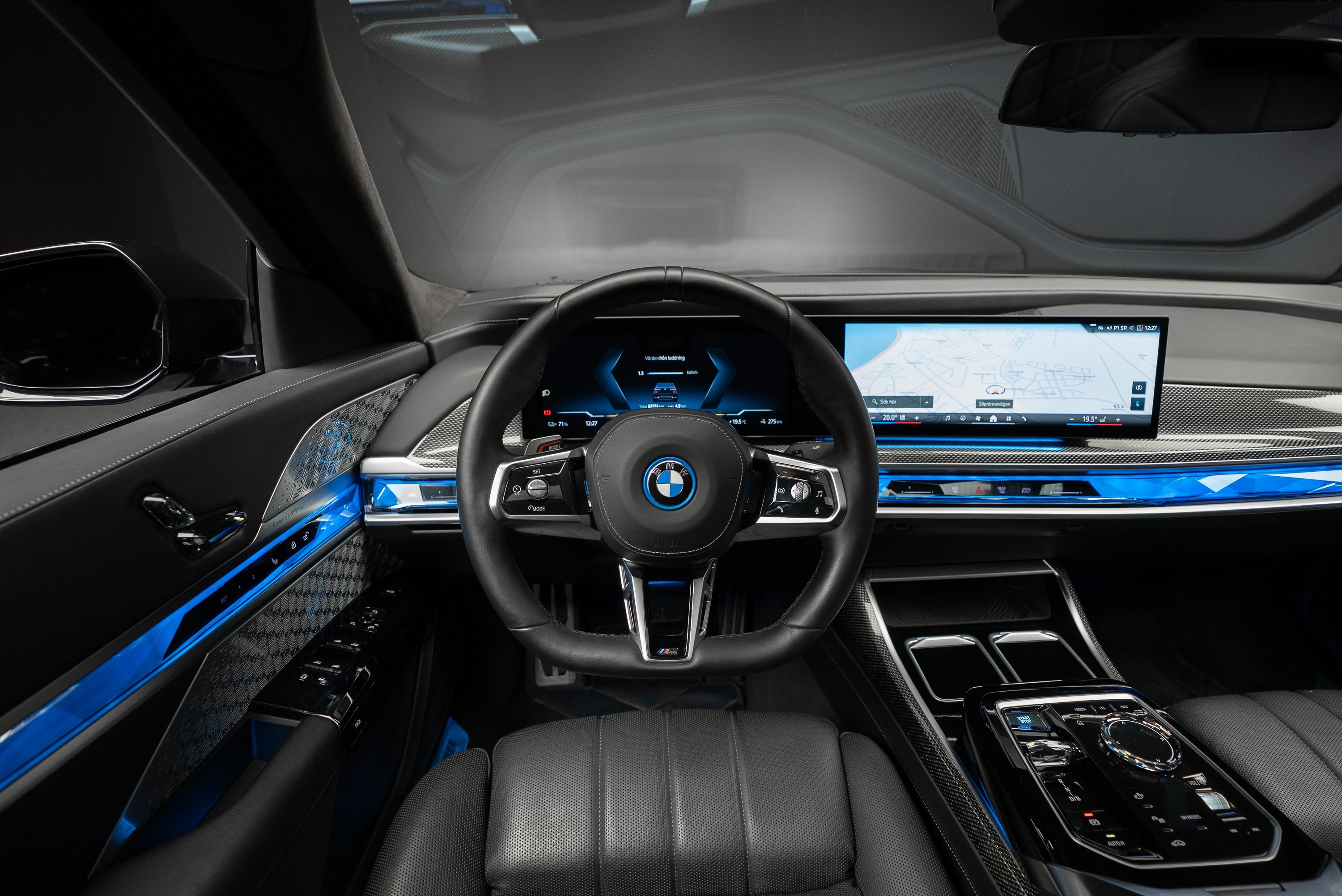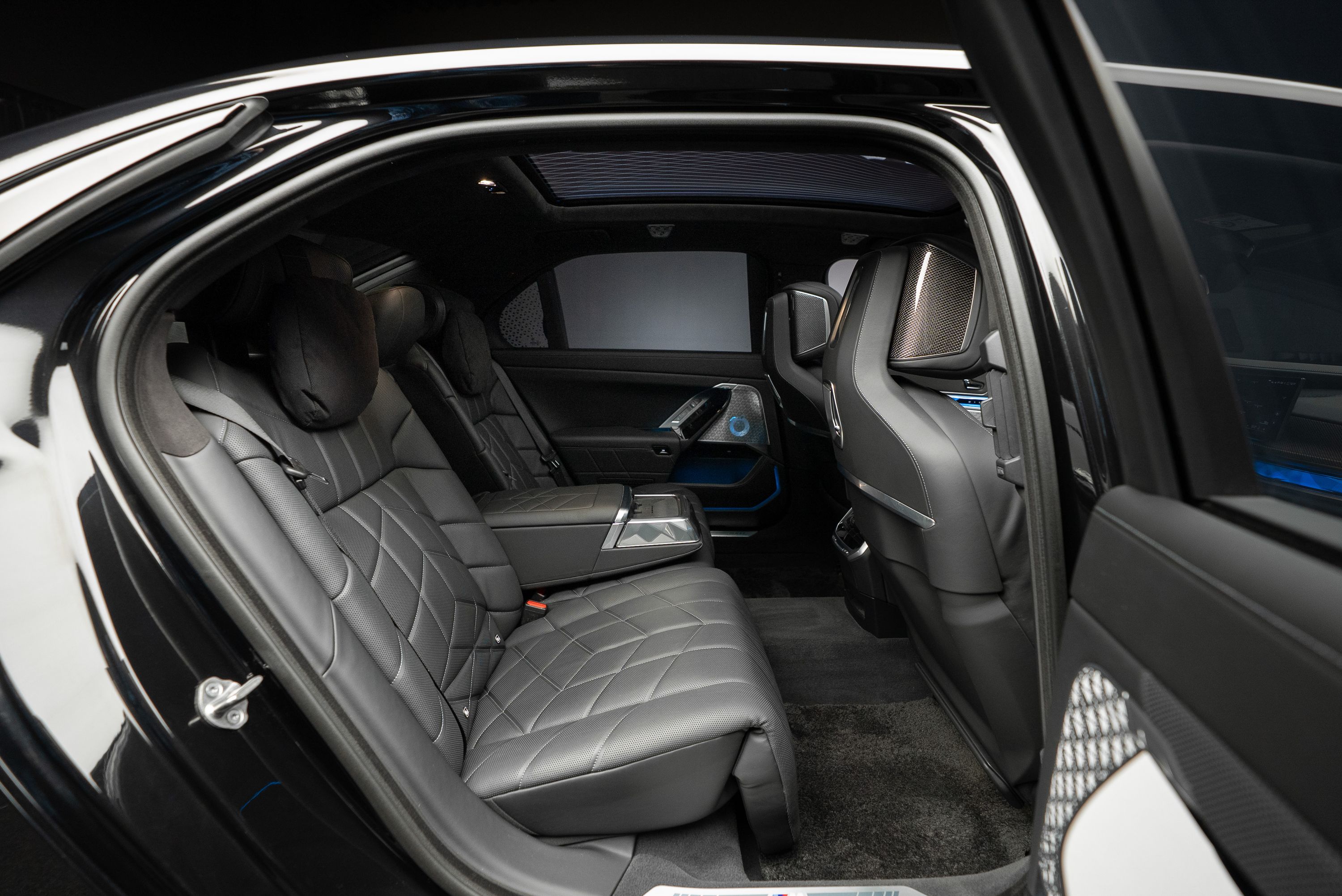 BMW i7 xDrive60 544hk i färgen black sapphire metallic med BMW Individual läder "Merino" interiör, extrautrustad för 512.200kr.