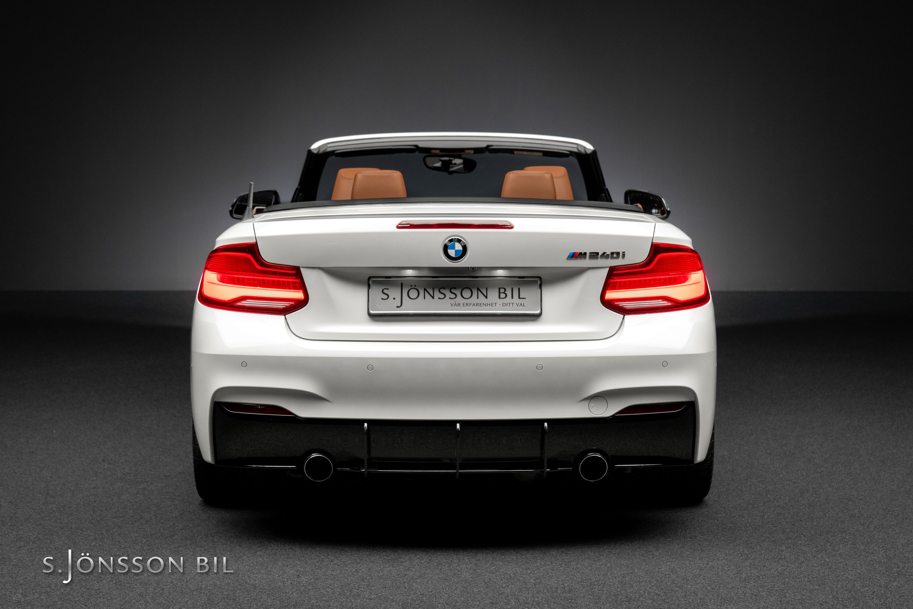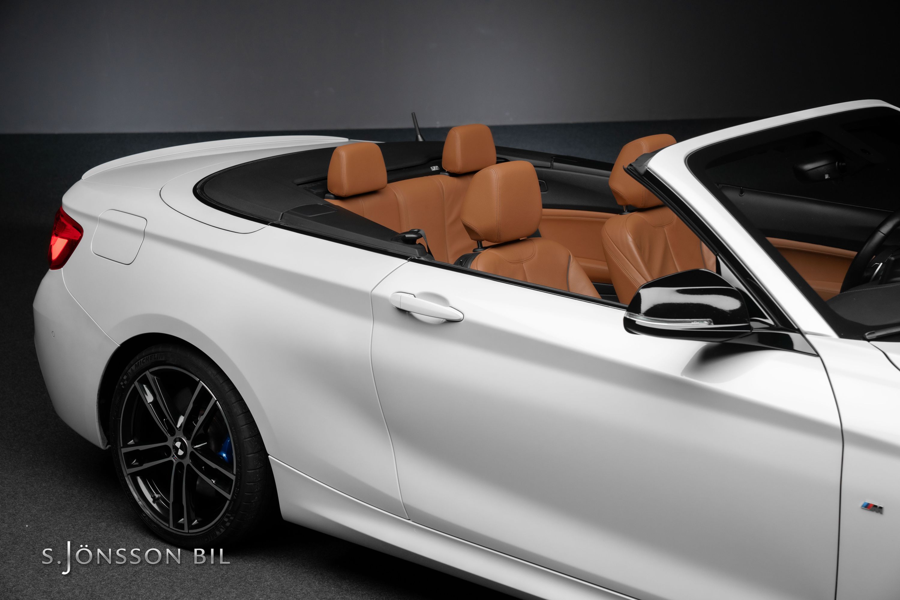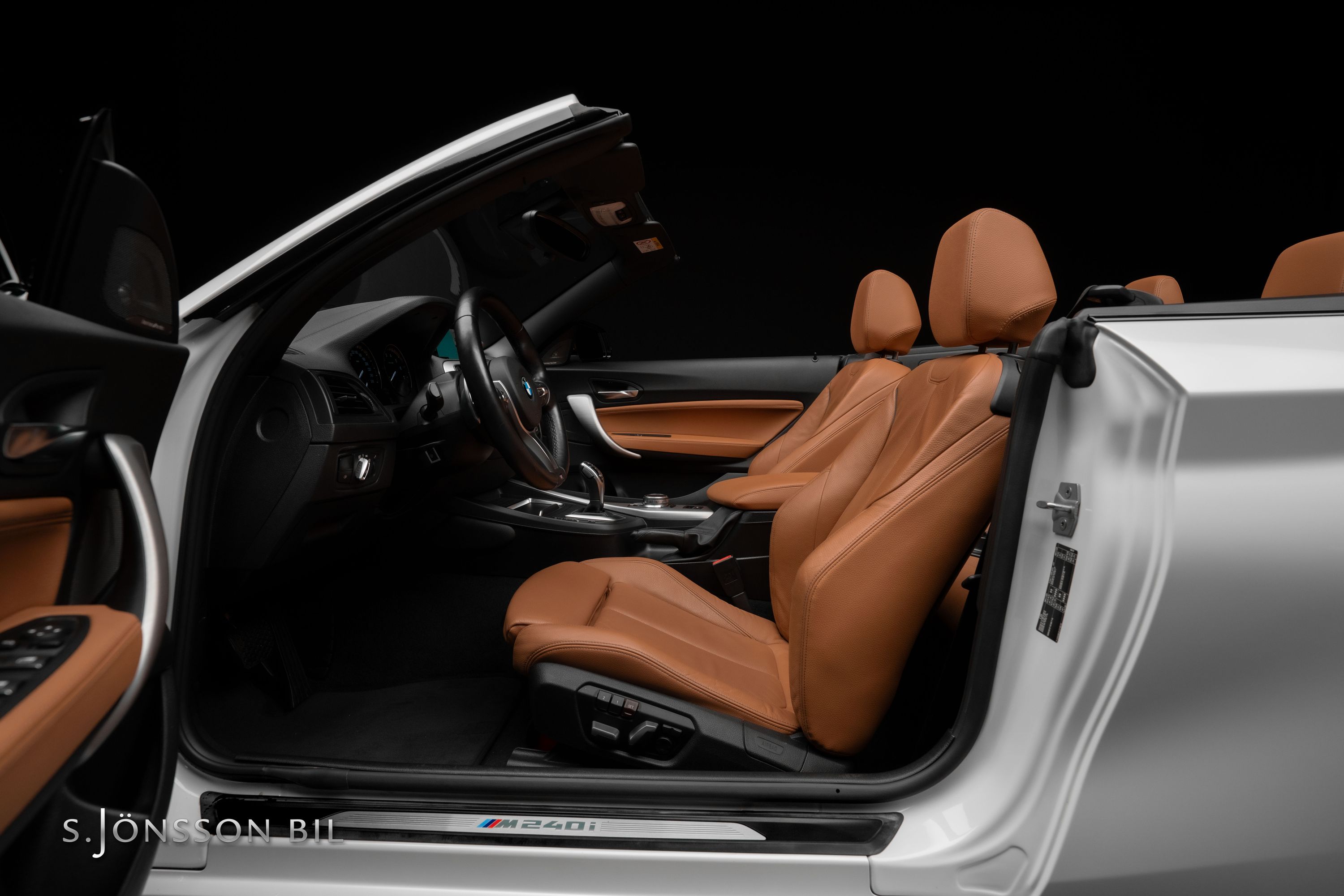 BMW M240i Cab lackerad i Mineralvit metallic med inredning i läder Dakota Cognac Highlight Brown.