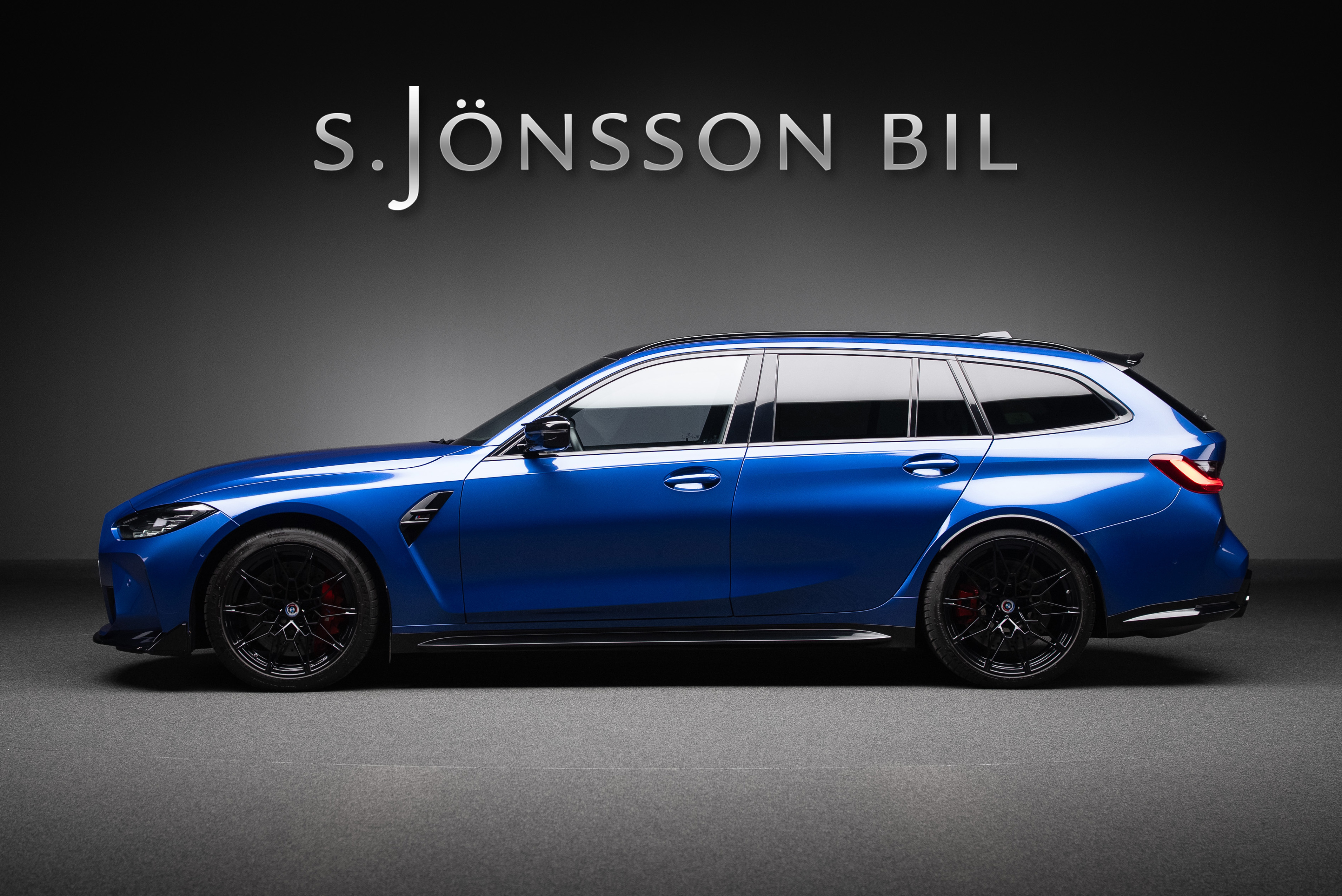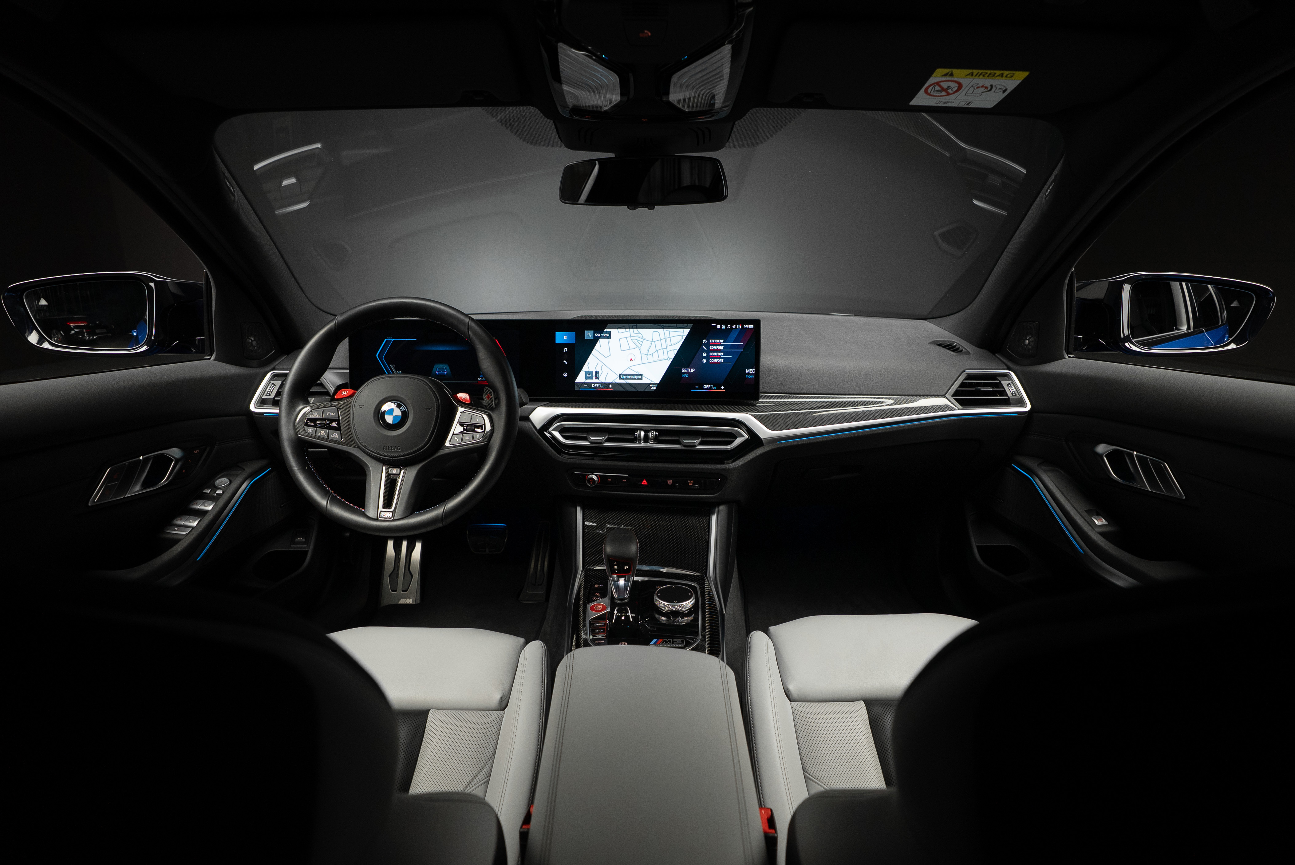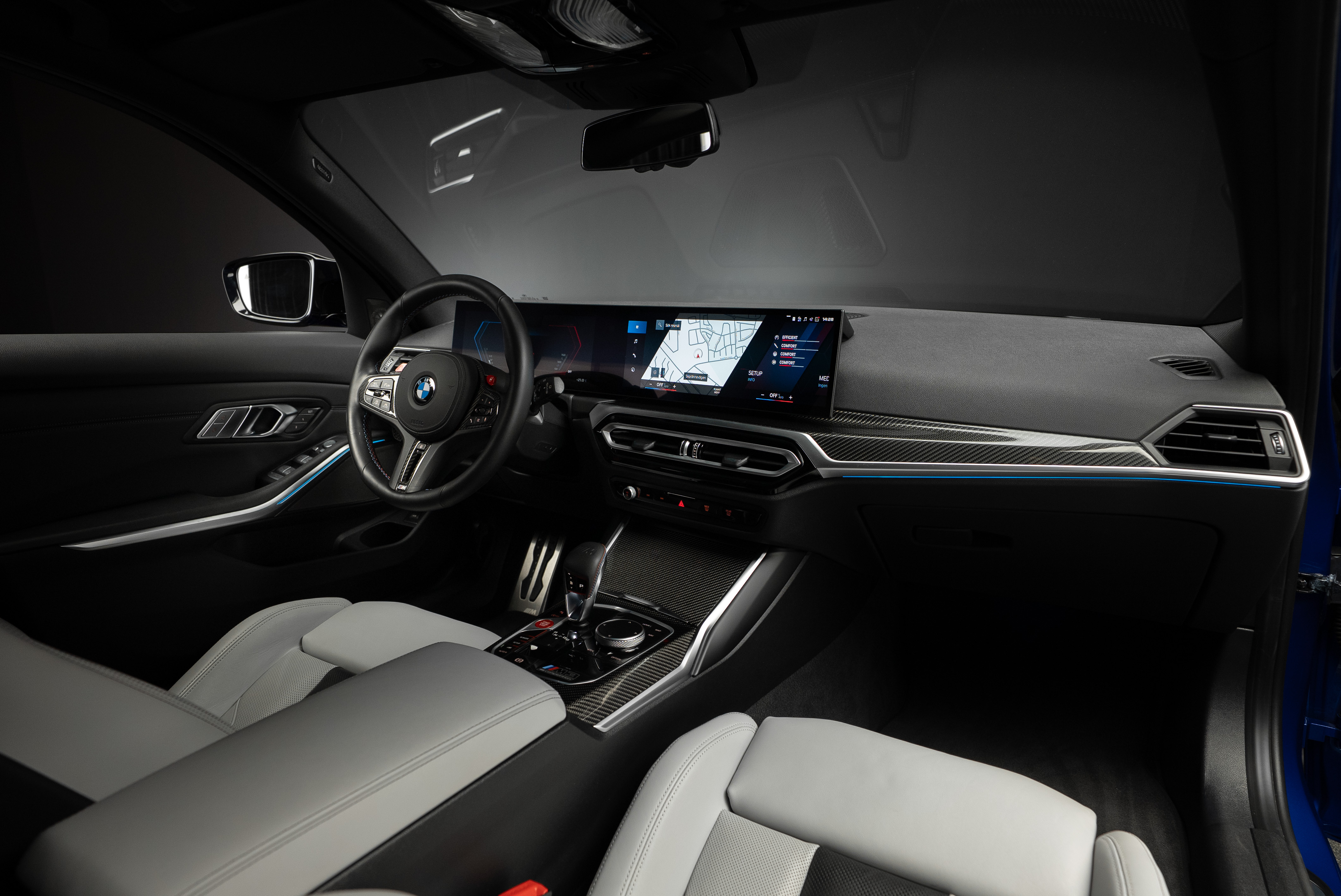 BMW M3 Competition Touring xDrive Steptronic i snygg färgkombination. Portimaoblå metallic med inredning i Silverstone/Svart Merinoläder.