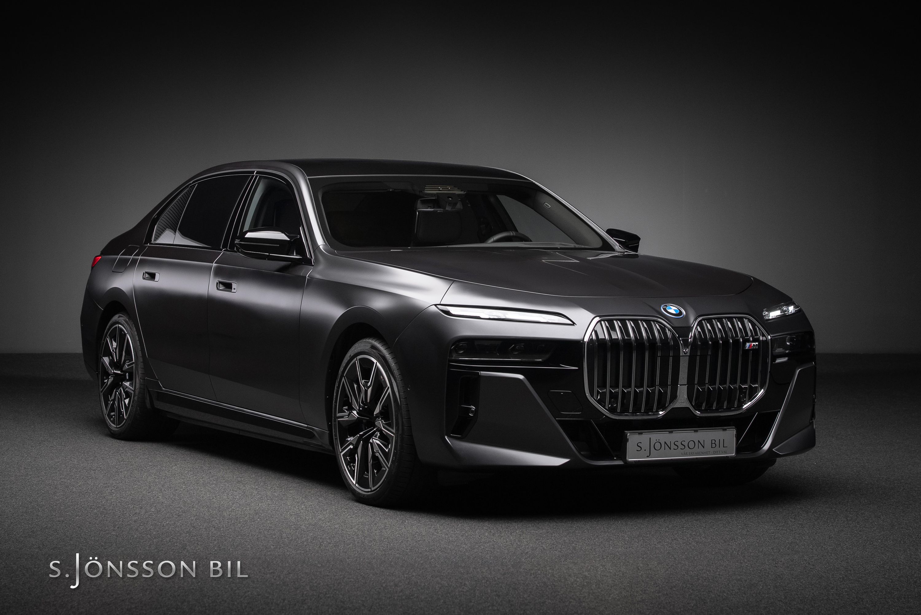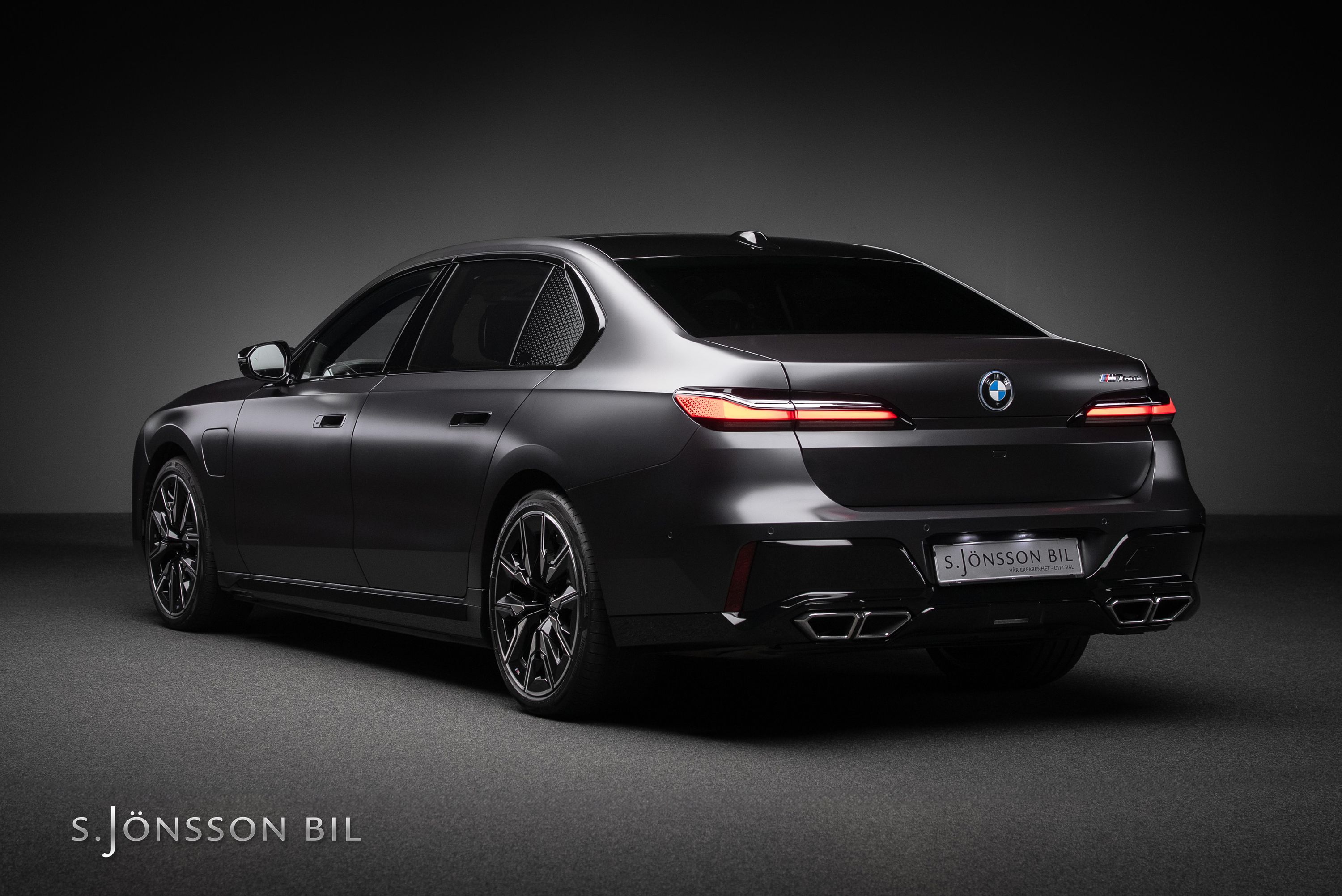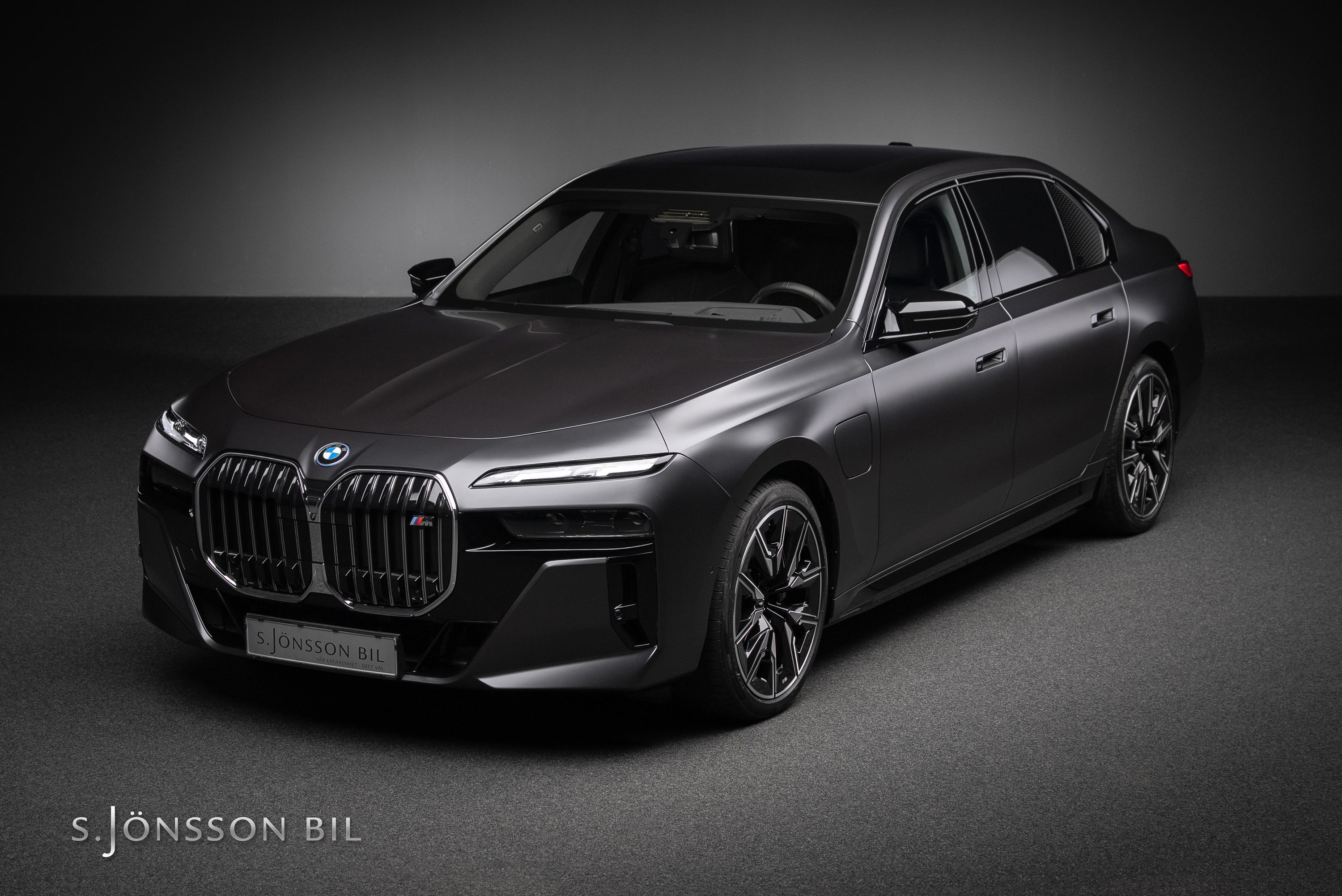BMW M760e XDrive laddhybrid med fin spec. Lackerad i Individual Frozen Deep Grey metallic kombinerat med interiör i svart Individual läder.