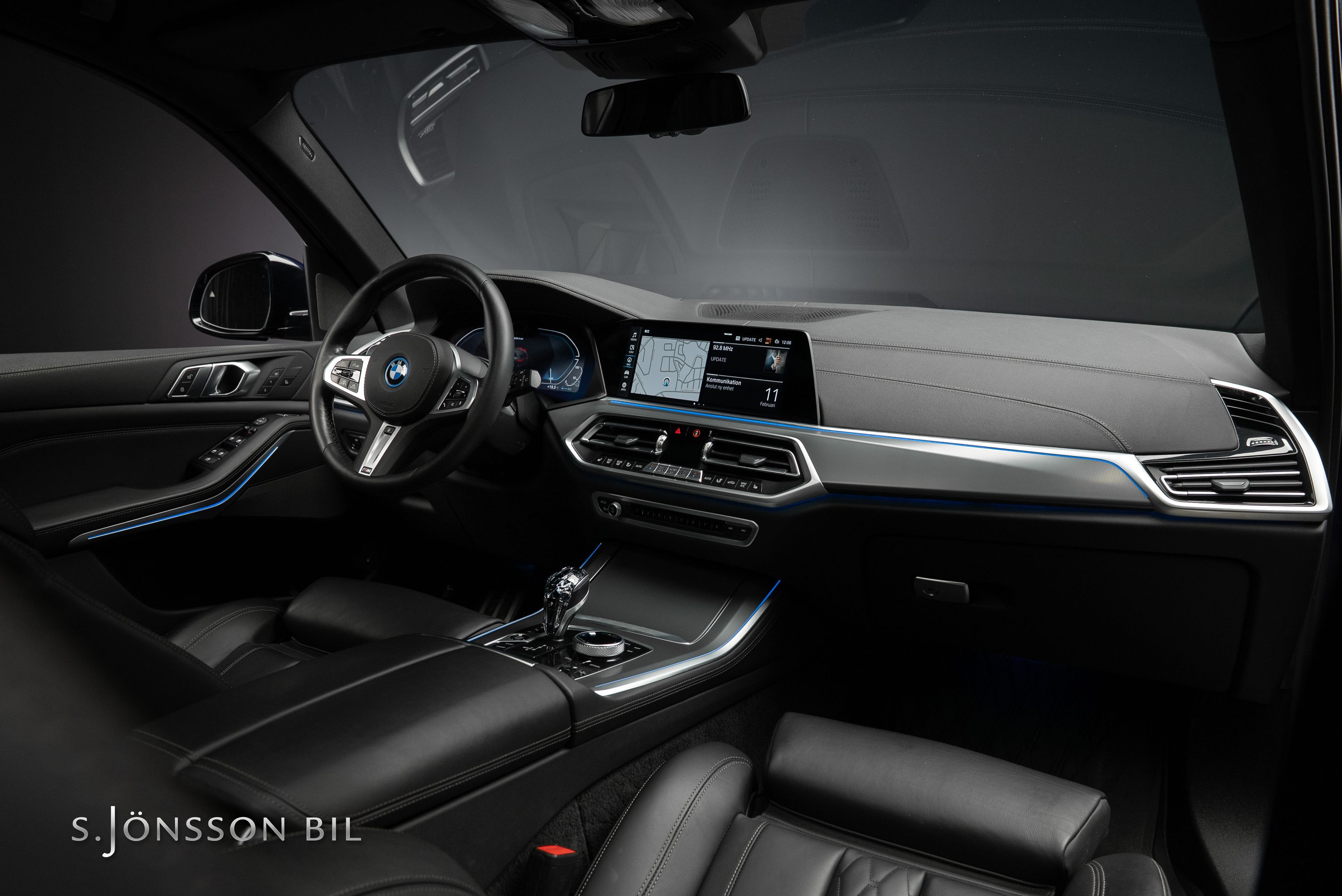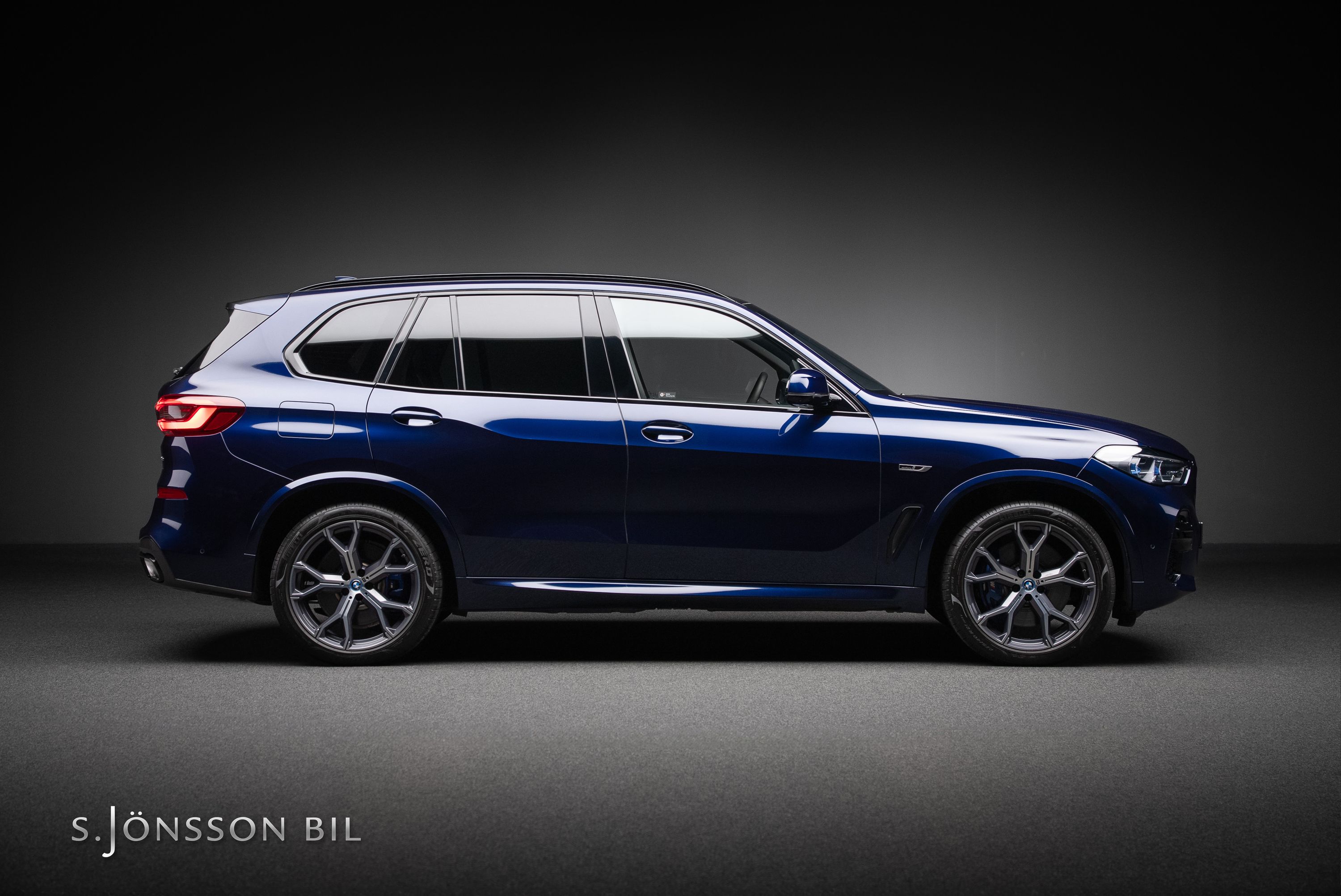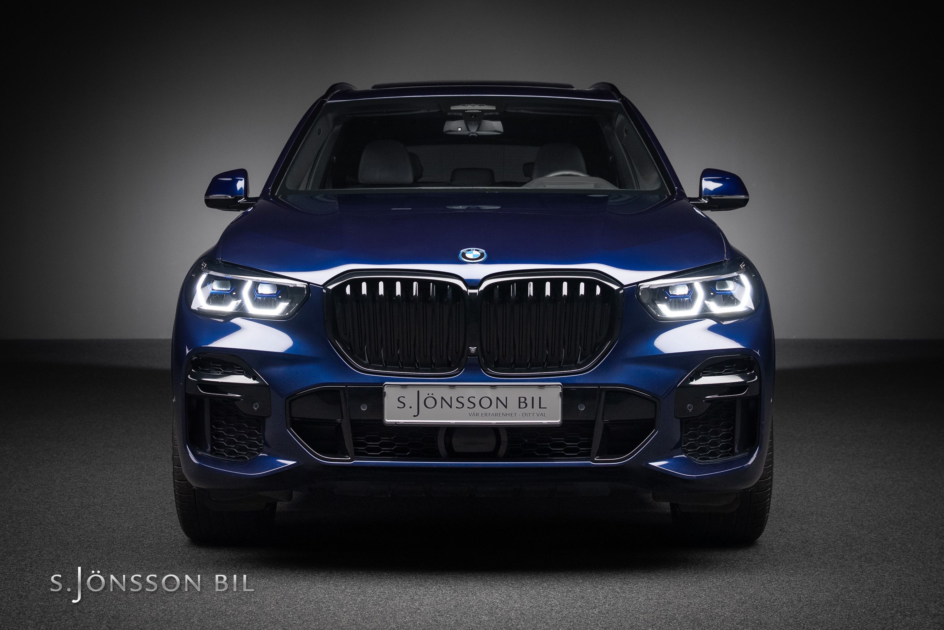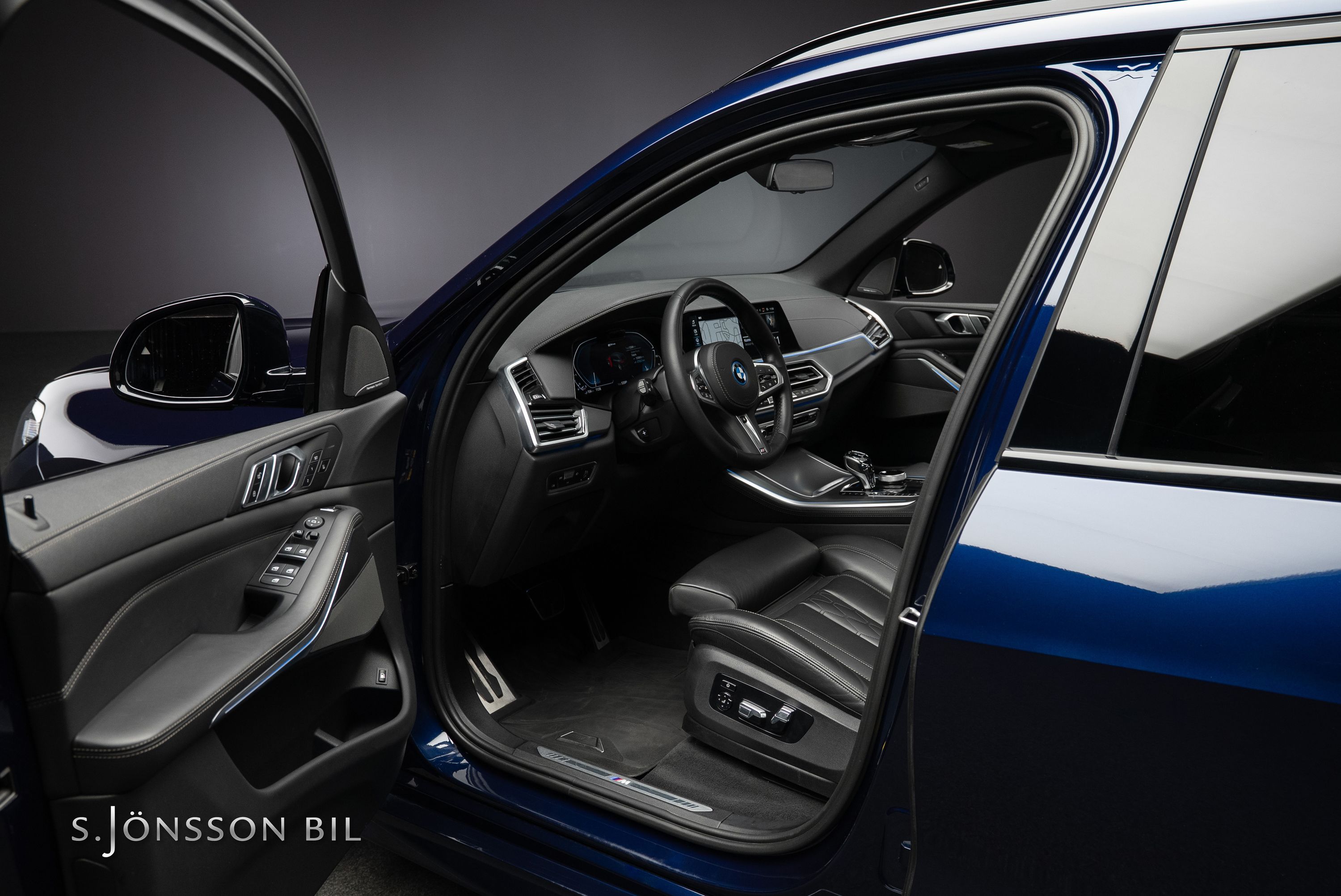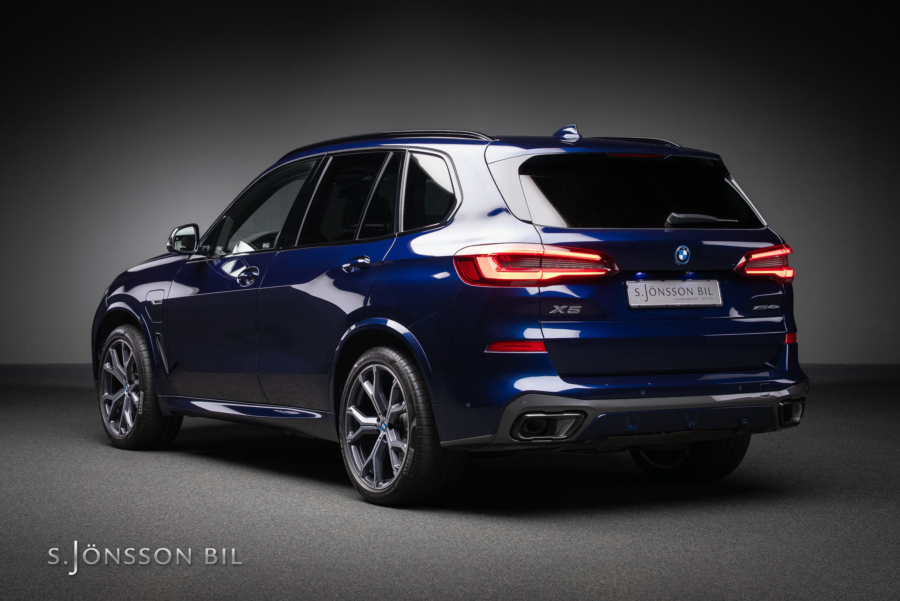 BMW X5 45e M-Sport laddhybrid lackerad i Tanzanitblå Metallic kombinerat med svart läderinteriör. Detta exemplar är bland annat utrustad med BMW:s eftertraktade laser strålkastare samt komfortstolar i utökat läder. På en laddning kommer man upp till 87 km enligt WLTP tack vara batteriet på 24 kW/h.
