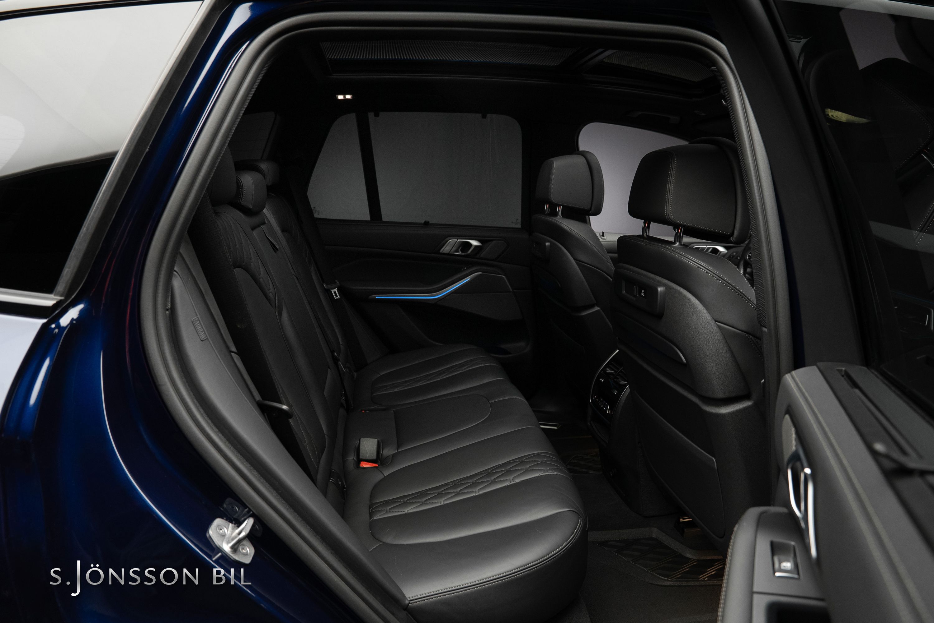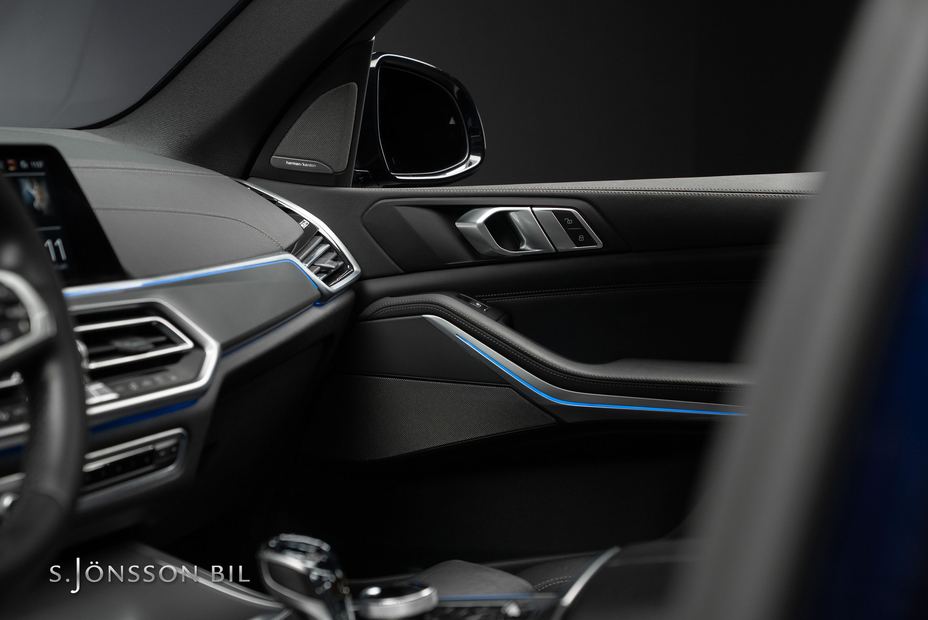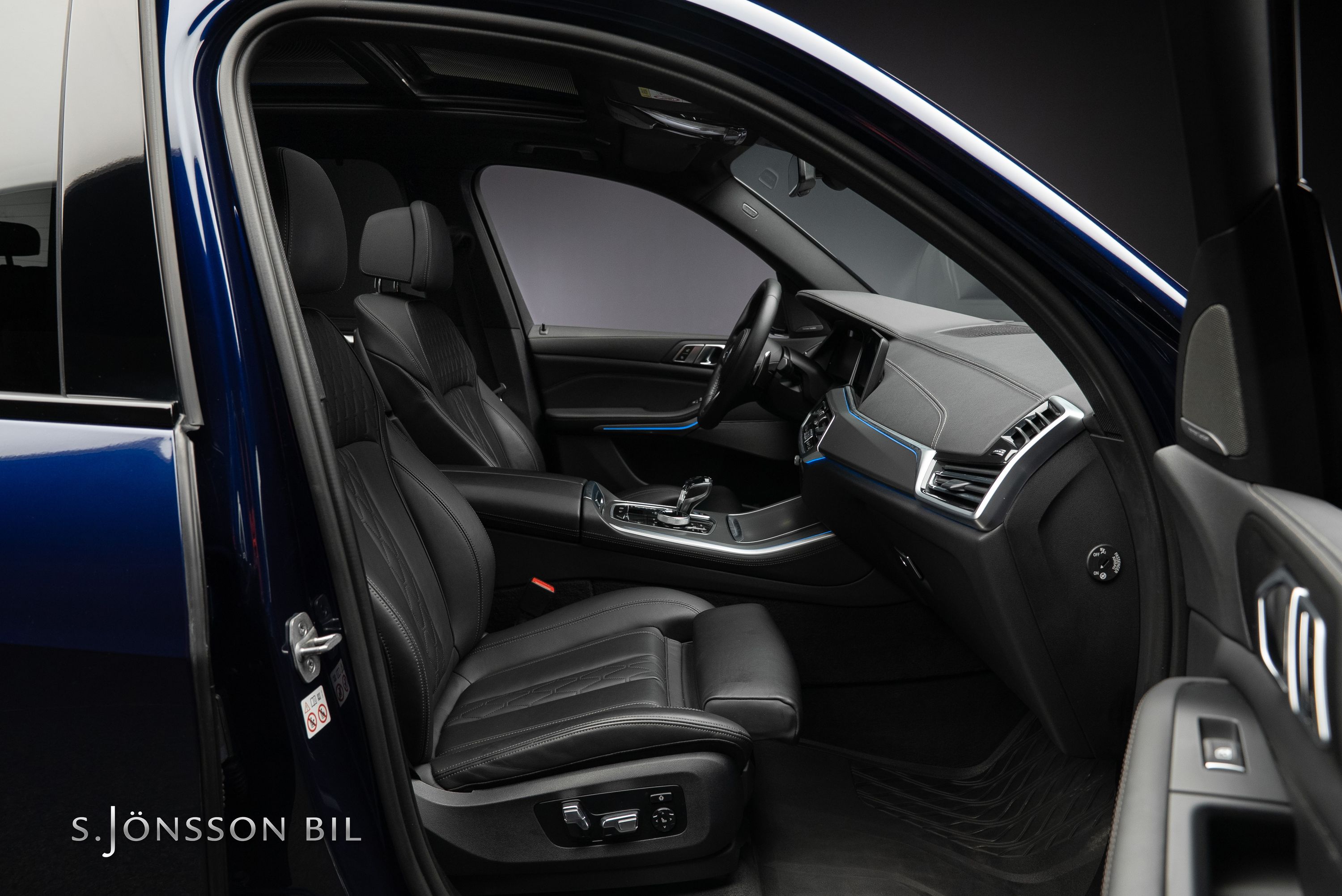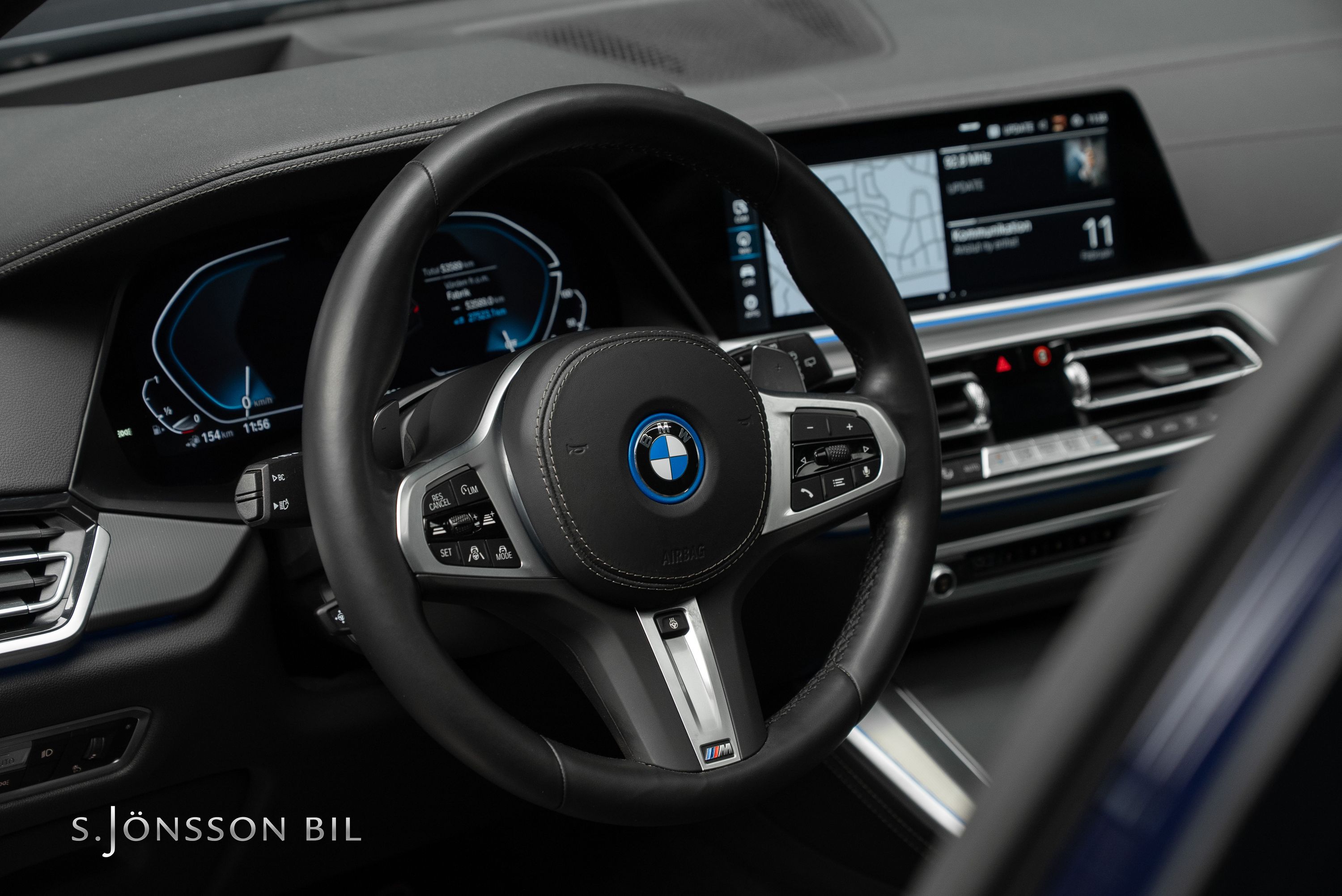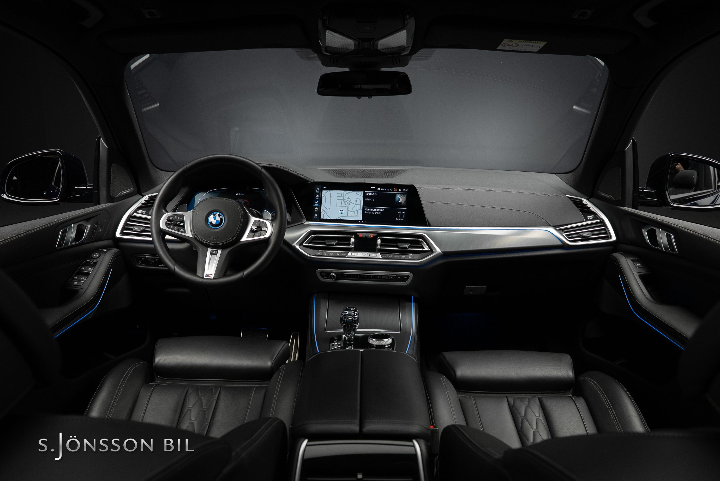 BMW X5 45e M-Sport laddhybrid lackerad i Tanzanitblå Metallic kombinerat med svart läderinteriör. Detta exemplar är bland annat utrustad med BMW:s eftertraktade laser strålkastare samt komfortstolar i utökat läder. På en laddning kommer man upp till 87 km enligt WLTP tack vara batteriet på 24 kW/h.