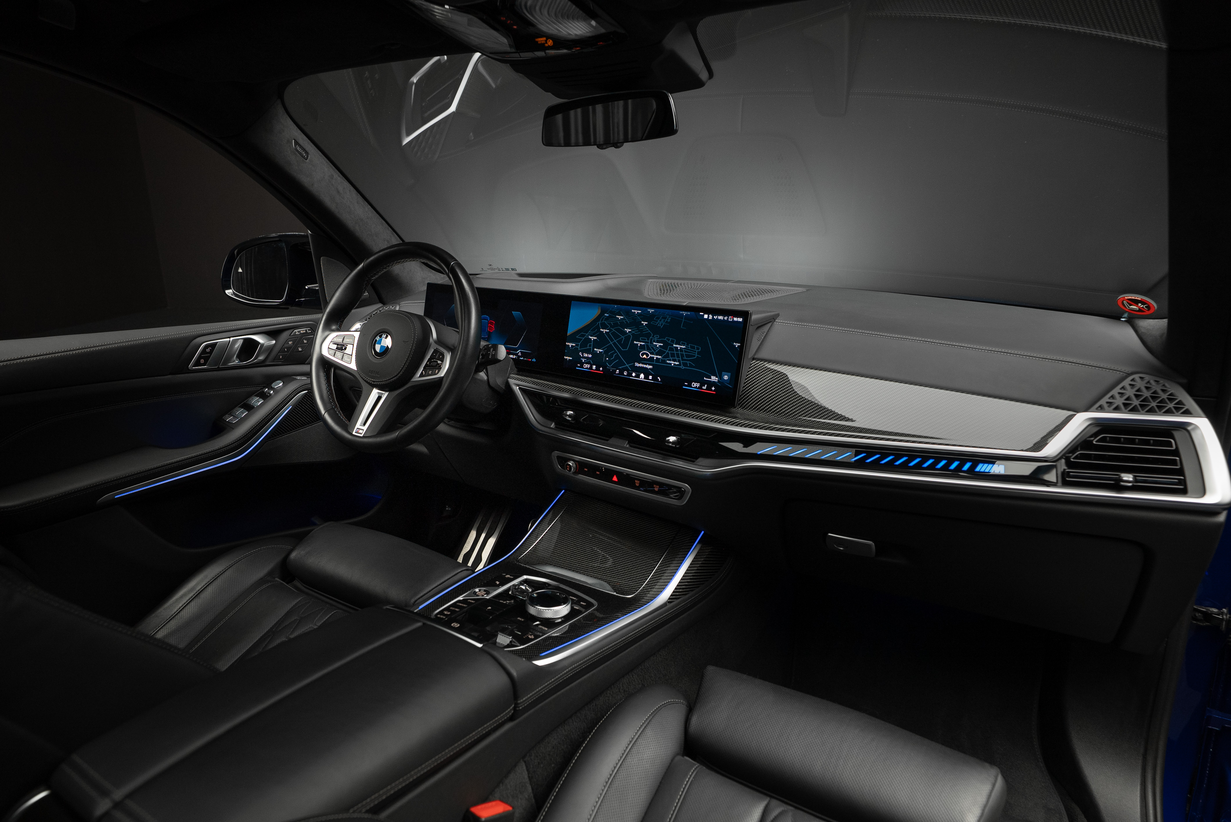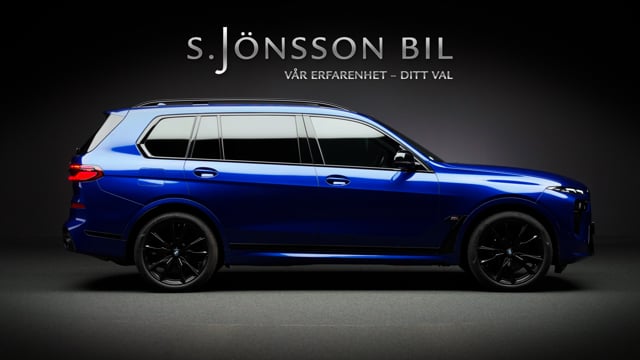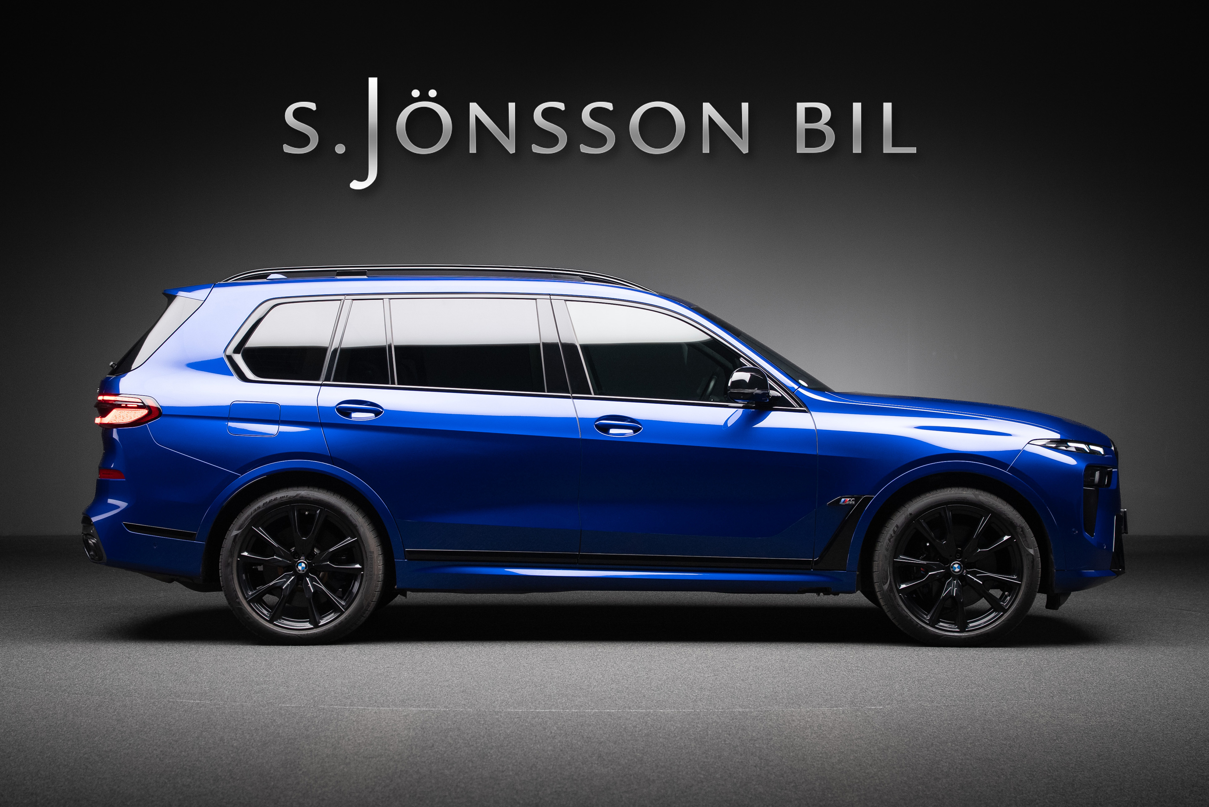 BMW X7 M60i xDrive lackerad i M Marina Bay Blue metallic med interiör BMW individual merino svart - svart alcantara innertak.