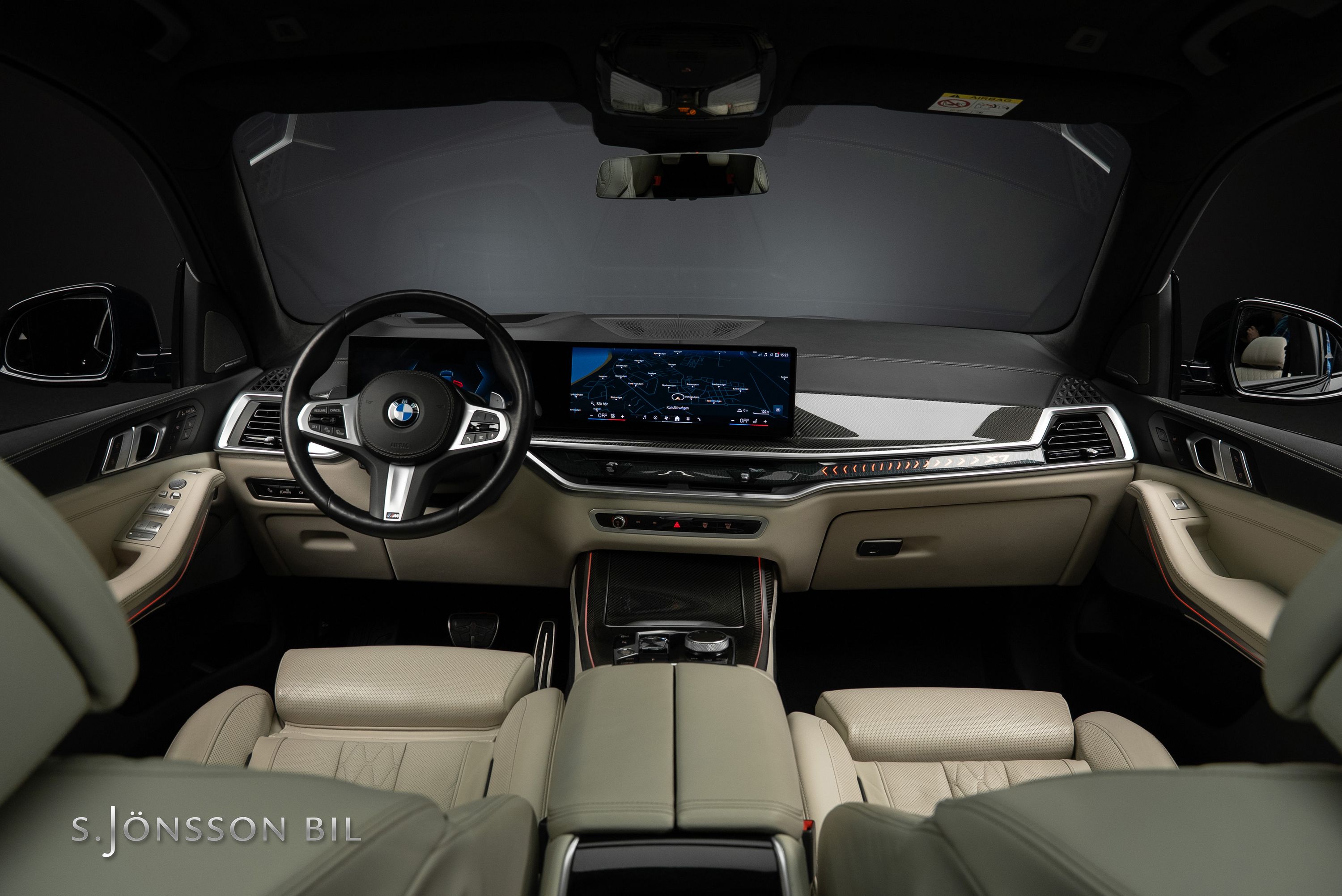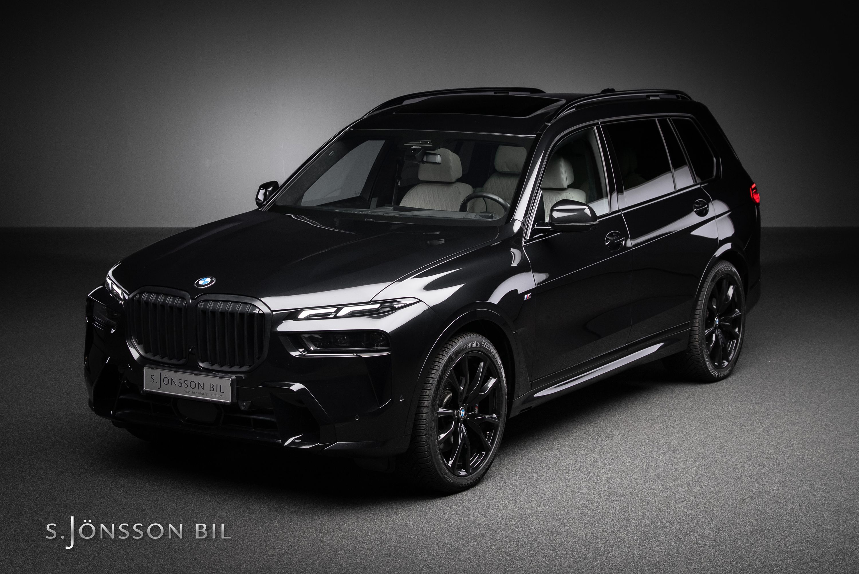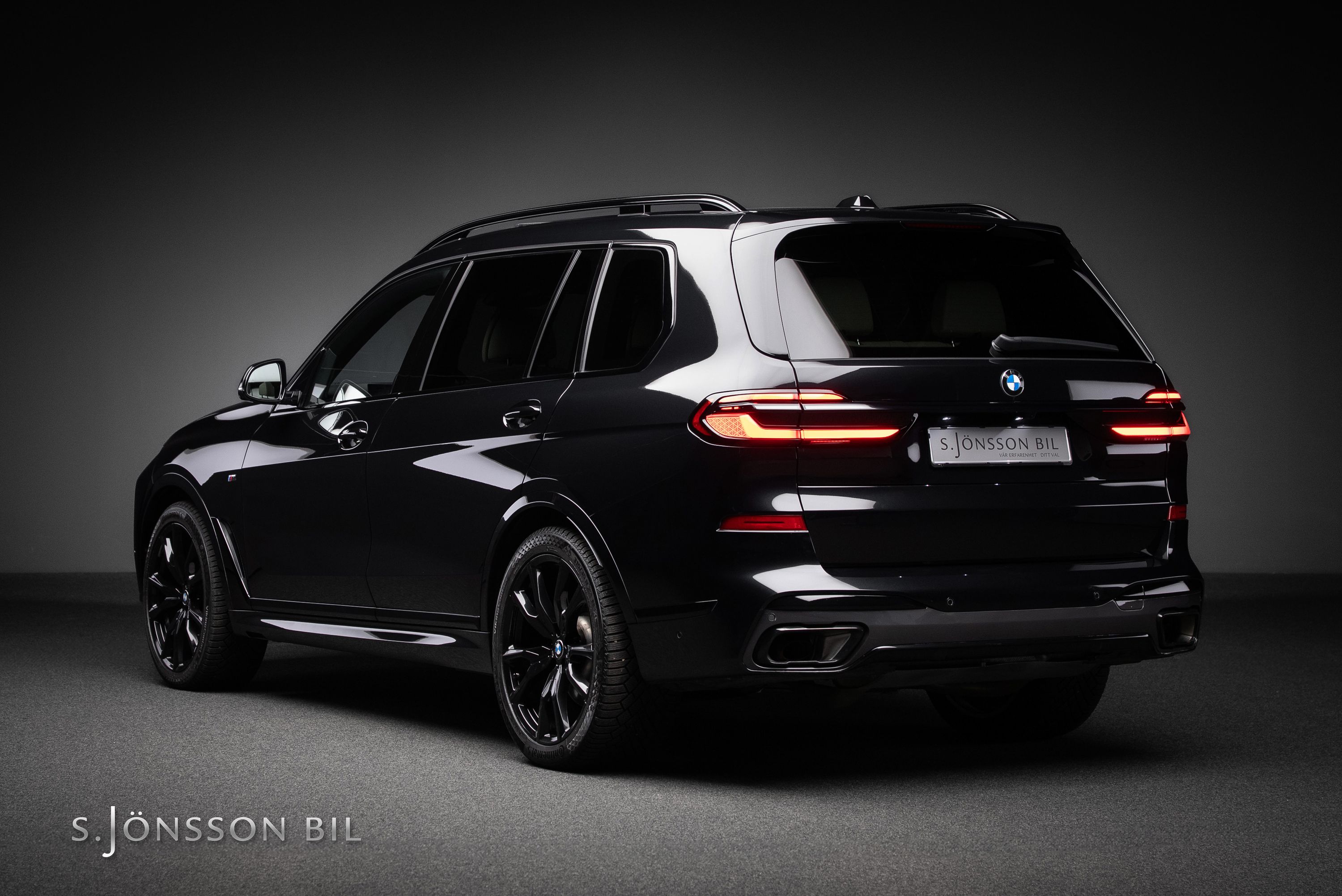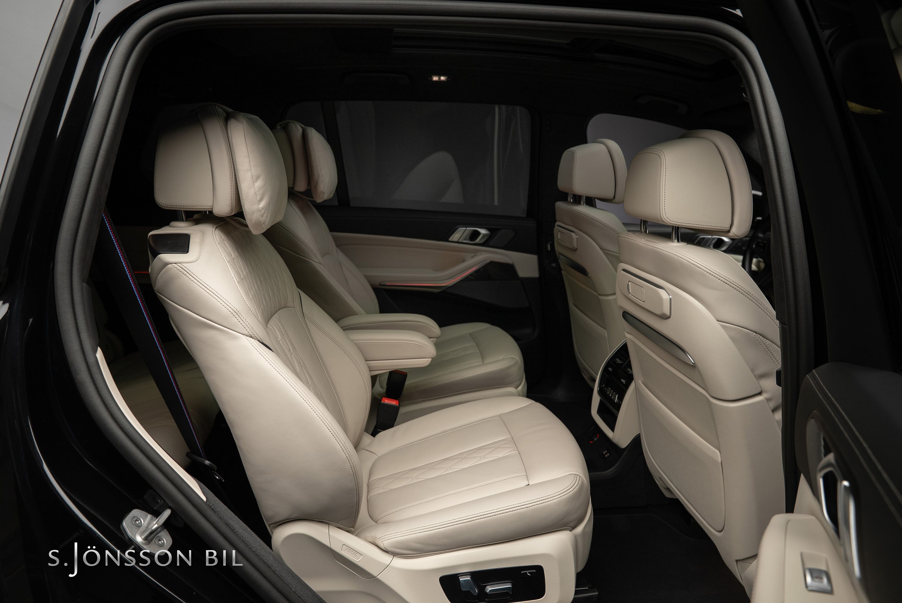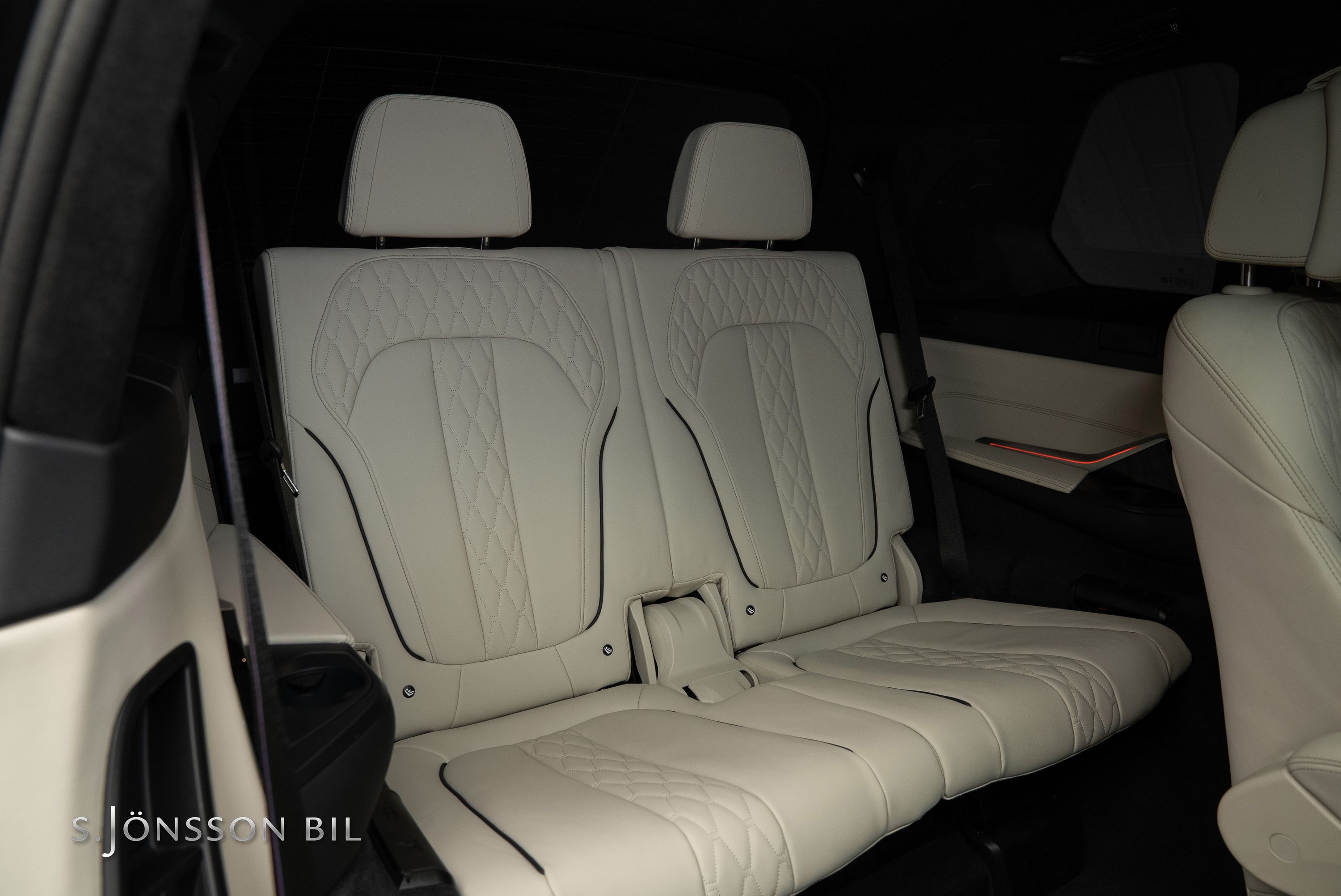 BMW X7 40d facelift lackerad i Black Sapphire metallic kombinerat med utökat läder i Ivory White/Svart. Detta exemplar är i 6-sits konfigurationen vilket innebär två elektrisk manöverbara kaptensstolar i andra sätesraden. Kombinerat med utrustningen för 316 500kr bidrar till en lyxig och komfortabel upplevelse i BMW:s SUV-flaggskepp. Med faceliften kom en rad uppgraderingar så som ny strålkastardesign, moderniserad interiör samt en ny front.
