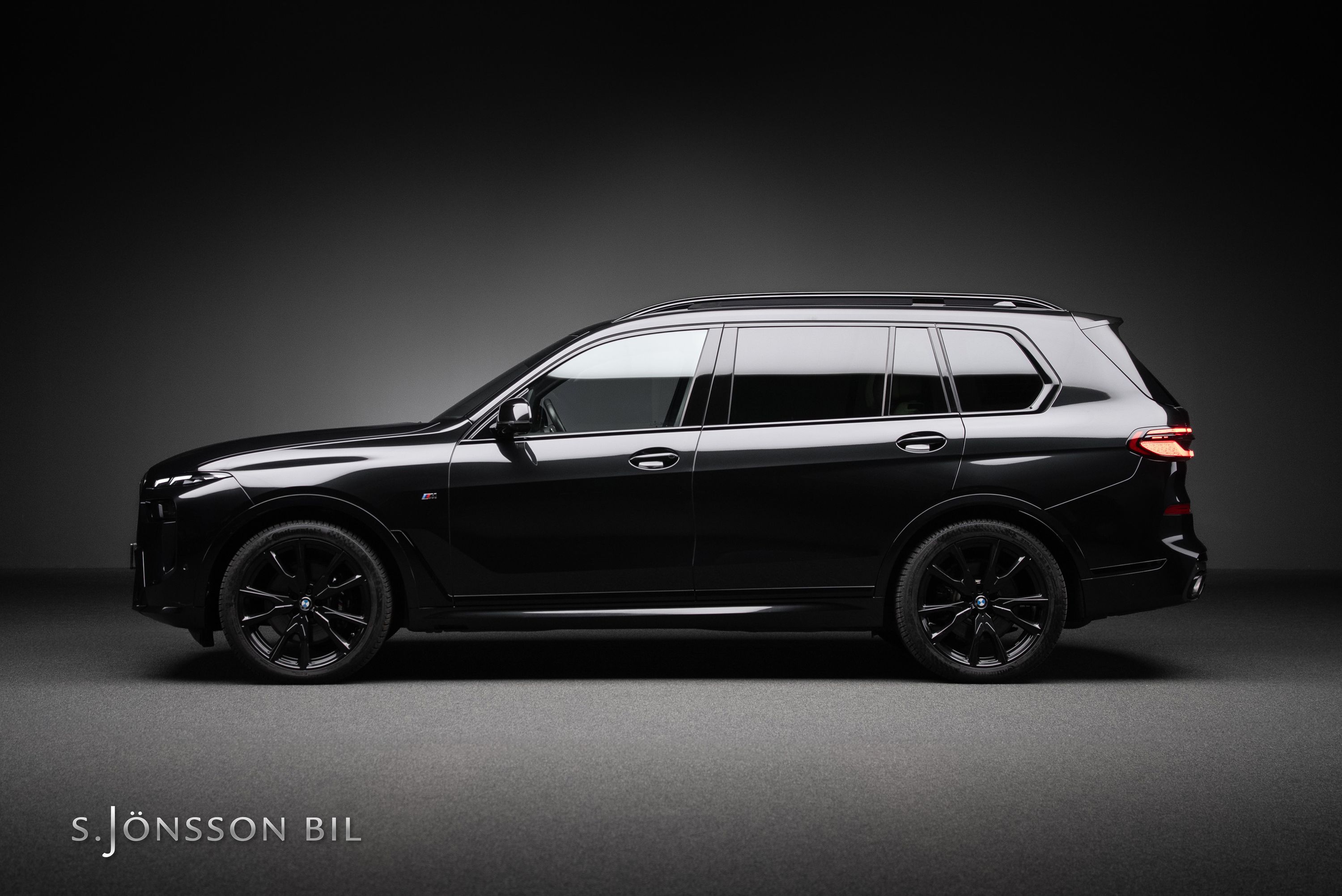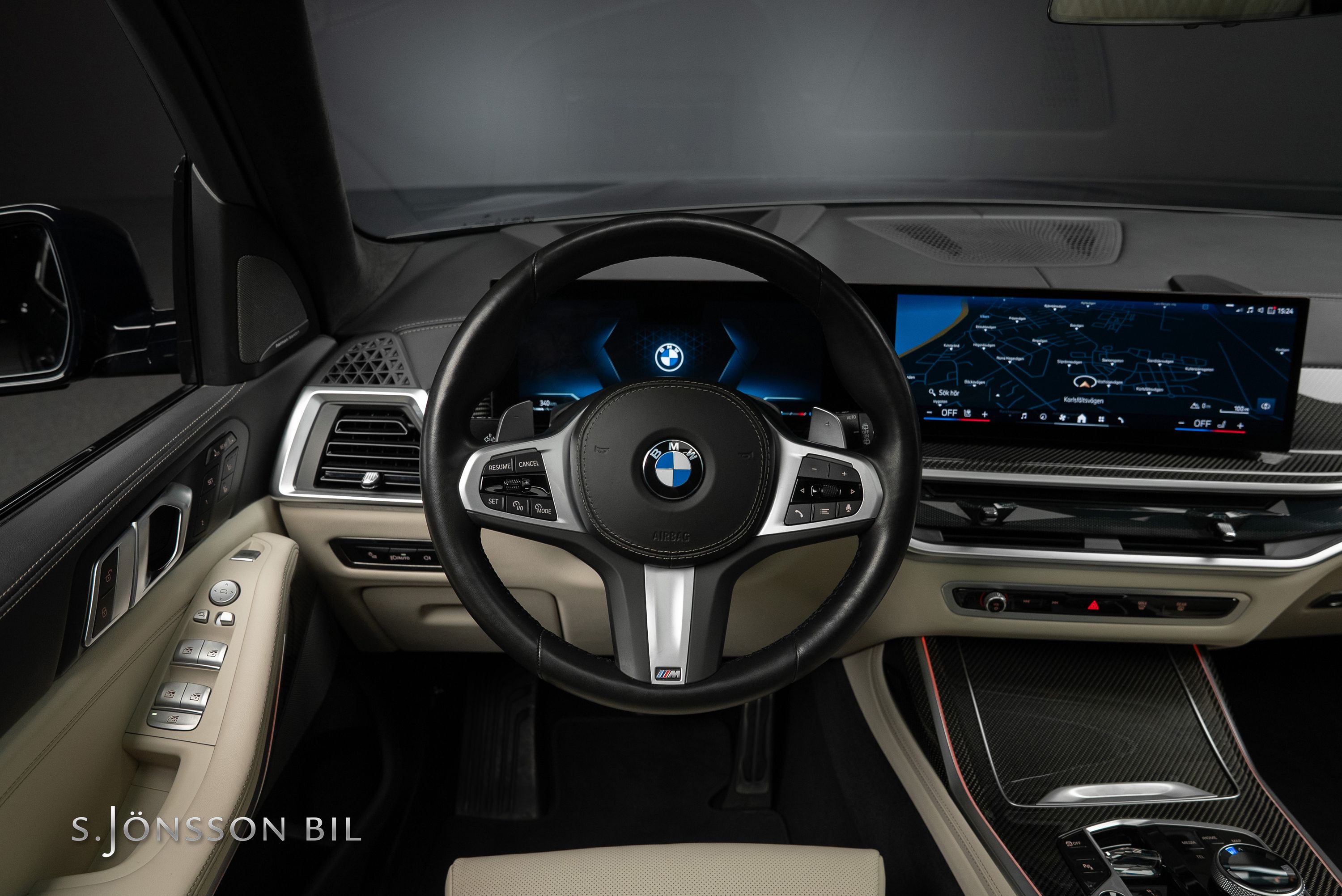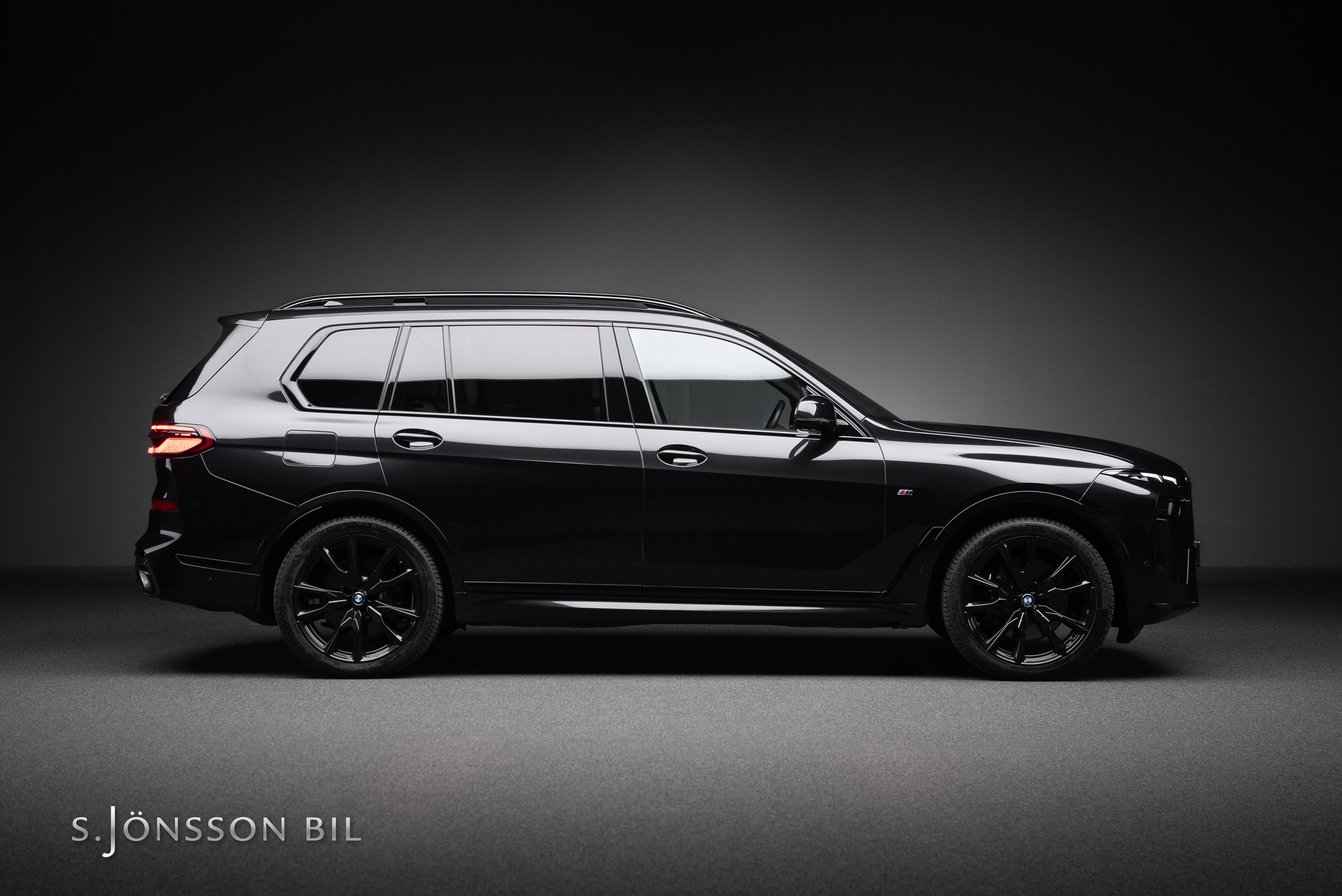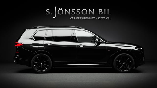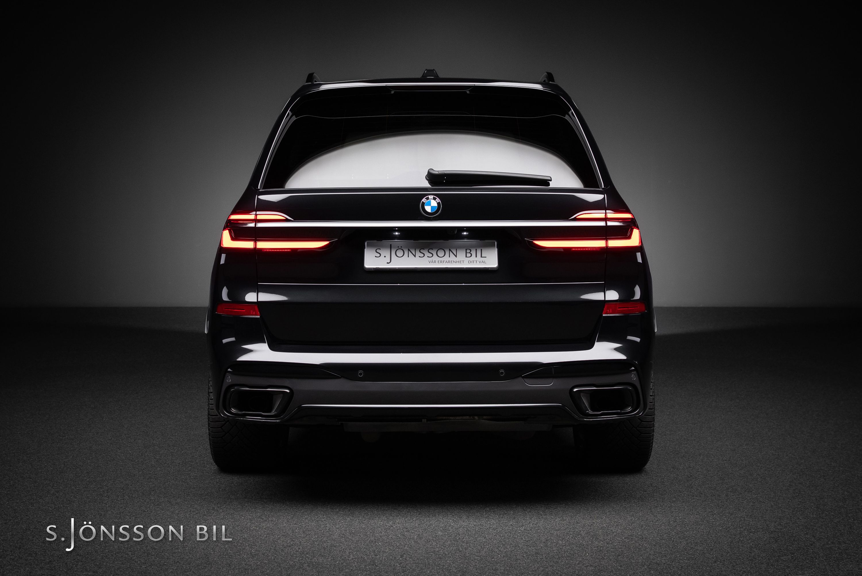 BMW X7 40d facelift lackerad i Black Sapphire metallic kombinerat med utökat läder i Ivory White/Svart. Detta exemplar är i 6-sits konfigurationen vilket innebär två elektrisk manöverbara kaptensstolar i andra sätesraden. Kombinerat med utrustningen för 316 500kr bidrar till en lyxig och komfortabel upplevelse i BMW:s SUV-flaggskepp. Med faceliften kom en rad uppgraderingar så som ny strålkastardesign, moderniserad interiör samt en ny front.