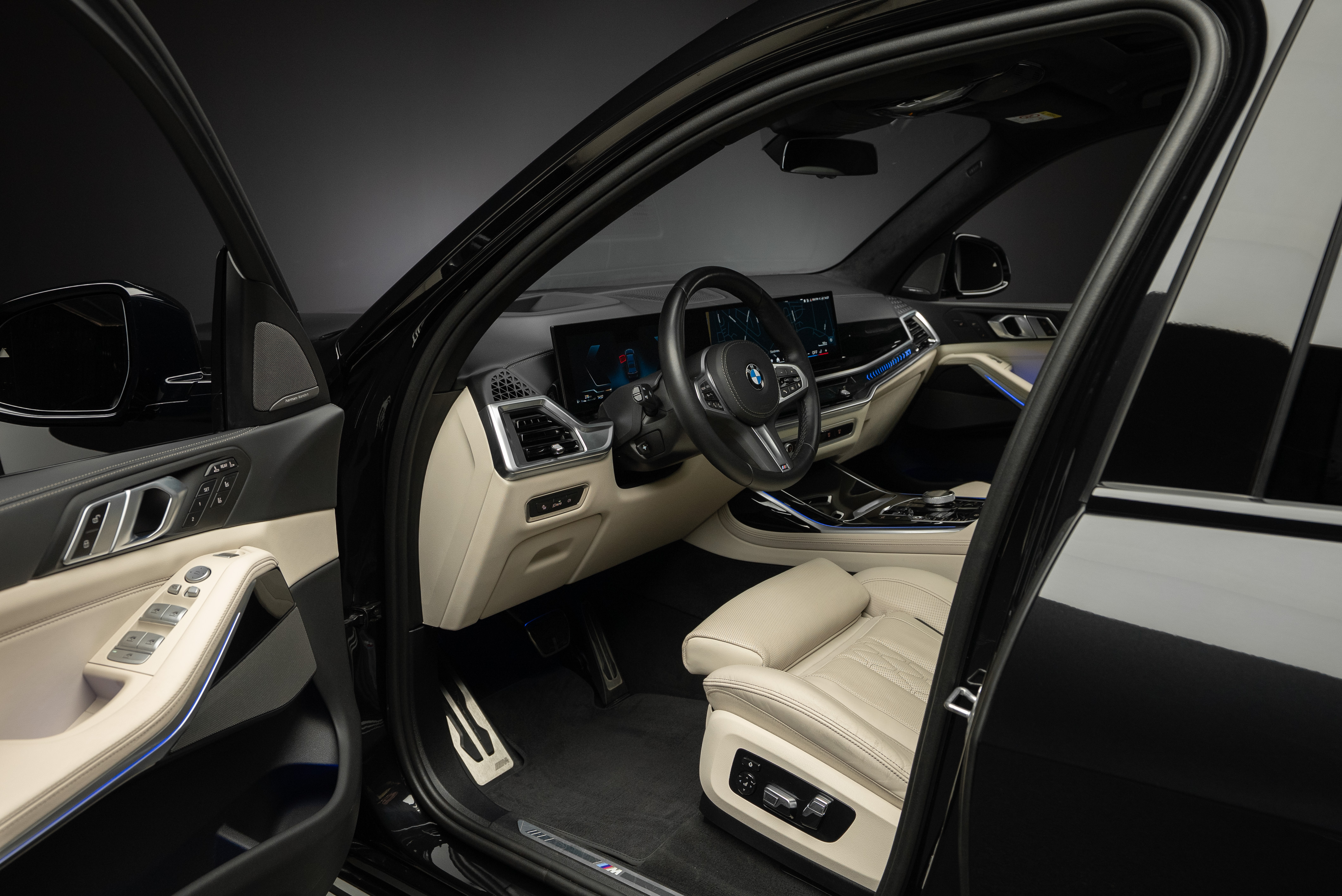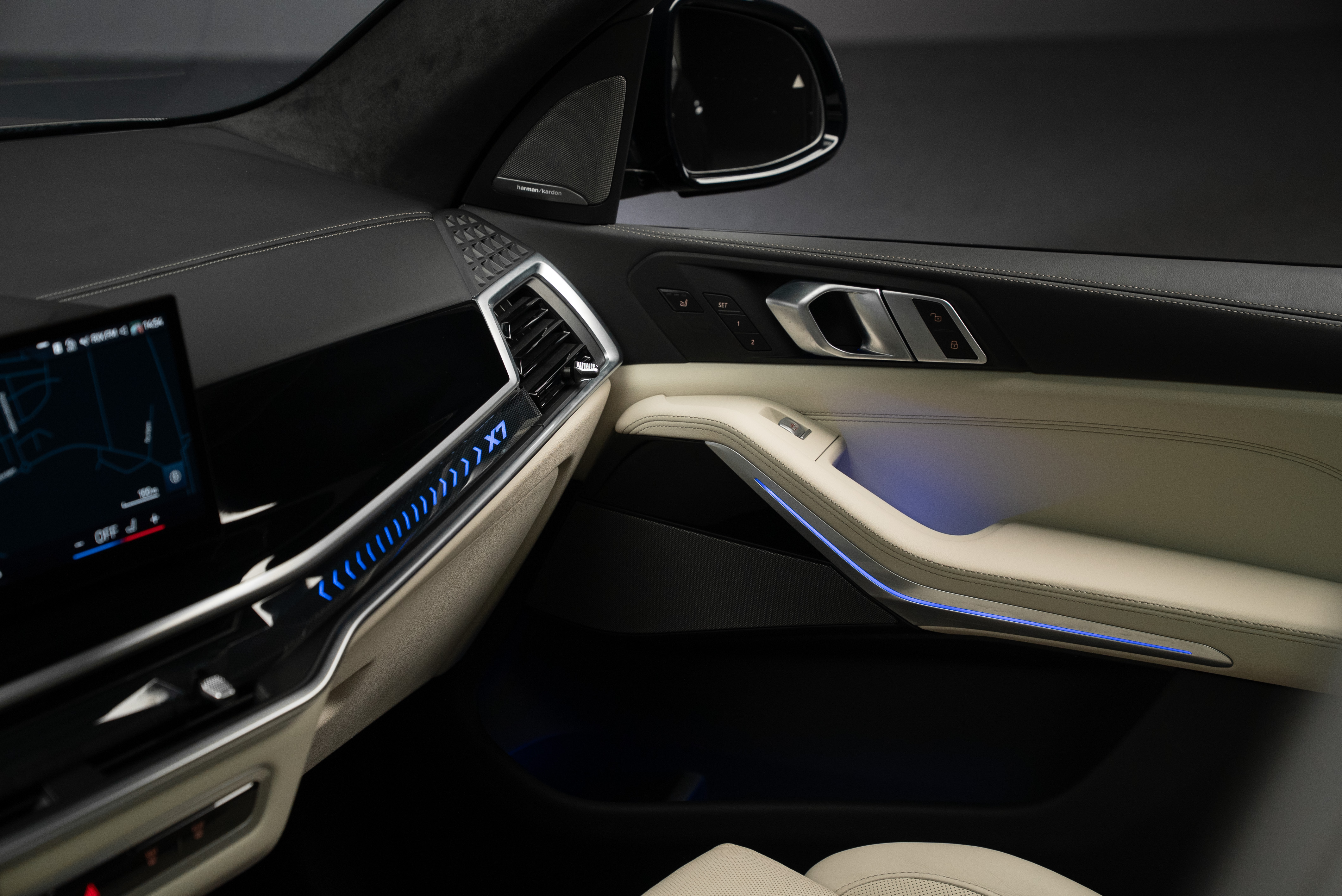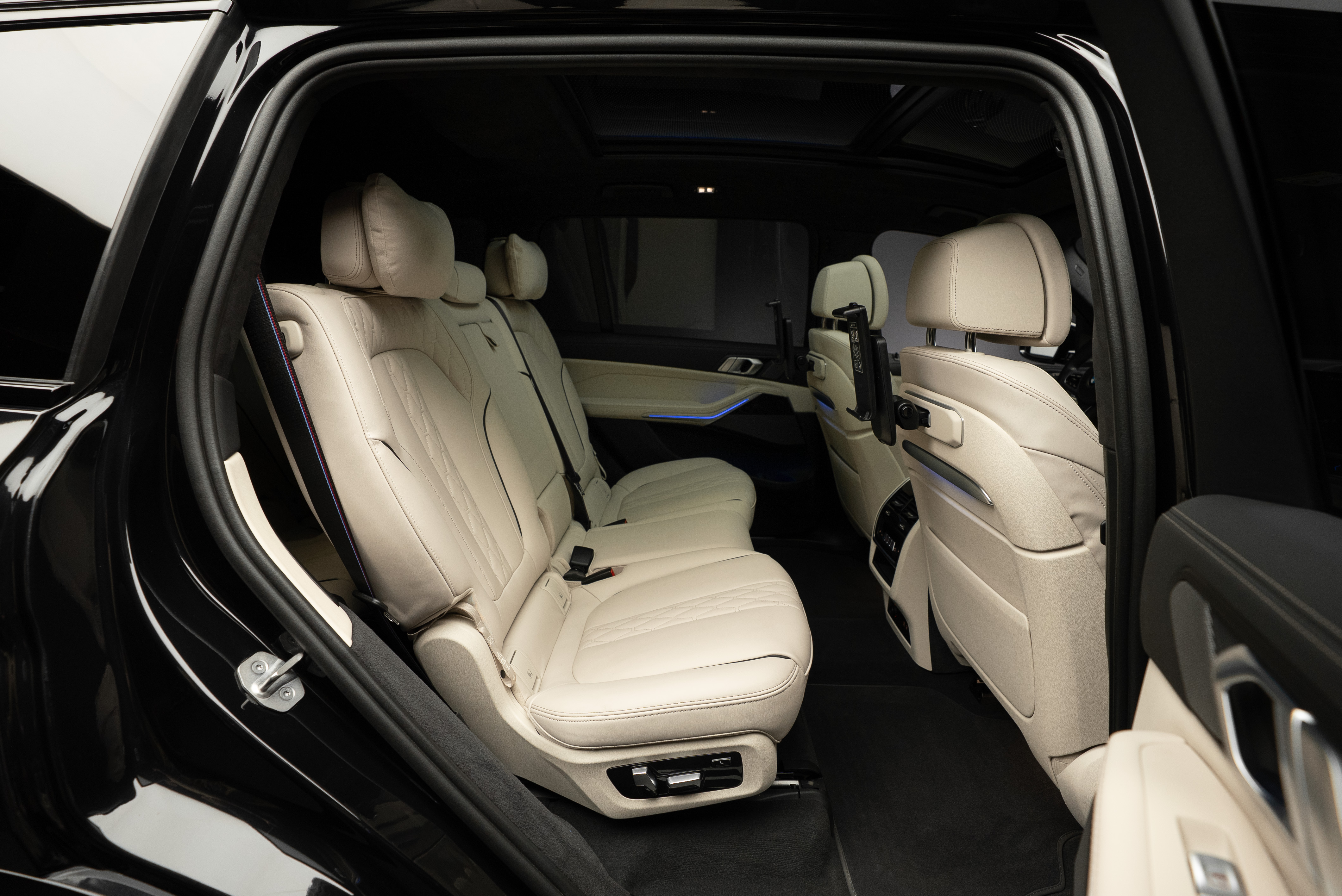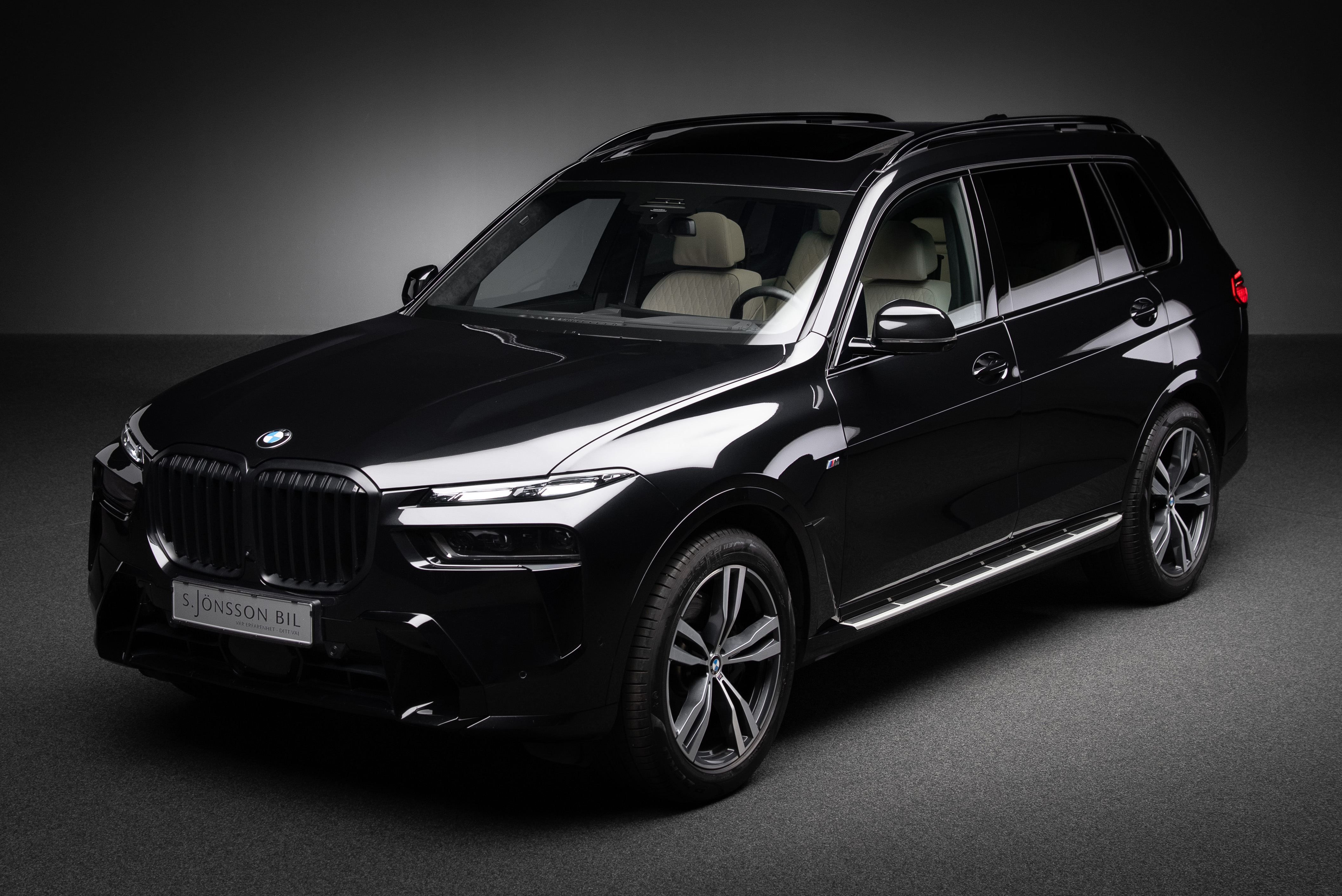 BMW X7 40d lackerad i Black Sapphire metallic kombinerat med utökat Individual merino läder i ivory.