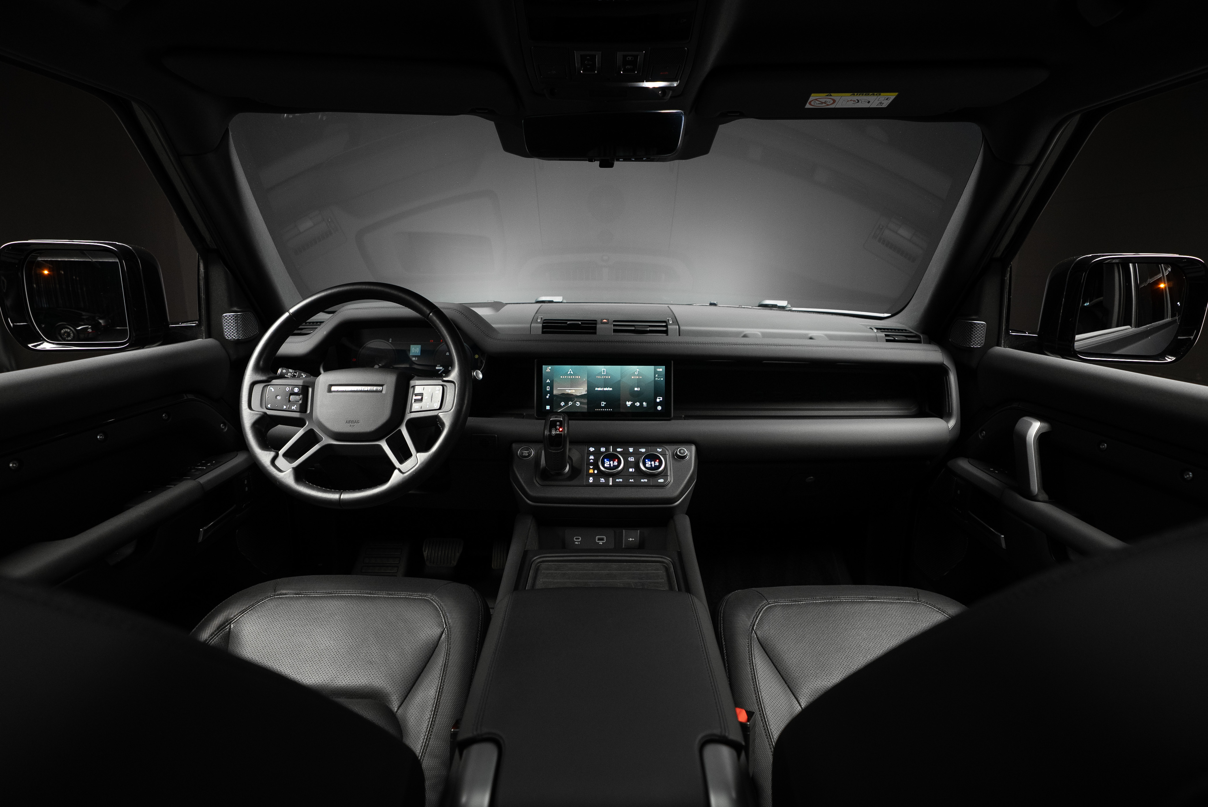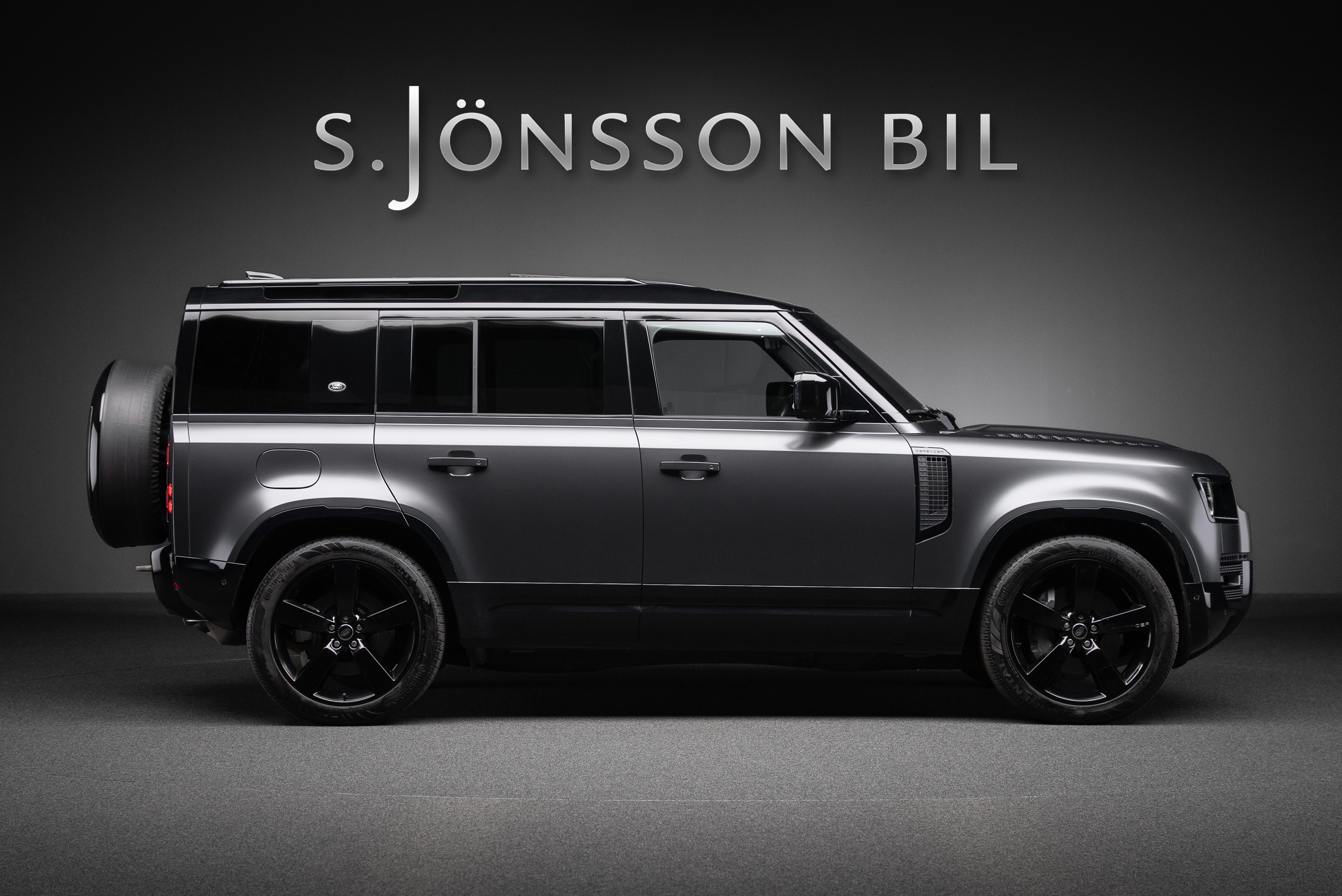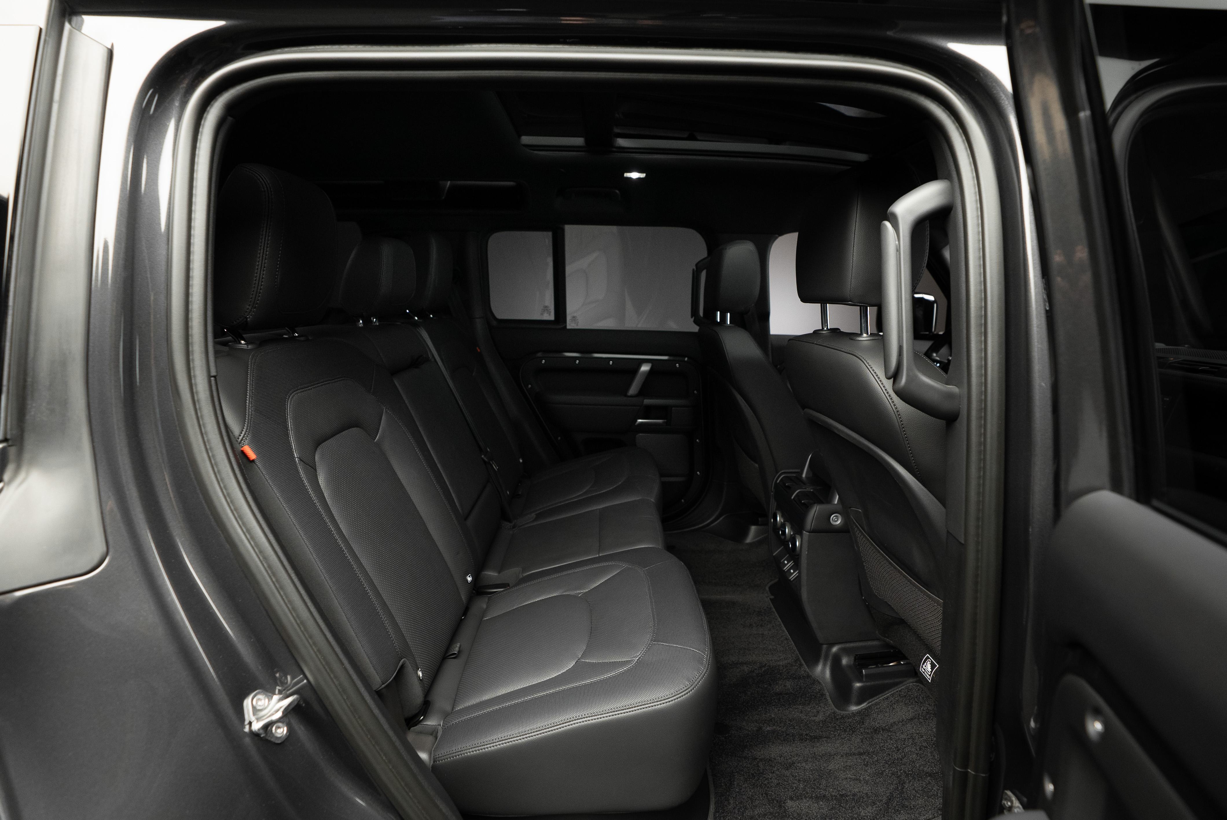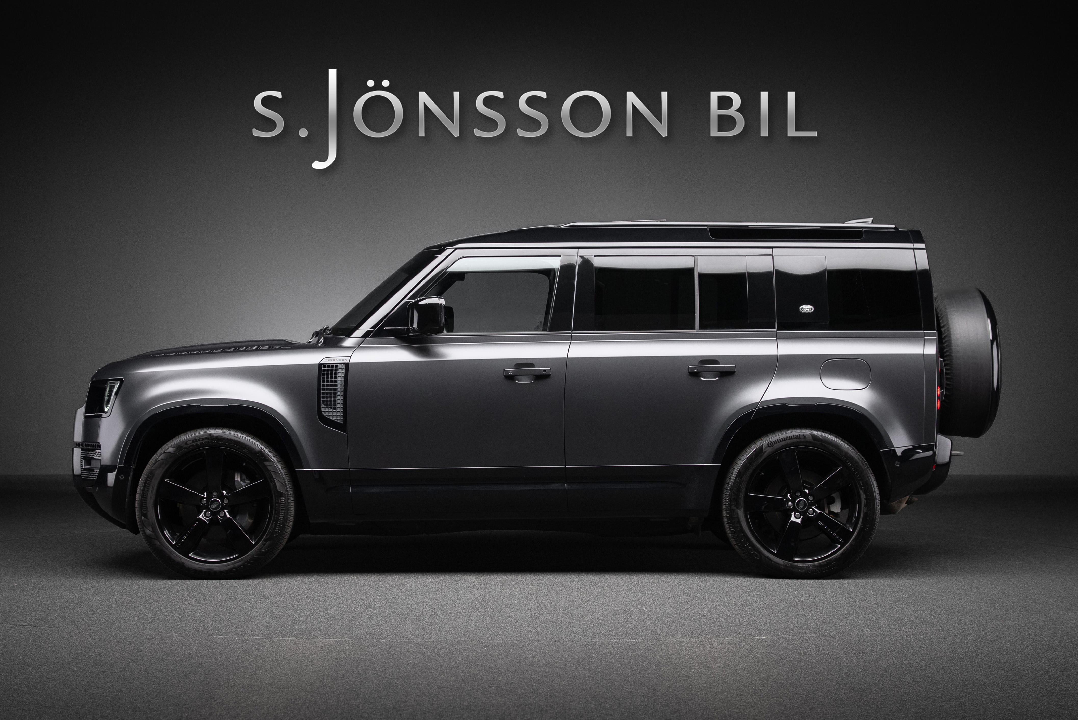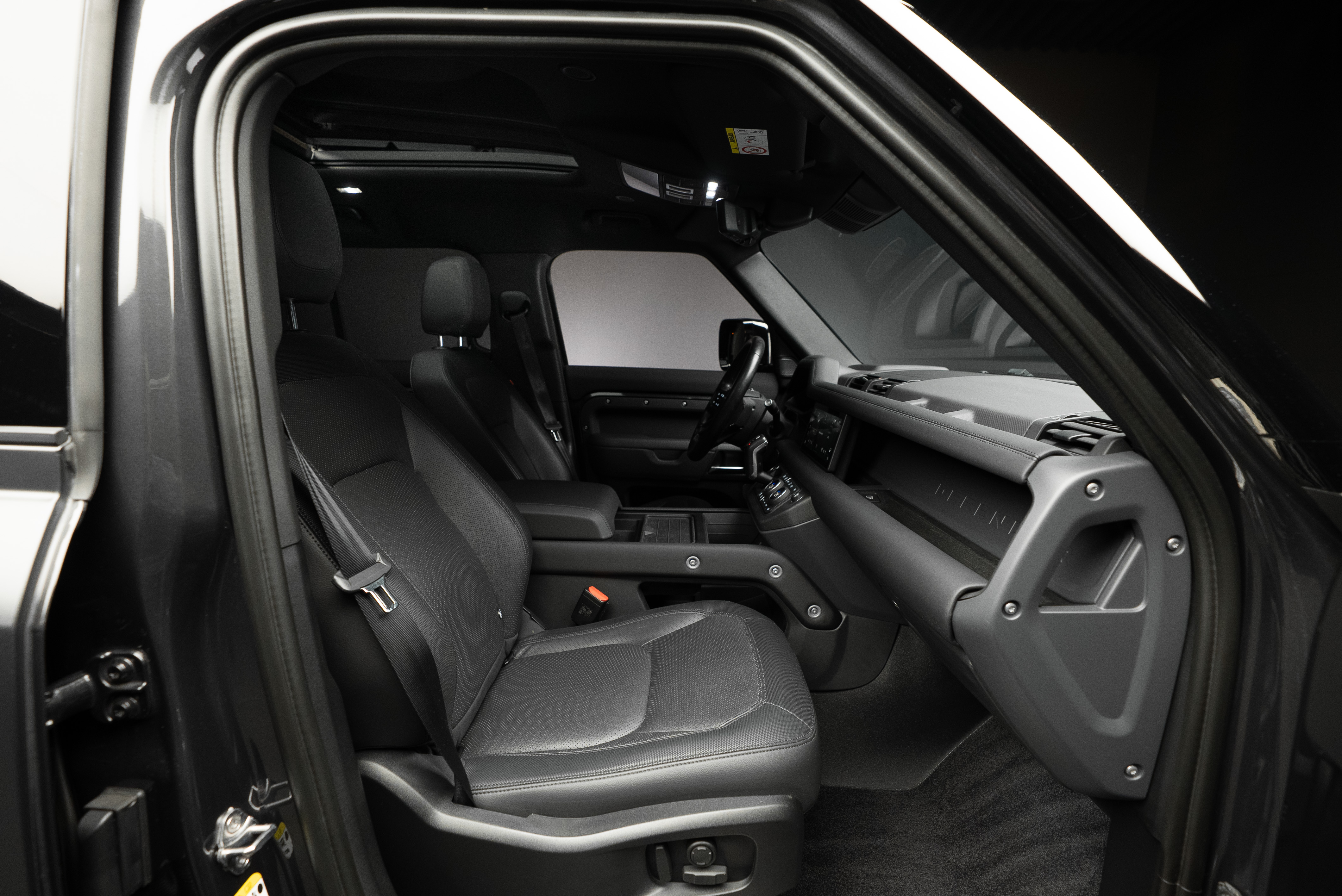 Land Rover Defender 110 P400e laddhybrid folierad i matt Carpathian Grey från fabrik kombinerat med svart läderinteriör. Under folieringen är bilen lackerad i Carpathian Grey metallic.