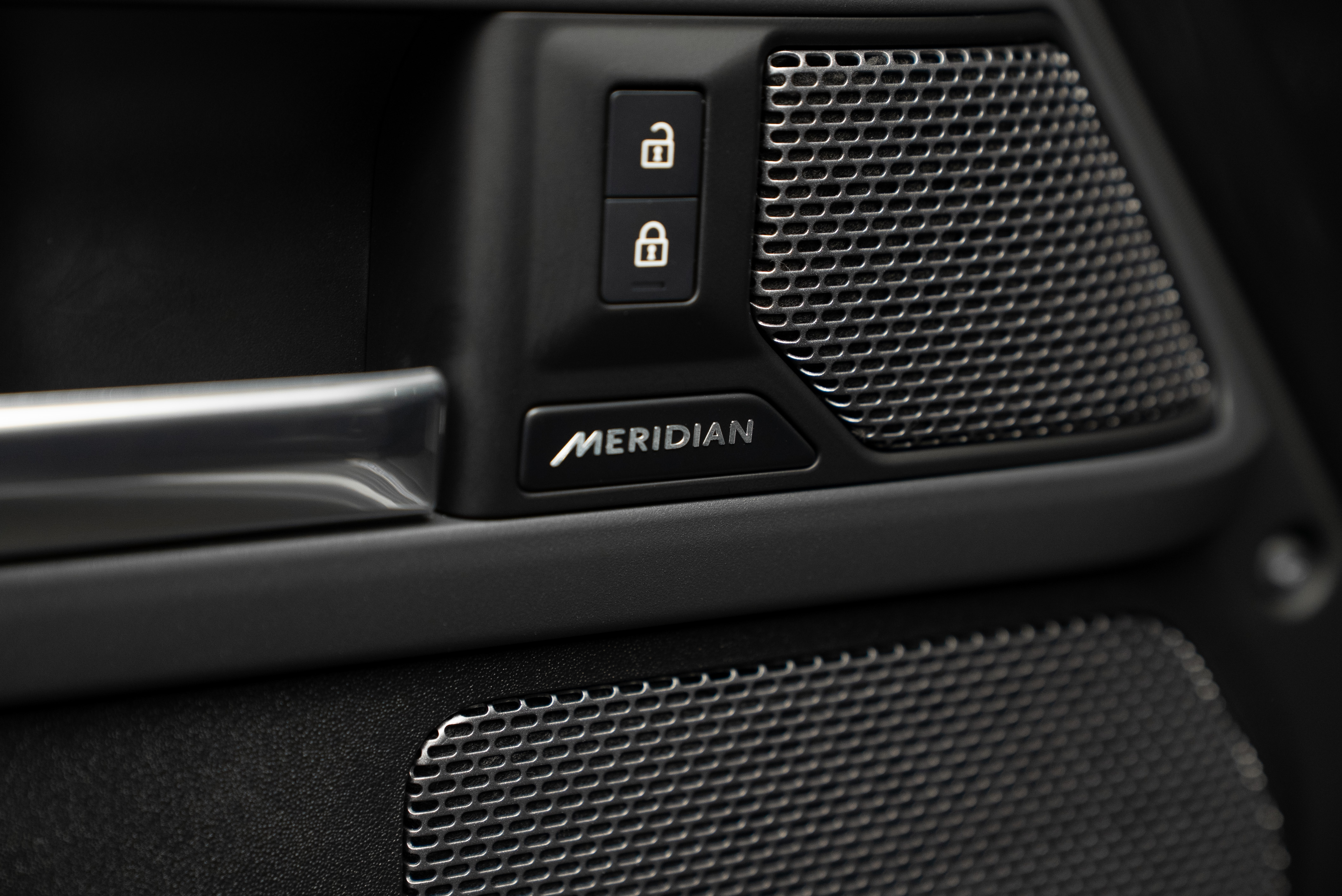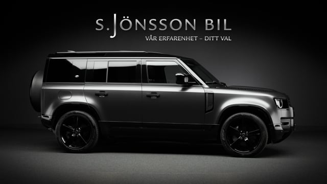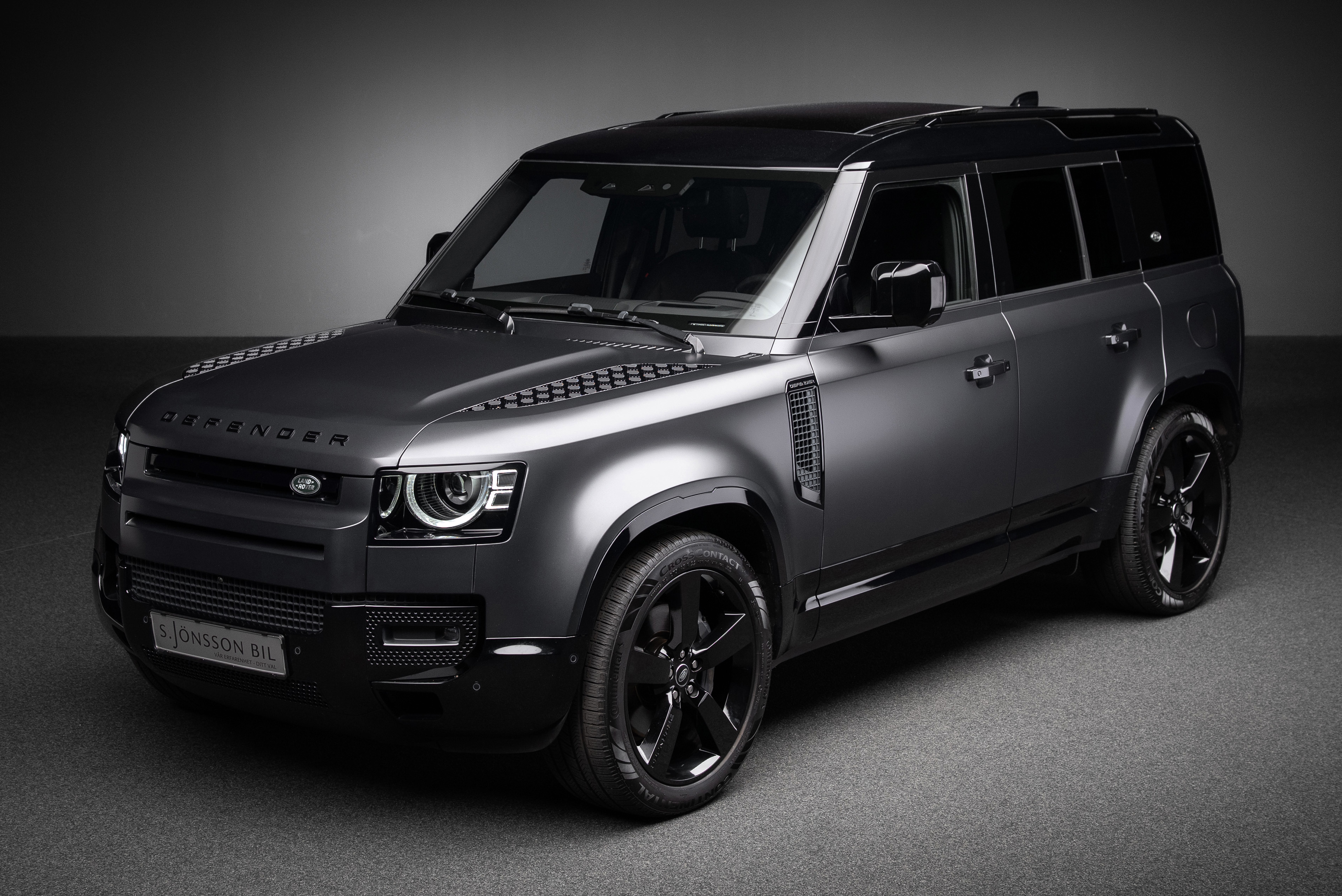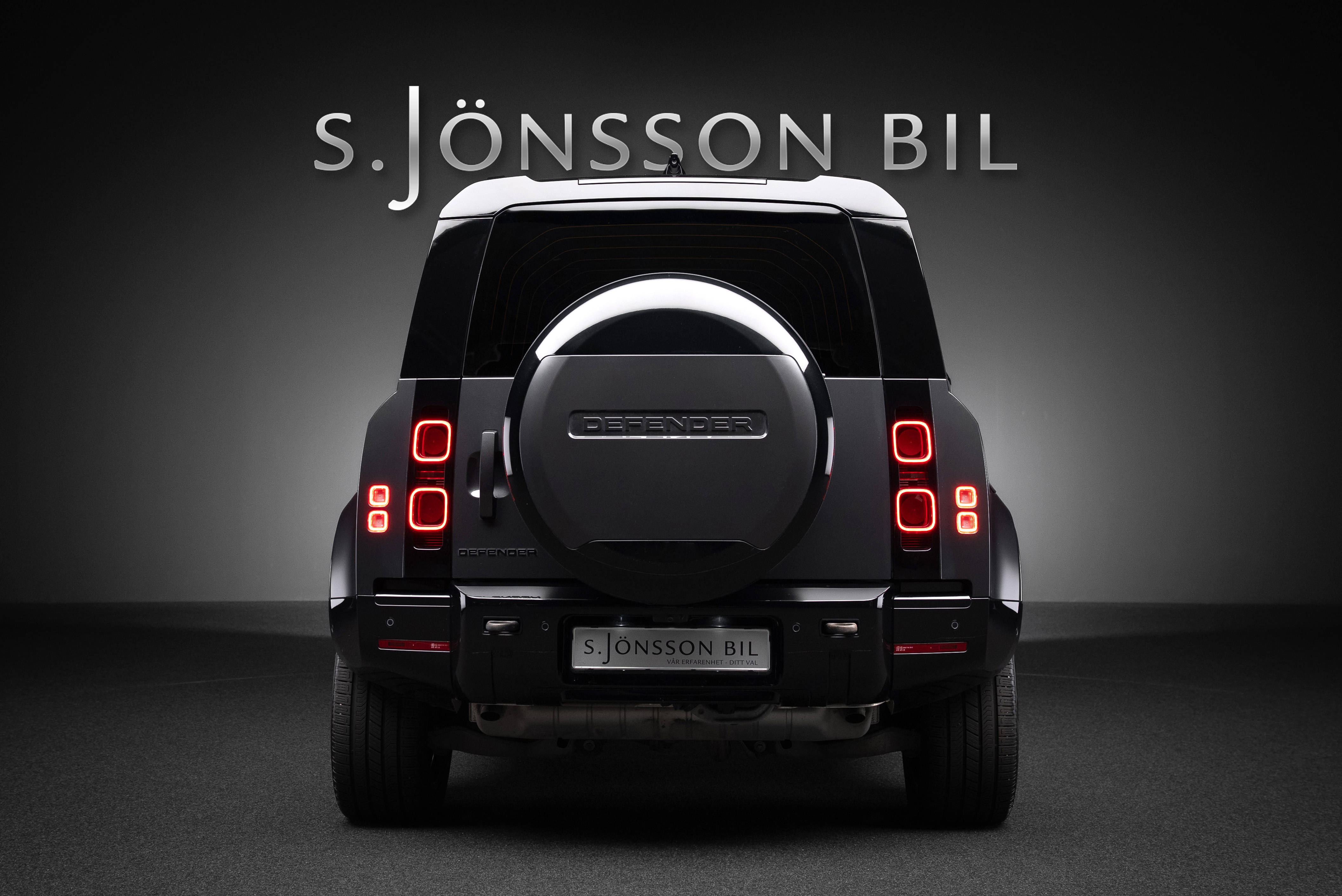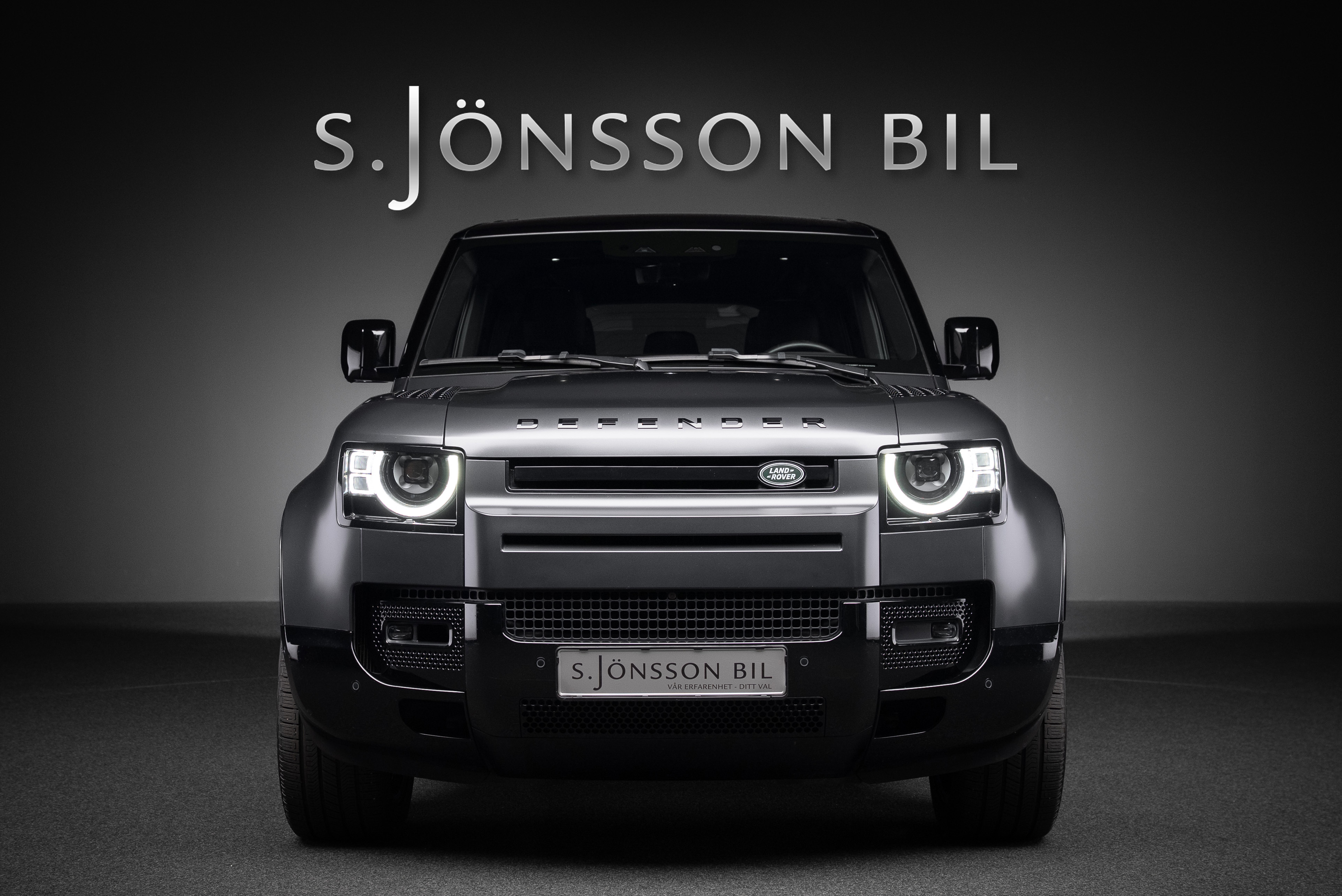 Land Rover Defender 110 P400e laddhybrid folierad i matt Carpathian Grey från fabrik kombinerat med svart läderinteriör. Under folieringen är bilen lackerad i Carpathian Grey metallic.