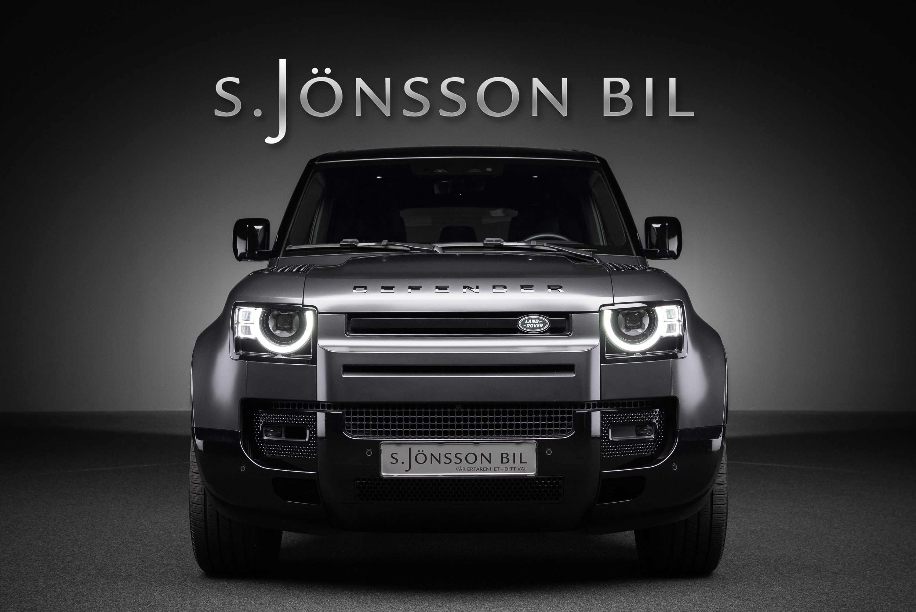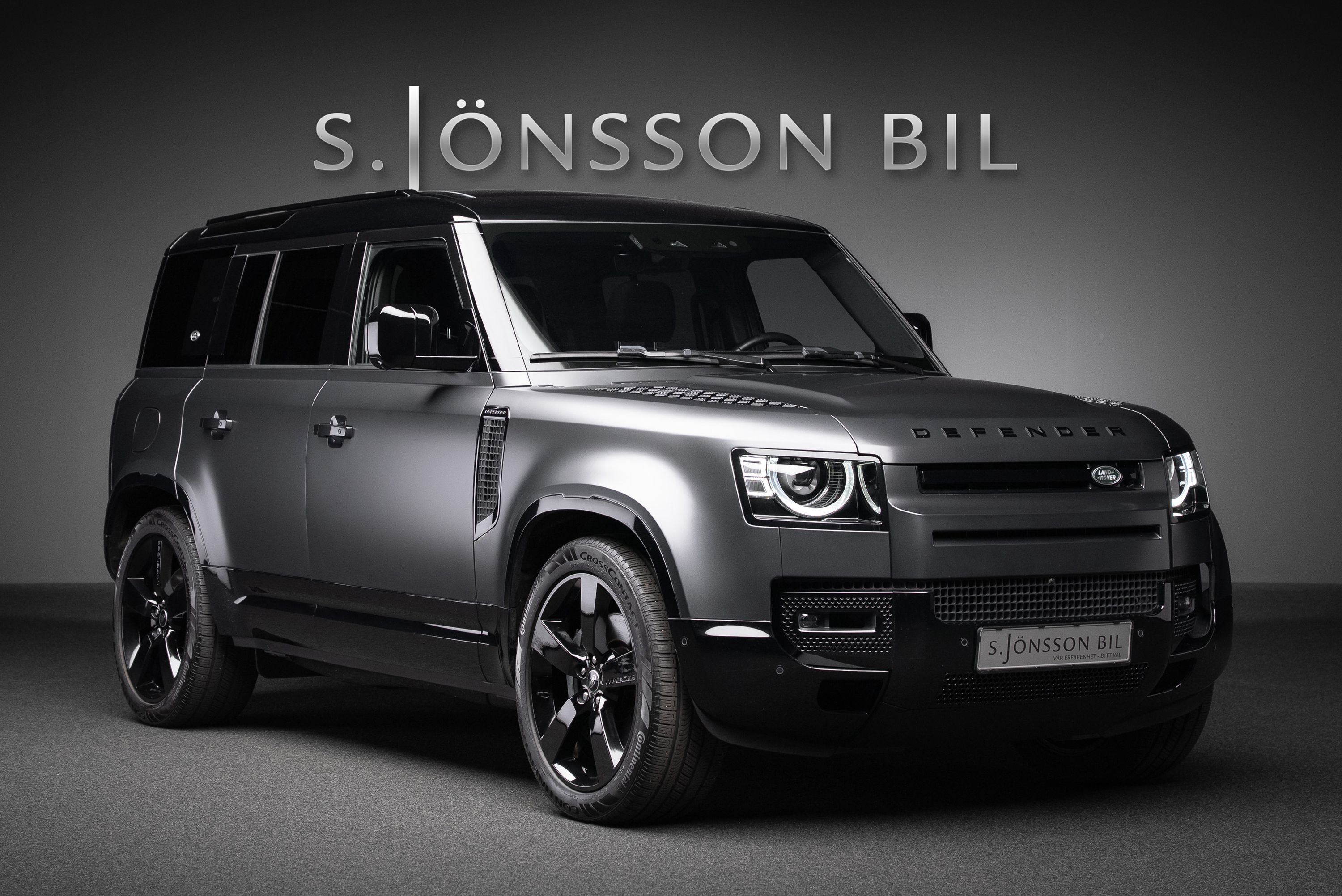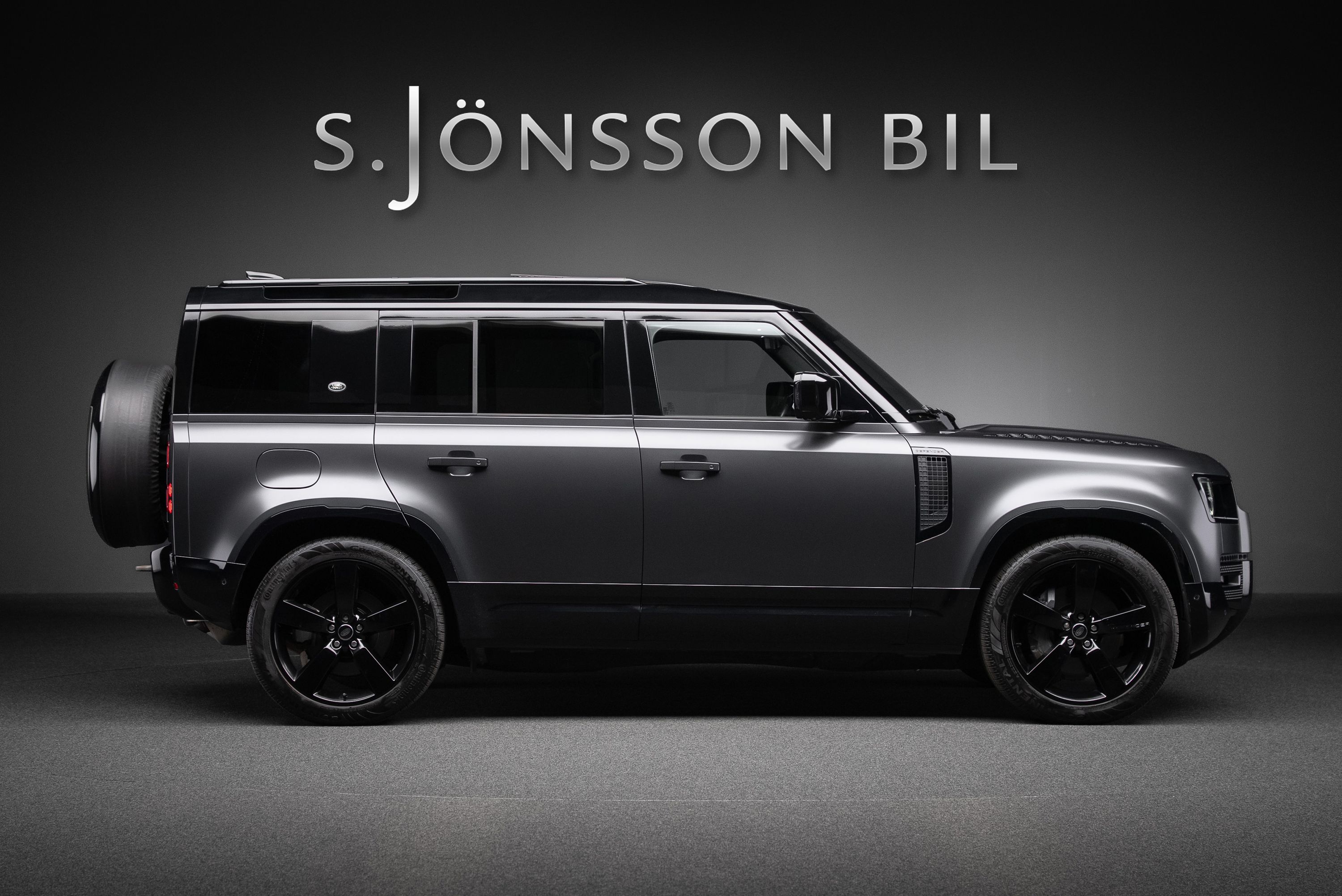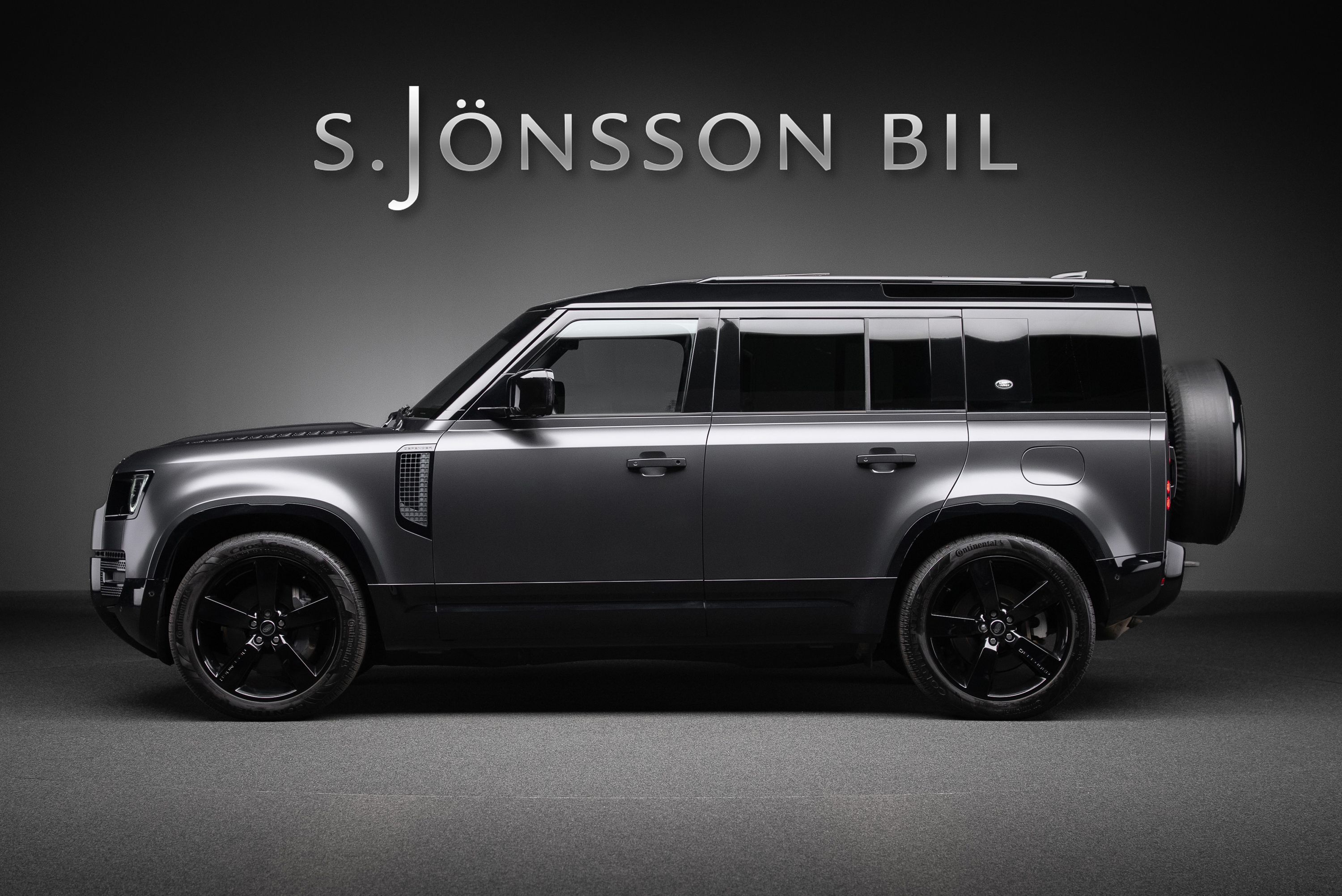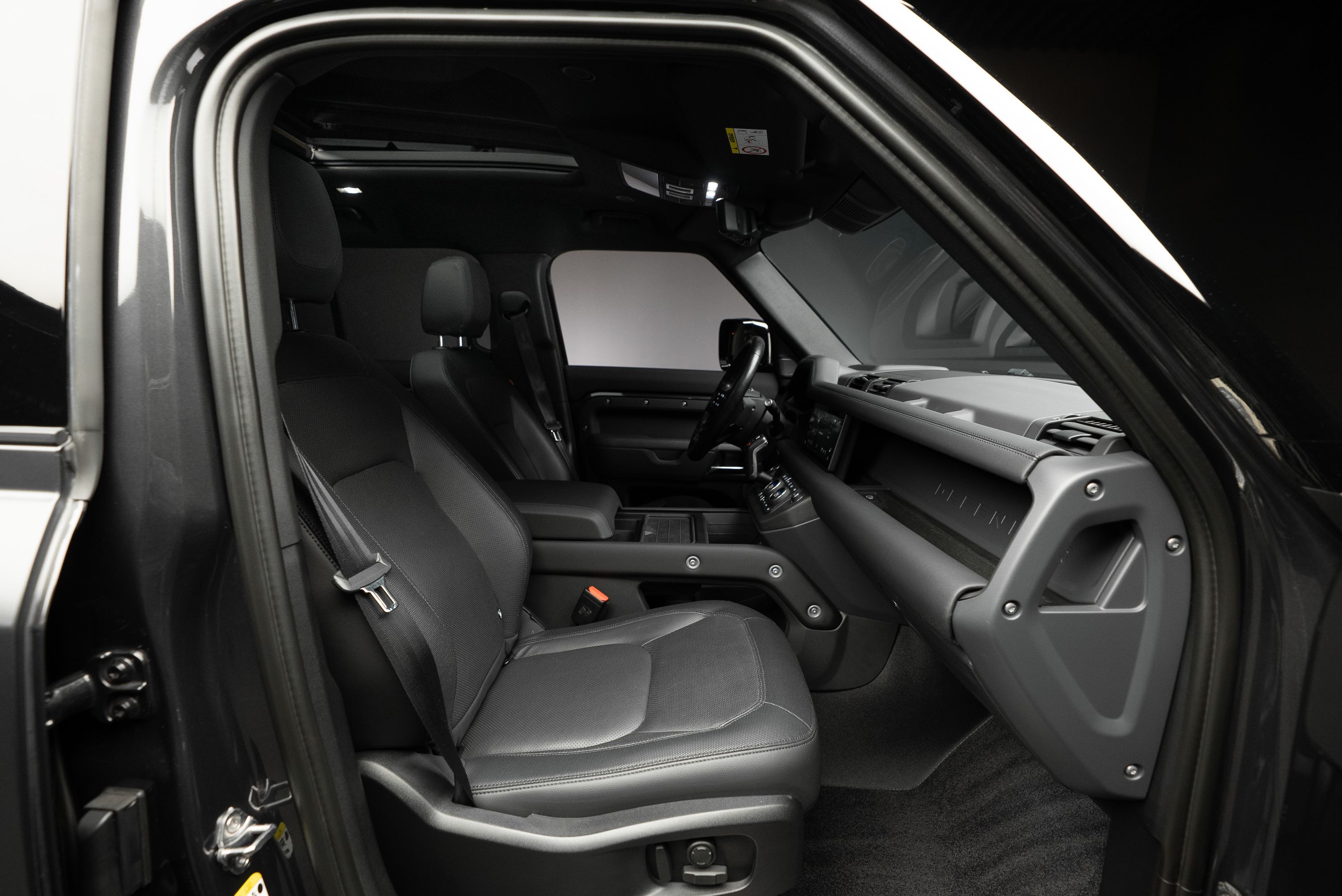 Land Rover Defender 110 P400e laddhybrid, folierad i matt Carpathian Grey från fabrik kombinerat med svart läderinteriör. Under folieringen är bilen Carpathian Grey metallic.