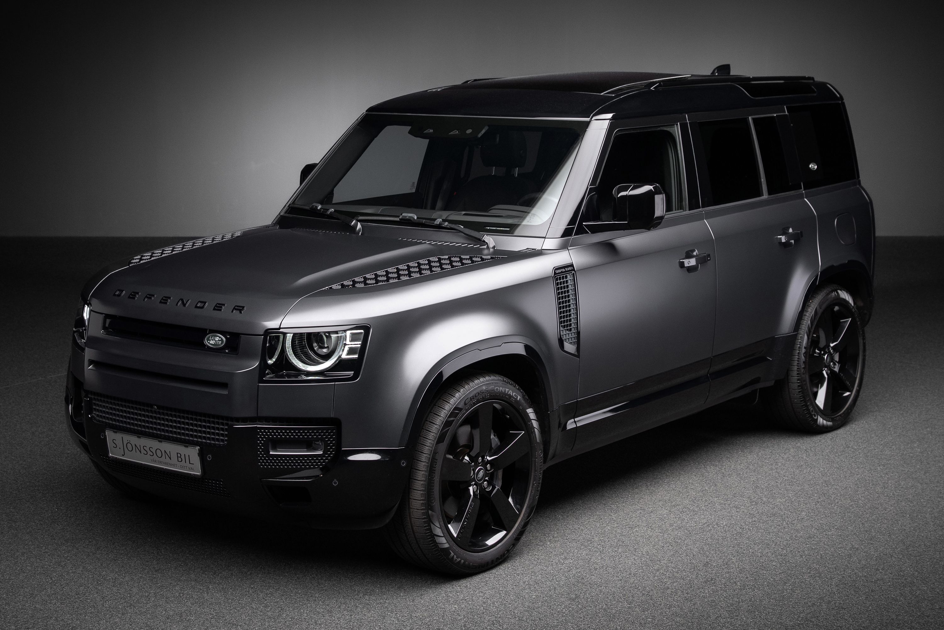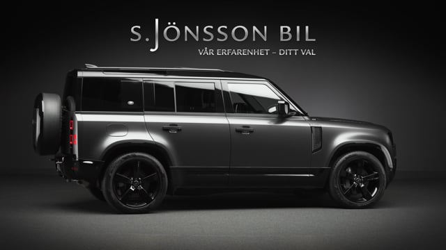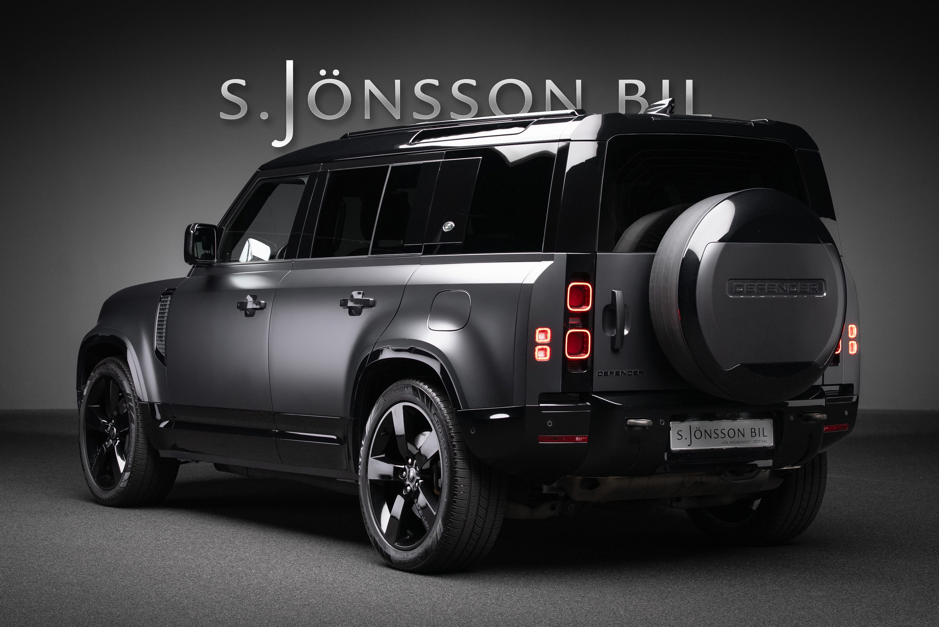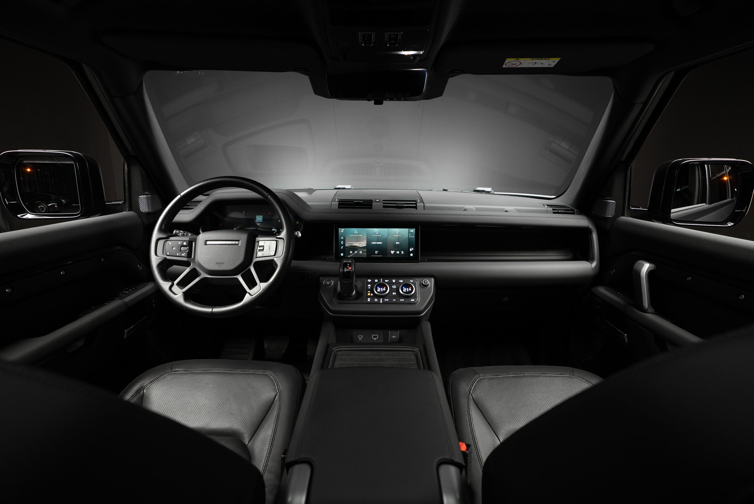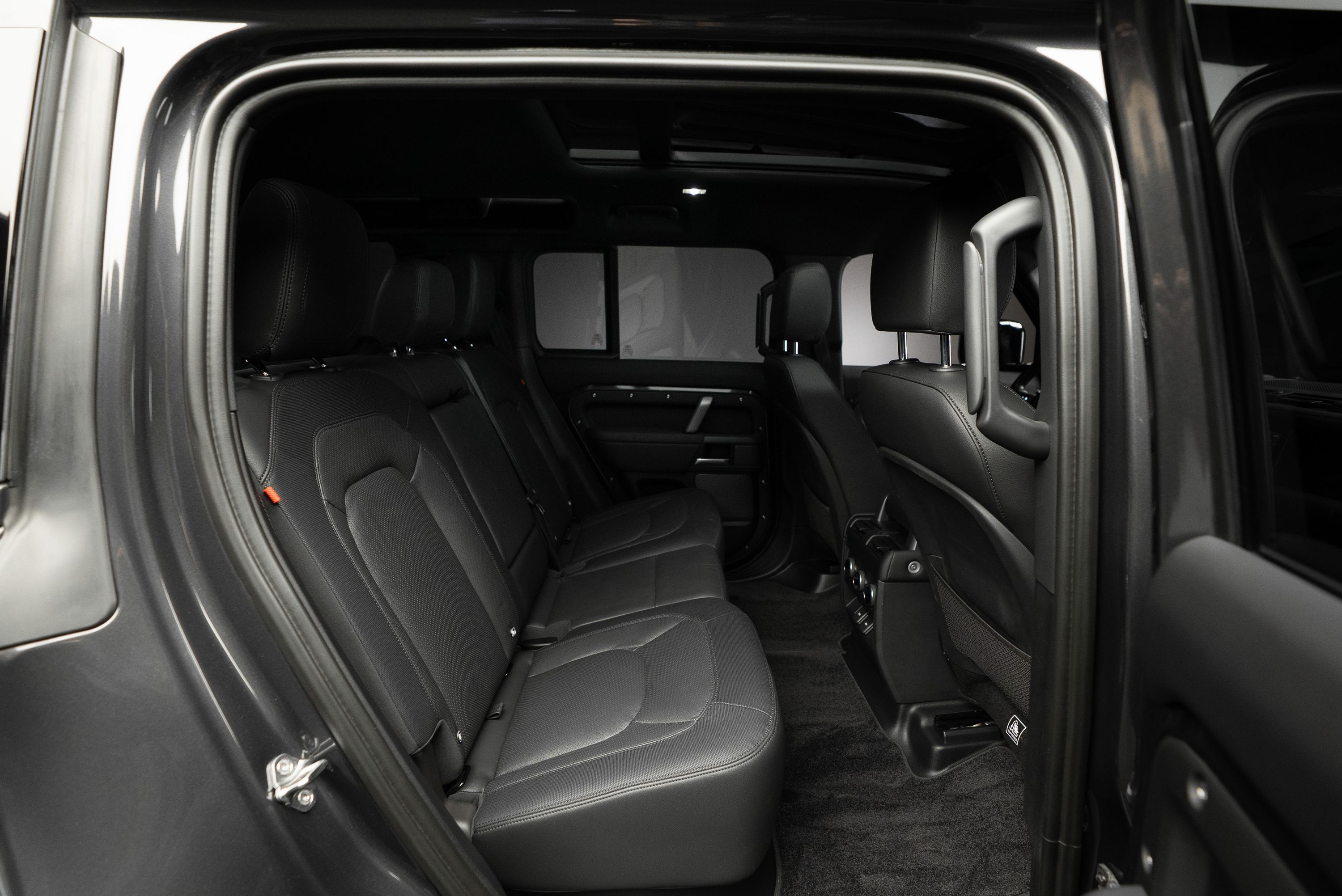 Land Rover Defender 110 P400e laddhybrid, folierad i matt Carpathian Grey från fabrik kombinerat med svart läderinteriör. Under folieringen är bilen Carpathian Grey metallic.