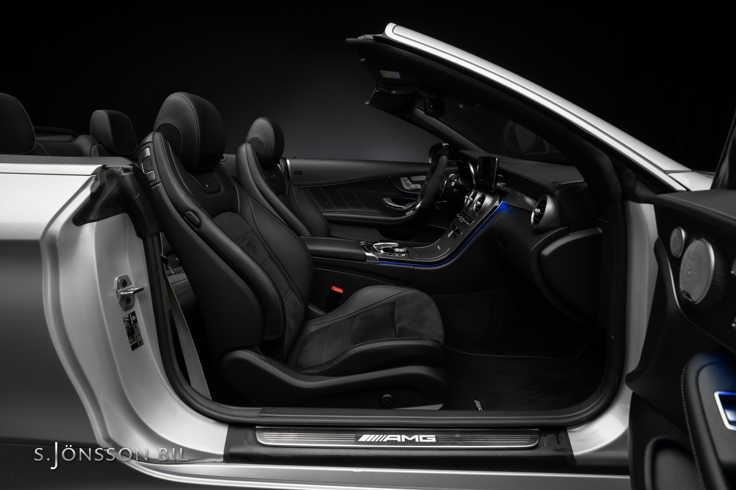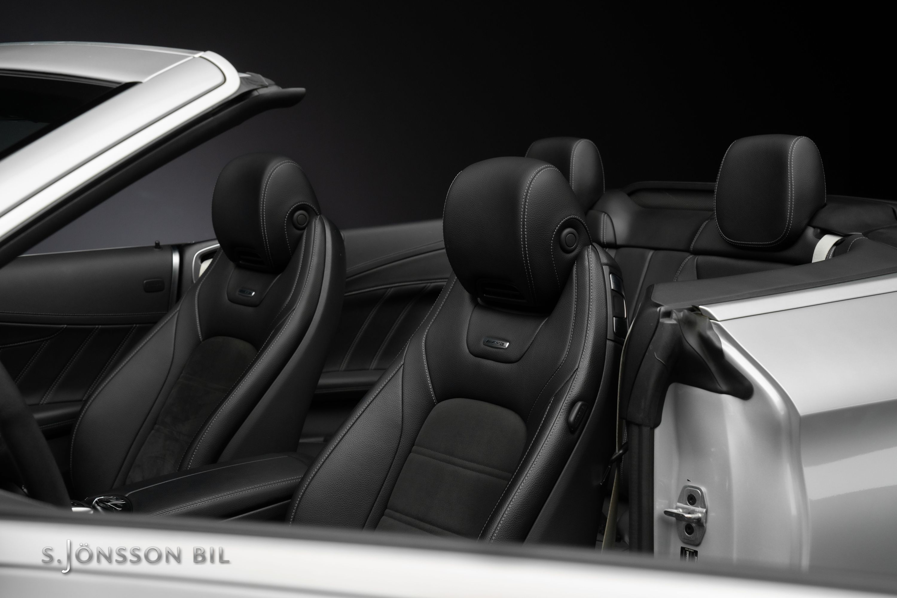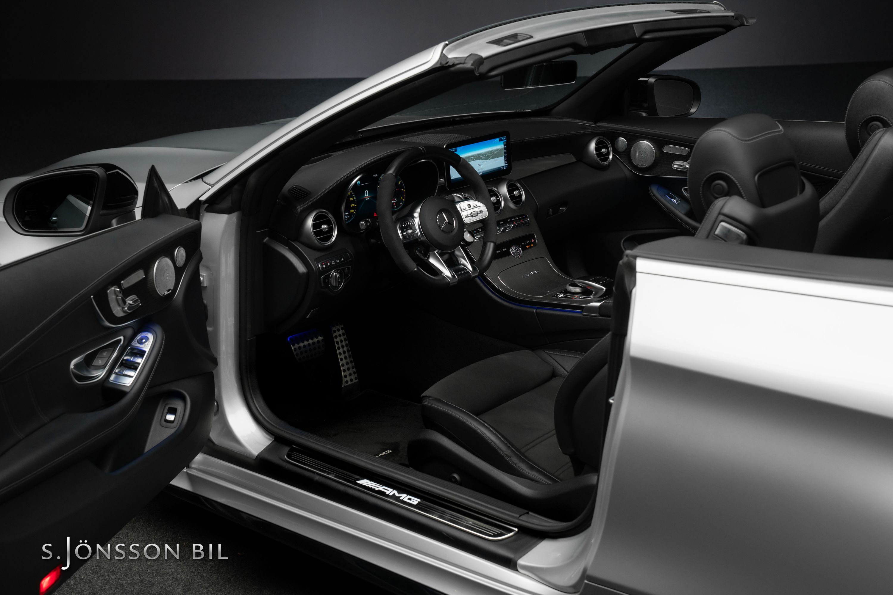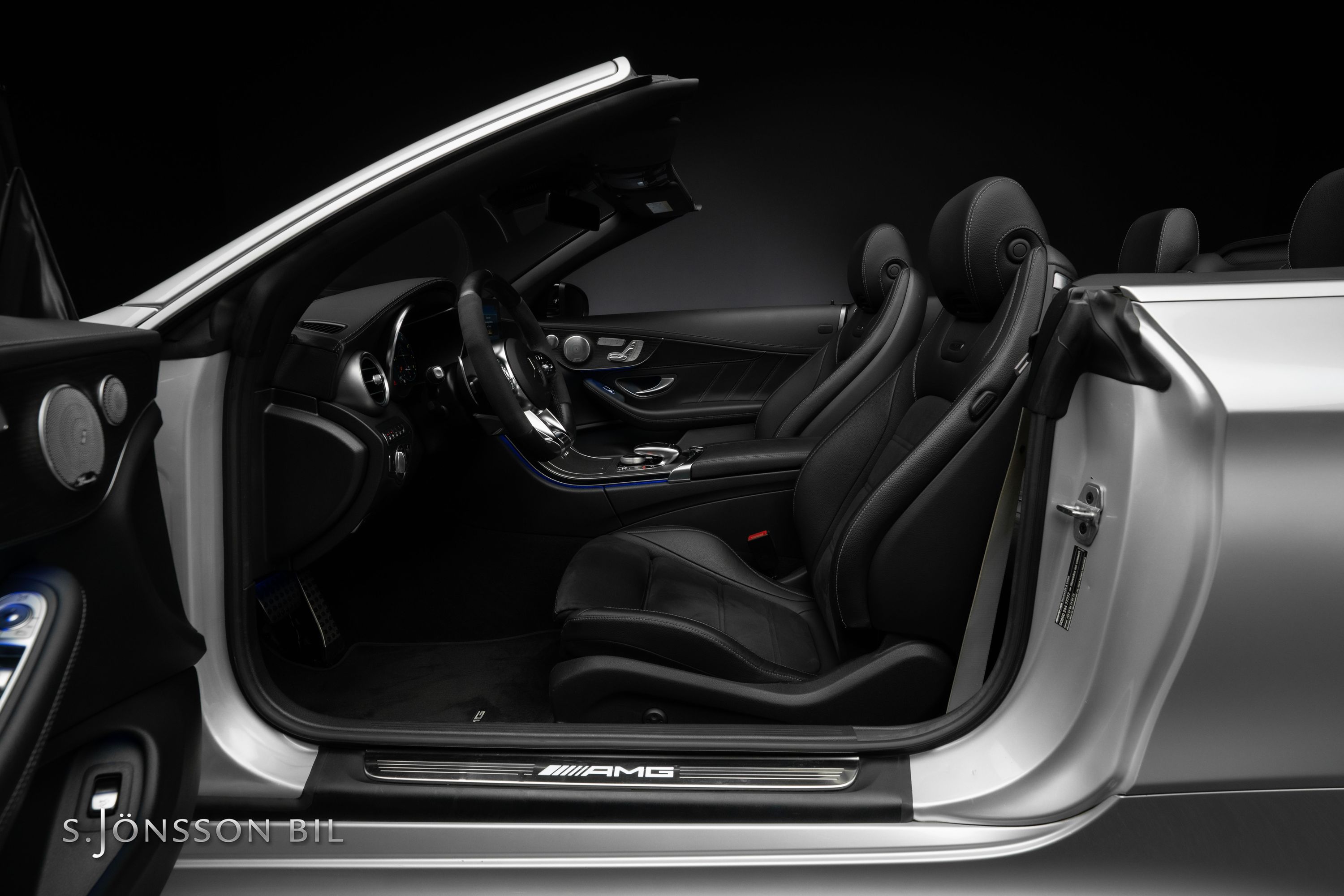 Mercedes-AMG C 63 S Cabriolet i Faceliftutförande. Lackerad i Iridium Silver metallic kombinerat med inredning i läder/alcantara och kontrastsömmar i grått.