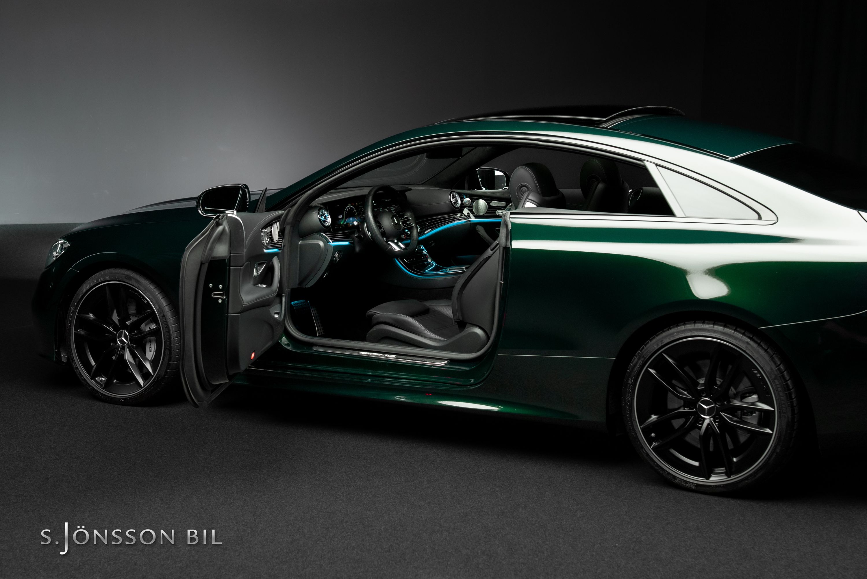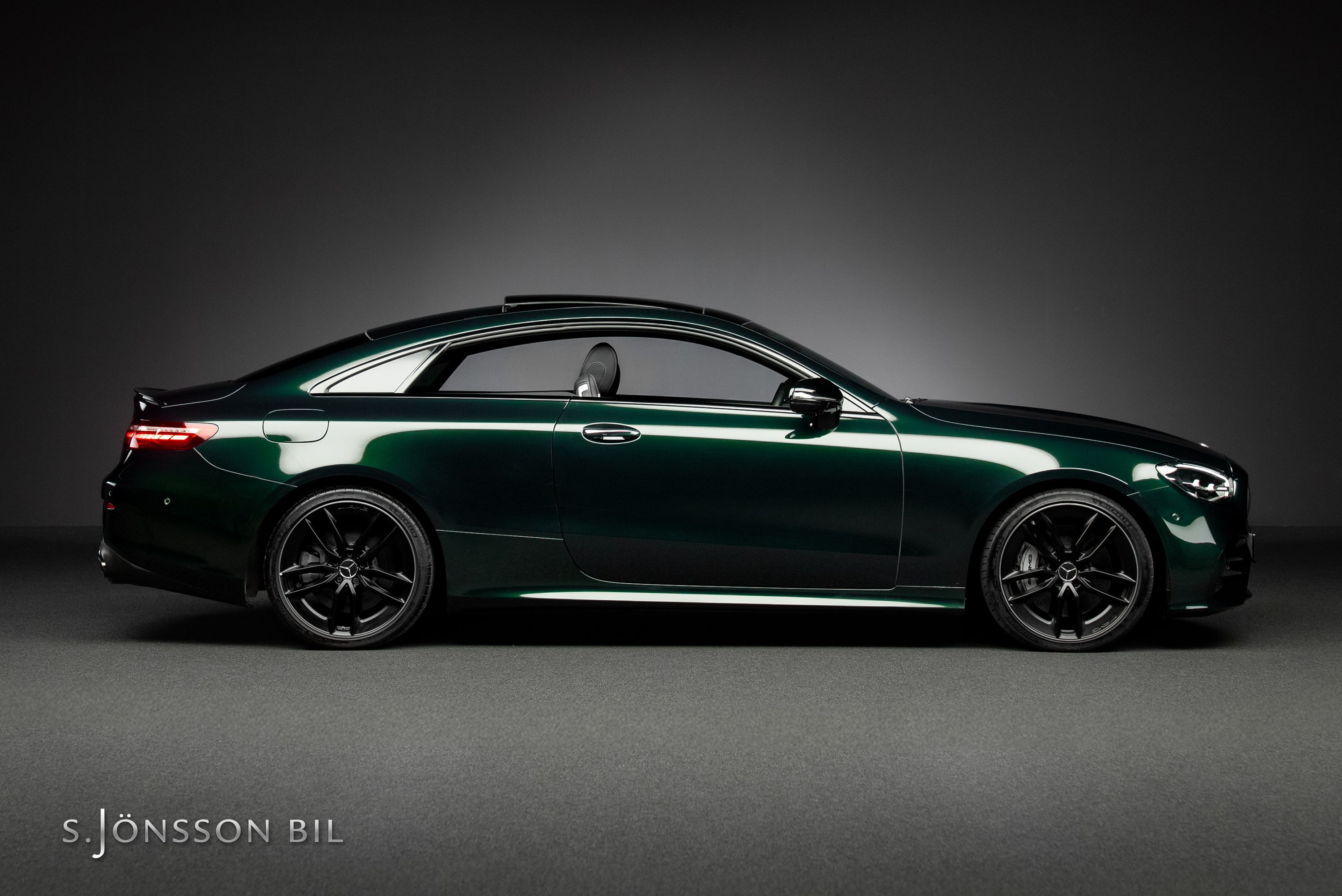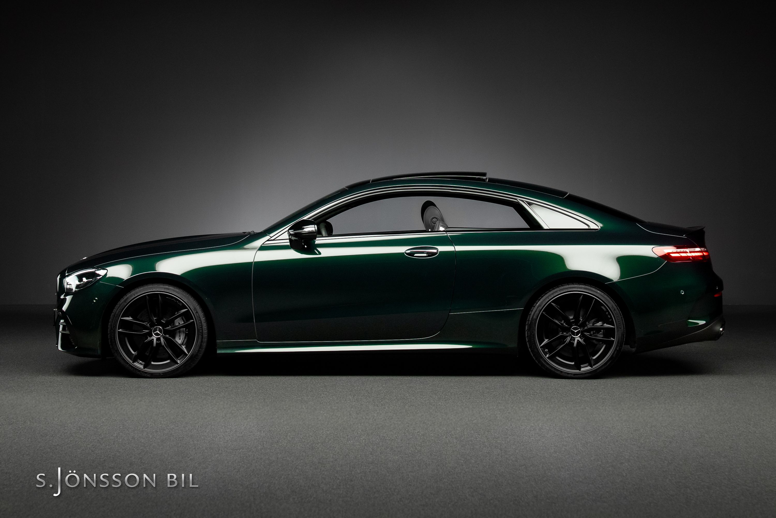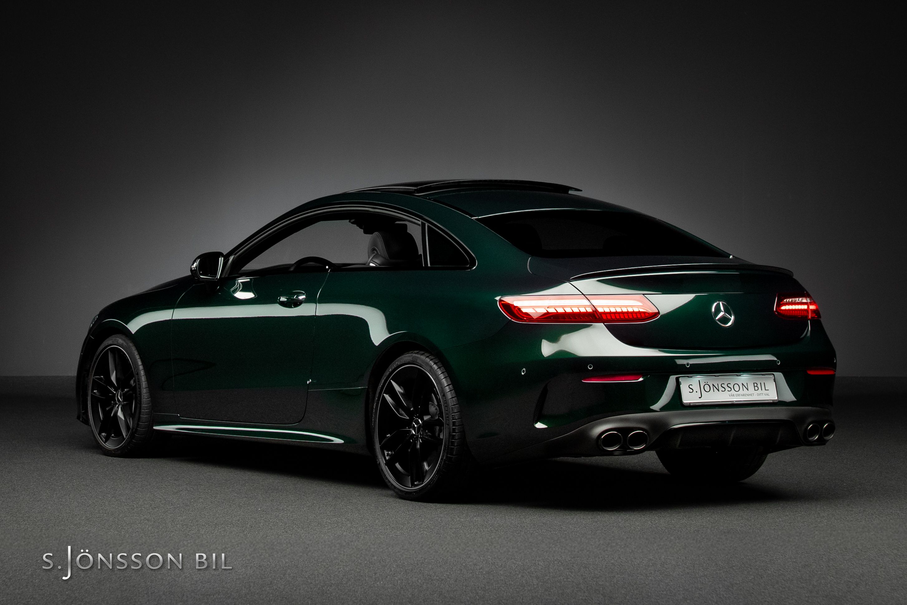 Mercedes-AMG E 53 4MATIC Coupé Facelift, lackerad i den eleganta kulören smaragdgrön metallic kombinerat med interiör i svart läder.