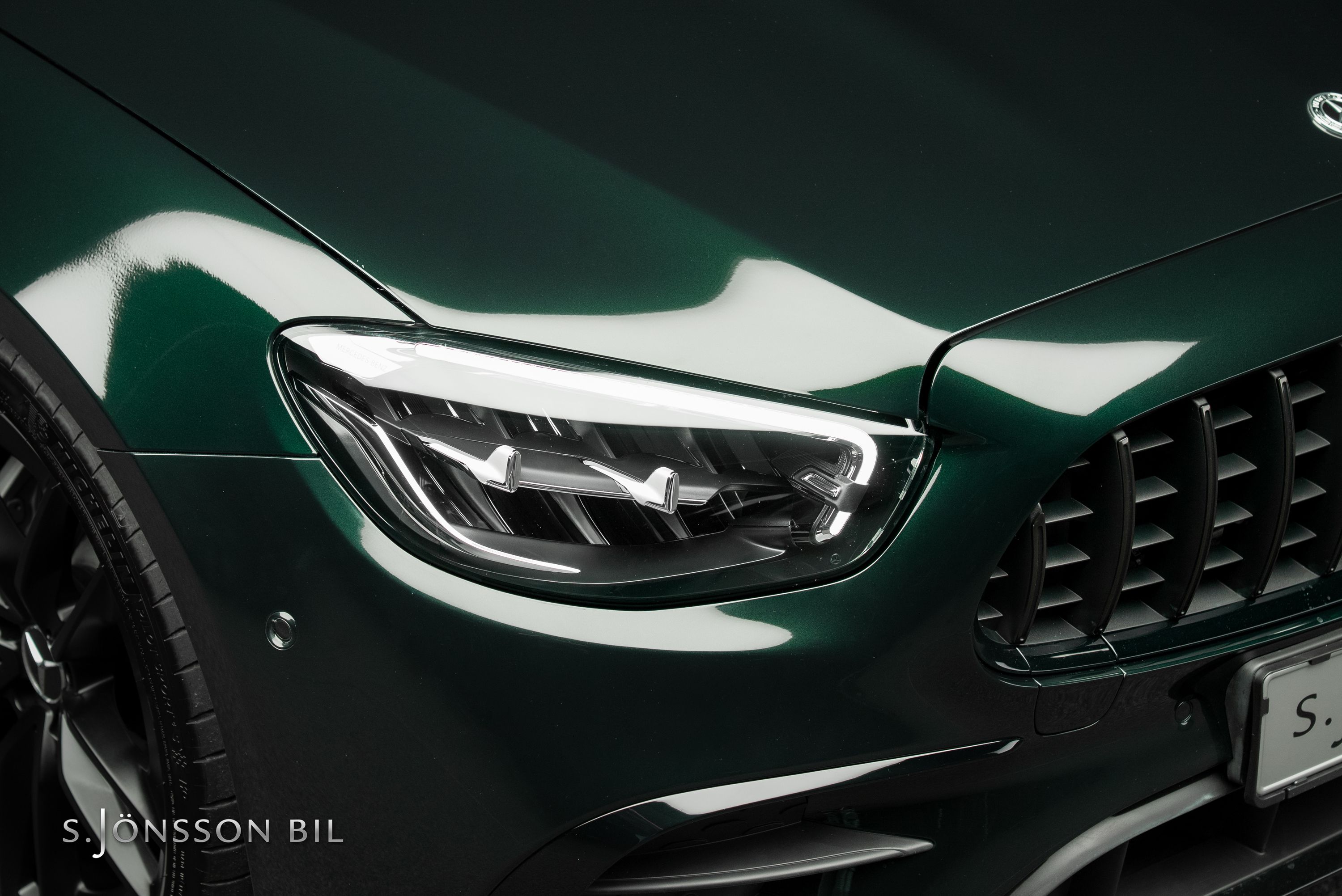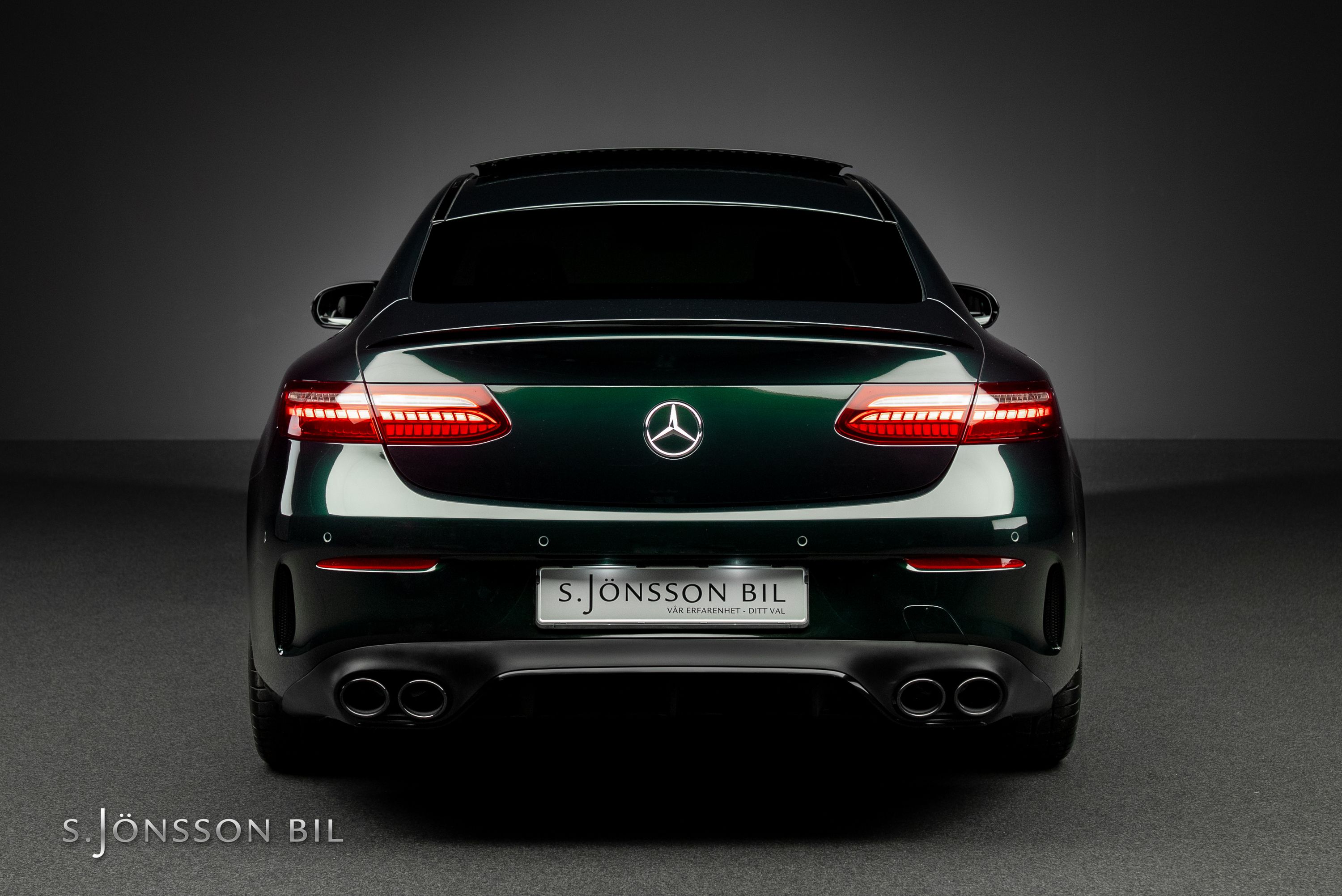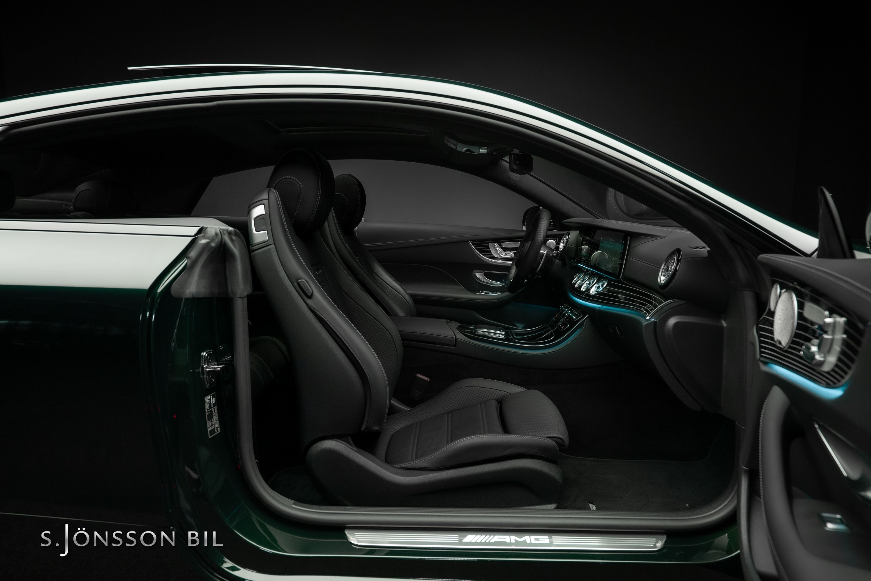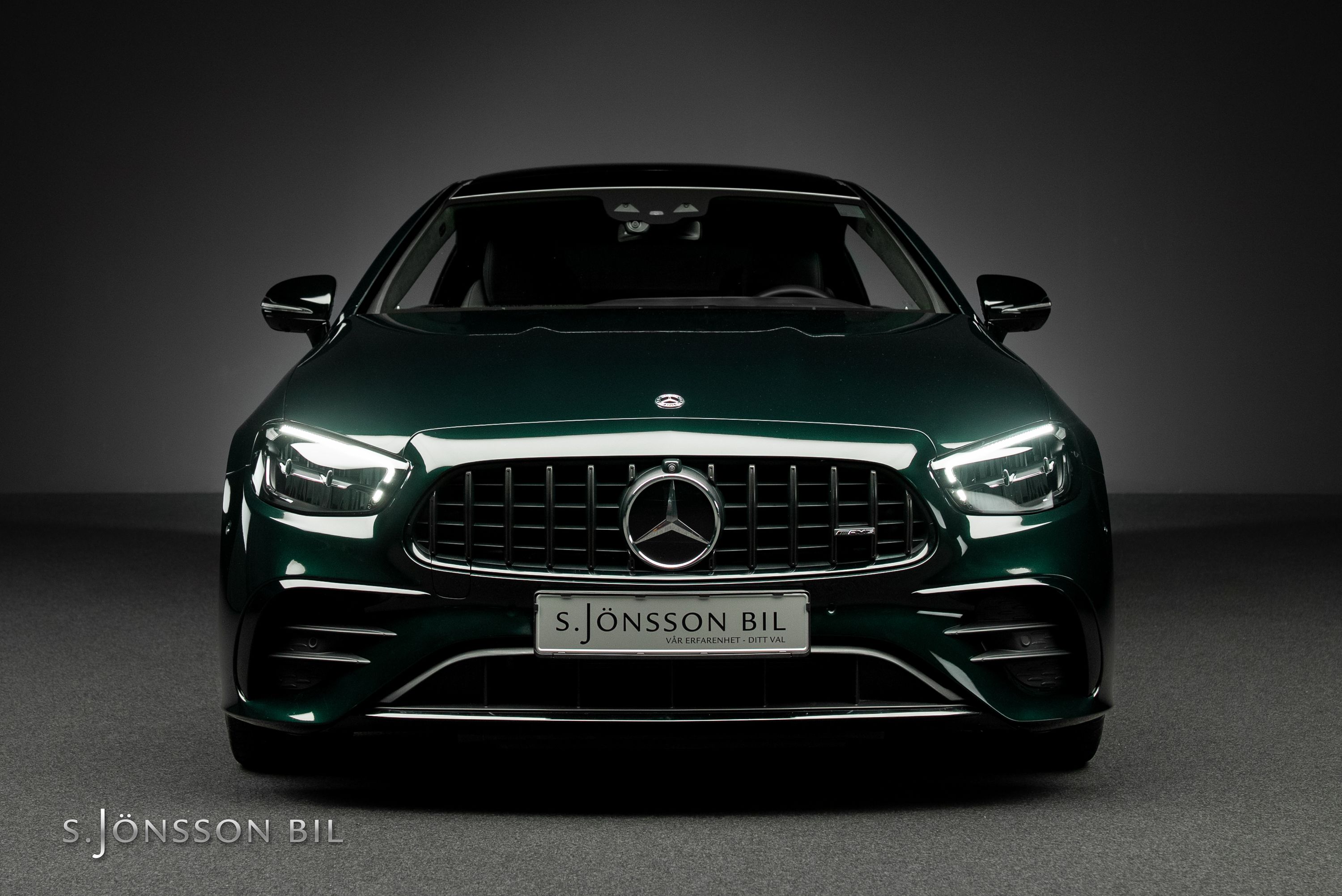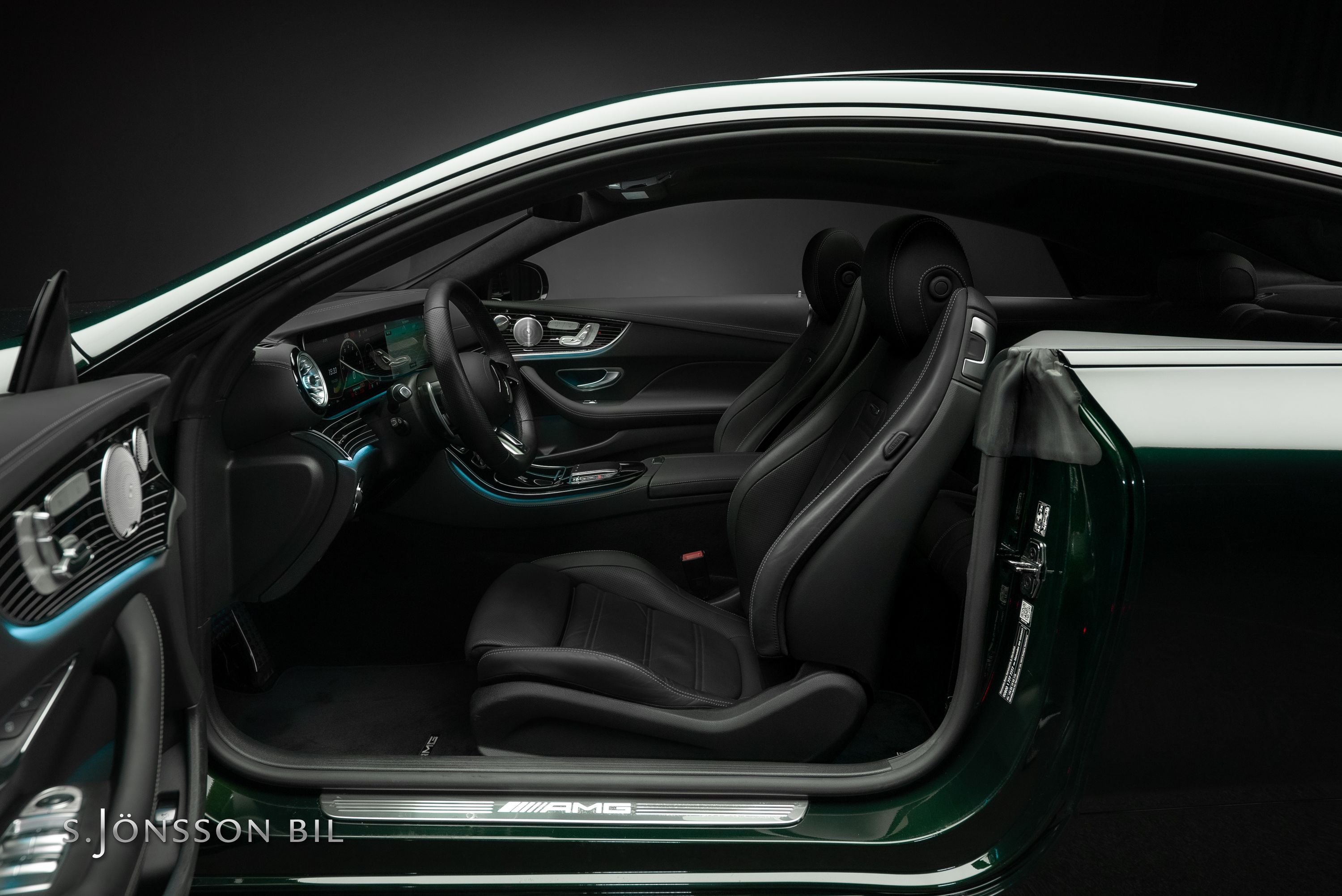 Mercedes-AMG E 53 4MATIC Coupé Facelift, lackerad i den eleganta kulören smaragdgrön metallic kombinerat med interiör i svart läder.