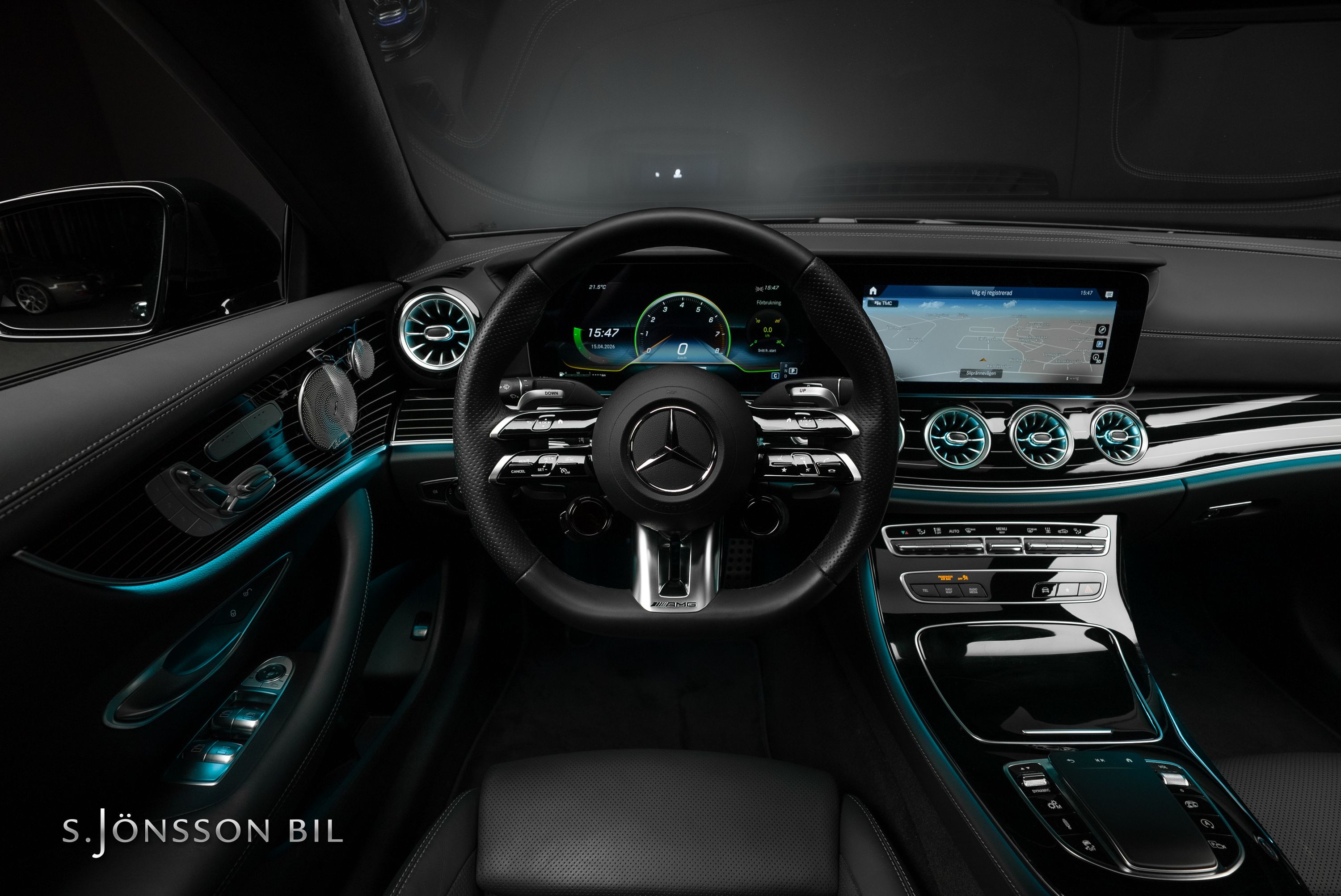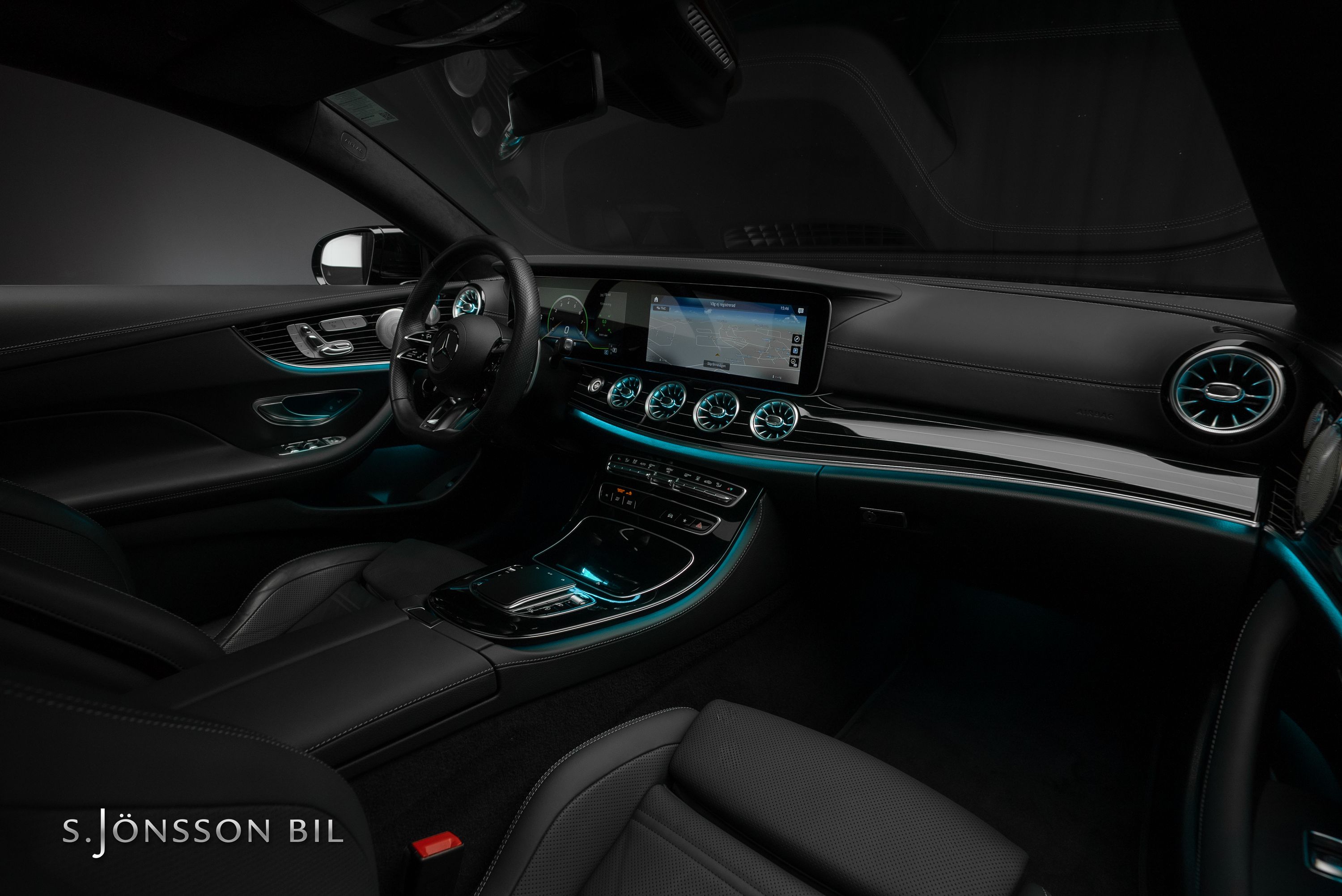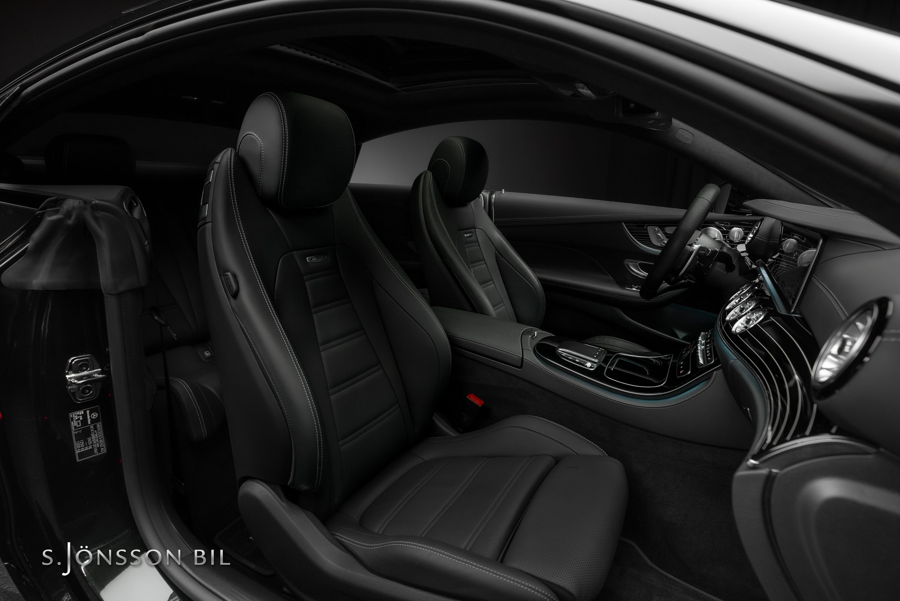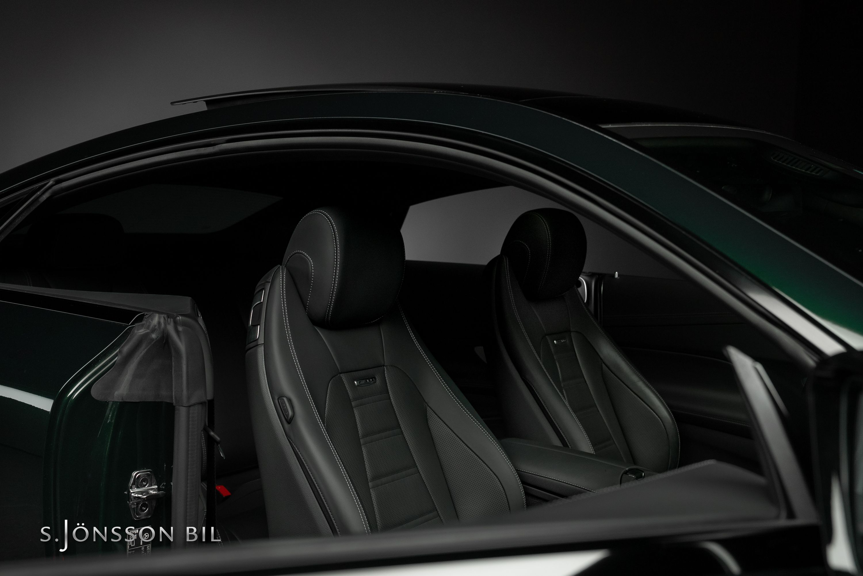Mercedes-AMG E 53 4MATIC Coupé Facelift, lackerad i den eleganta kulören smaragdgrön metallic kombinerat med interiör i svart läder.