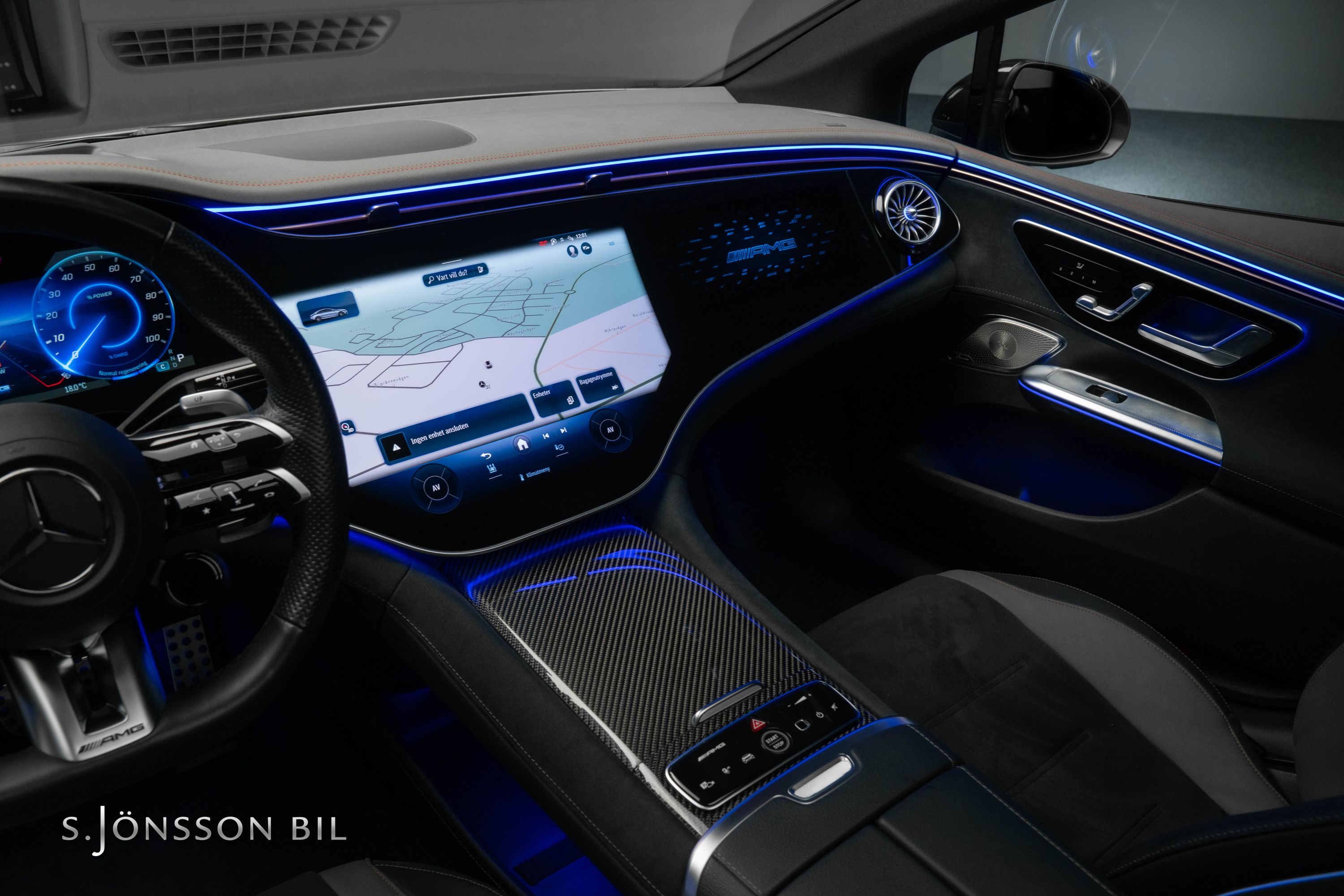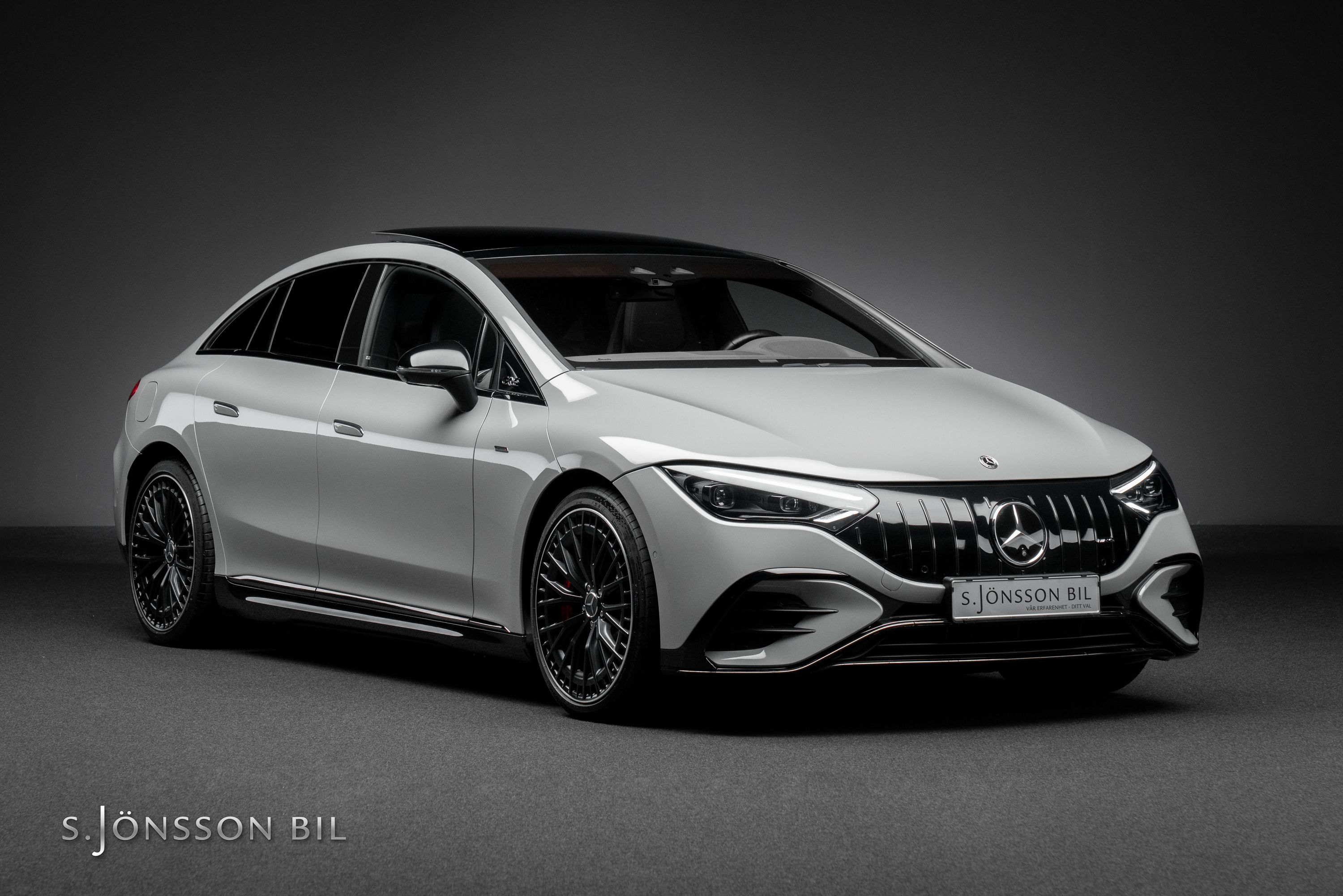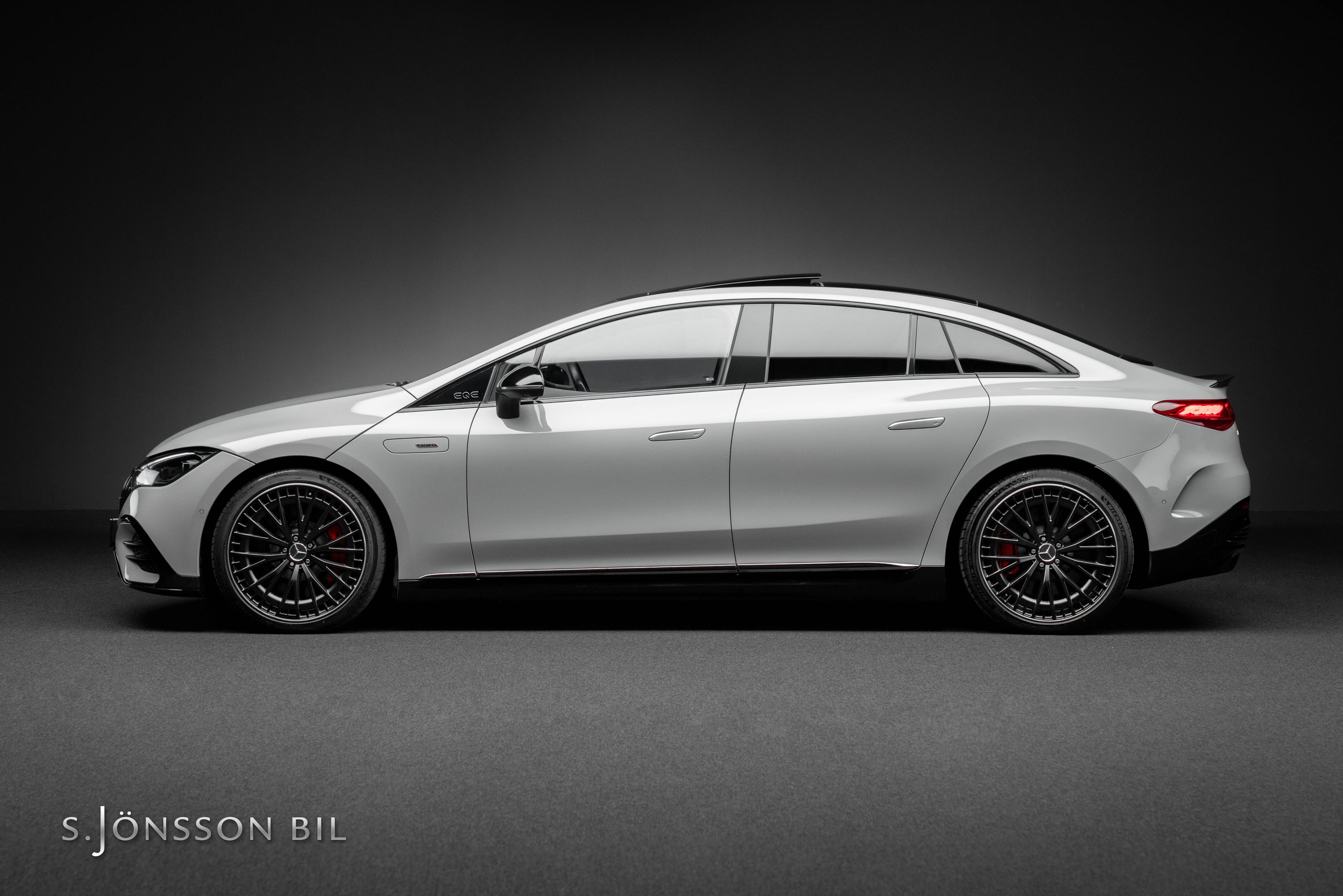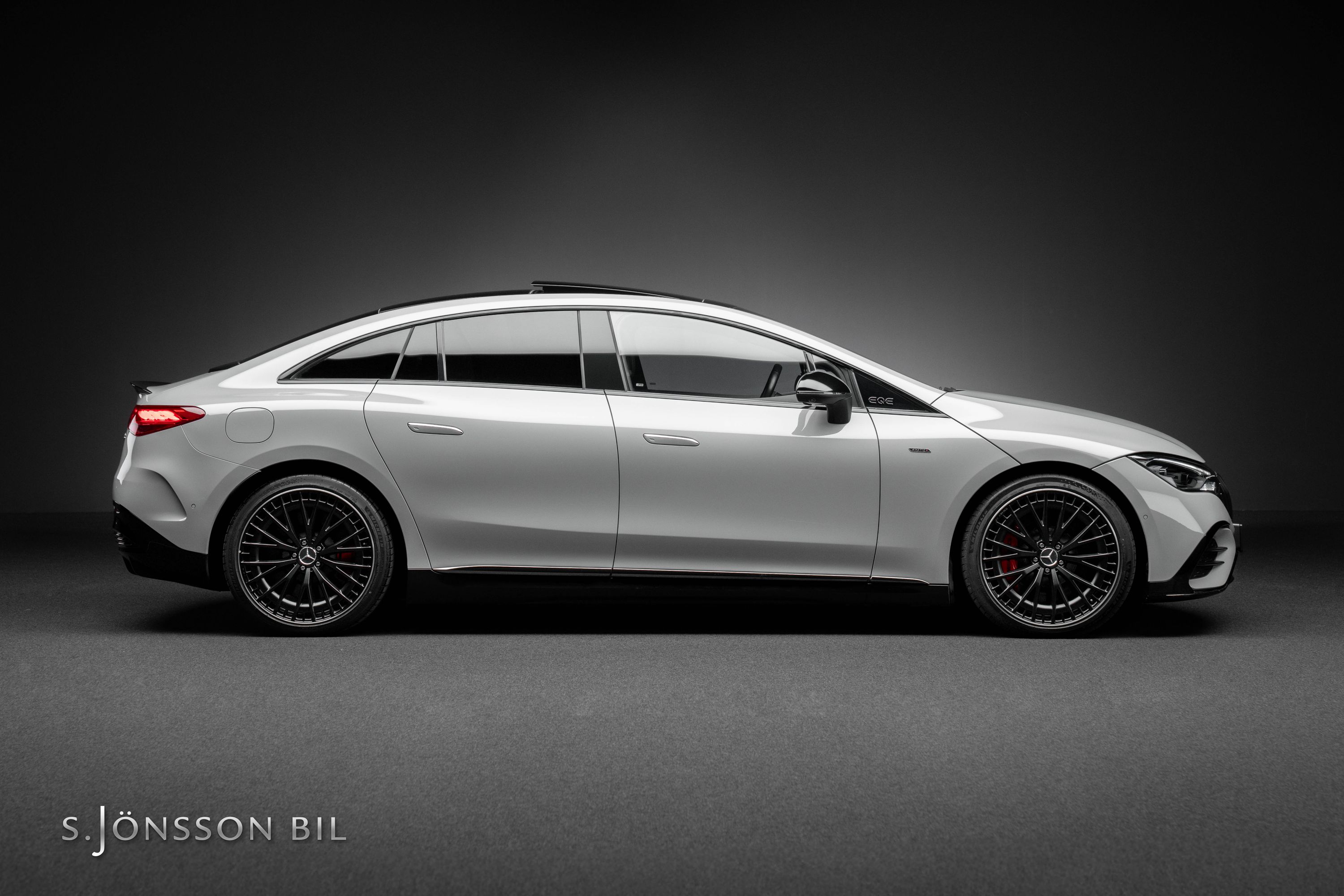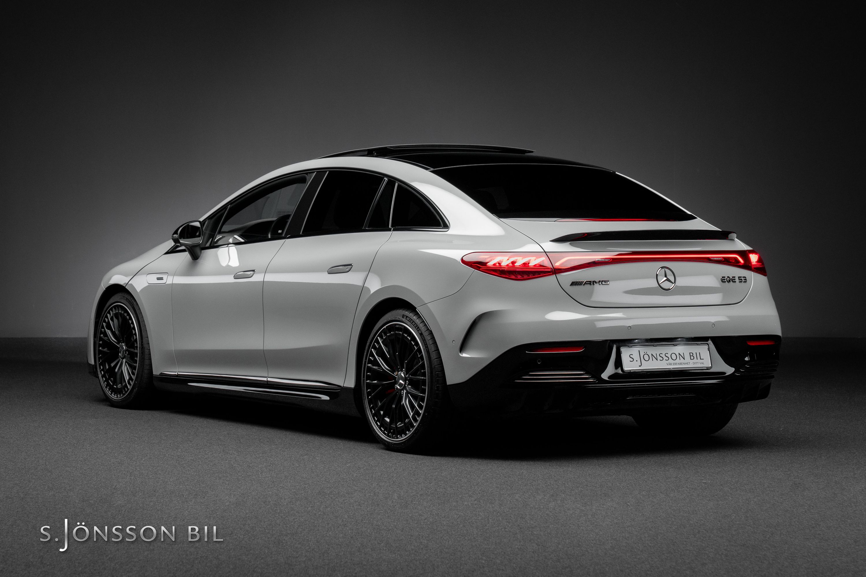 Nu kan vi presentera en Mercedes-AMG EQE 53 4MATIC+ lackerad i Manufakturfärgen Alpingrå. Interiören är tvåfärgad svart/grå med röda kontrastsömmar och kolfiberpaneler.