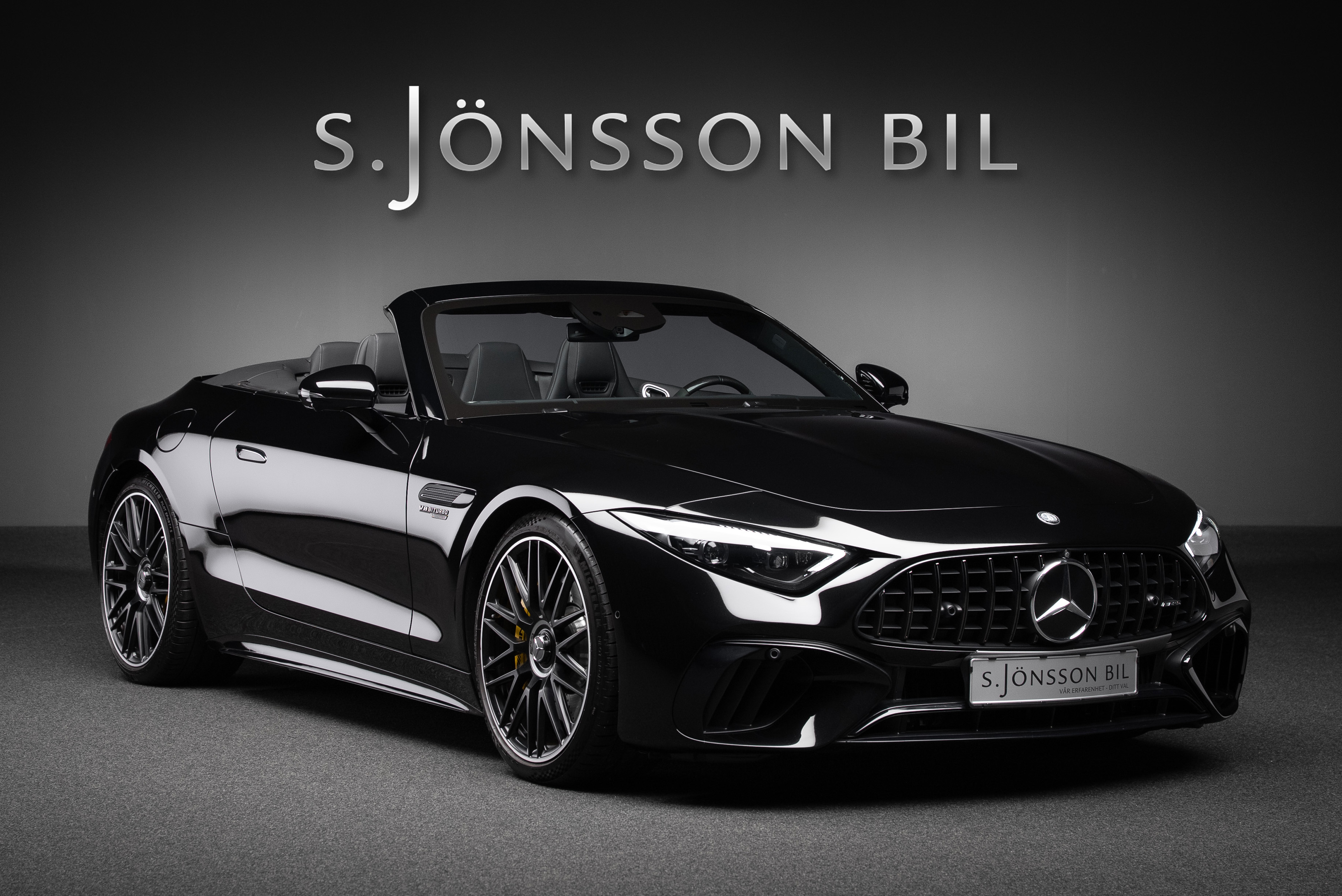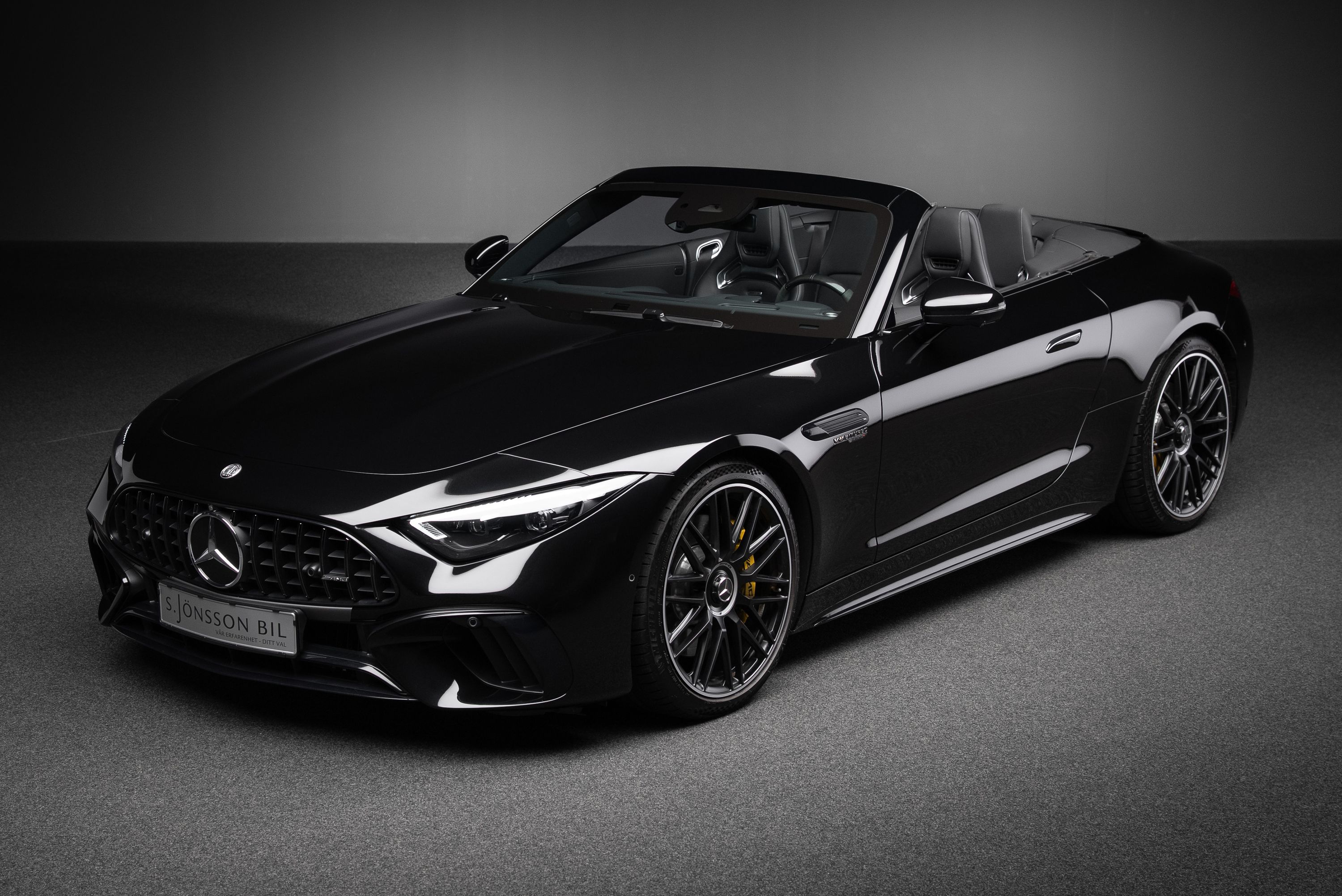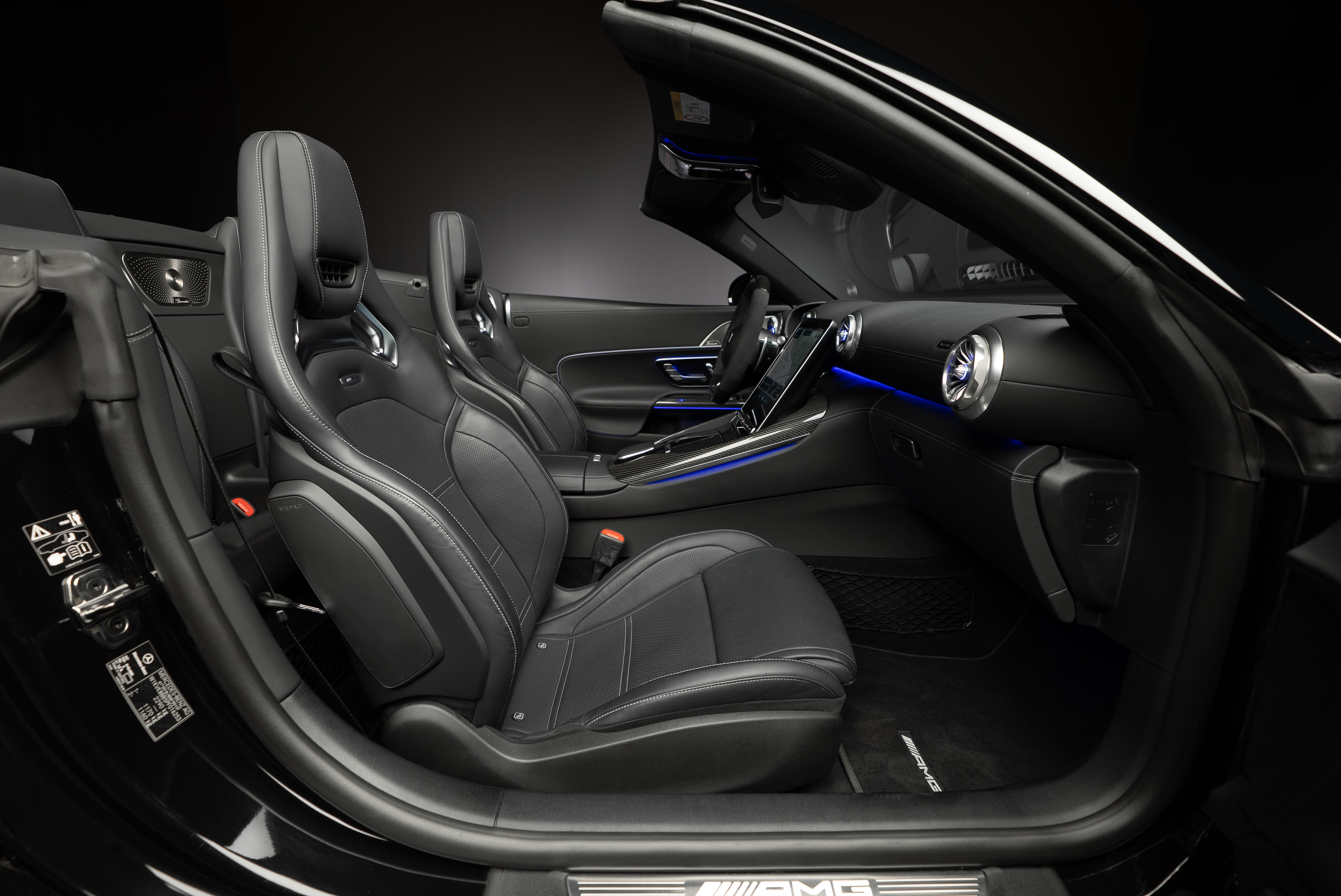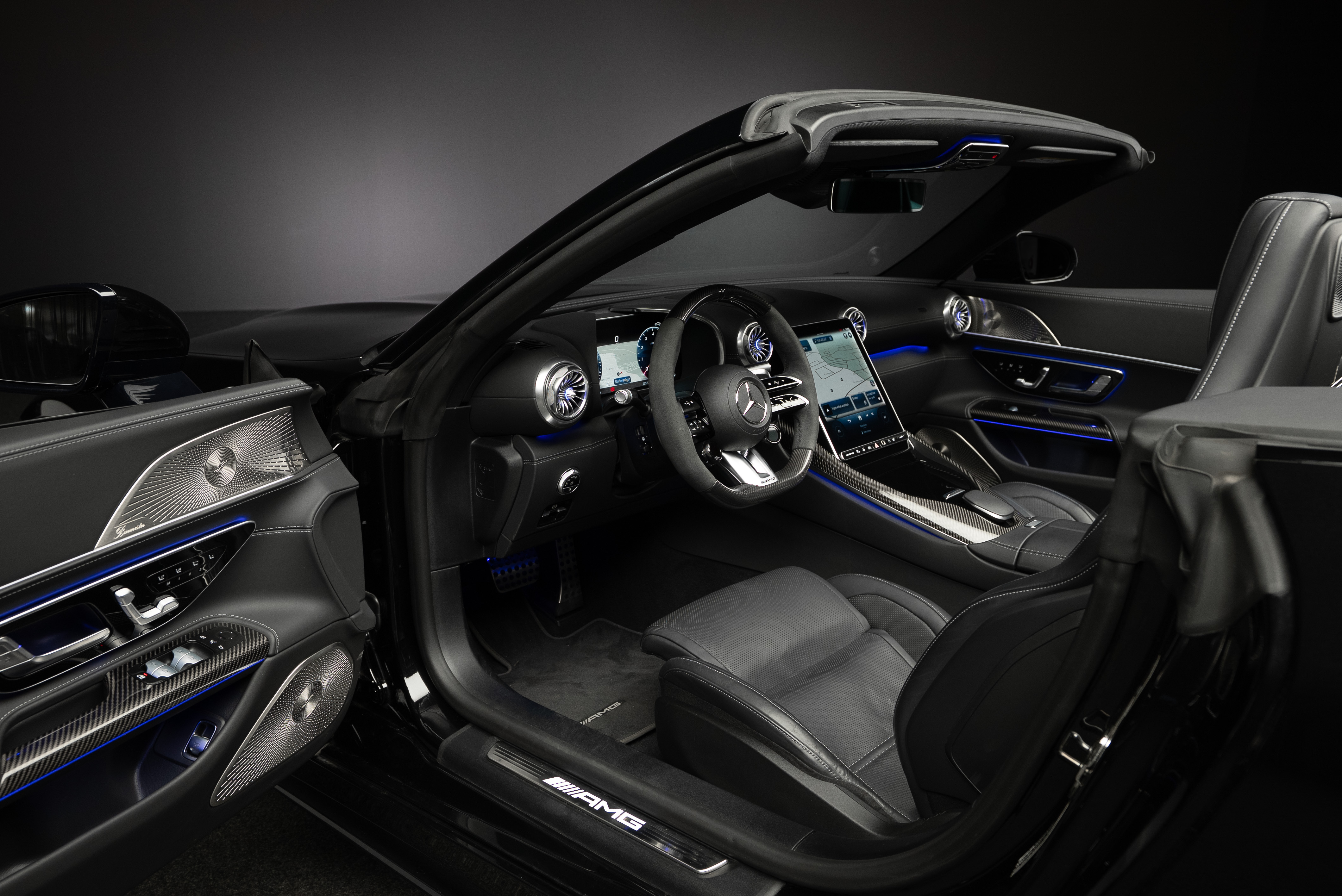 Mercedes-AMG SL 63 4MATIC+ med påkostad utrustning. Bland annat har bilen det ovanliga Burmester High End ljudsystemet som är 47.300 kr dyrare än vanliga "Burmester Surround Sound System". High End systemet har 17 st högtalare och 1220W förstärkareffekt. Ett annat eftertraktat men sällsynt tillval är AMG Performance säte. Inredningsdetaljer i kolfiber tillhör inte heller vanligheterna då prislappen för dessa är hög. I detta exemplar hittar vi dock både ratt och paneler i kolfiber.