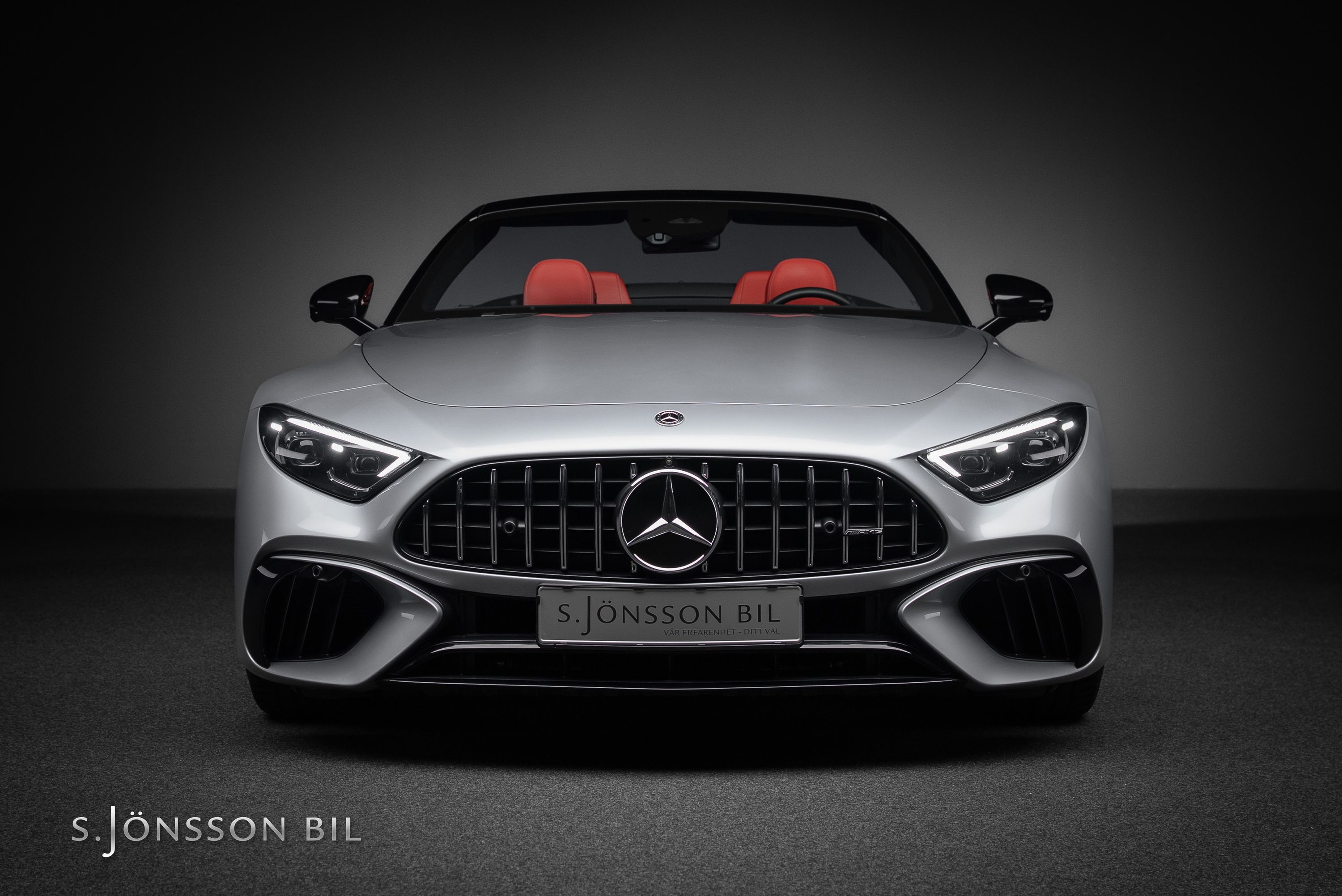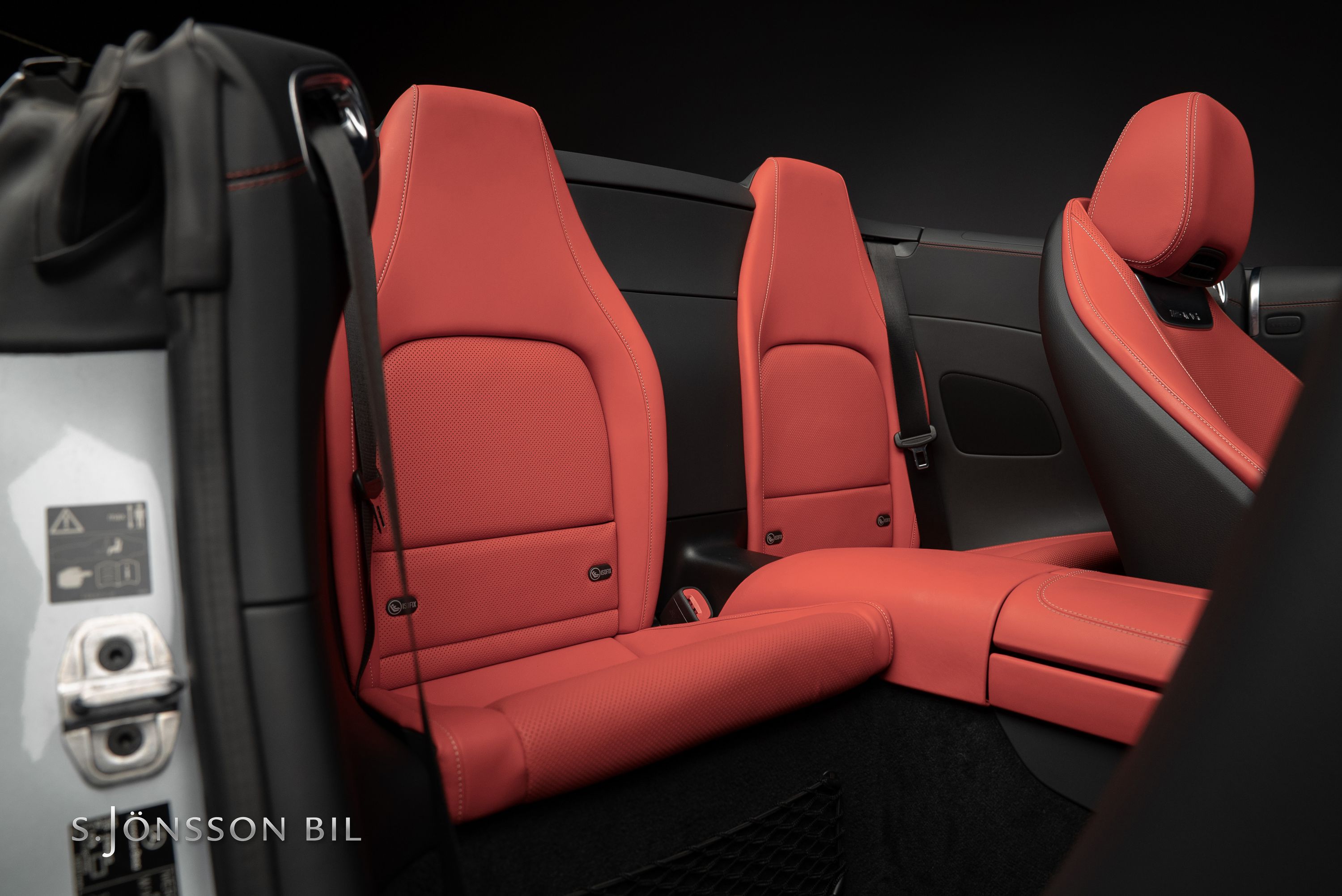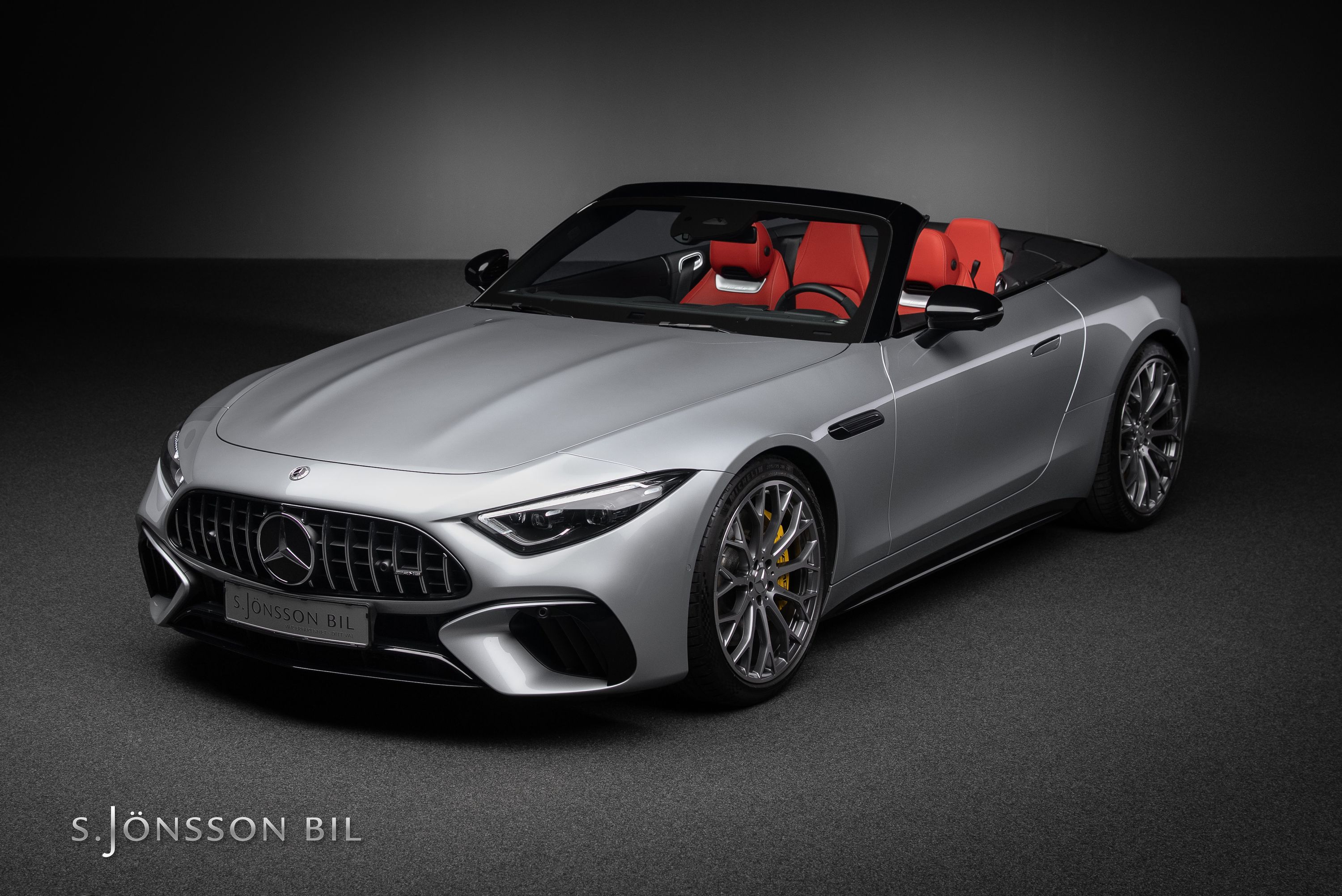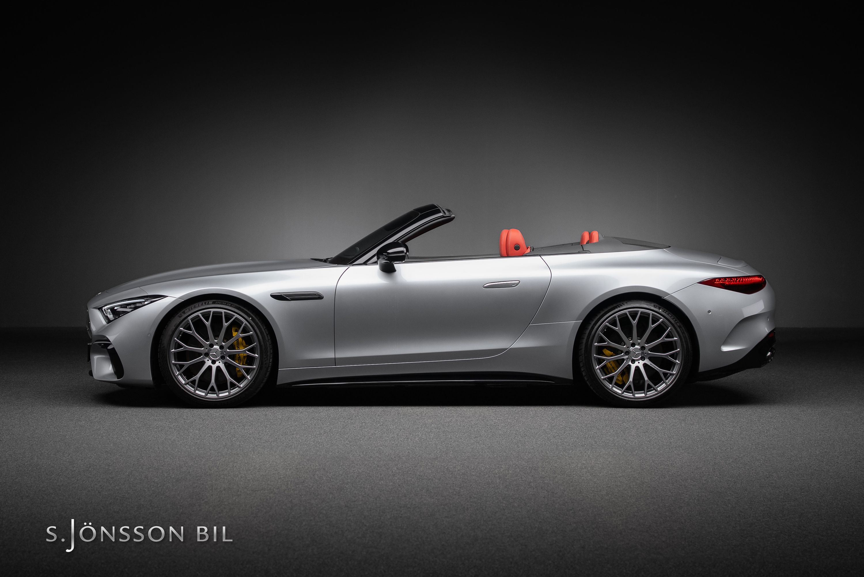 Just detta exemplar är lackerad i den eleganta kulören High-tech Silver metallic kombinerat med inredning i Red Pepper nappaläder.