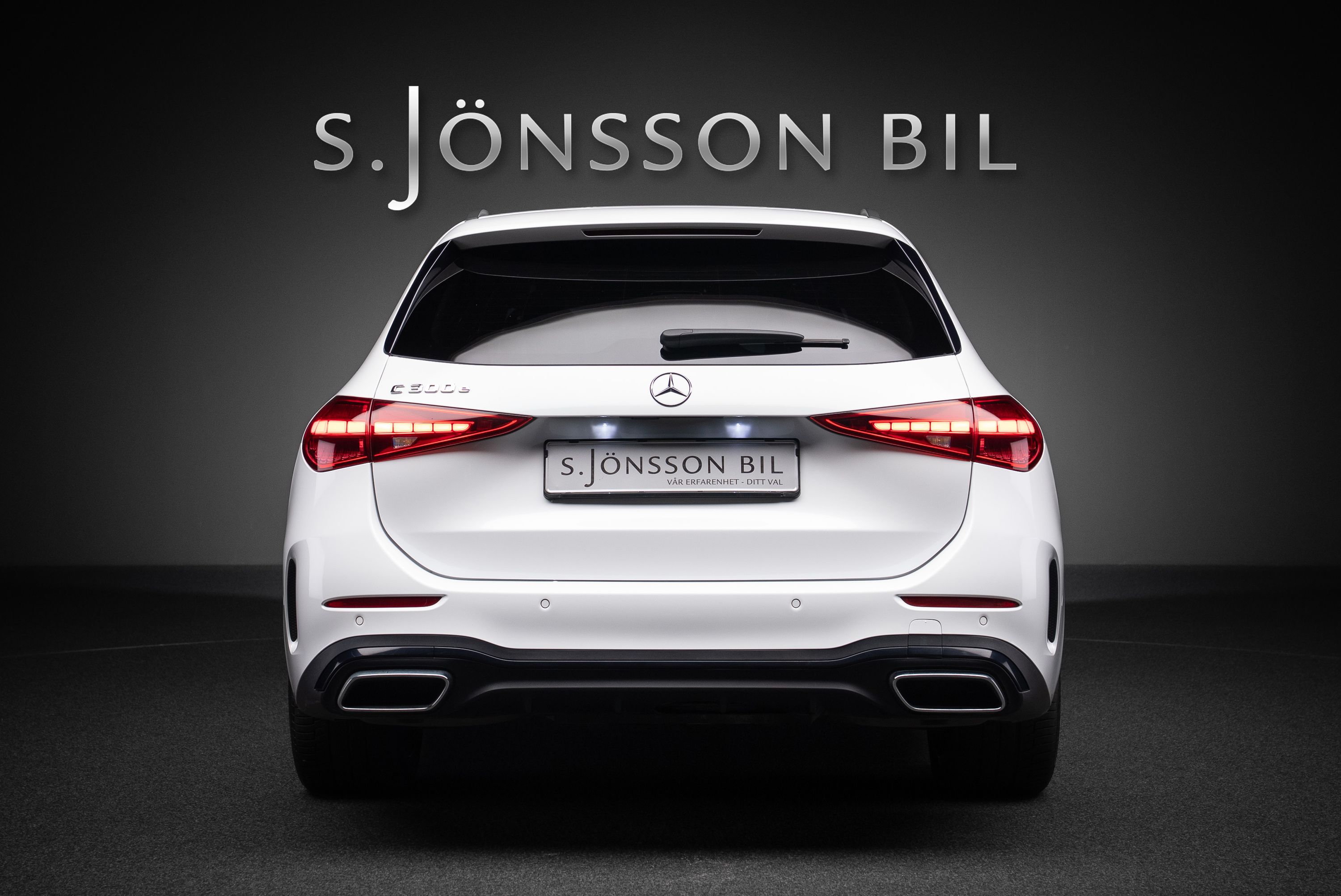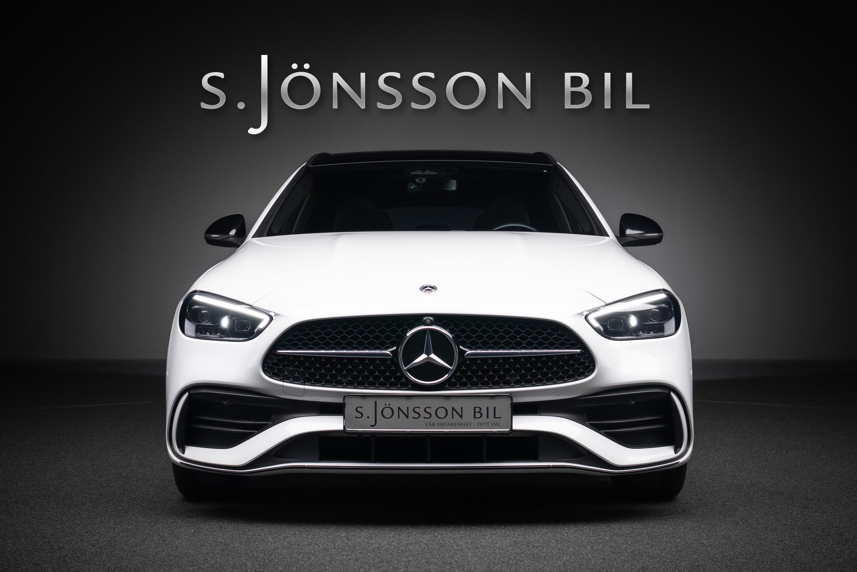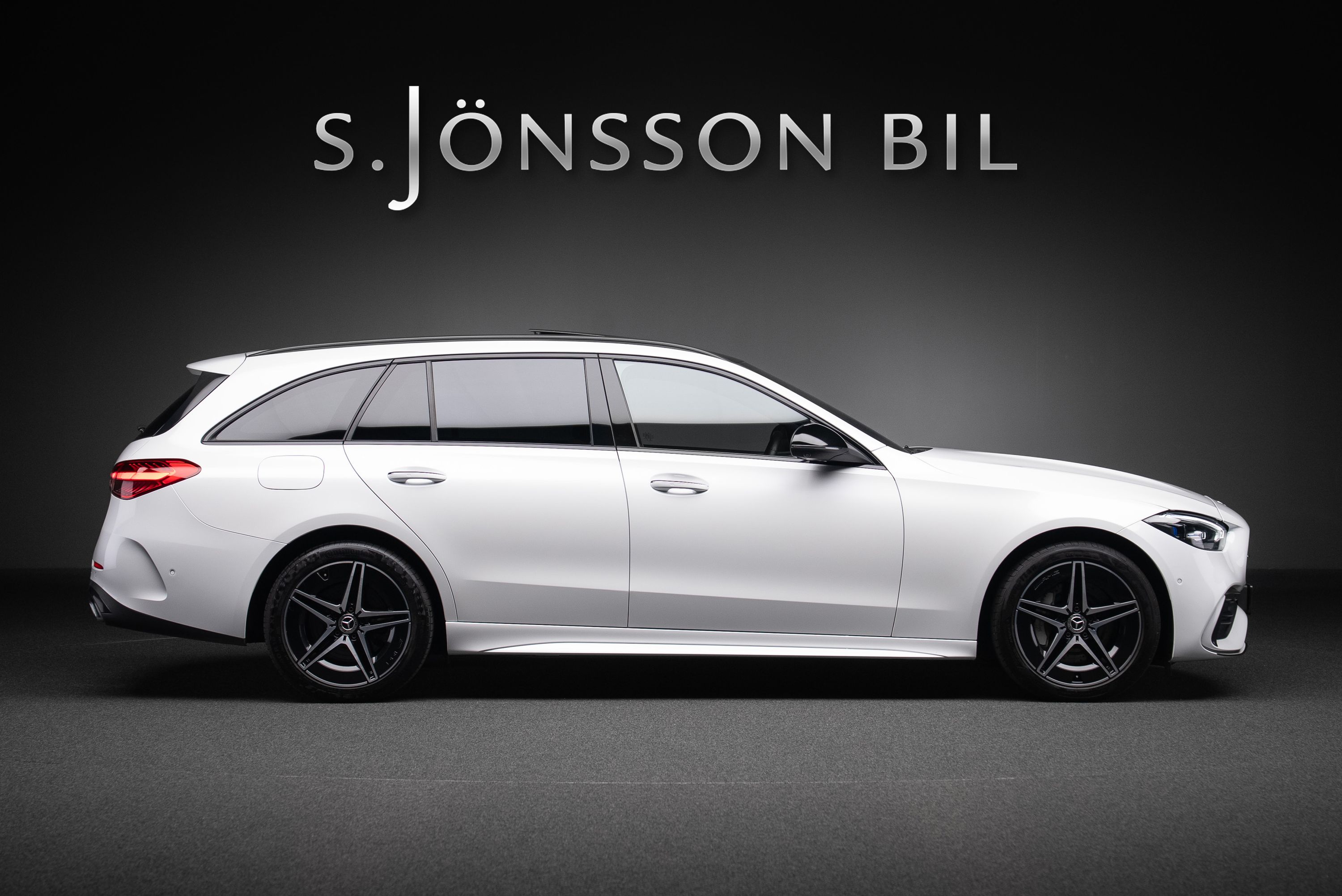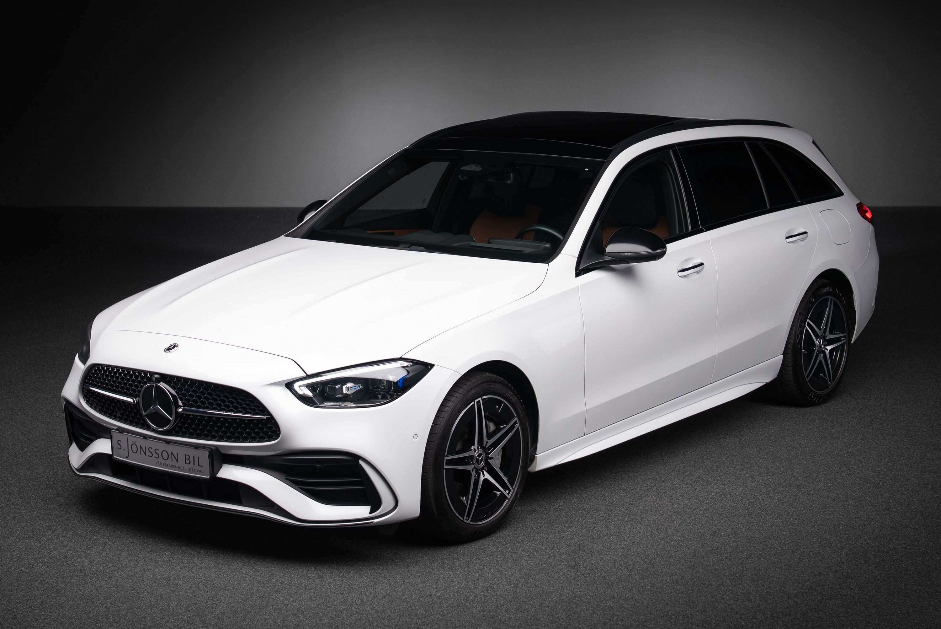 Mercedes-Benz C 300 e kombi AMG lackerad i Manufaktur Opalitvit Bright. Extrautrustad för 149.750 kr.