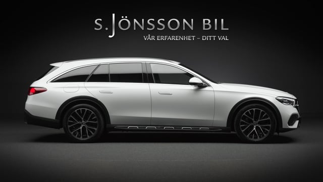 Mercedes-Benz E 300 de All-Terrain 4MATIC laddhybird lackerad i Opalith White Metallic kombinerat med läderinteriör i svart. All-Terrain verisionen kännetecknas bland annat av skyddspaneler i karossen och en mer robust front och bakstötfångare samt sin förhöjda markfrigång. På en laddning kommer man upp till 102 km enligt WLTP tack vare batteriet på 25,4 kWh.