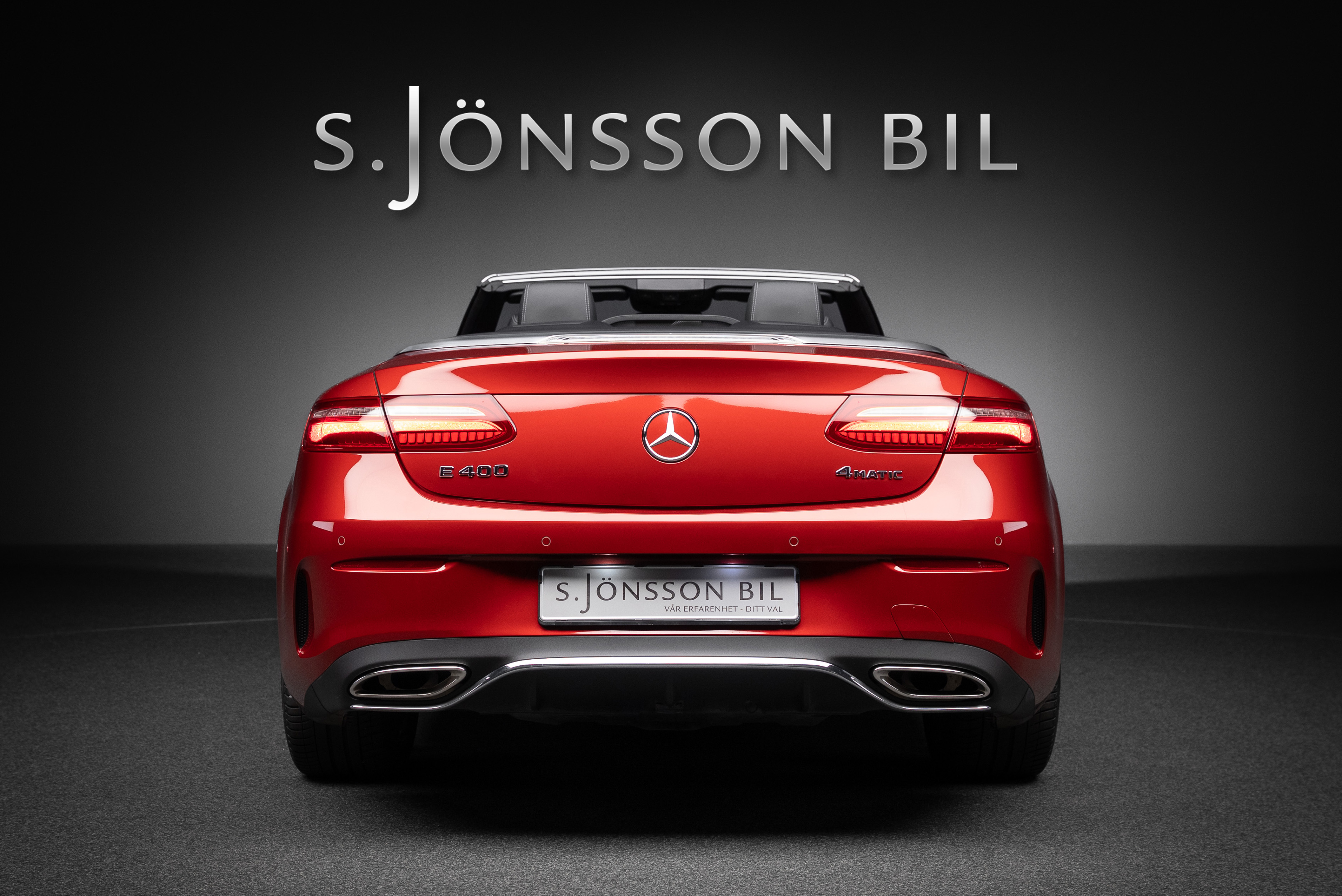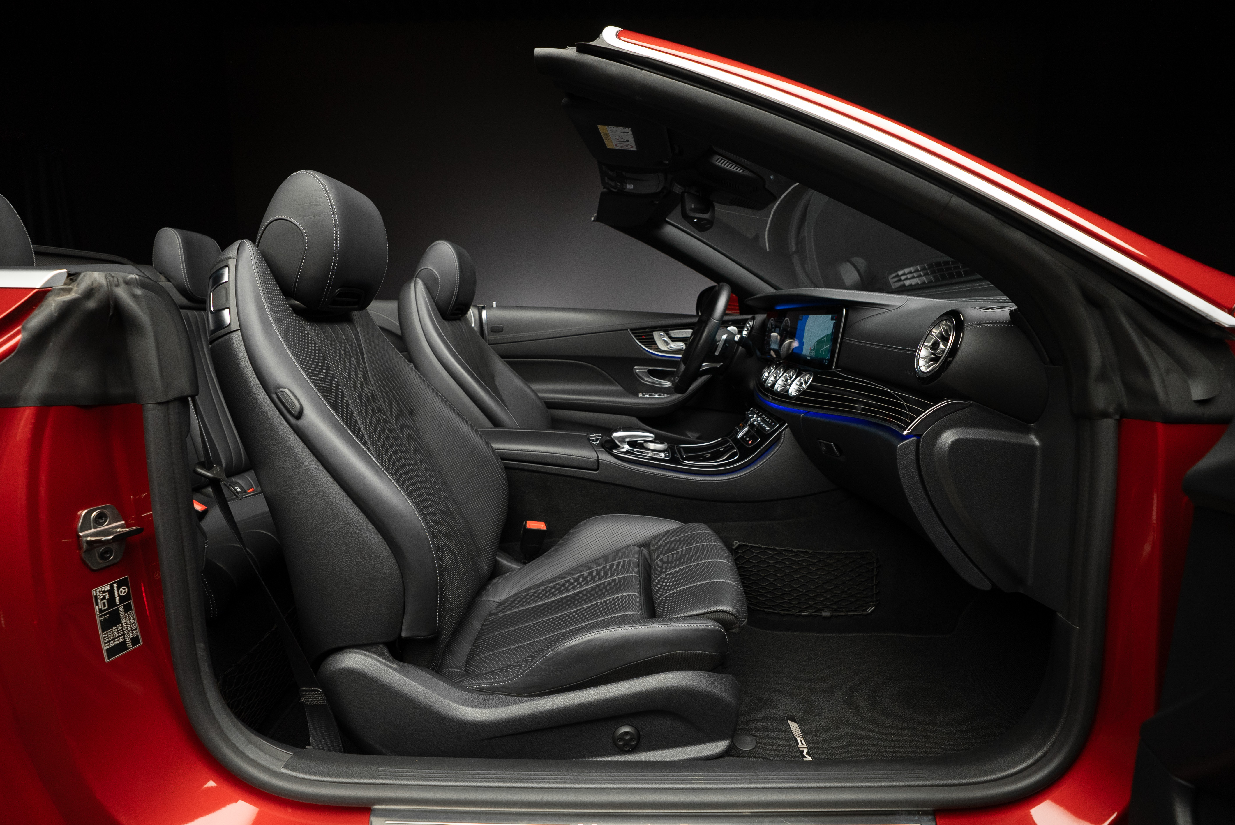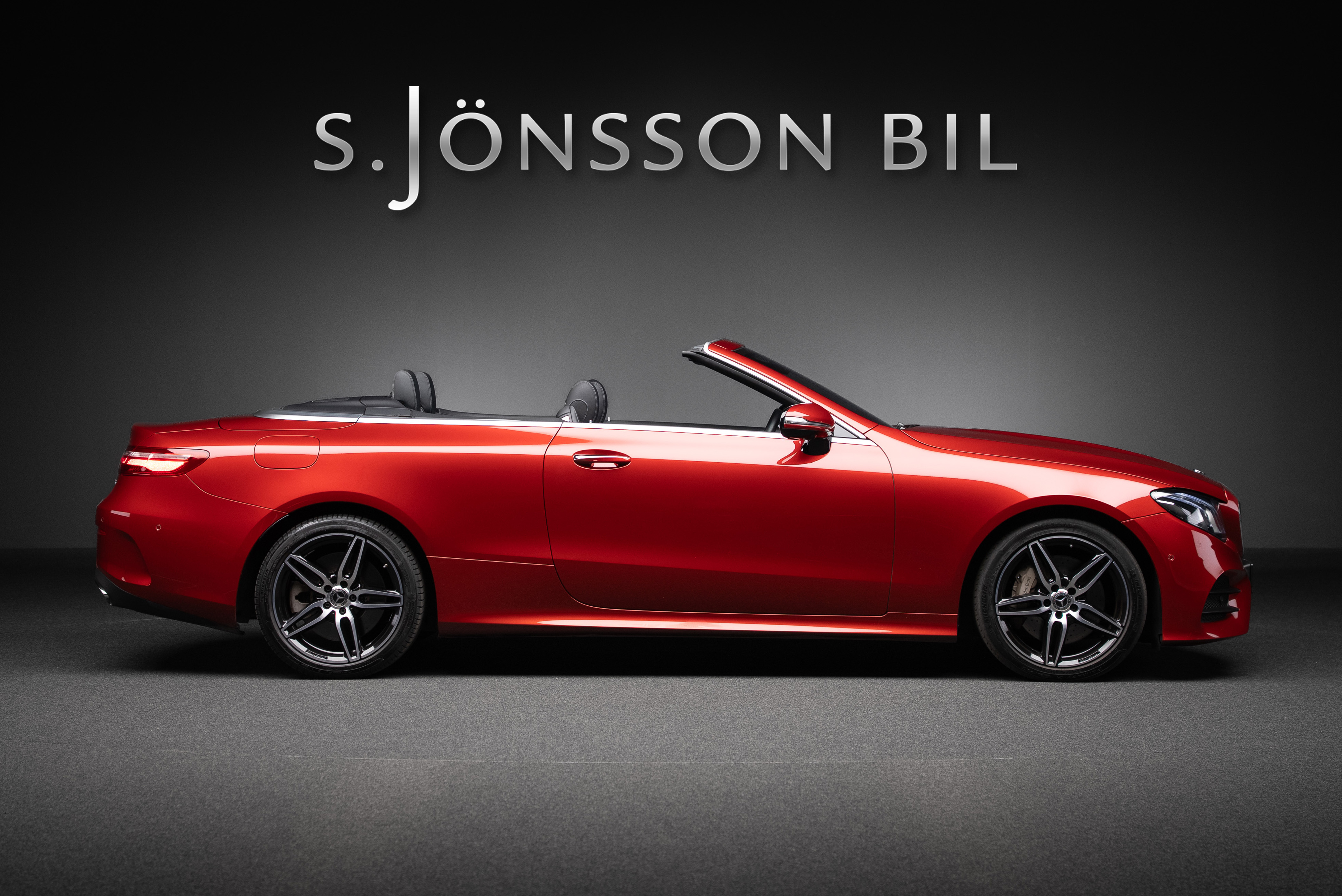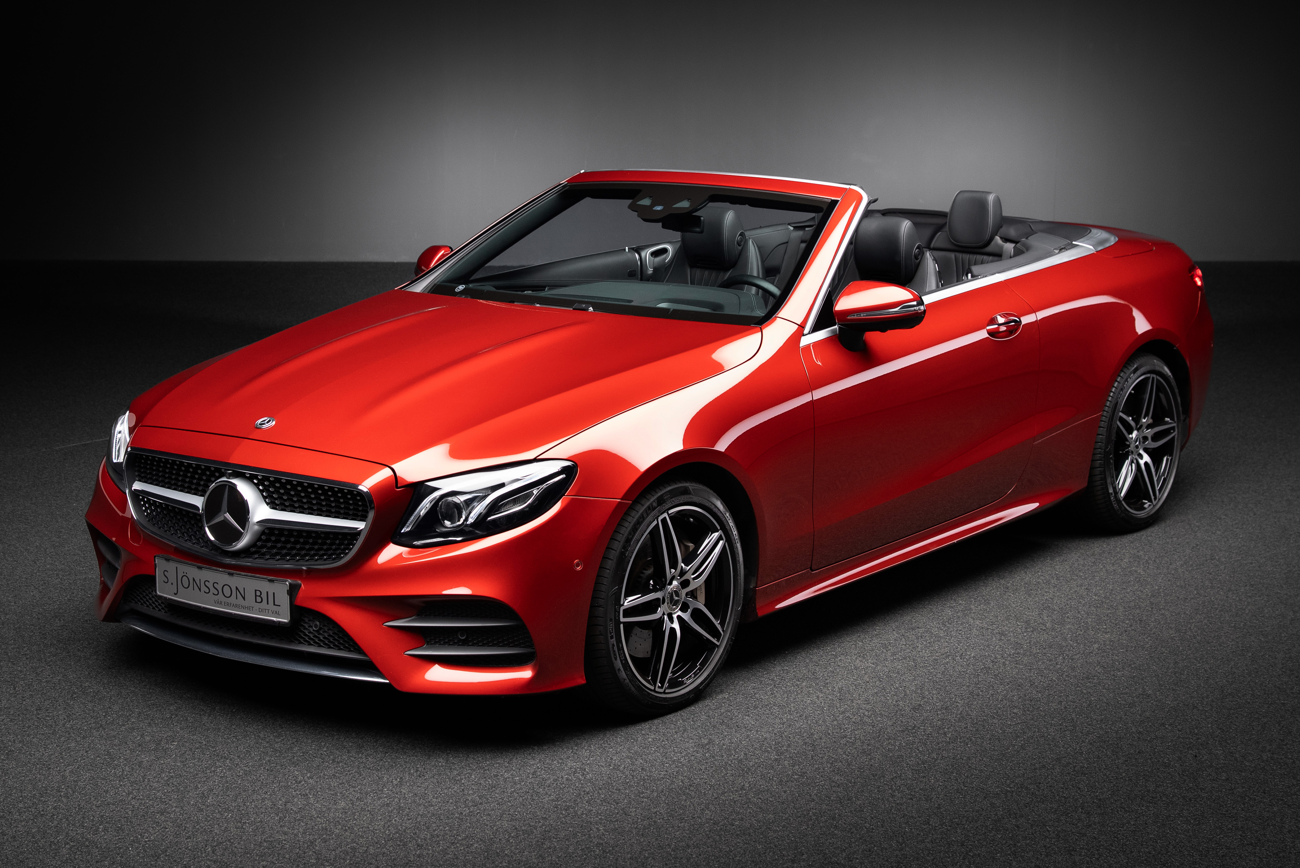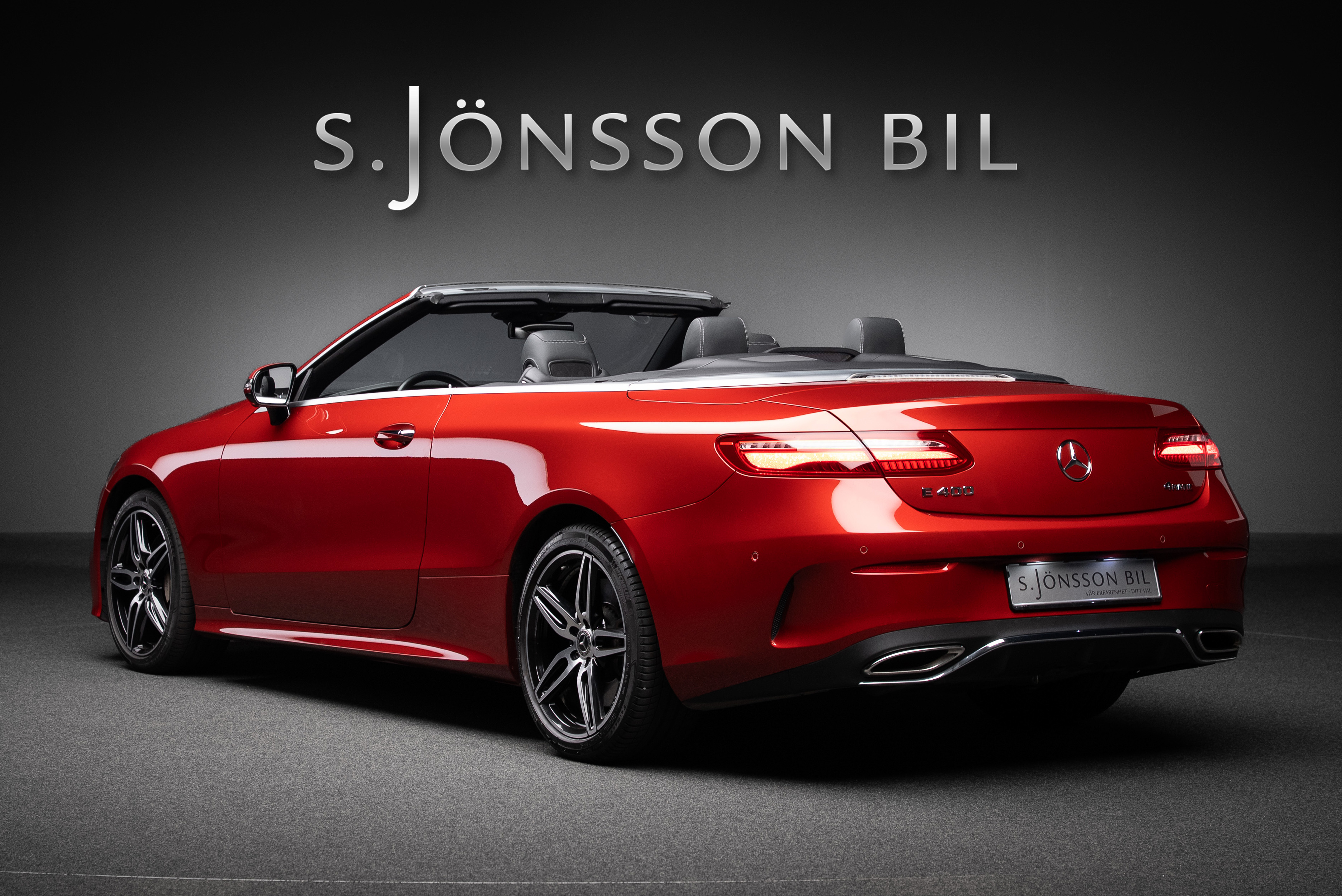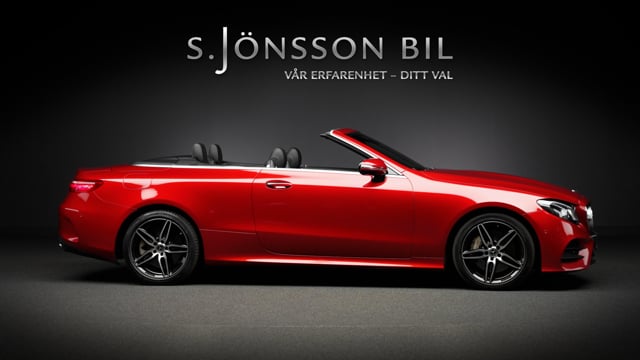 Mercedes-Benz E 400 AMG Cabriolet 4MATIC med ovanligt mycket extrautrustning. Lackerad i Manufakturfärgen Hyacintröd metallic kombinerat med utökad läderinteriör i svart.