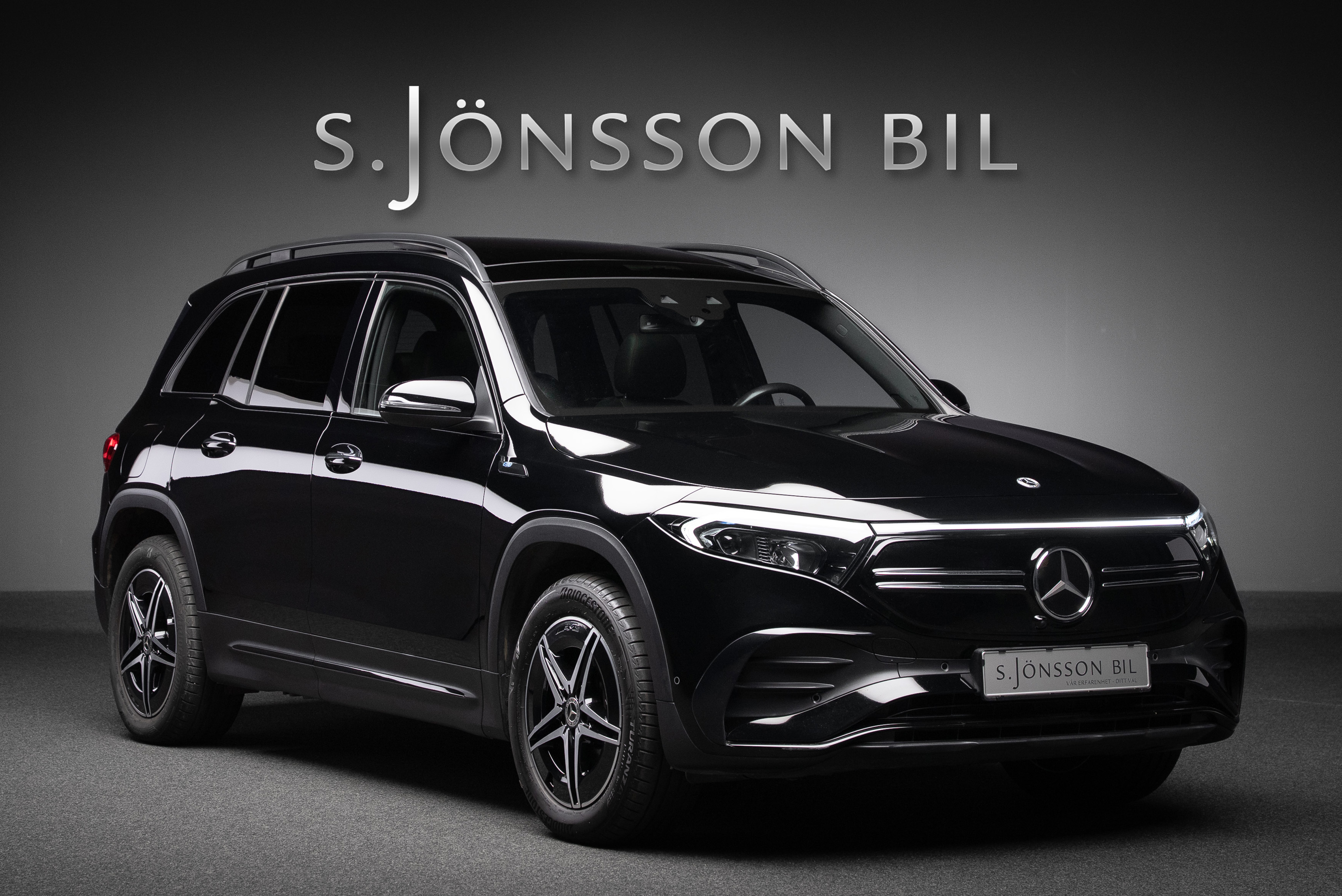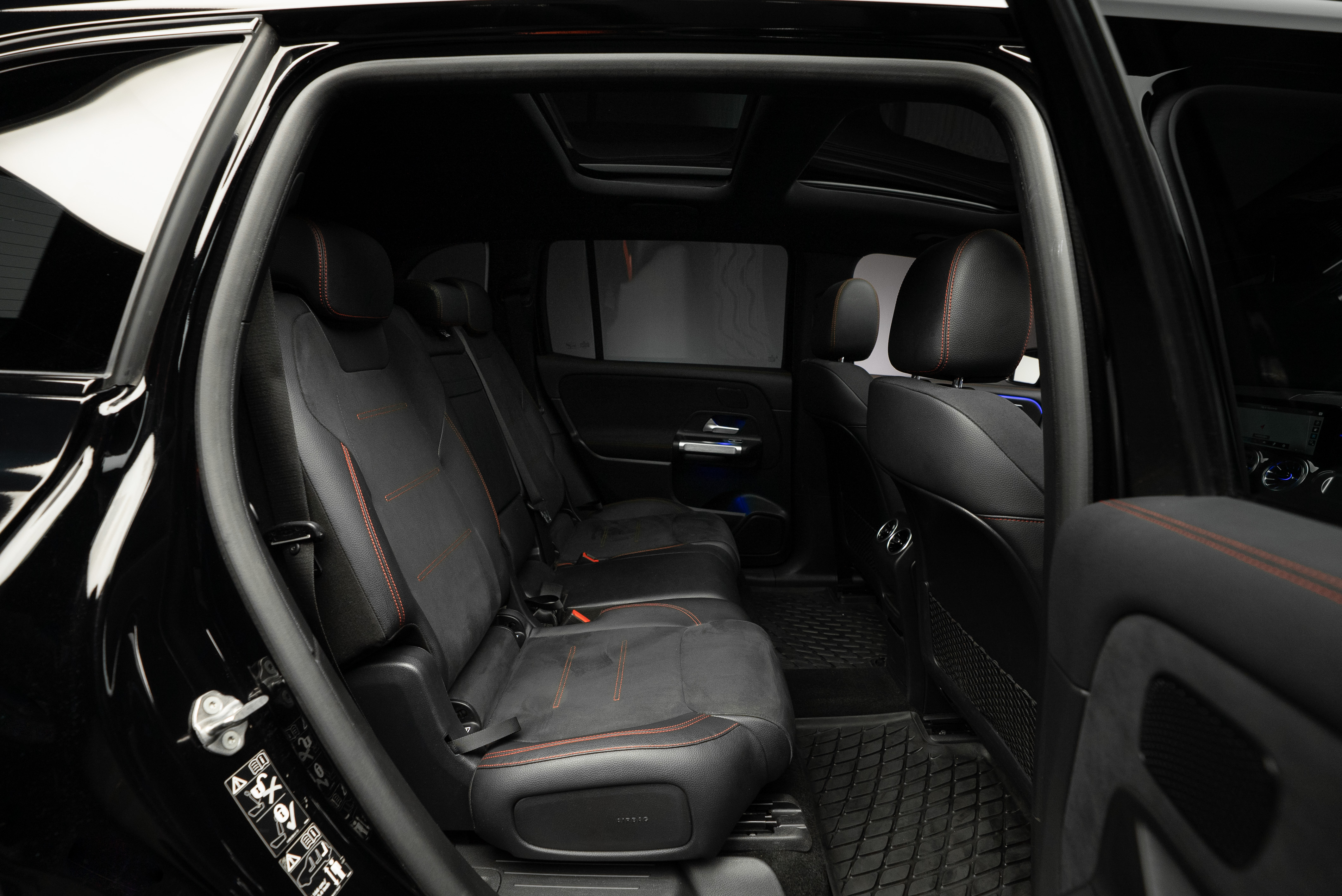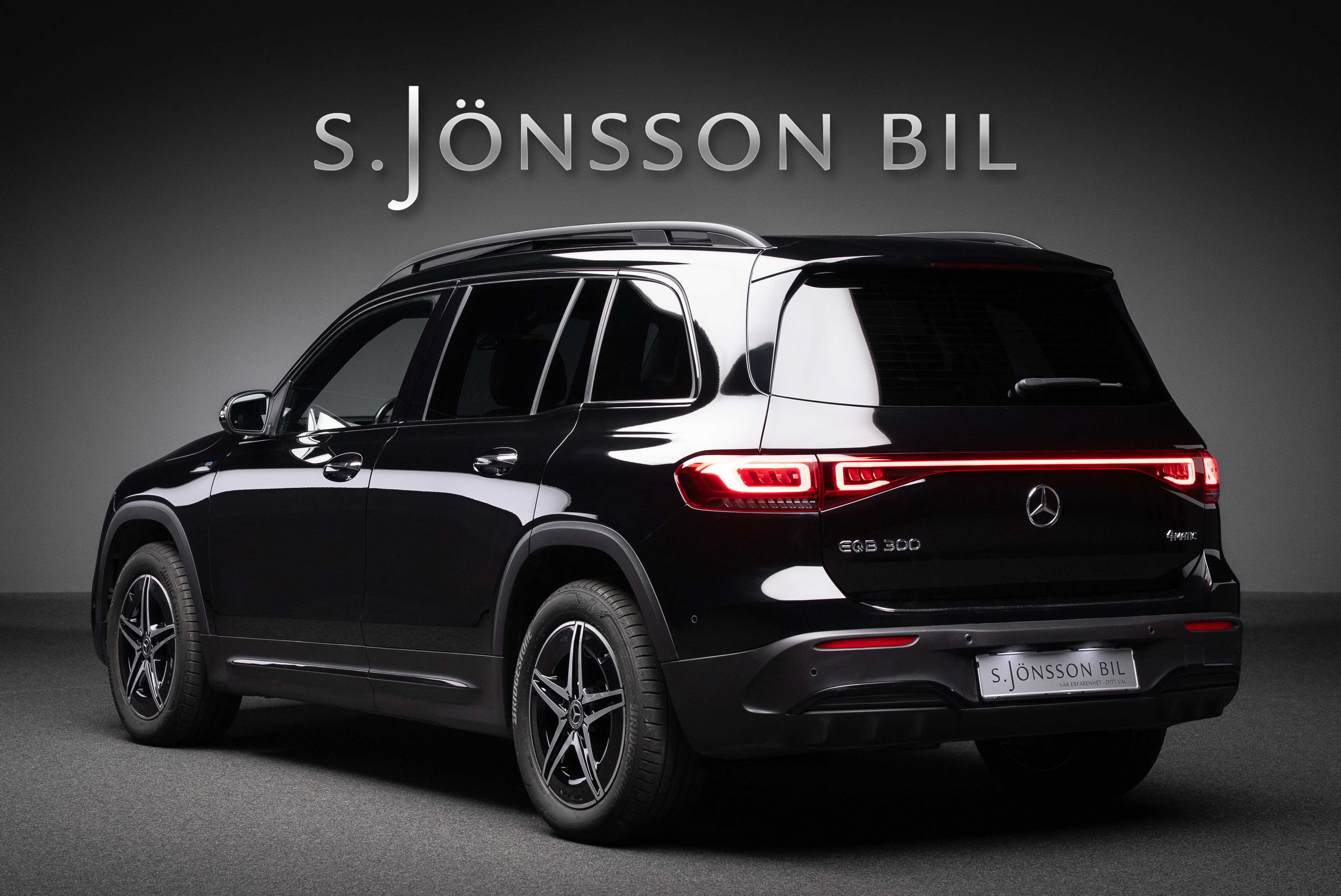Mercedes-Benz EQB 300 4MATIC 7 sits lackerad i Night Black kombinerat med svart läder och alcantara klädsel med röda kontrastsömmar.