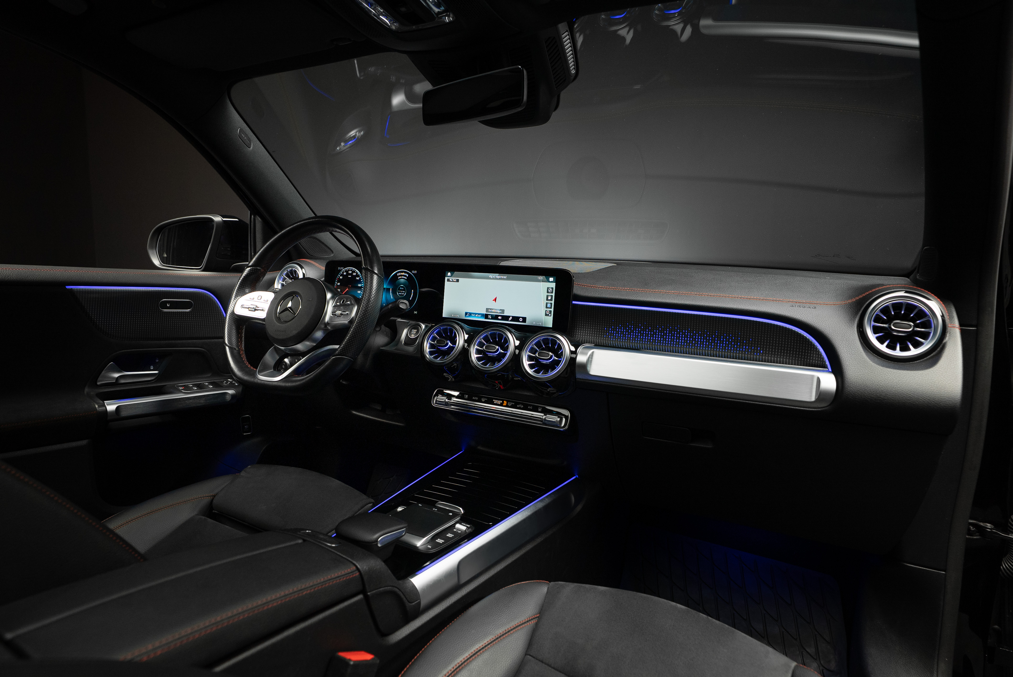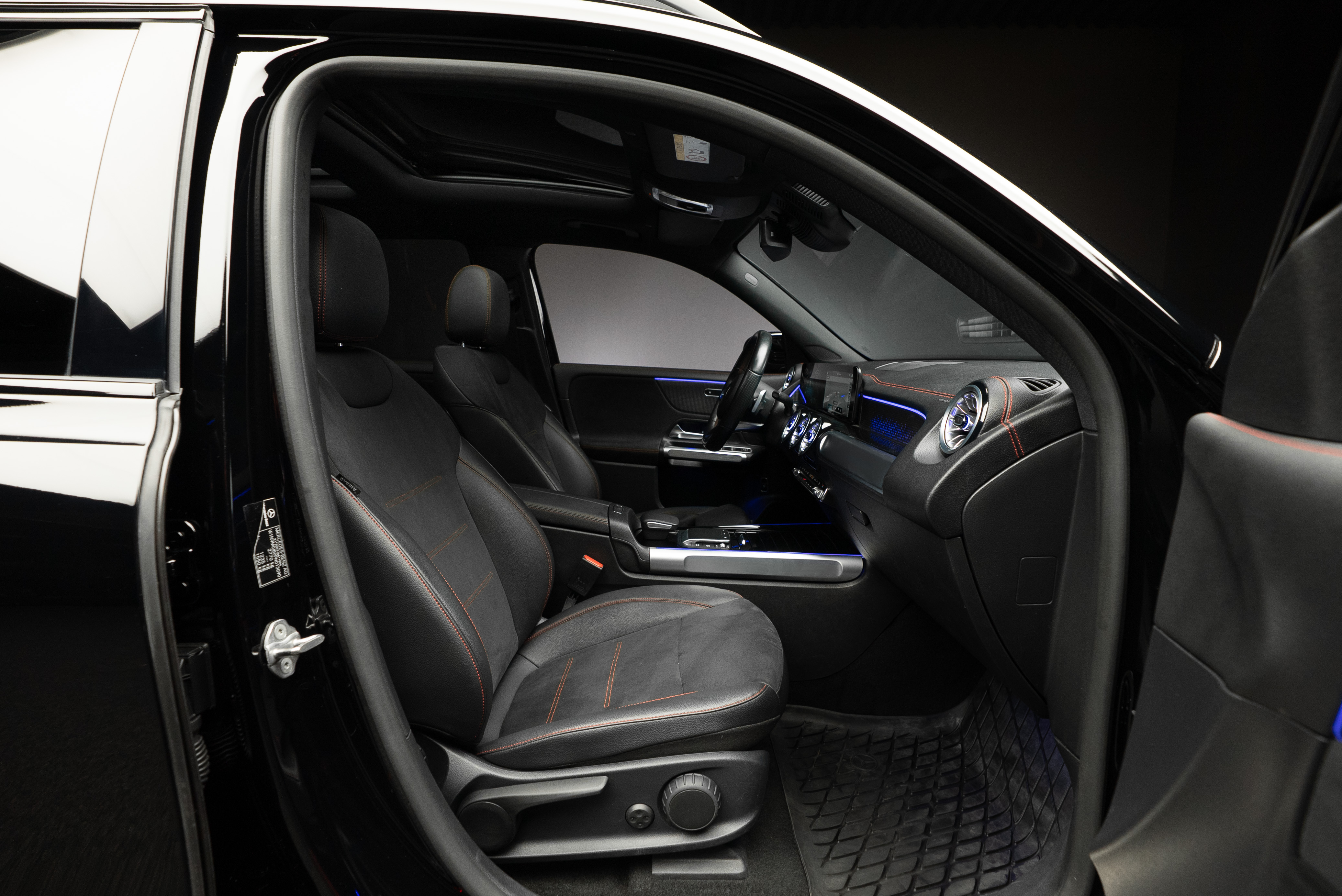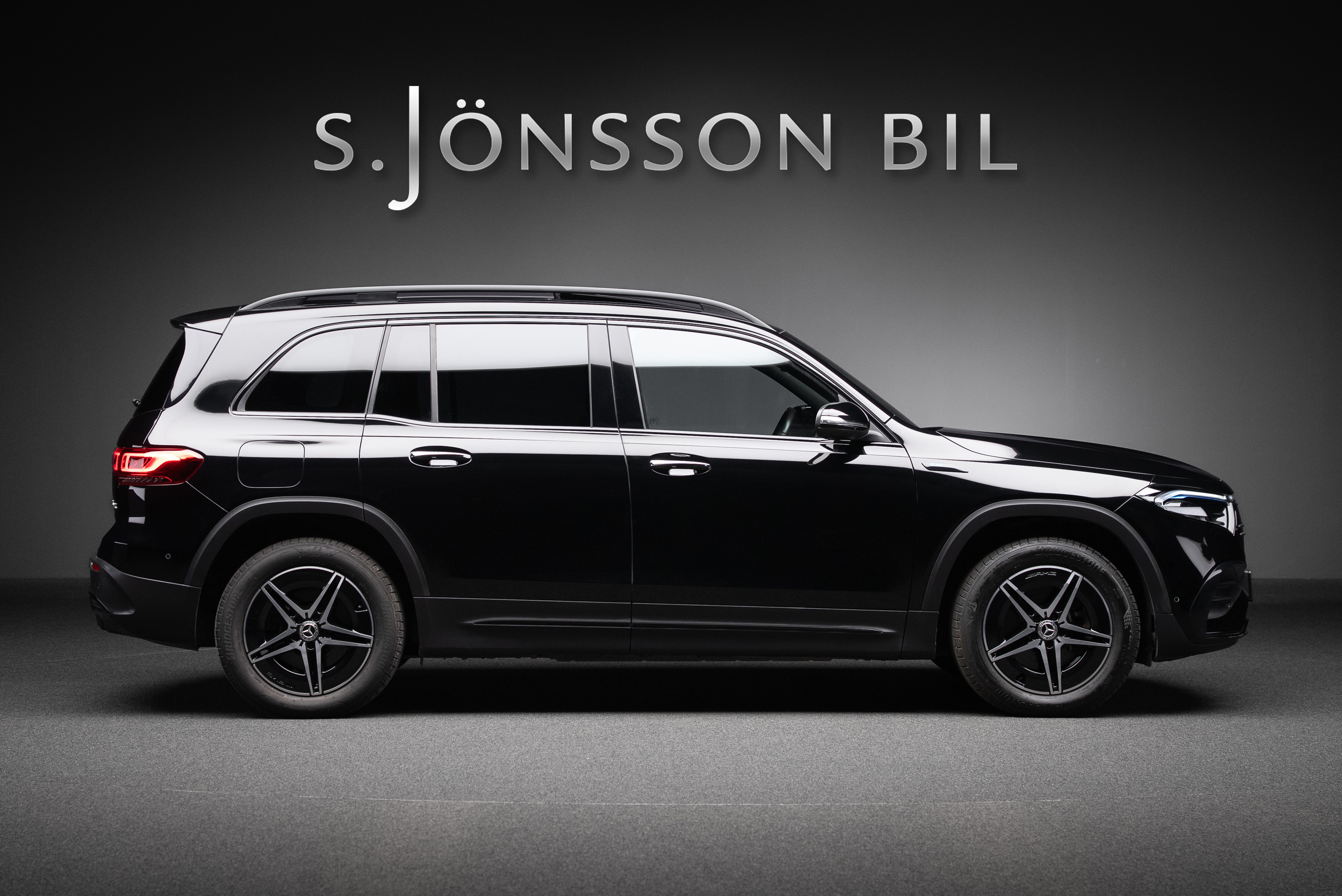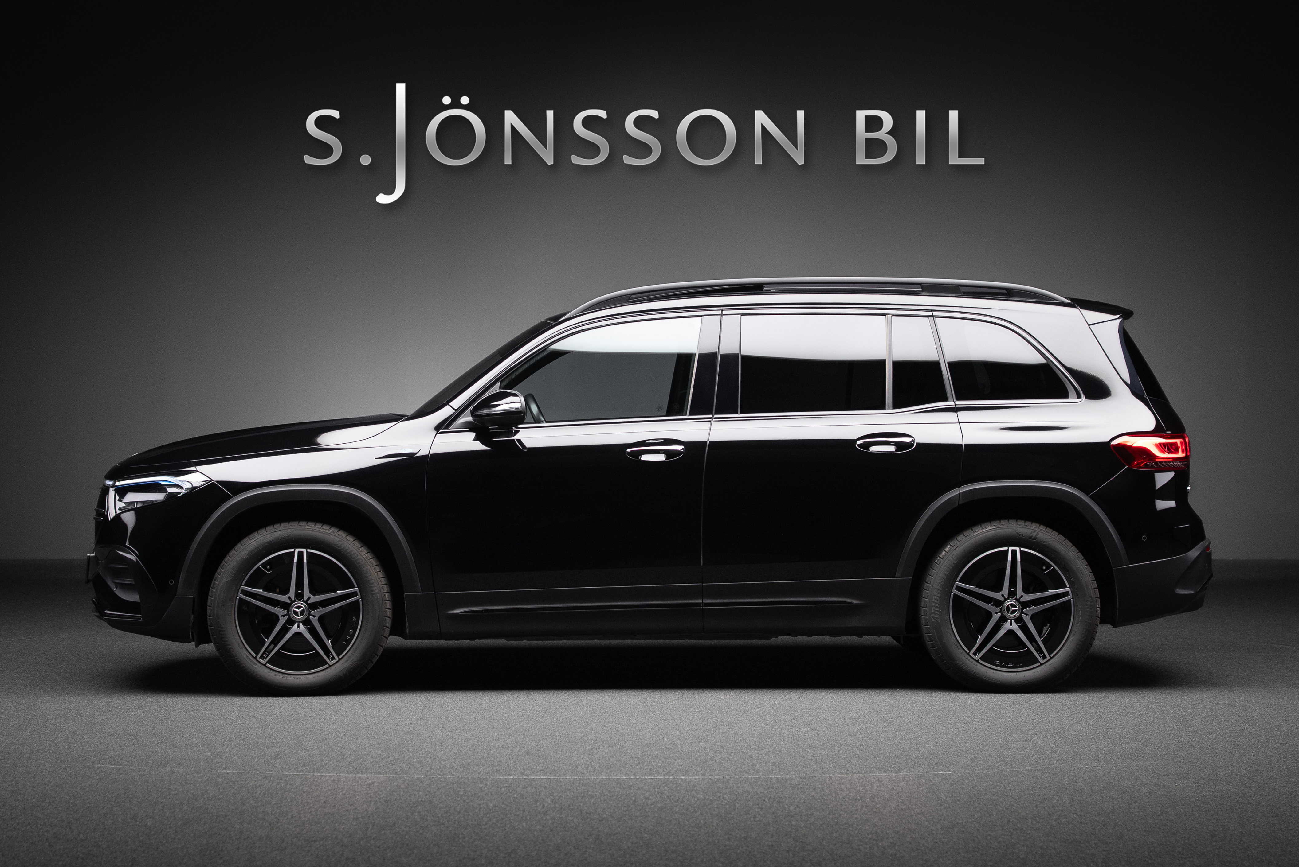 Mercedes-Benz EQB 300 4MATIC 7 sits lackerad i Night Black kombinerat med svart läder och alcantara klädsel med röda kontrastsömmar.