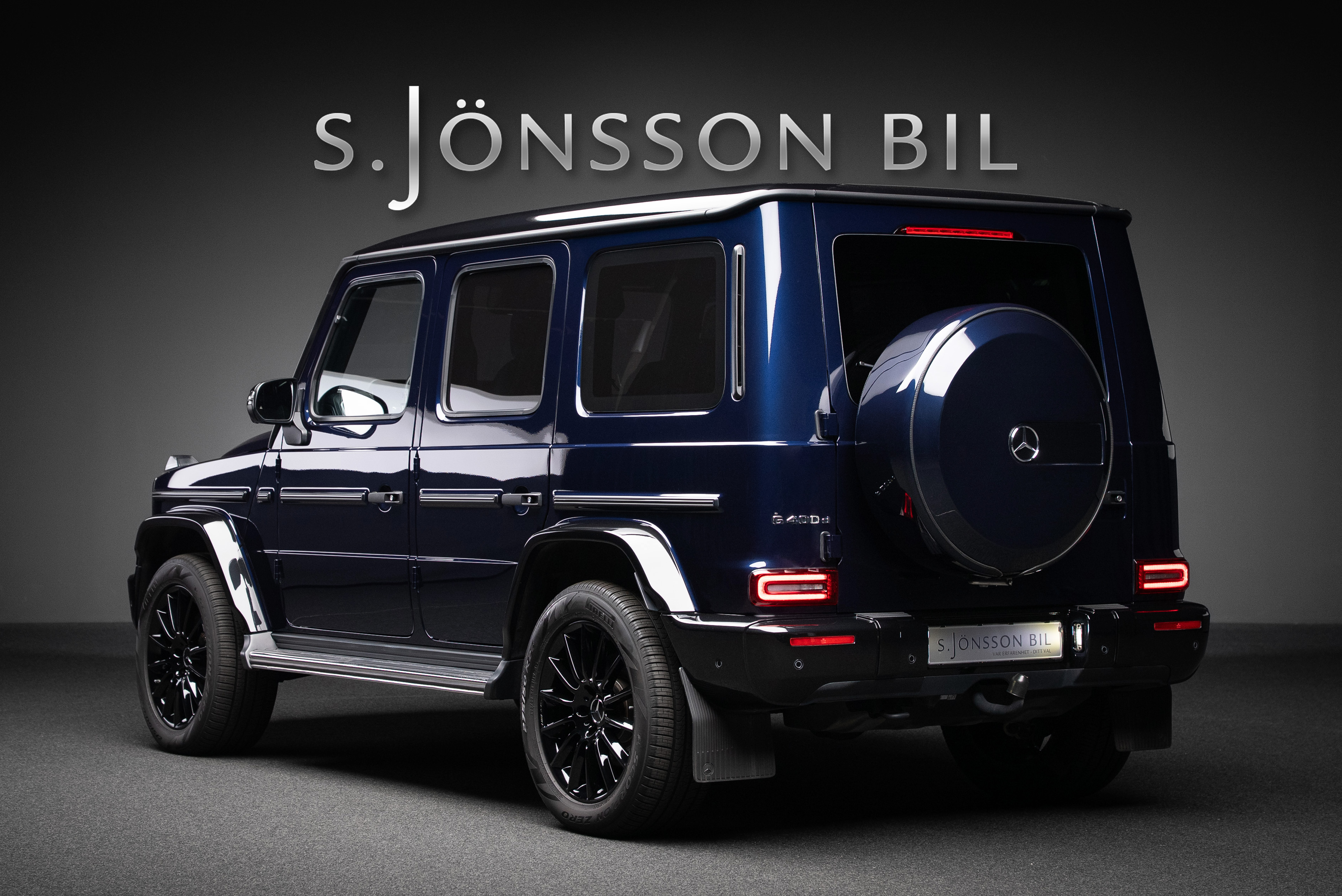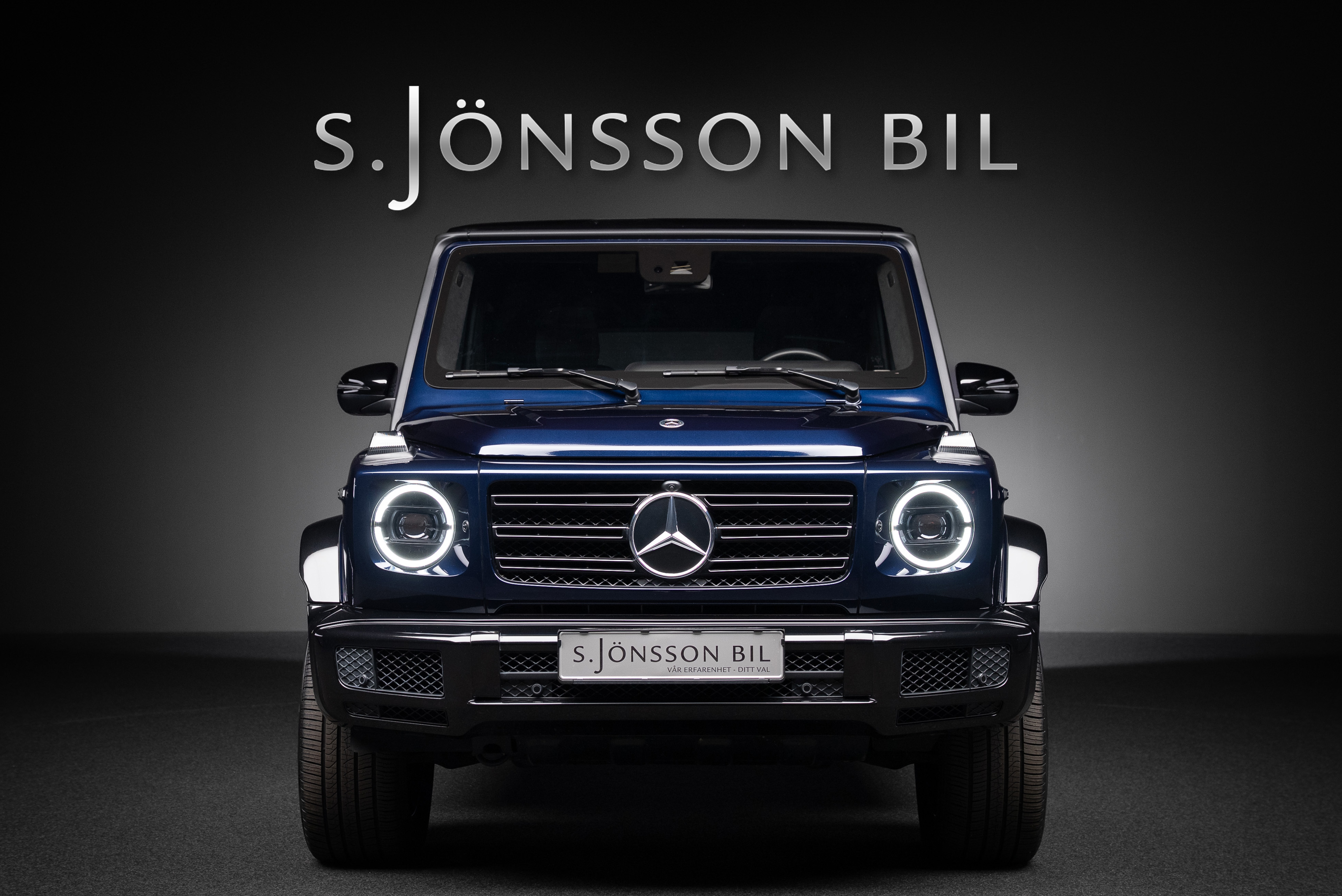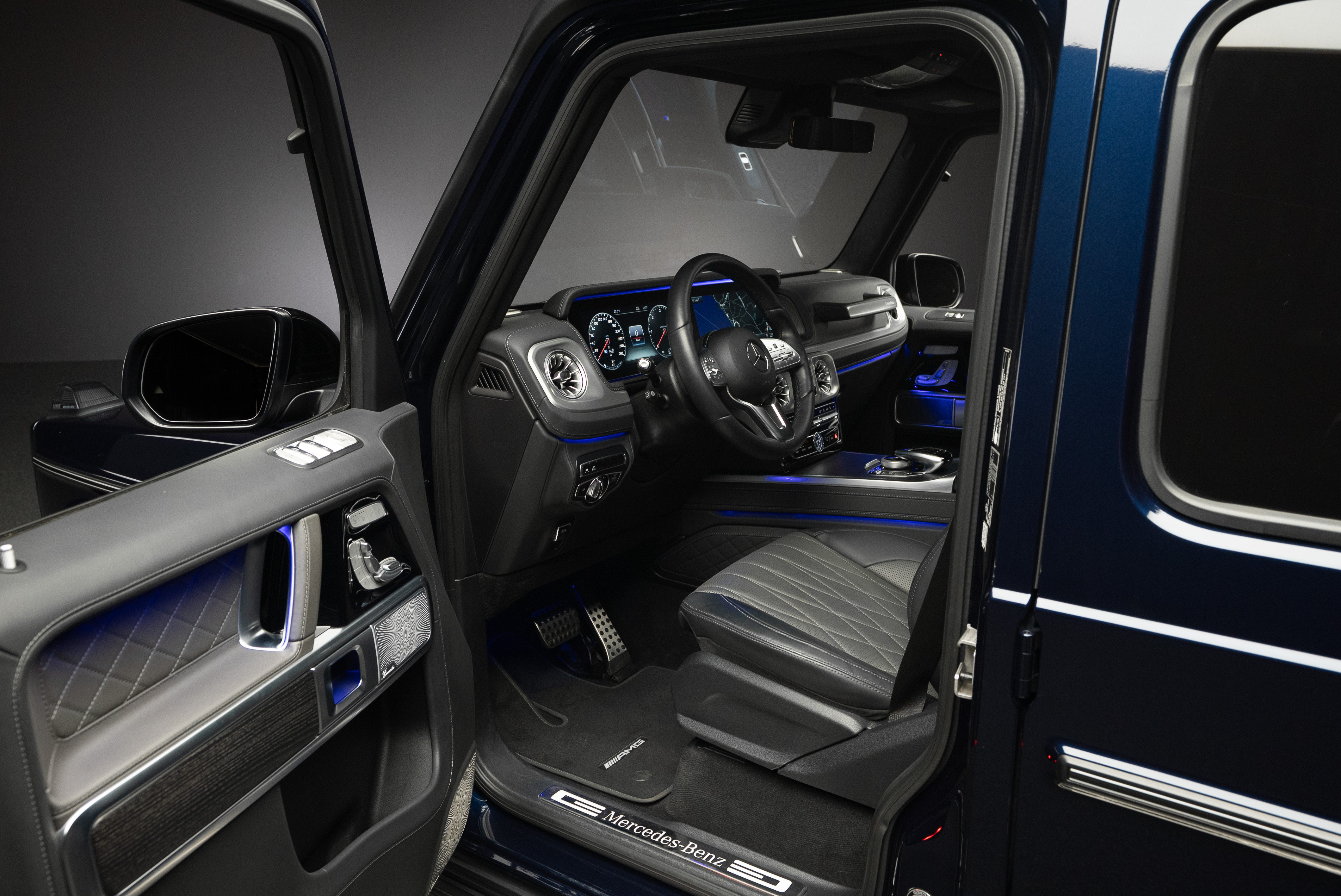 Mercedes-Benz G 400 d AMG, lackerad i Cavansitblå metallic kombinerat med tvåtons manufaktur interiör i titangrå och svart.