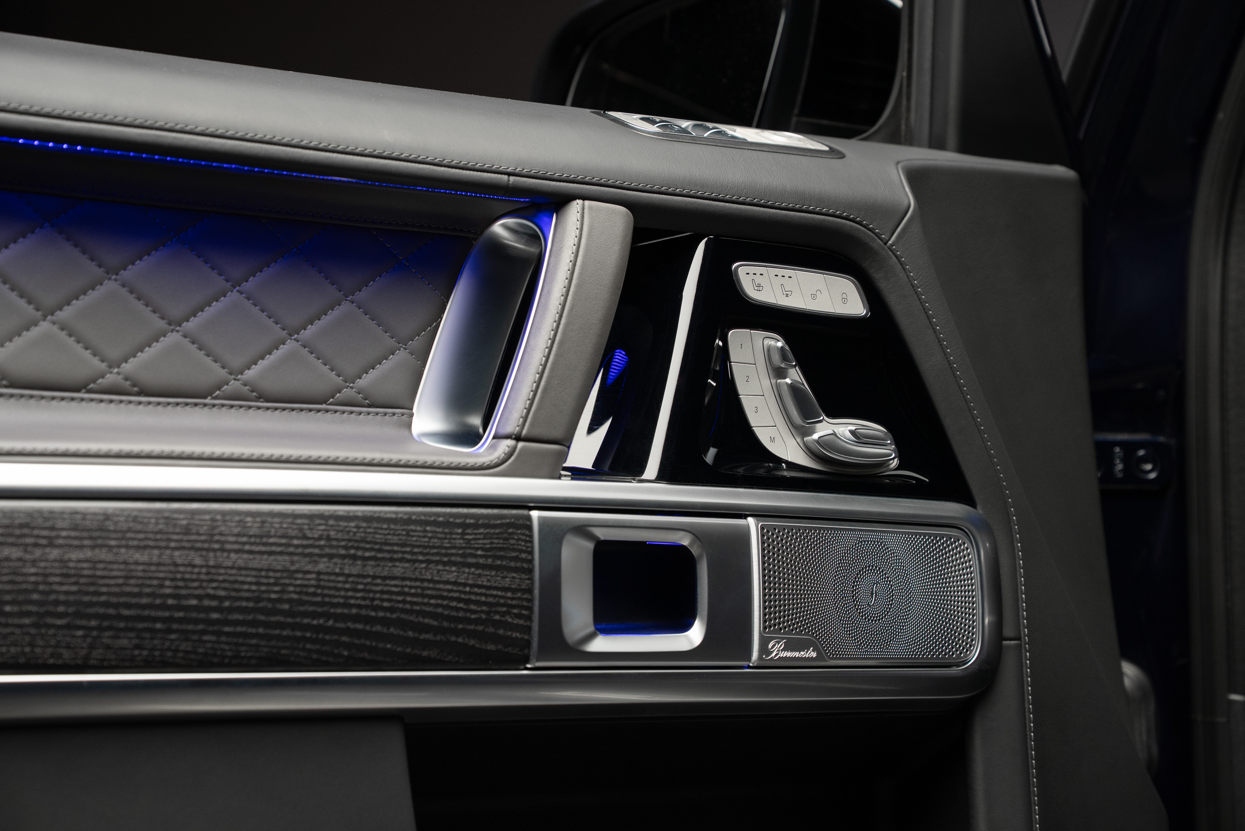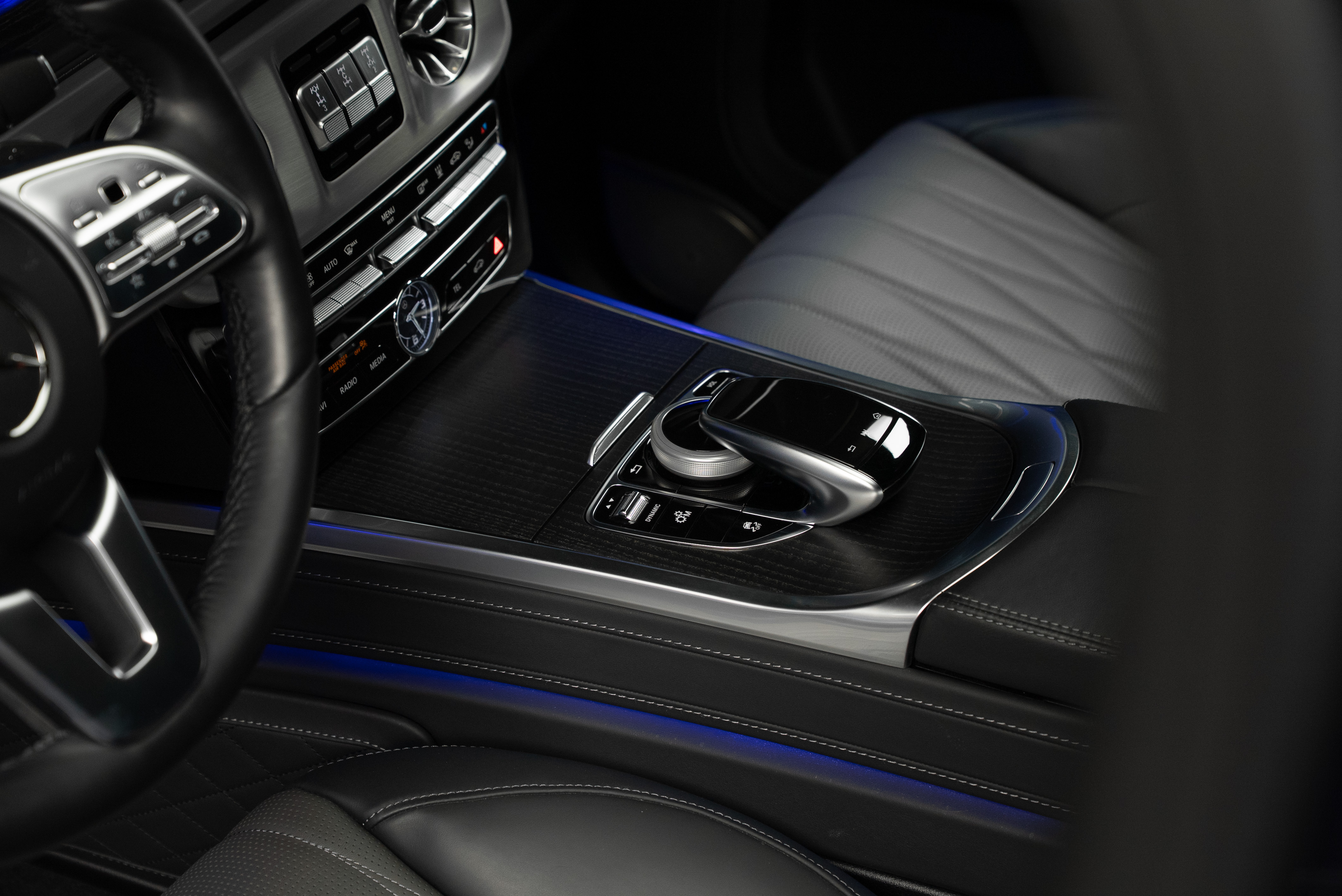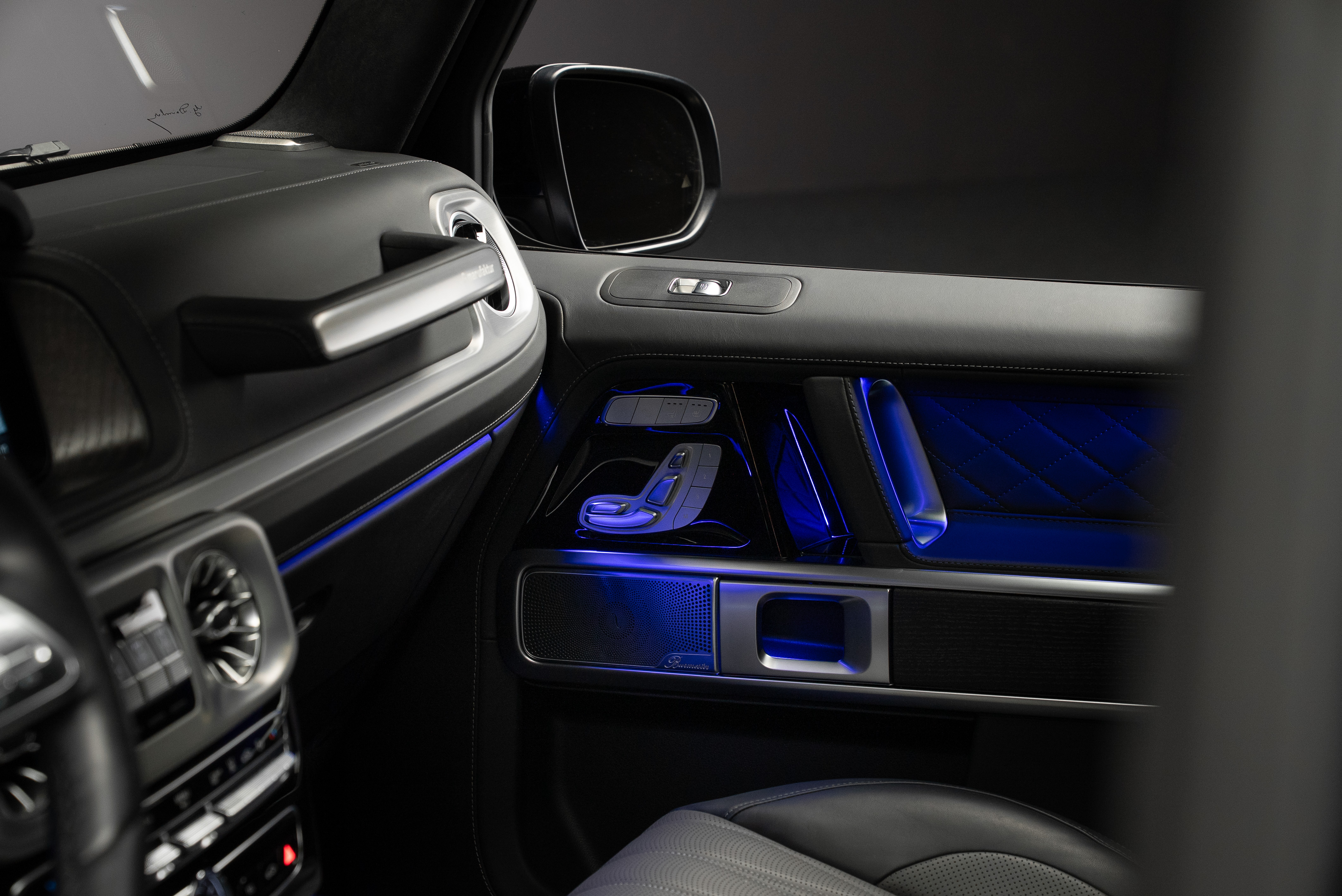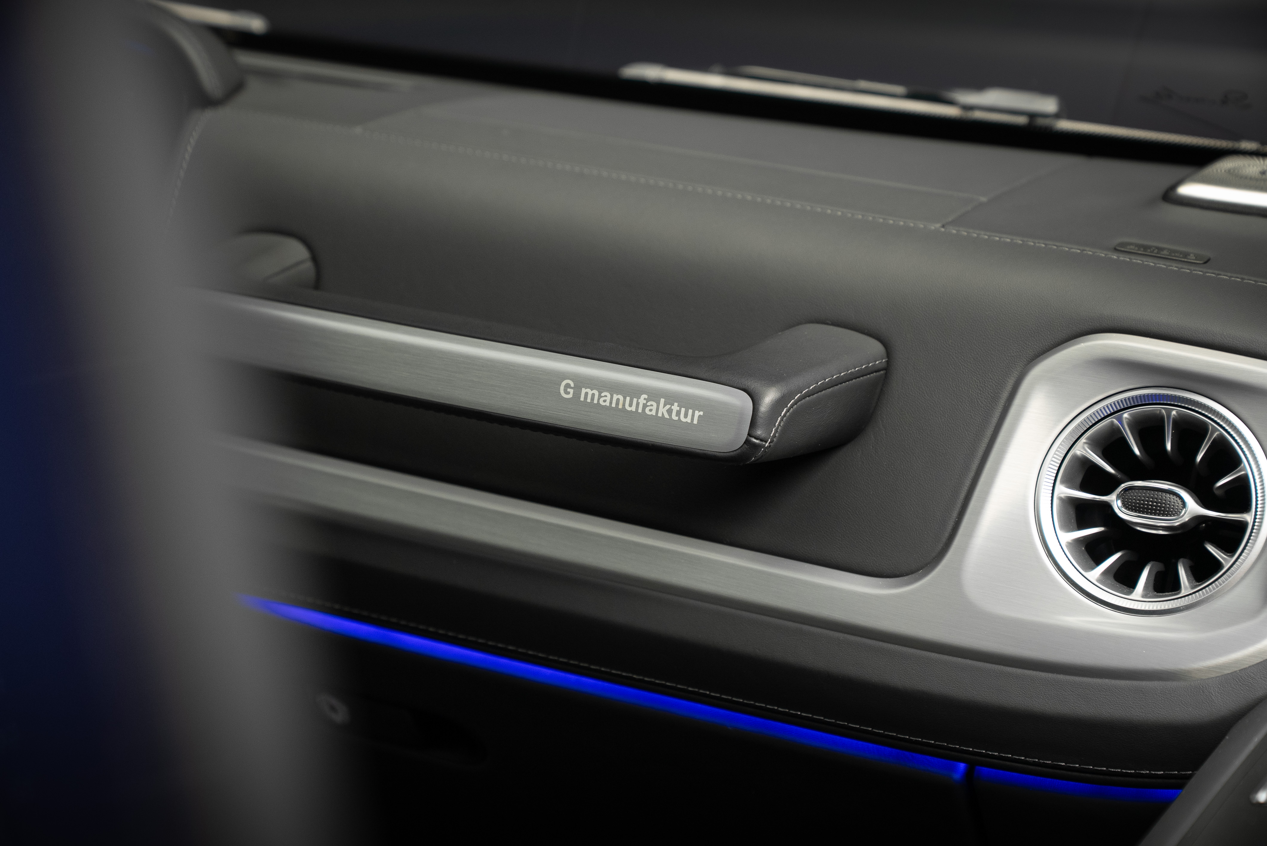 Mercedes-Benz G 400 d AMG, lackerad i Cavansitblå metallic kombinerat med tvåtons manufaktur interiör i titangrå och svart.