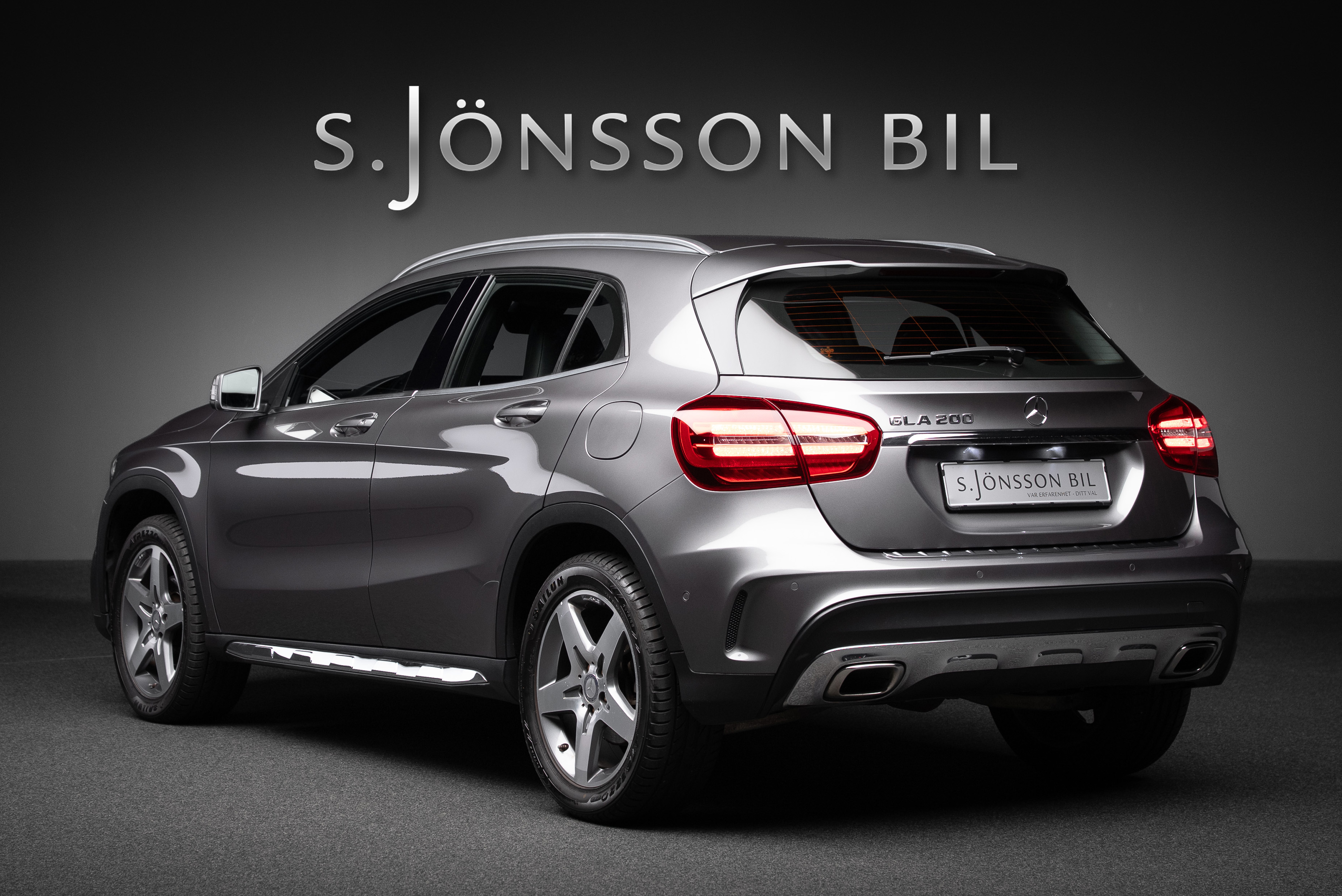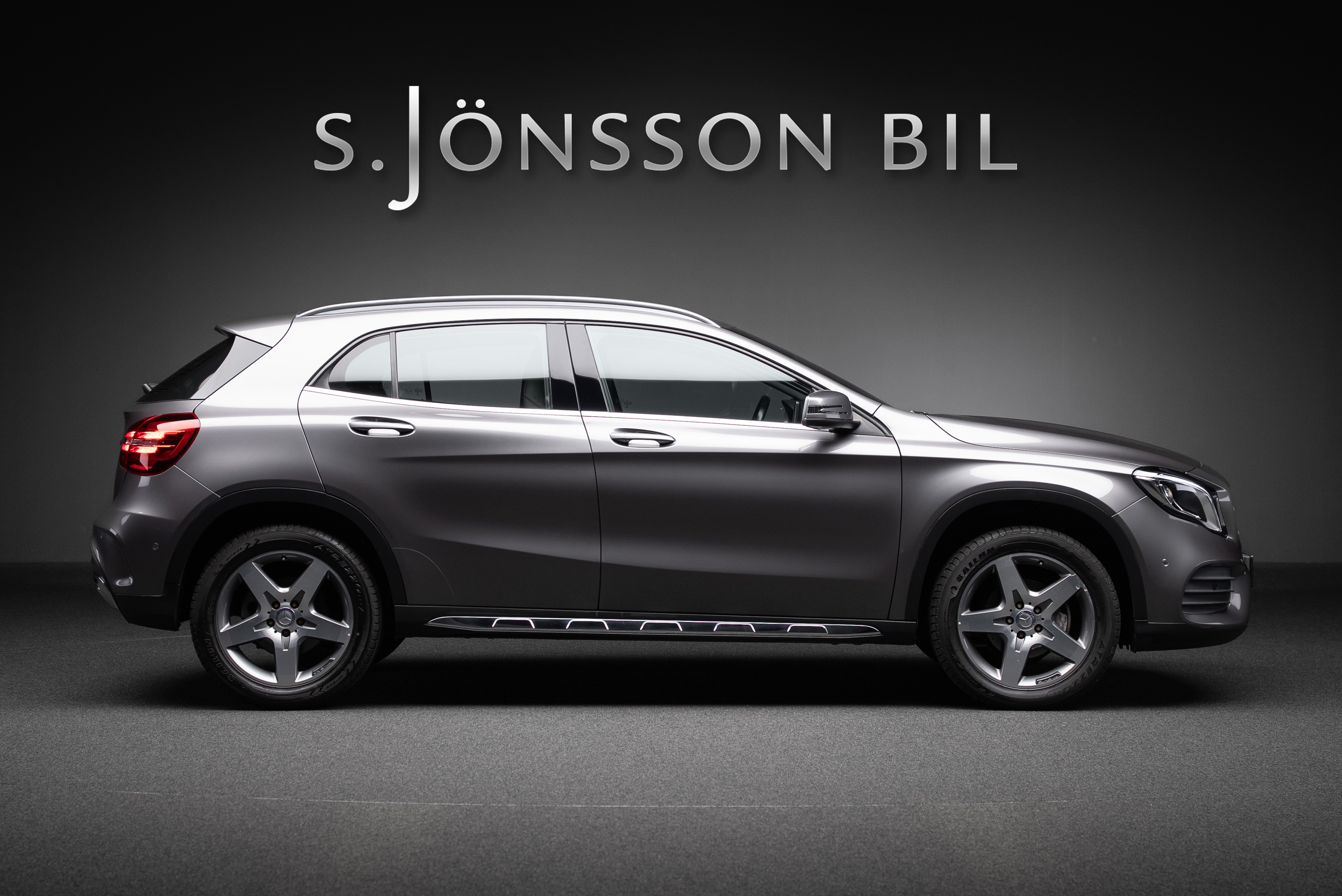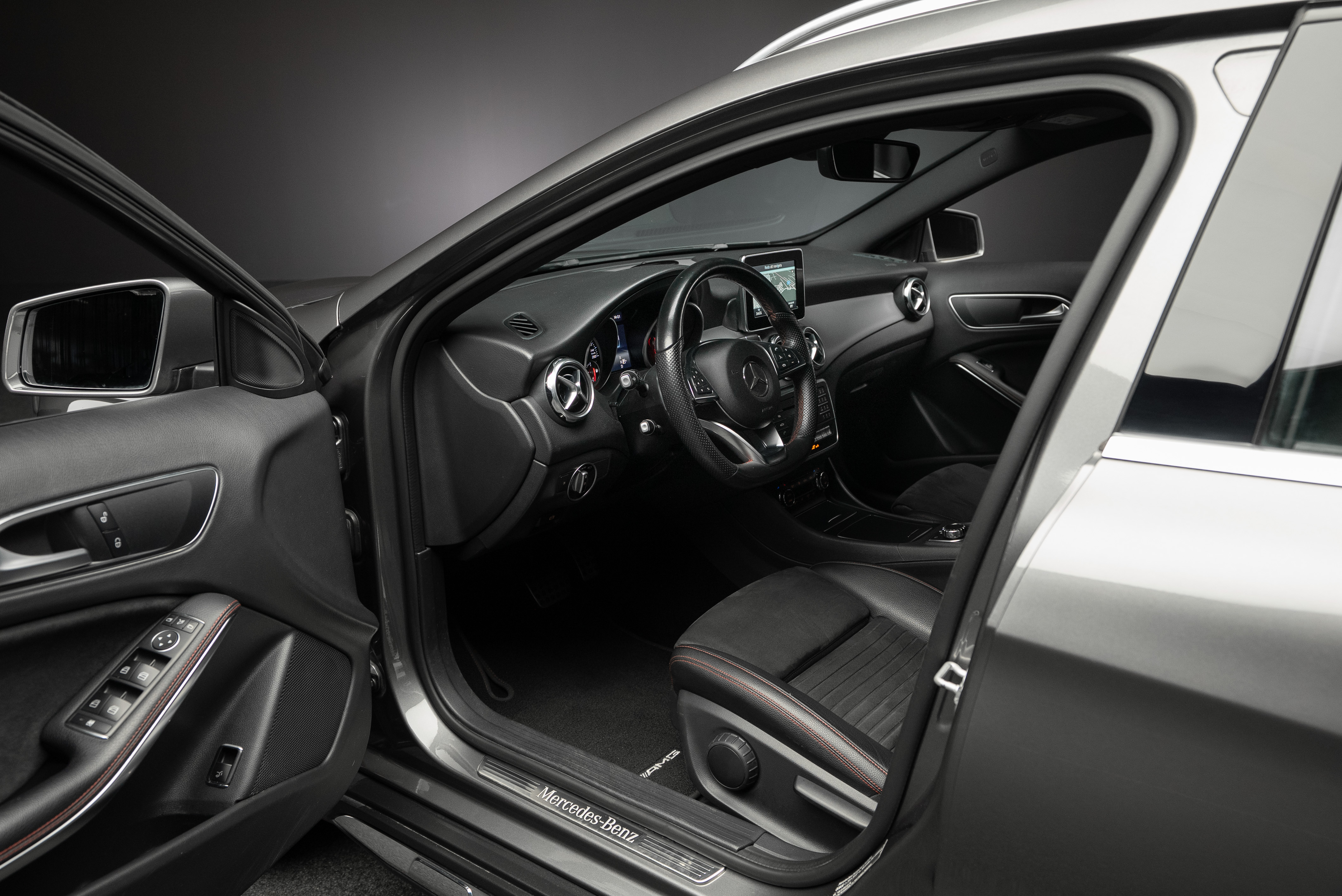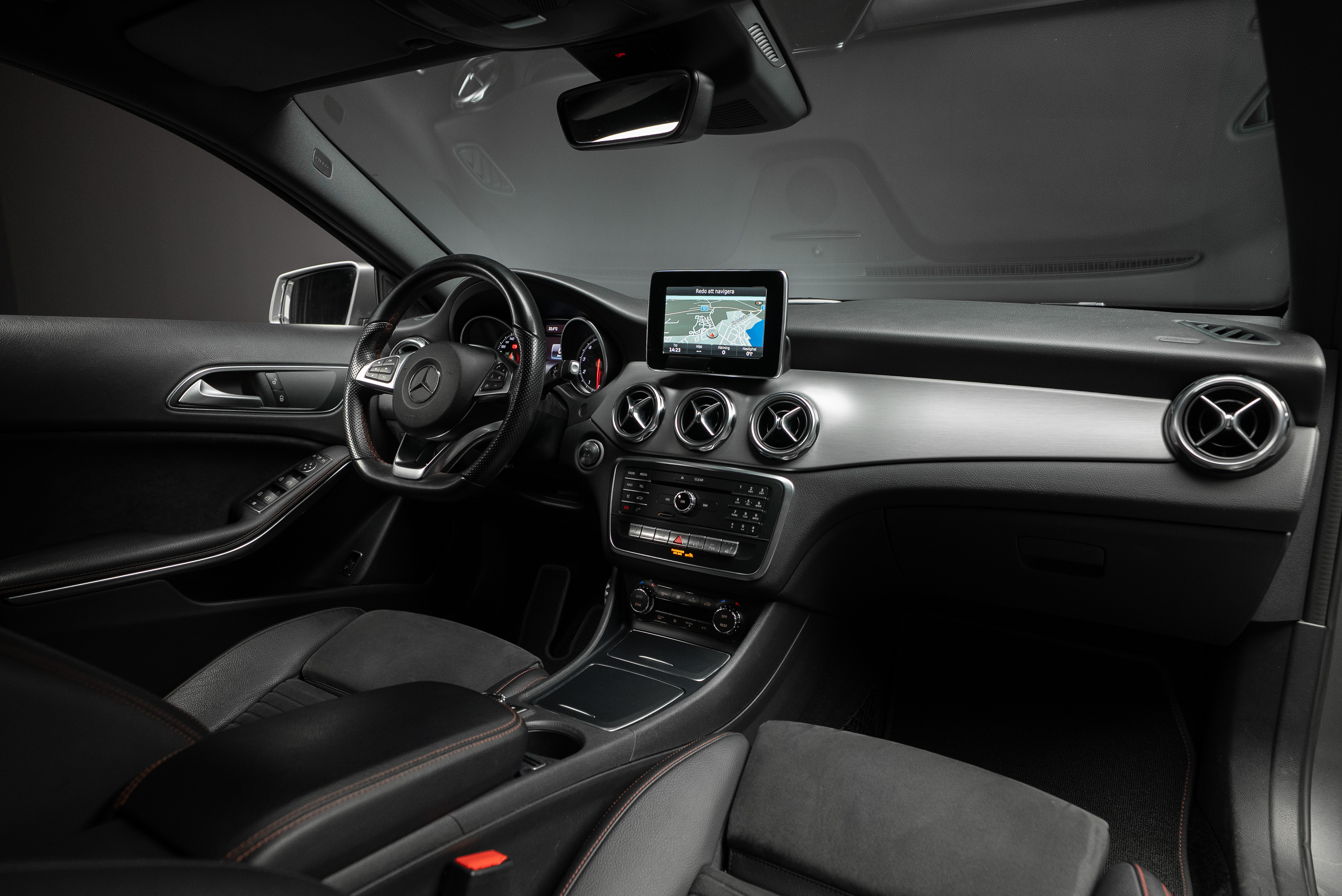 Mercedes-Benz GLA 200 Automat med AMG-paket. Bergsgrå Metallic med svart Artico delläderklädsel. Interiöra aluminiumpaneler med längsgående slipning.
