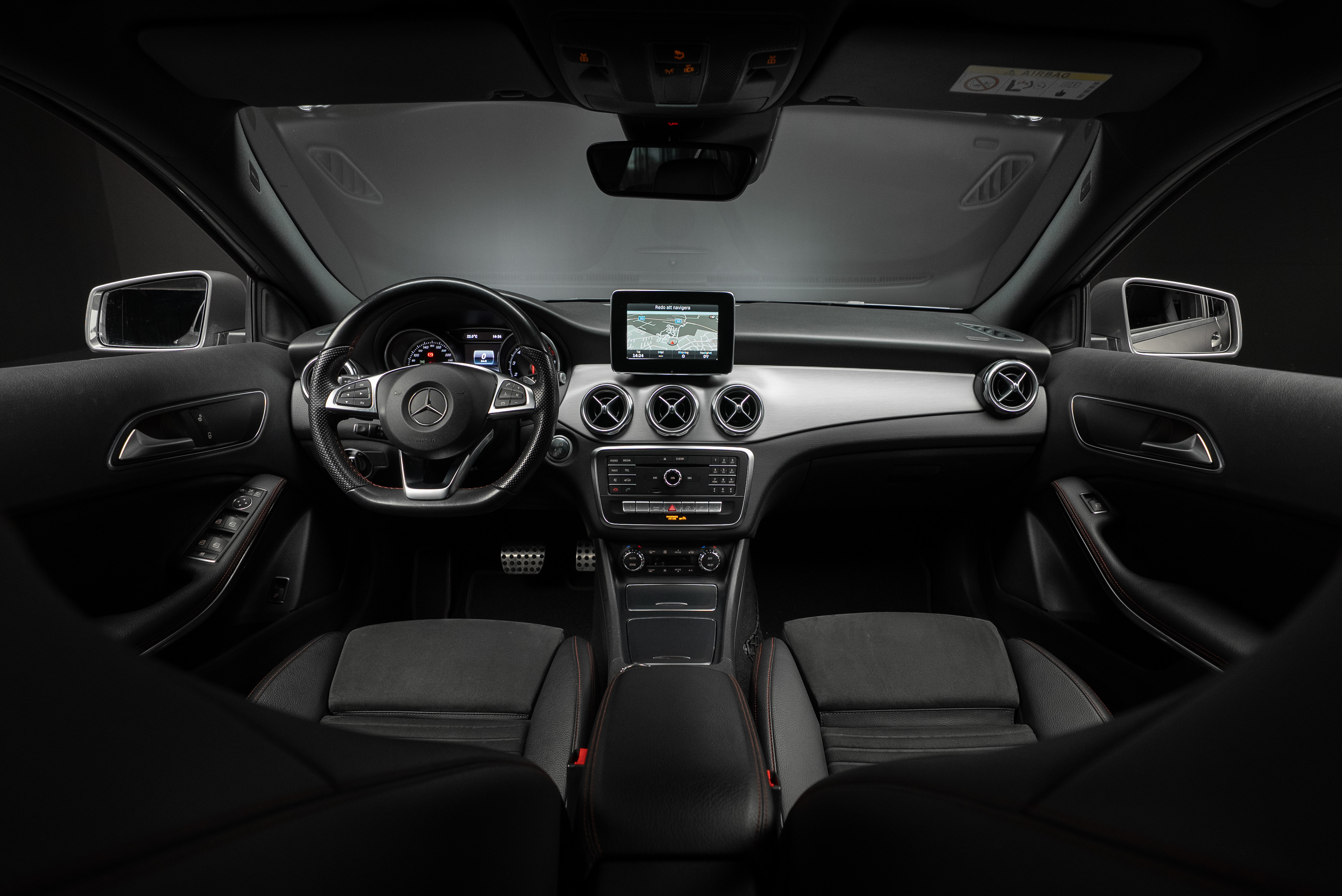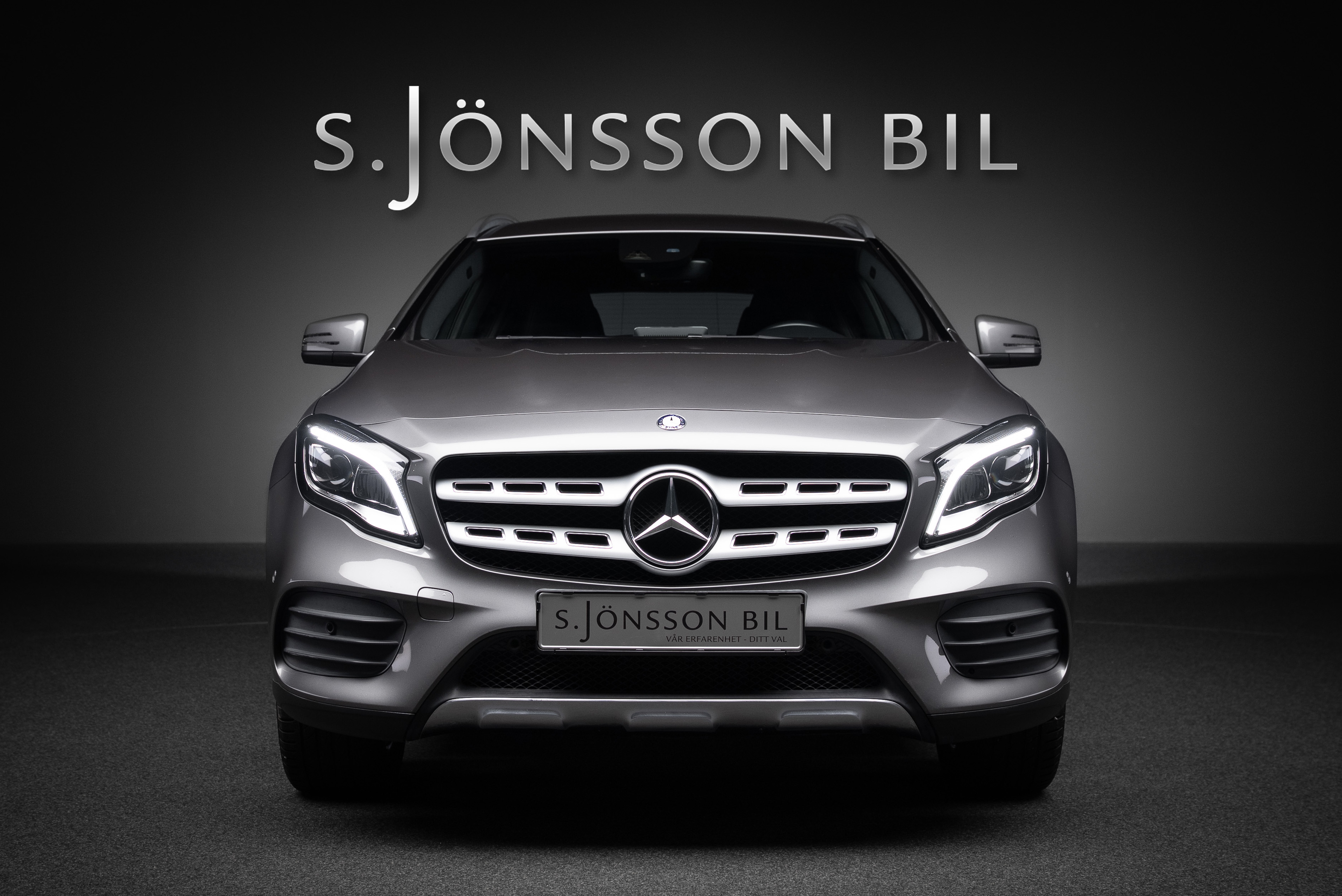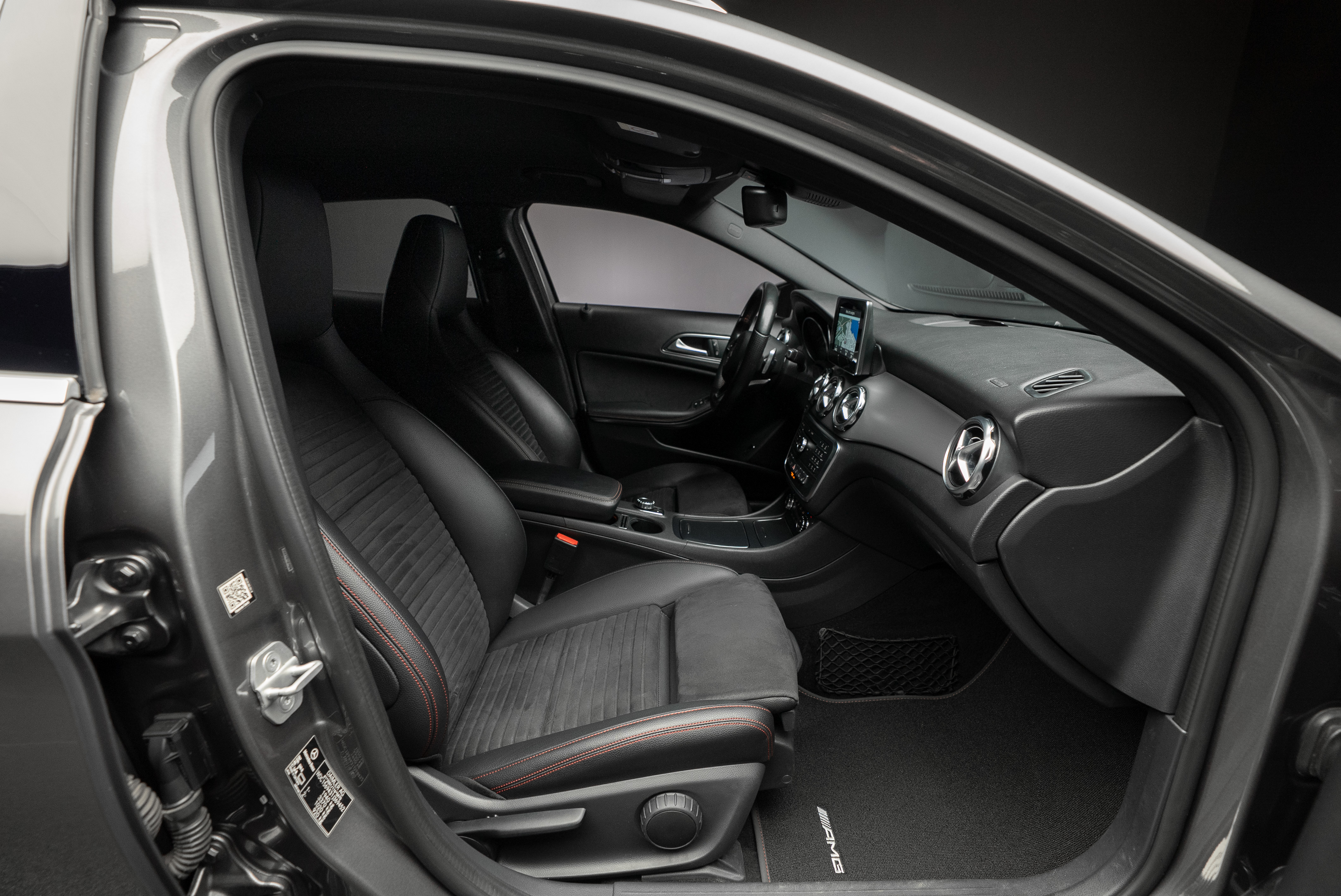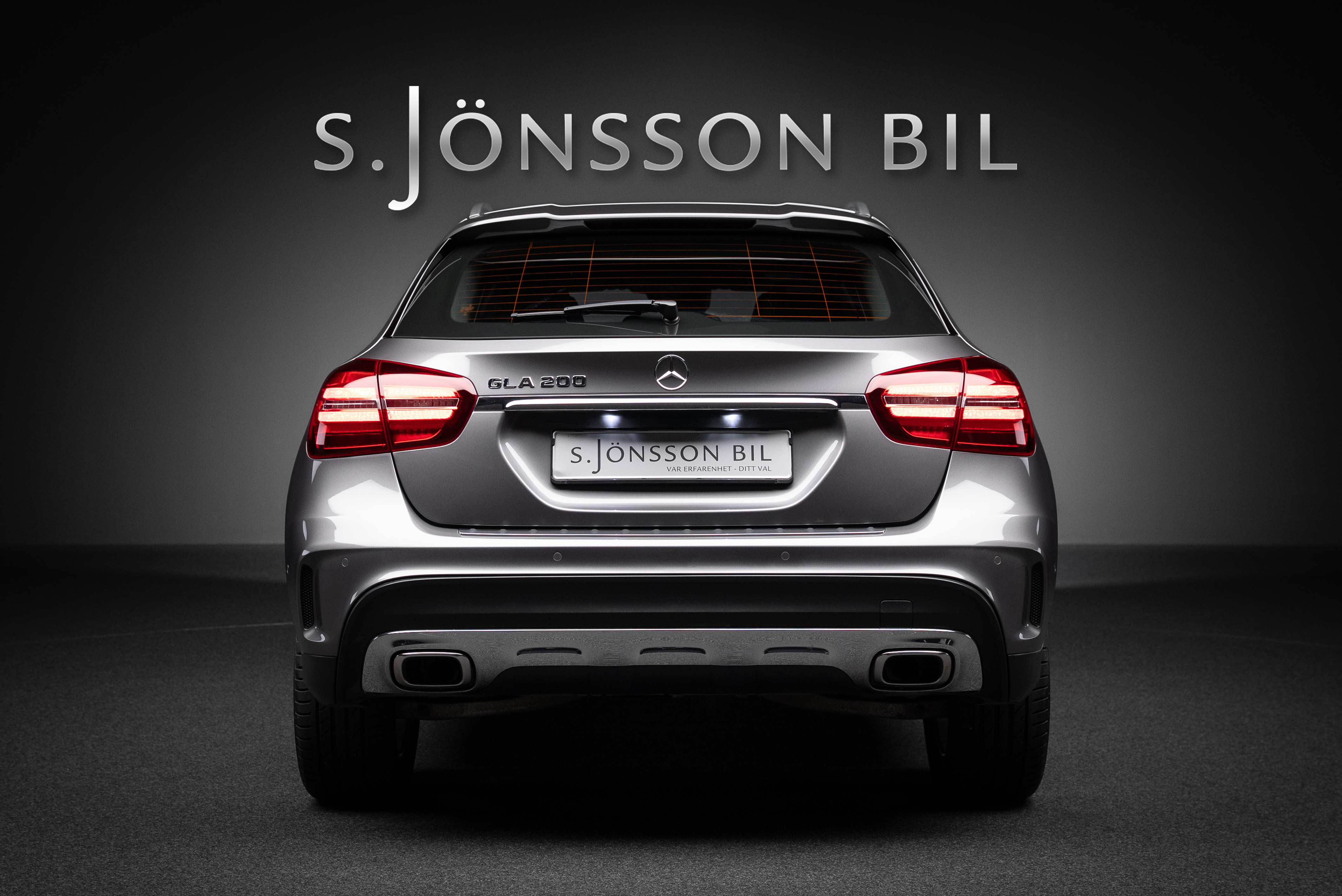 Mercedes-Benz GLA 200 Automat med AMG-paket. Bergsgrå Metallic med svart Artico delläderklädsel. Interiöra aluminiumpaneler med längsgående slipning.