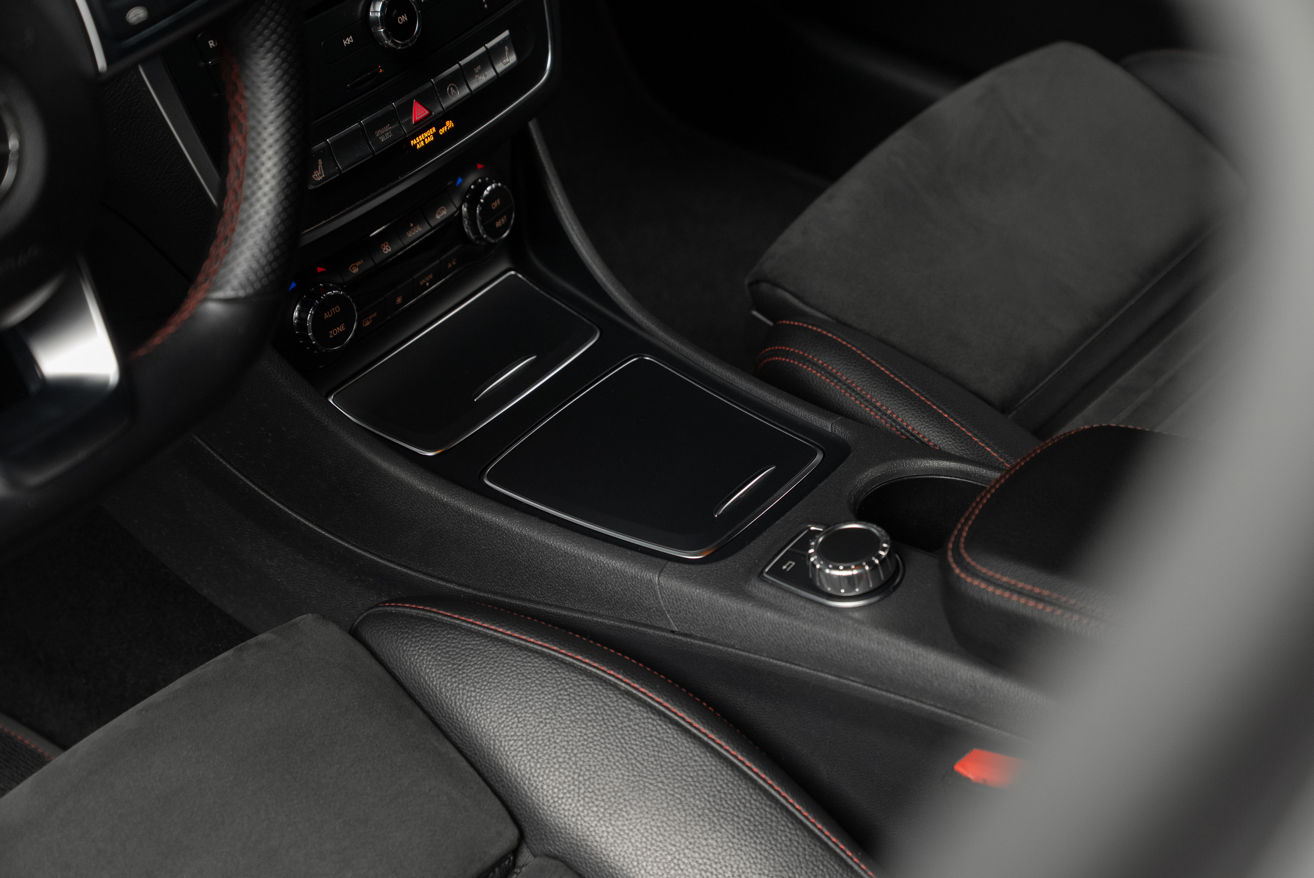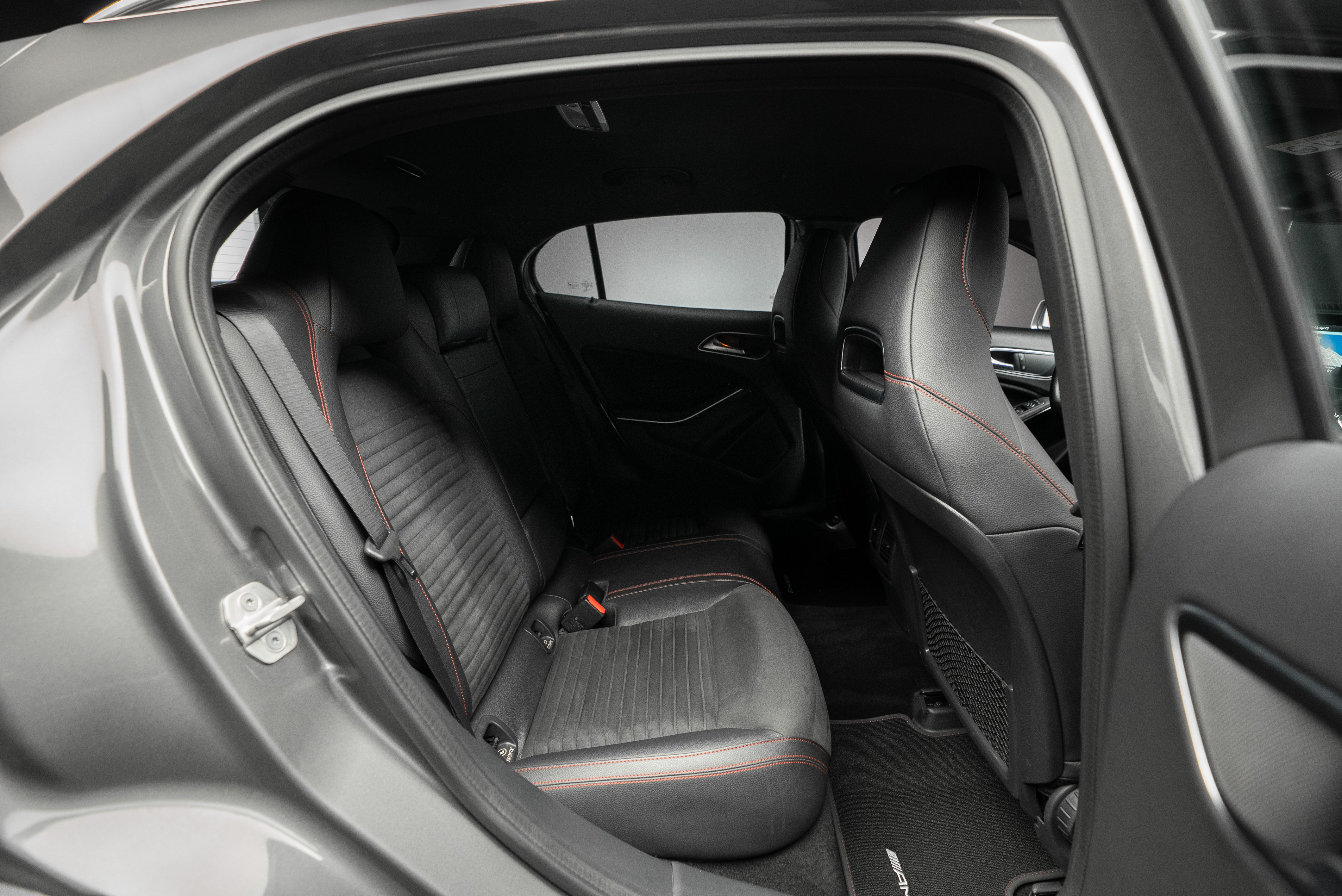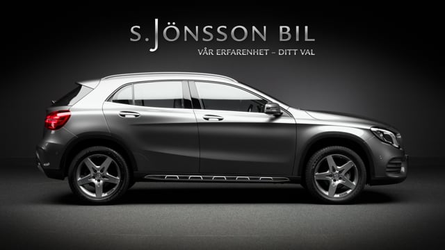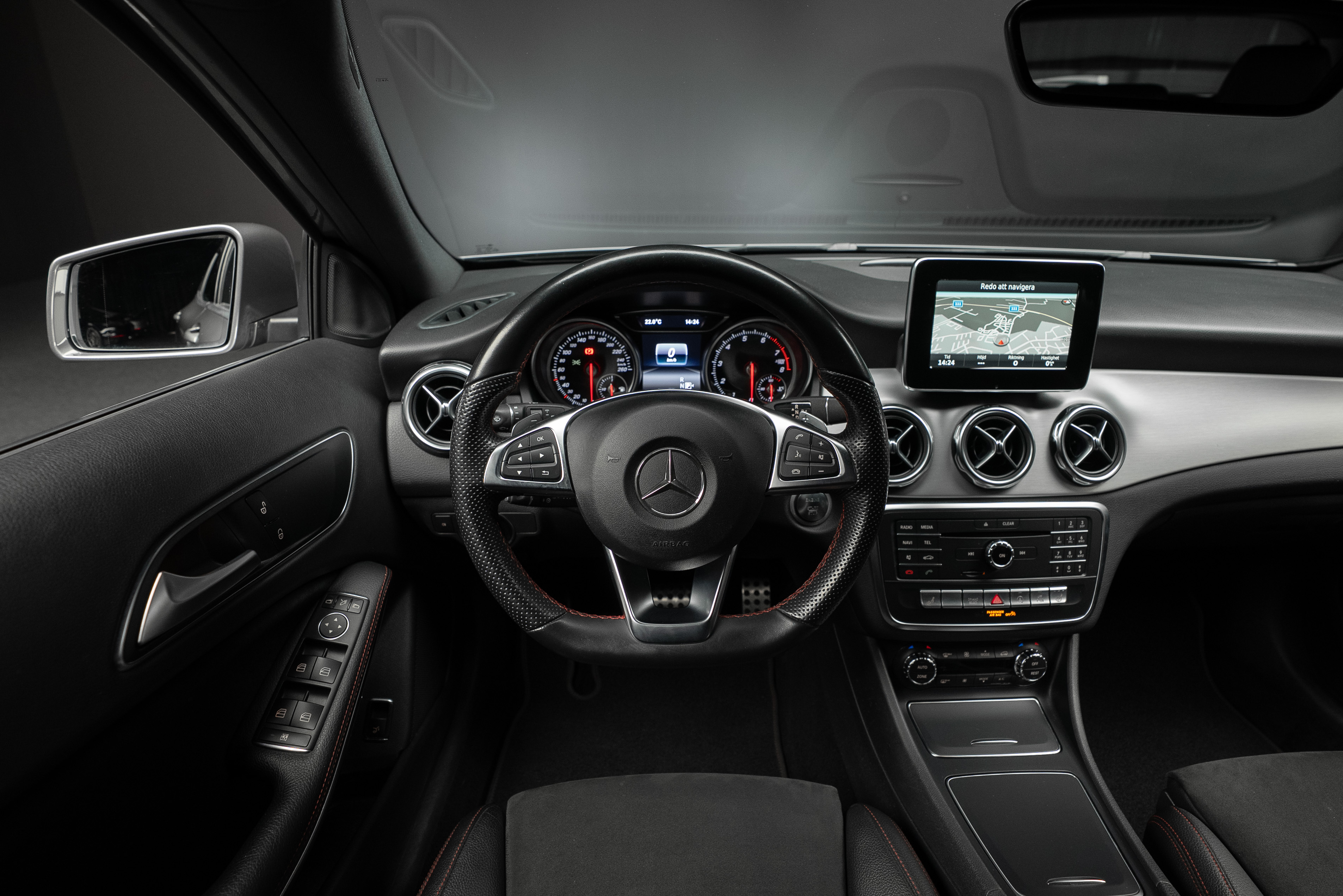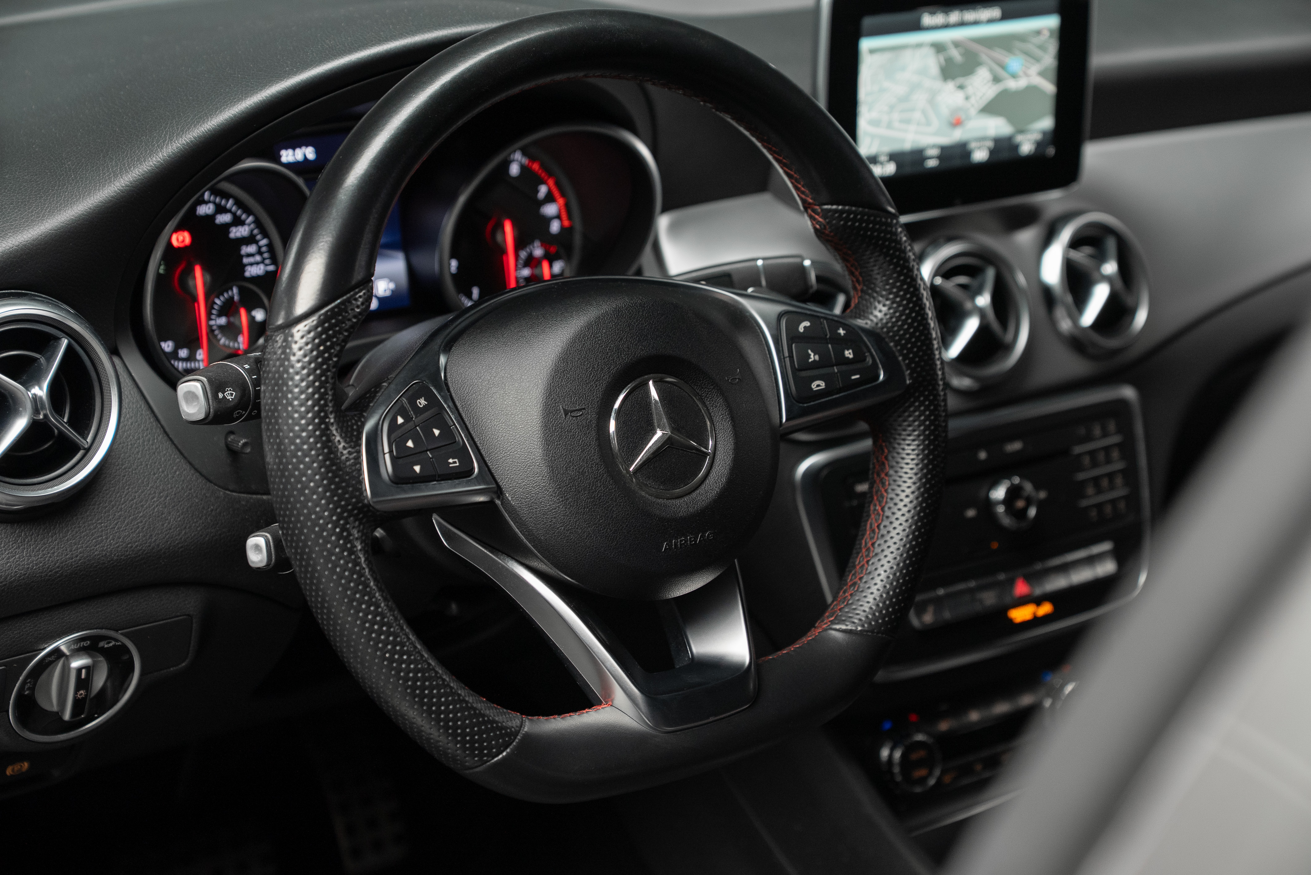Mercedes-Benz GLA 200 Automat med AMG-paket. Bergsgrå Metallic med svart Artico delläderklädsel. Interiöra aluminiumpaneler med längsgående slipning.