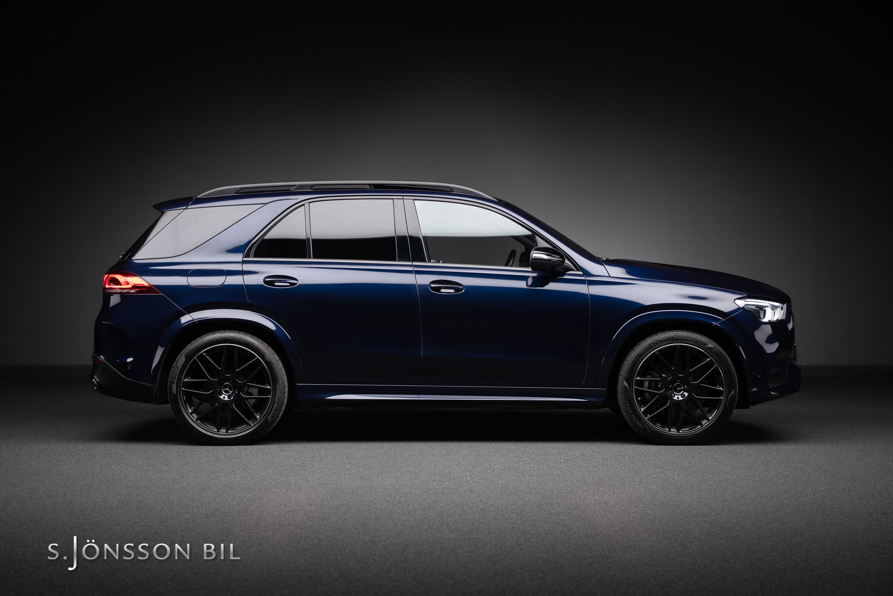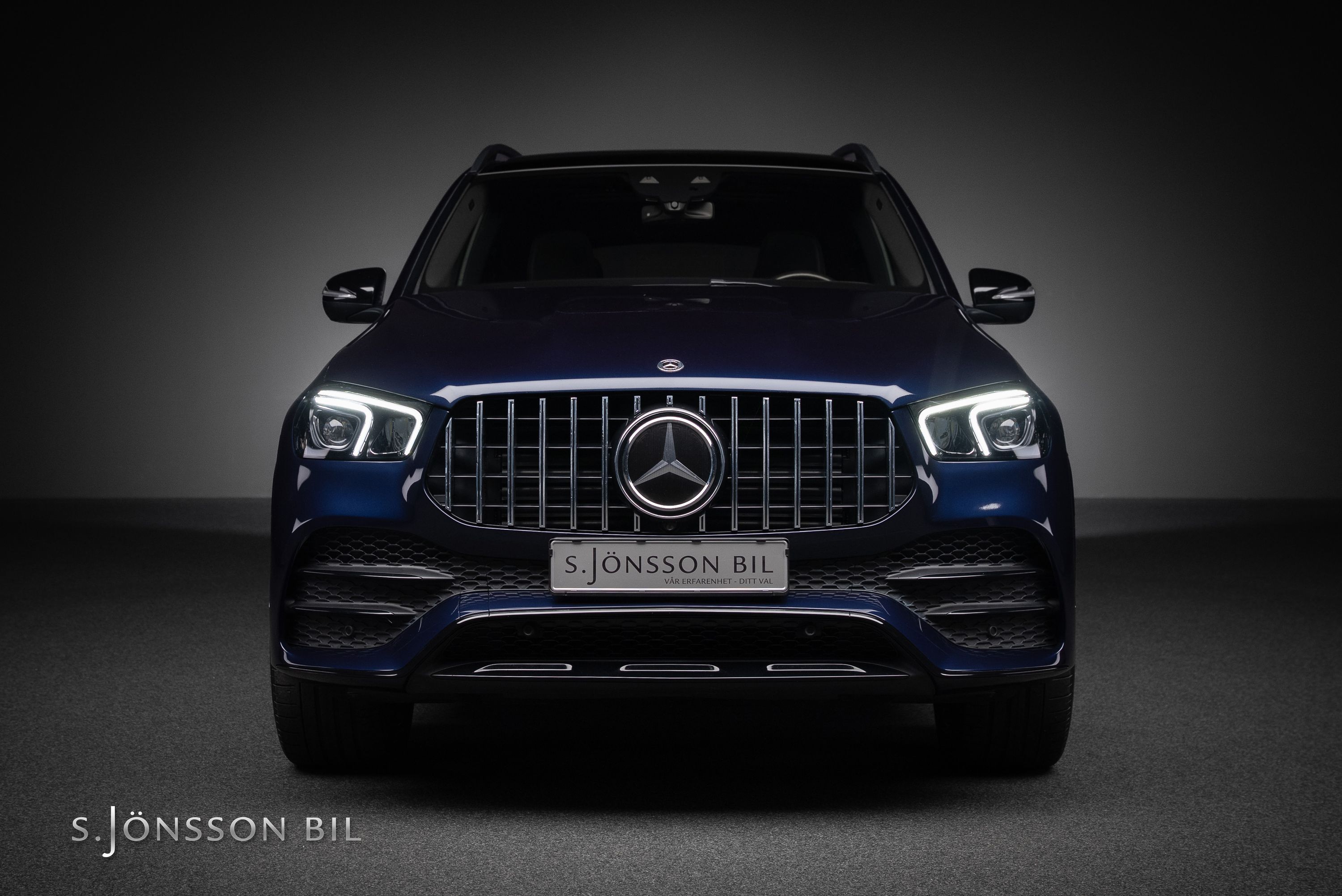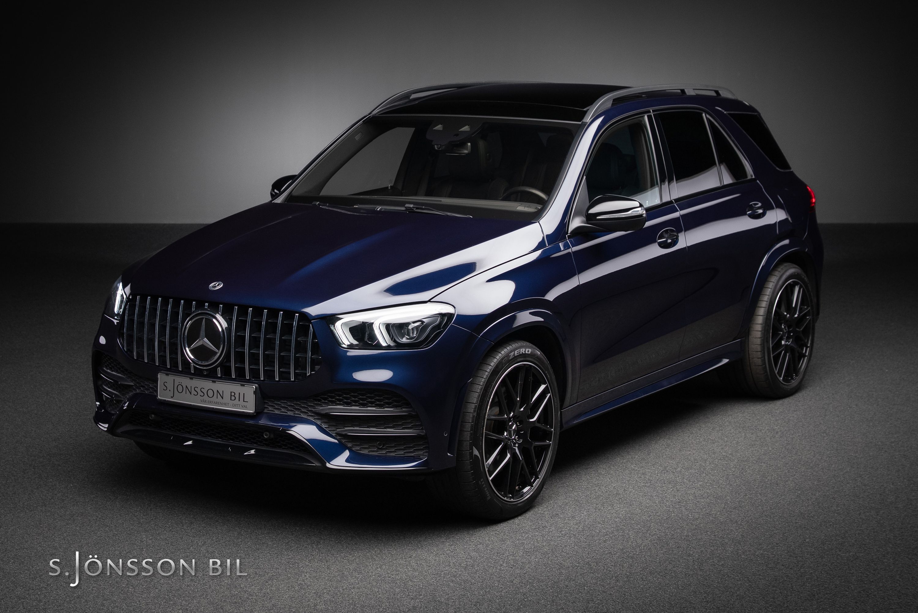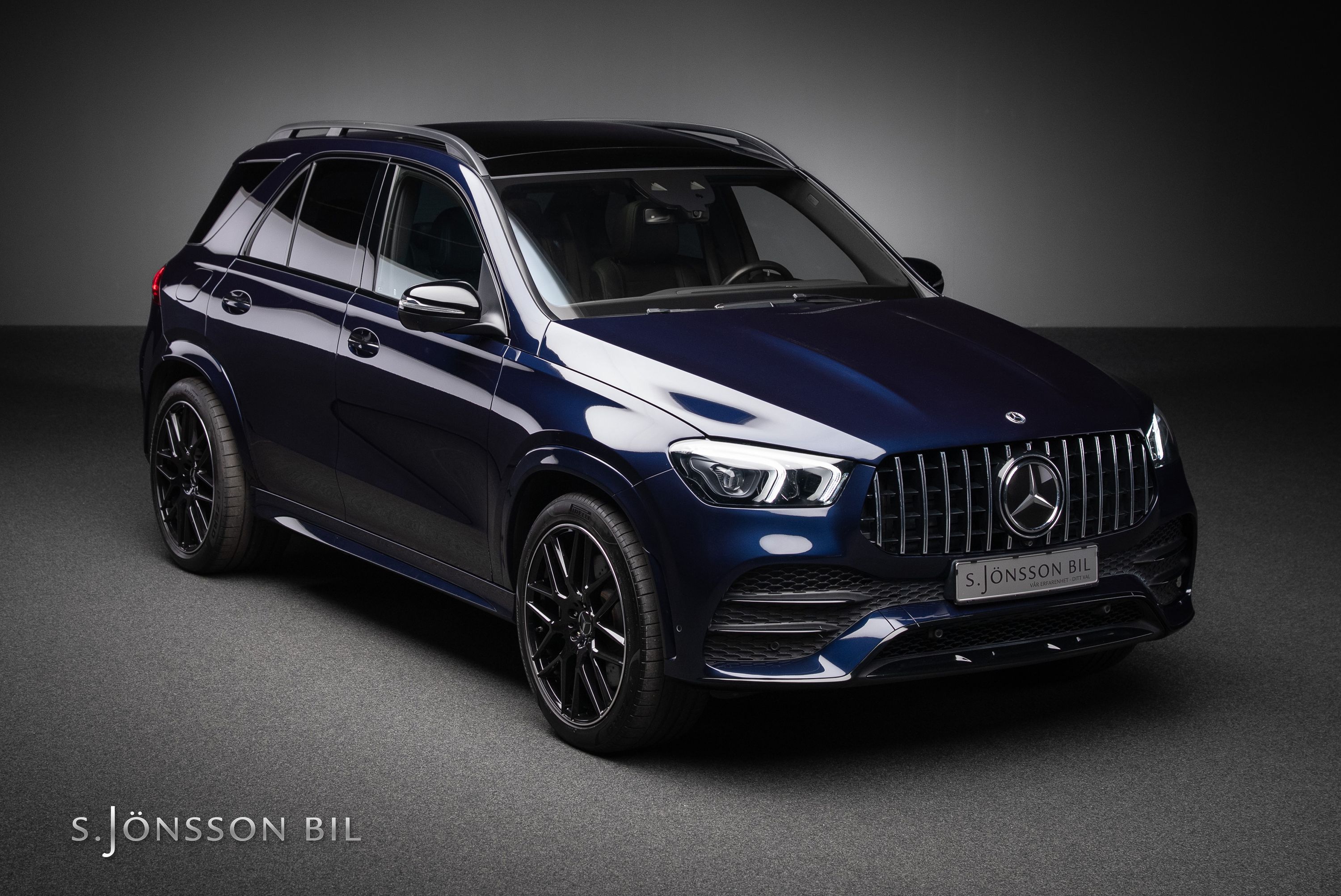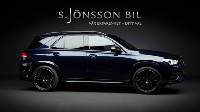 Mercedes-Benz GLE 350 de AMG 4MATIC laddhybrid. Denna bil är lackerad kulören Cavansitblå metallic kombinerat med ARTICO och DINAMICA vilket gör sig fint med de svarta detaljerna på bilen. I utrustningslistan hittar vi bland annat luftfjädring vilket gör denna GLE väldigt skön att åka i, både de längre sträckorna men även de kortare. På el så kommer man 85 km enligt WLTP (98 km vid stadskörning) med hjälp av batteriet på 31,2 kWh.