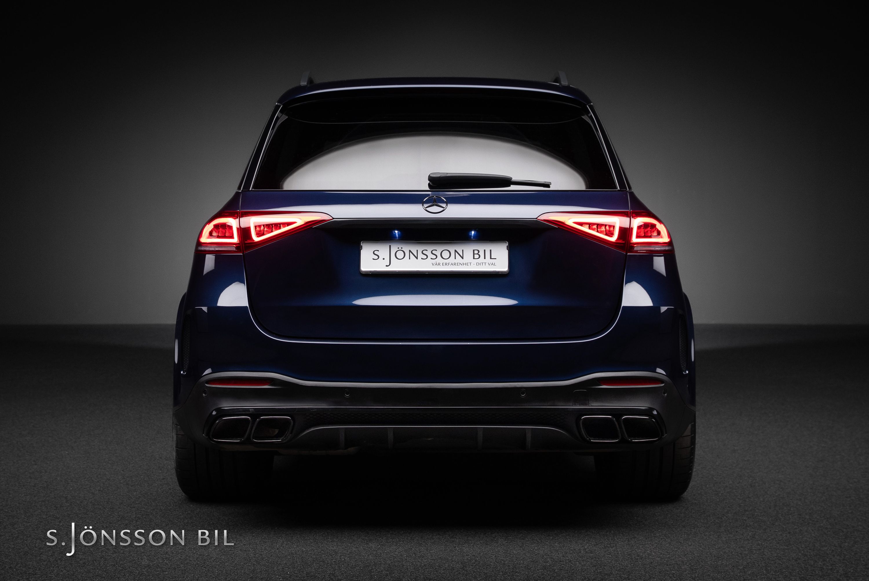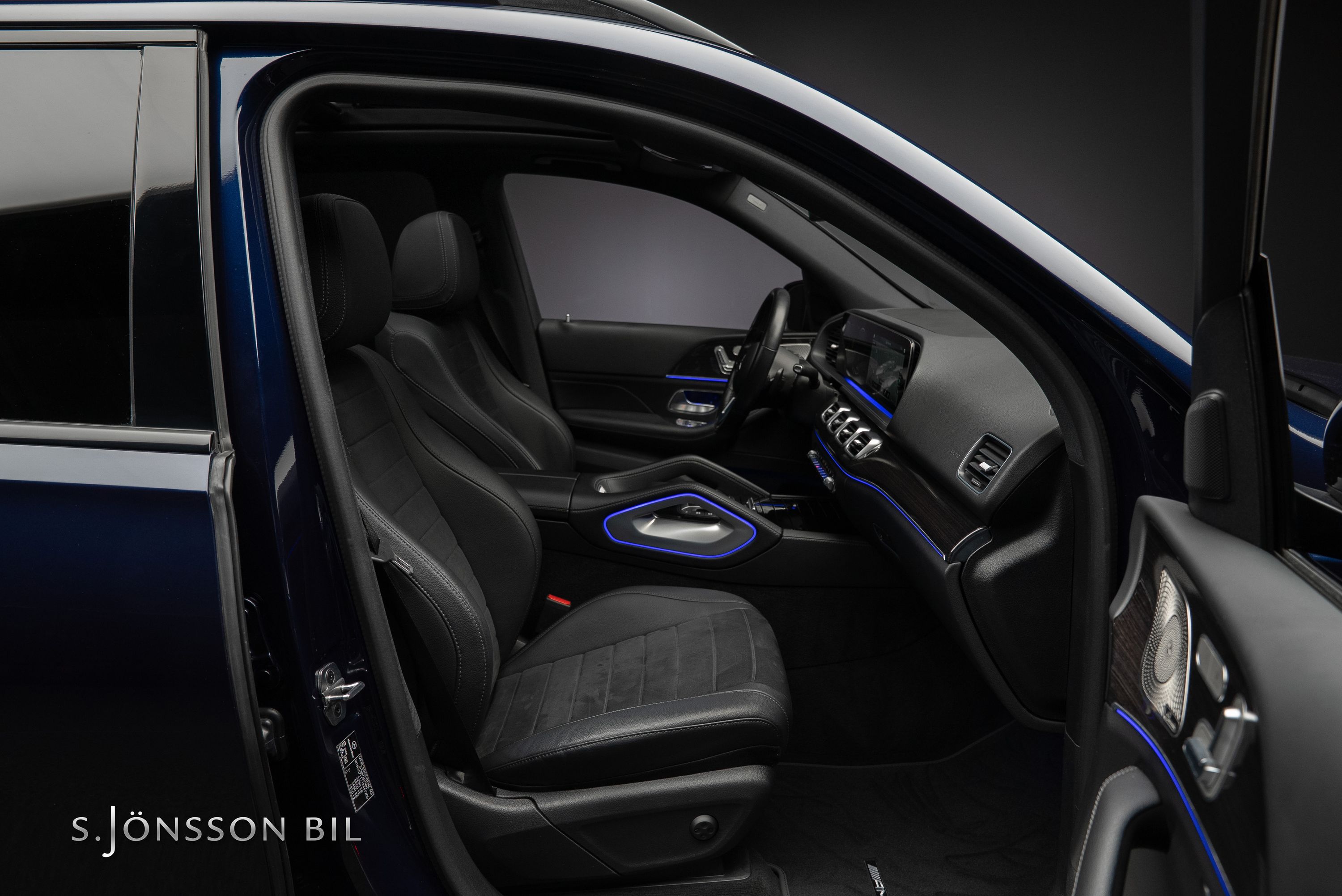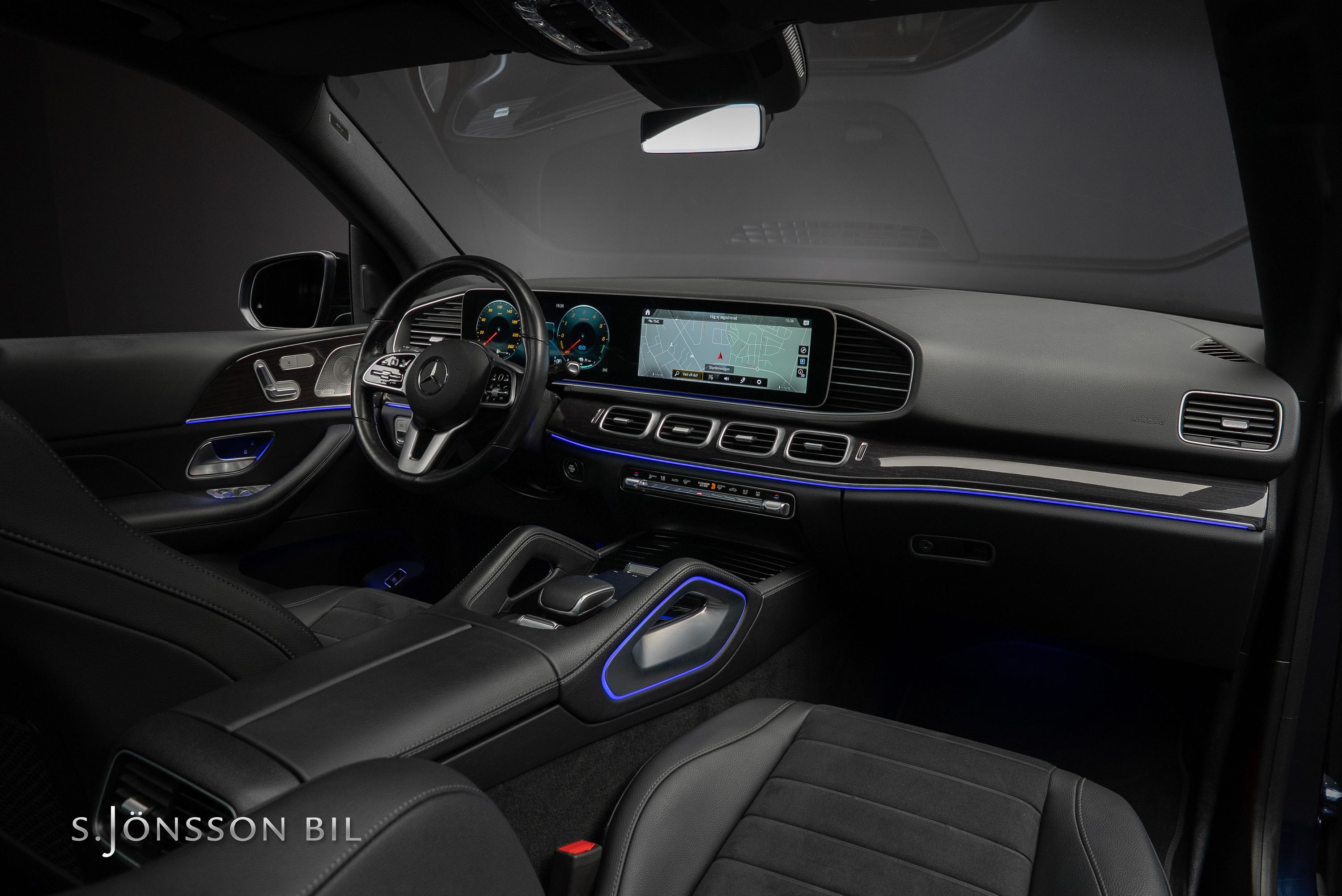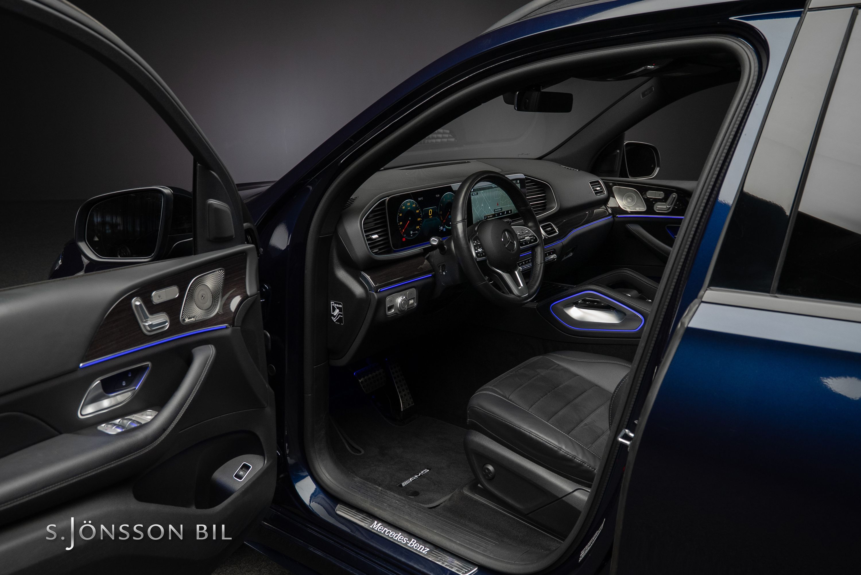Mercedes-Benz GLE 350 de AMG 4MATIC laddhybrid. Denna bil är lackerad kulören Cavansitblå metallic kombinerat med ARTICO och DINAMICA vilket gör sig fint med de svarta detaljerna på bilen. I utrustningslistan hittar vi bland annat luftfjädring vilket gör denna GLE väldigt skön att åka i, både de längre sträckorna men även de kortare. På el så kommer man 85 km enligt WLTP (98 km vid stadskörning) med hjälp av batteriet på 31,2 kWh.