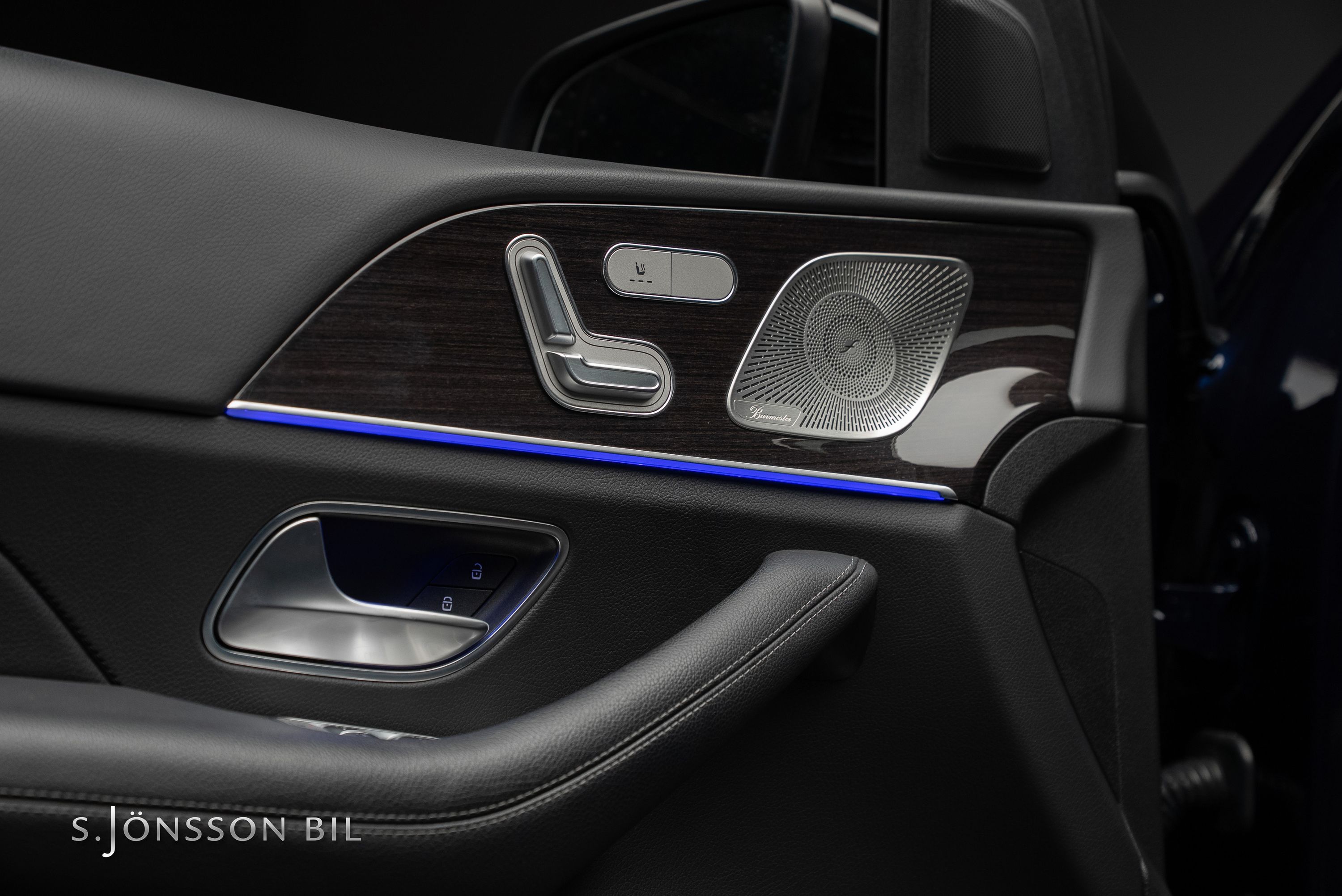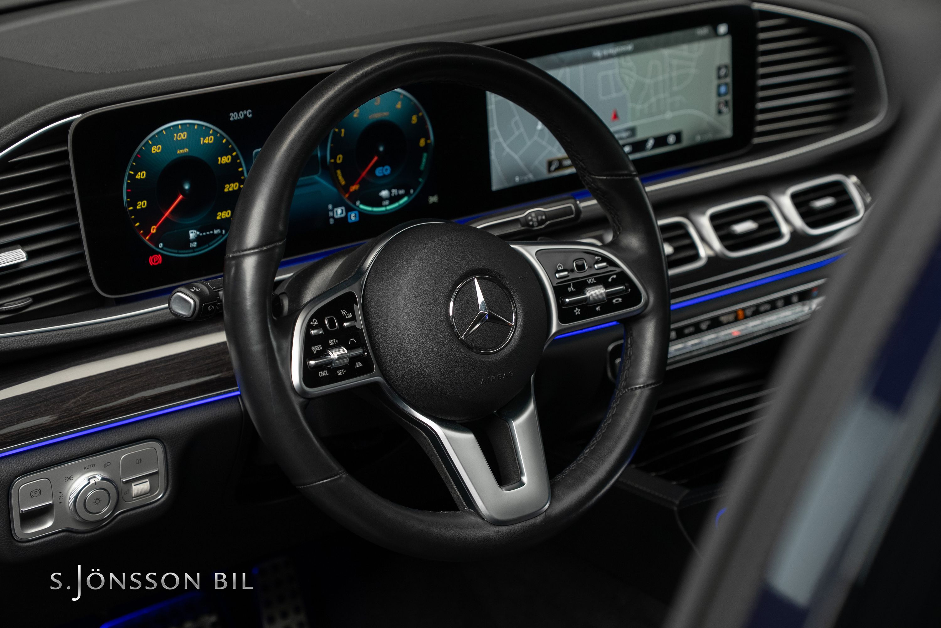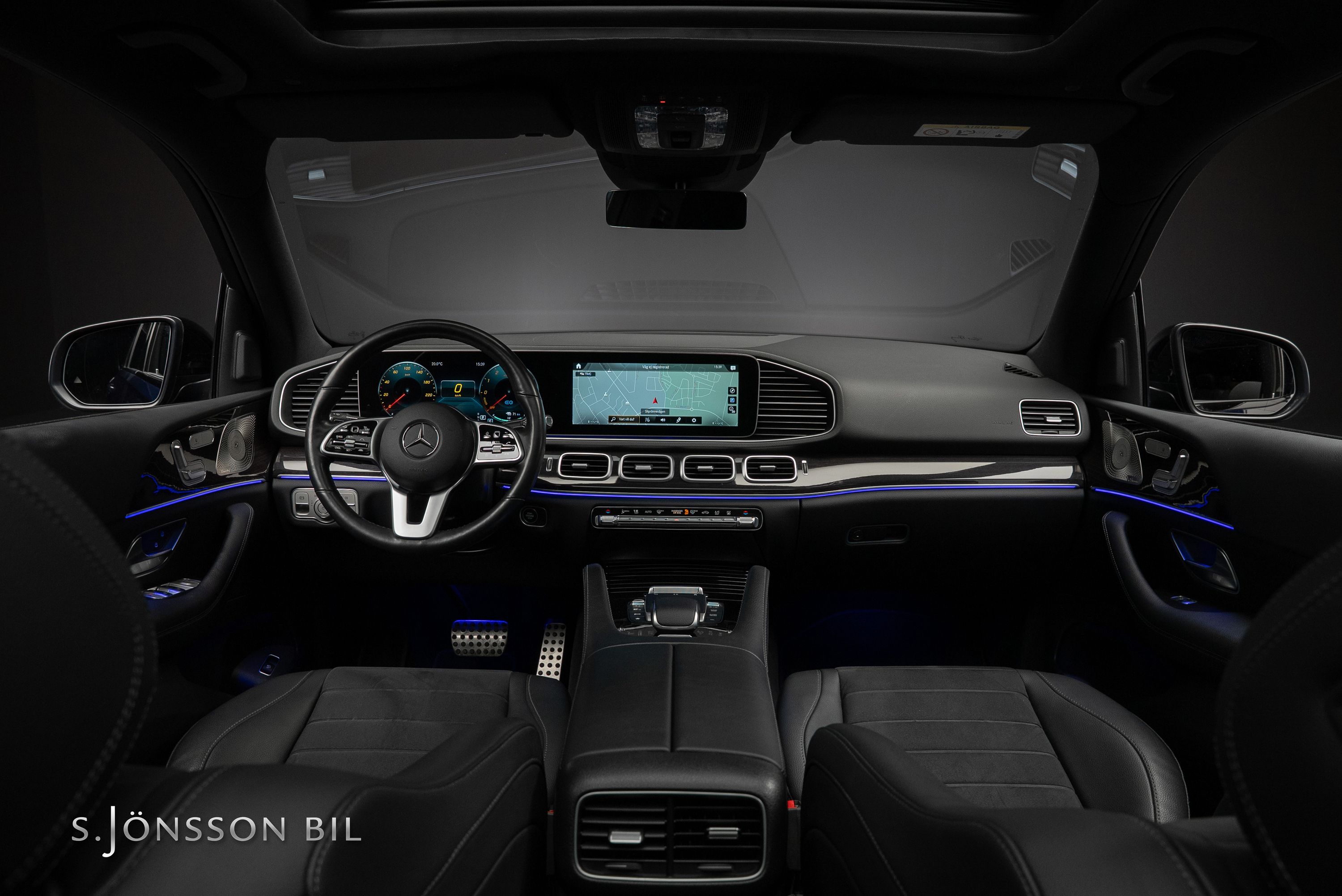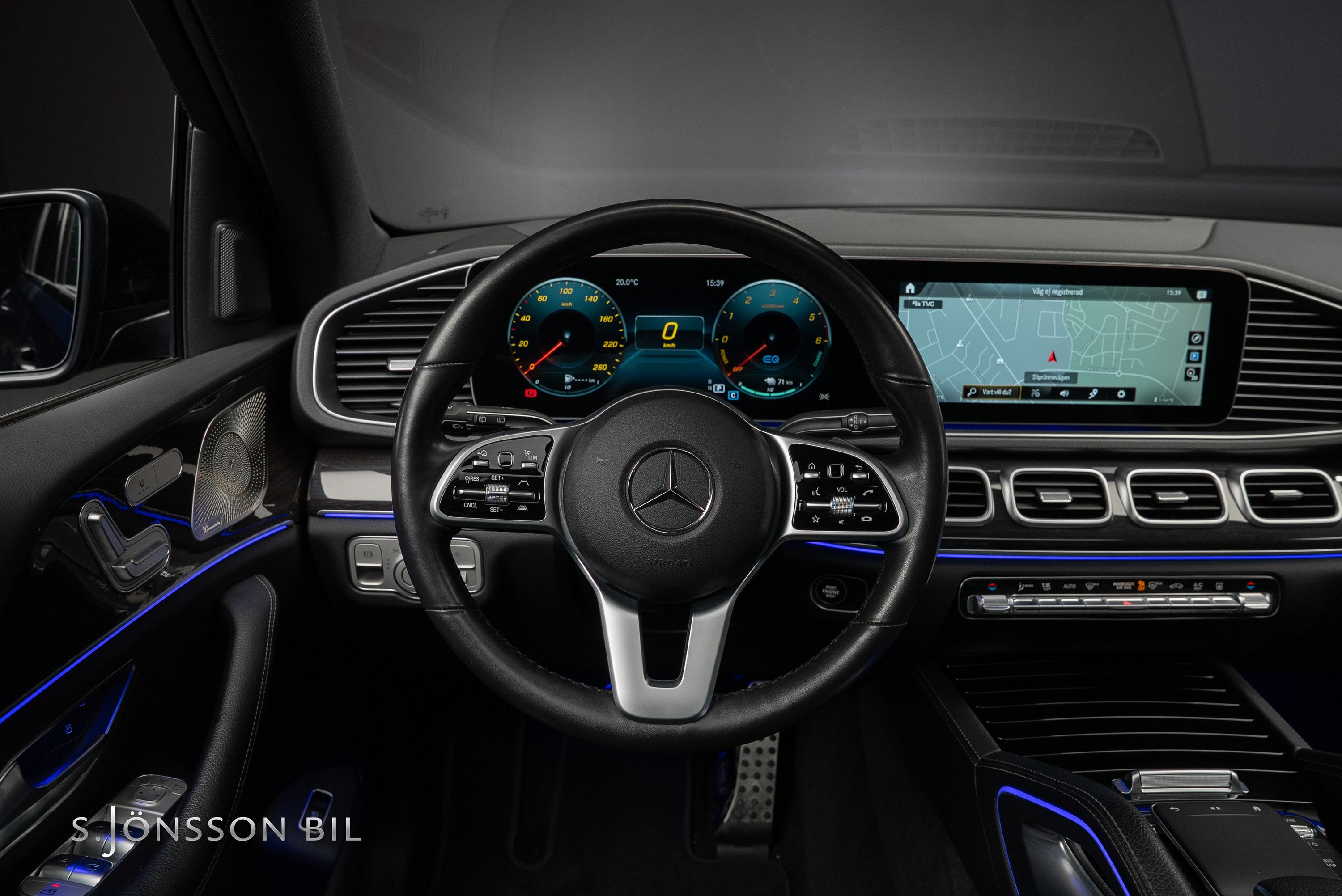 Mercedes-Benz GLE 350 de AMG 4MATIC laddhybrid. Denna bil är lackerad kulören Cavansitblå metallic kombinerat med ARTICO och DINAMICA vilket gör sig fint med de svarta detaljerna på bilen. I utrustningslistan hittar vi bland annat luftfjädring vilket gör denna GLE väldigt skön att åka i, både de längre sträckorna men även de kortare. På el så kommer man 85 km enligt WLTP (98 km vid stadskörning) med hjälp av batteriet på 31,2 kWh.