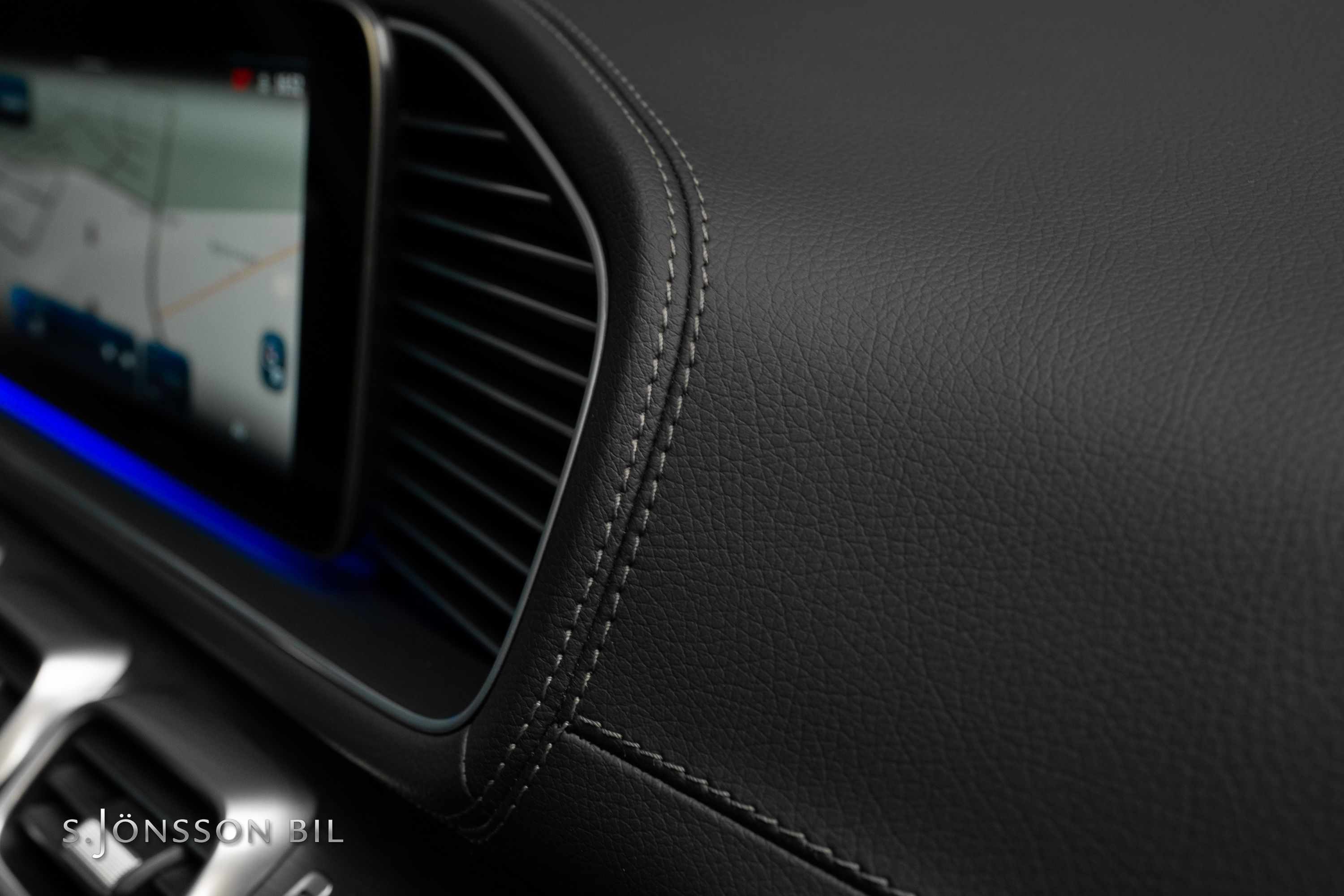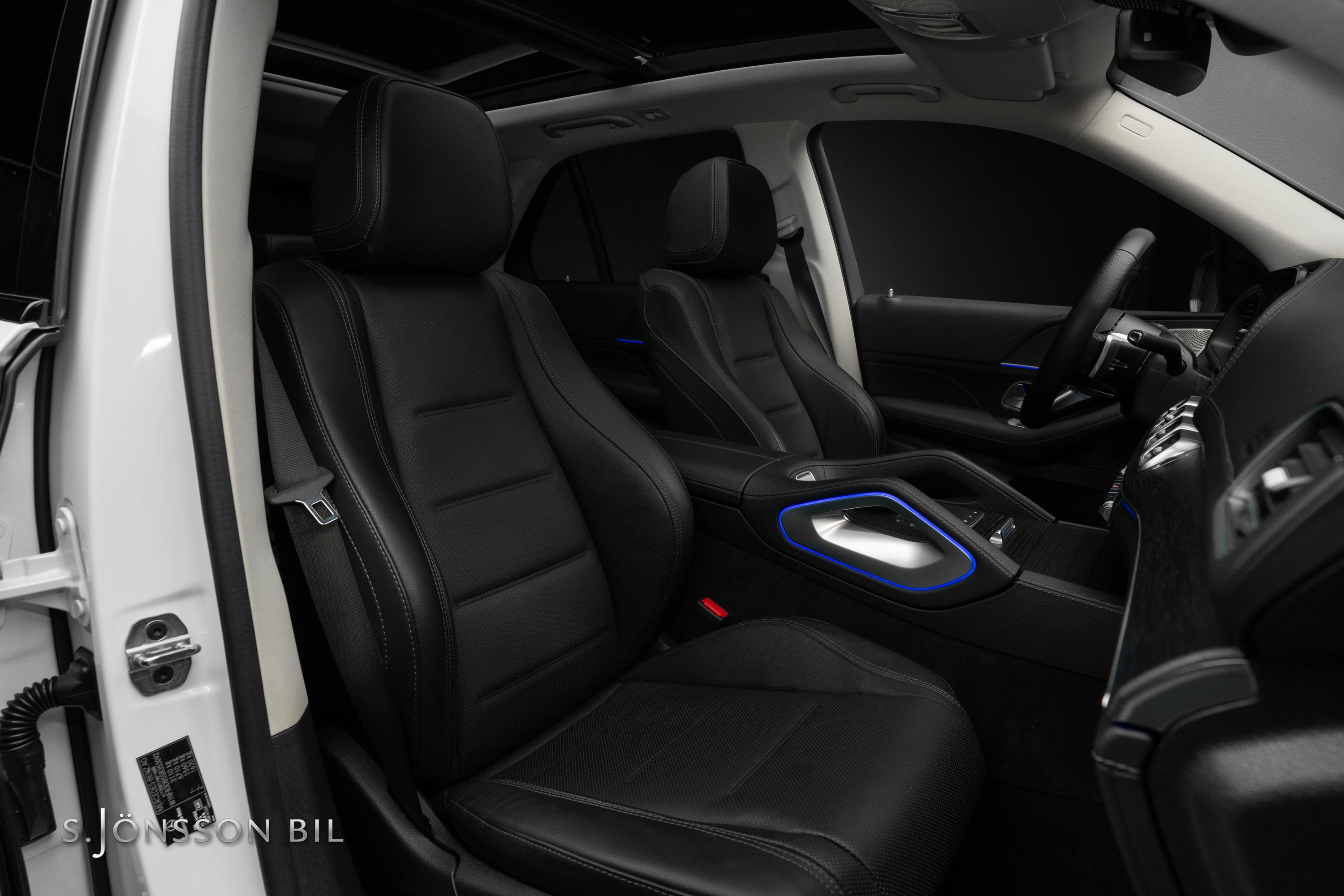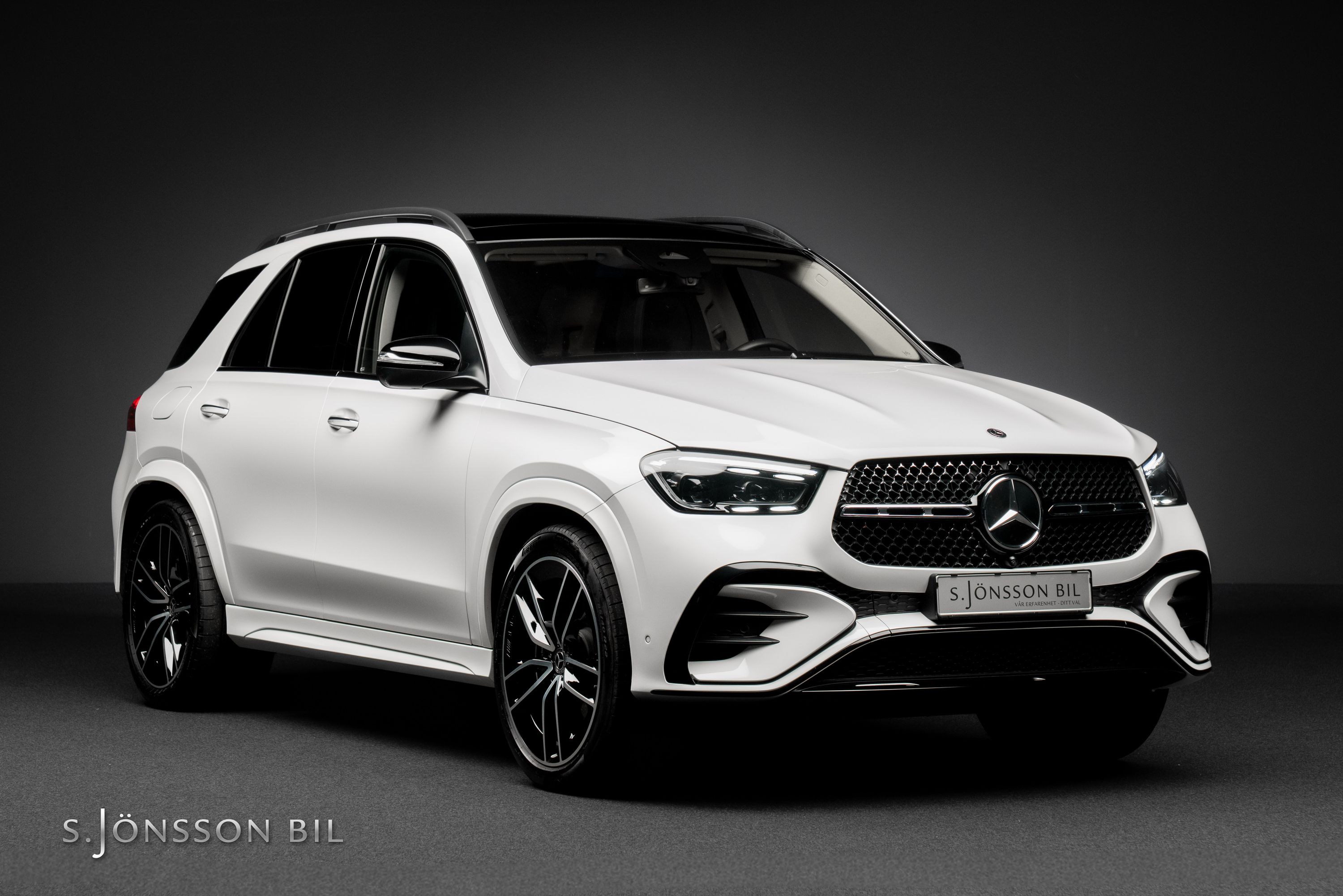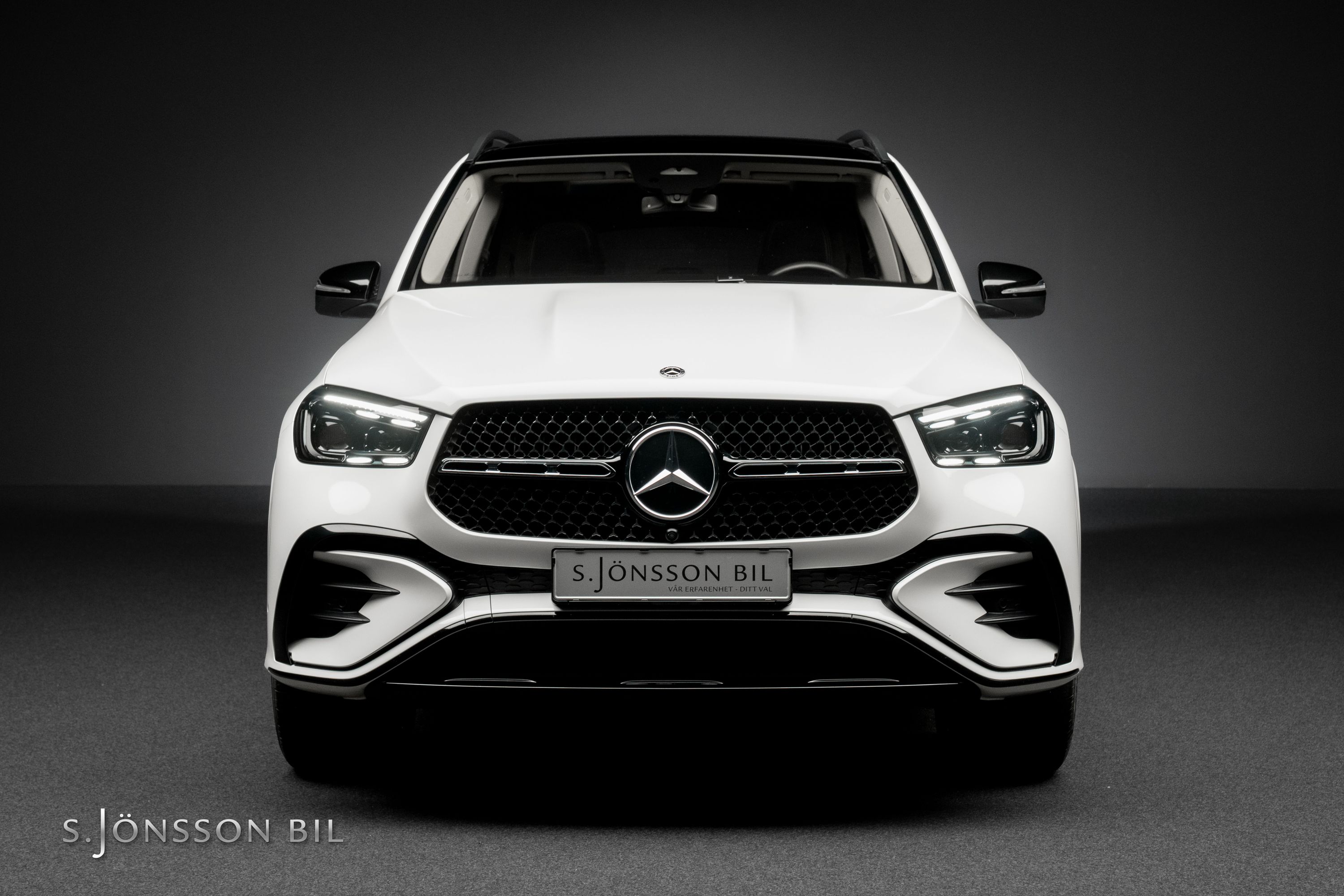 Mercedes-Benz GLE 450 d 4MATIC lackerad i Opalith White metallic. Inredning med svart läder och grå kontrastsömmar.