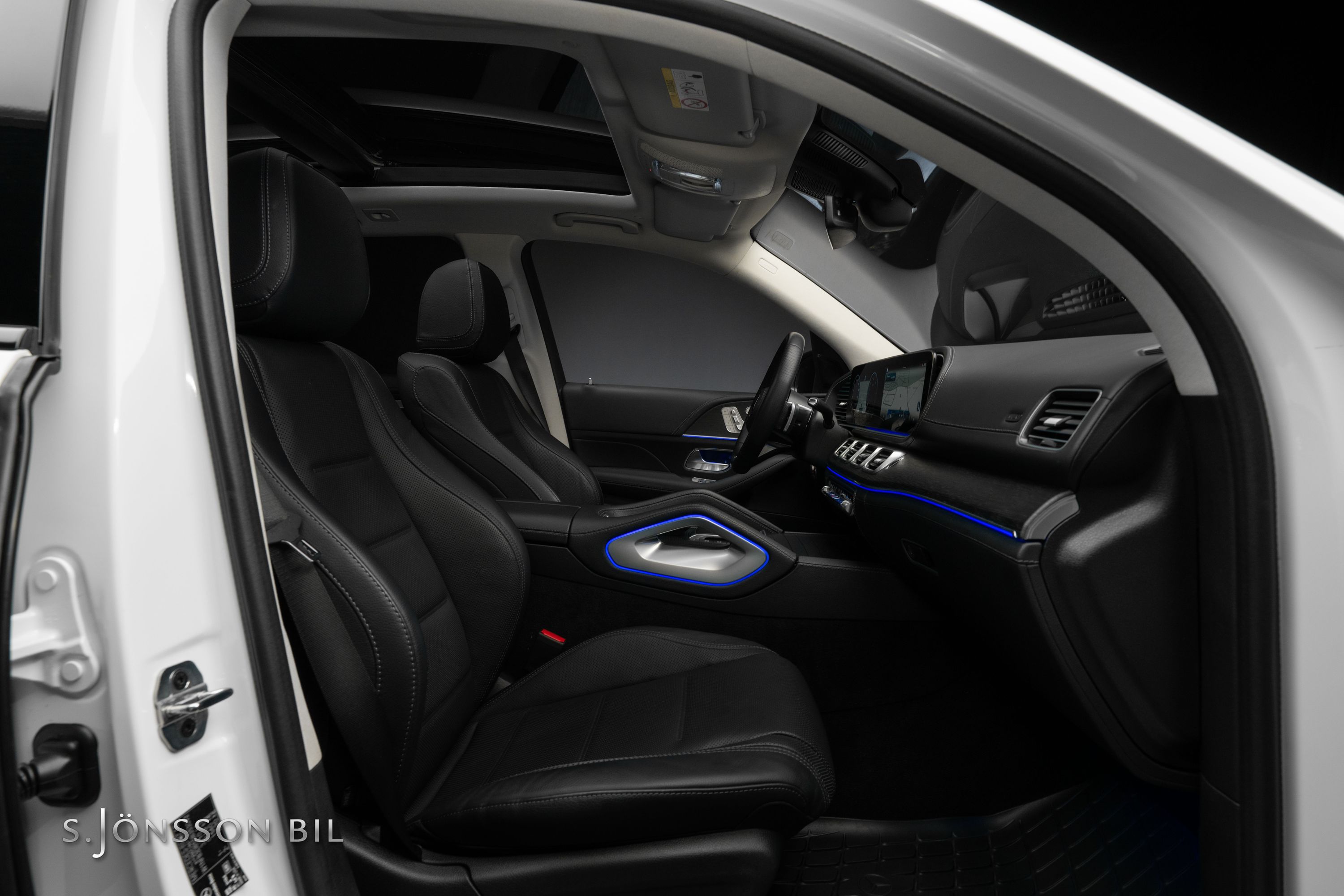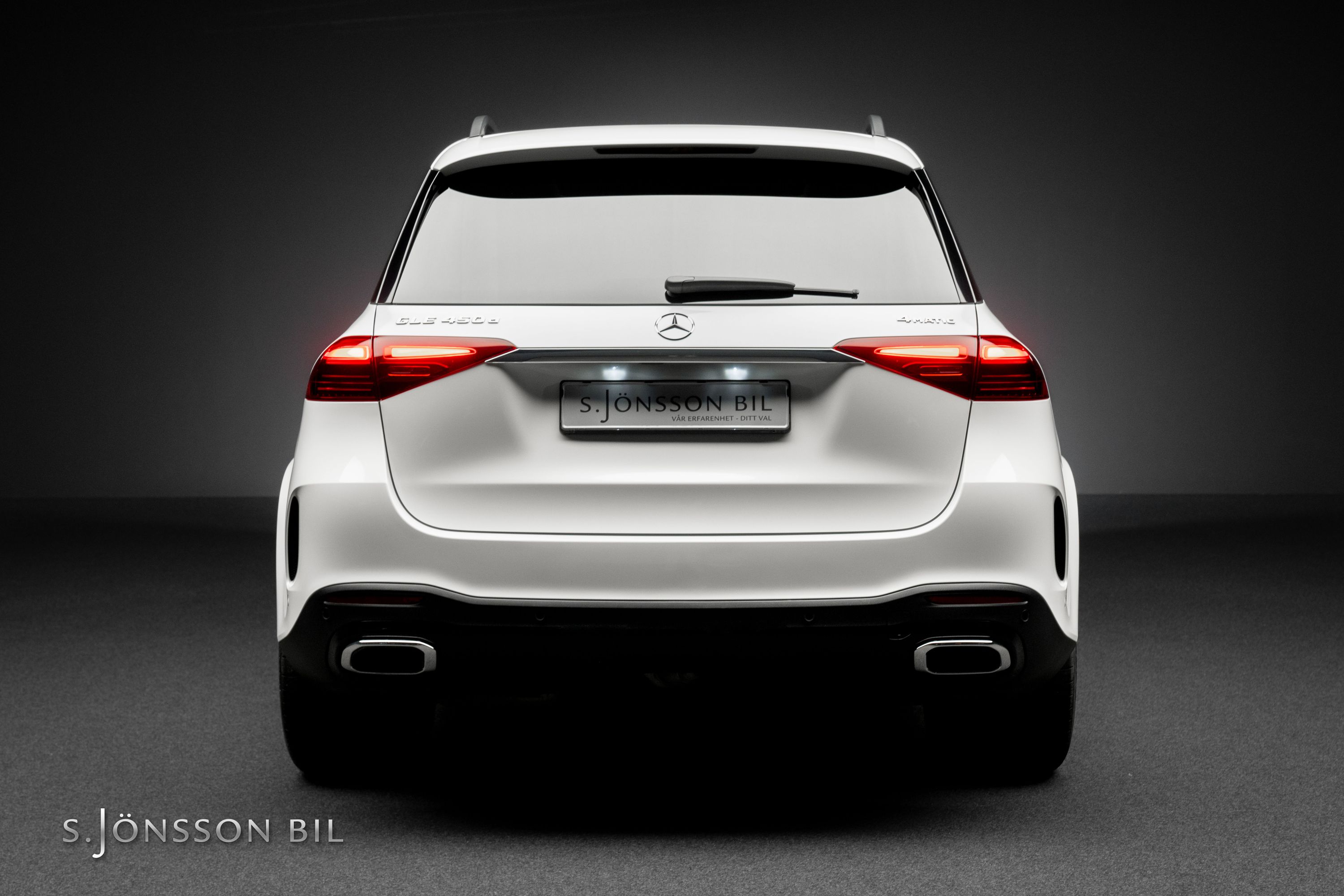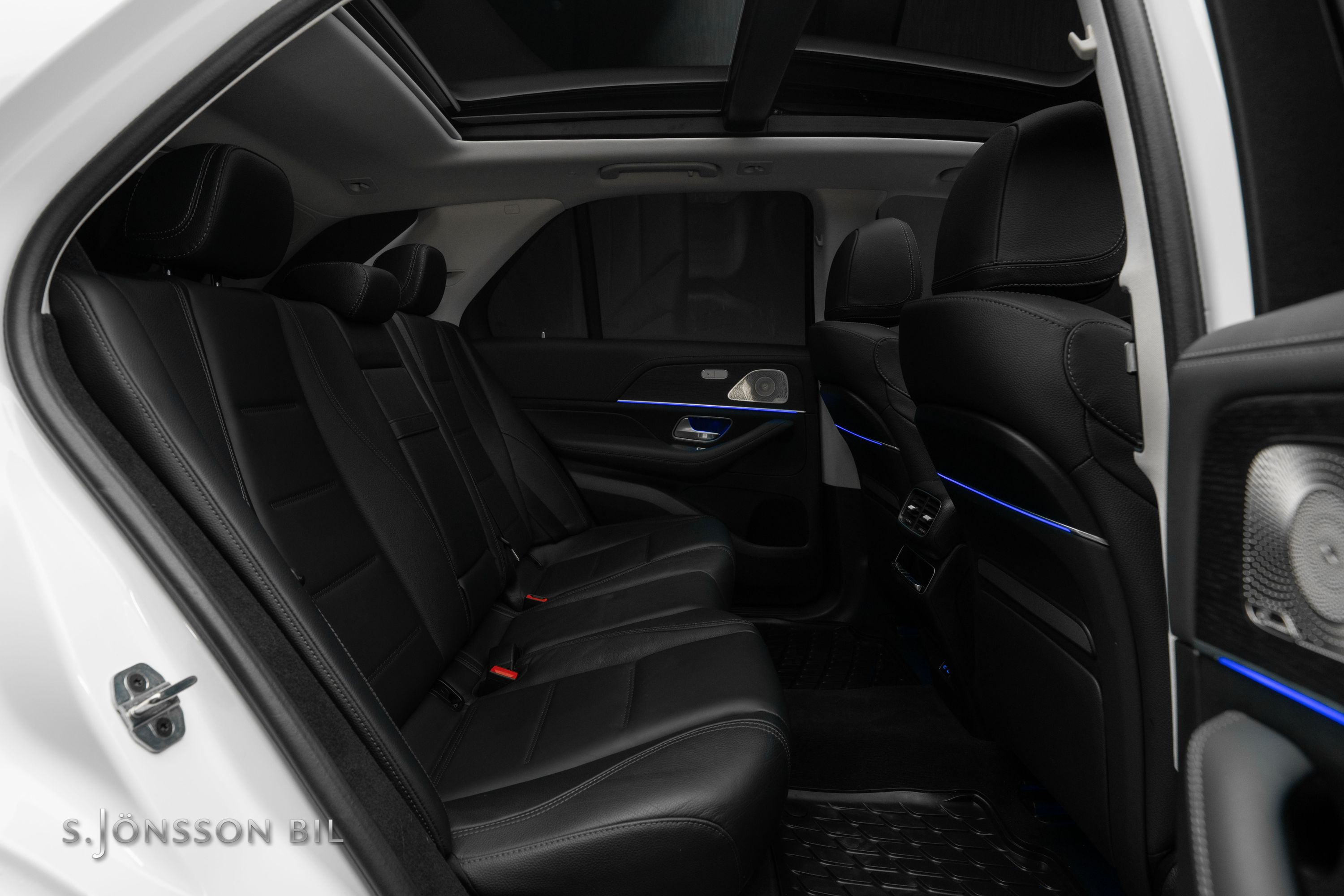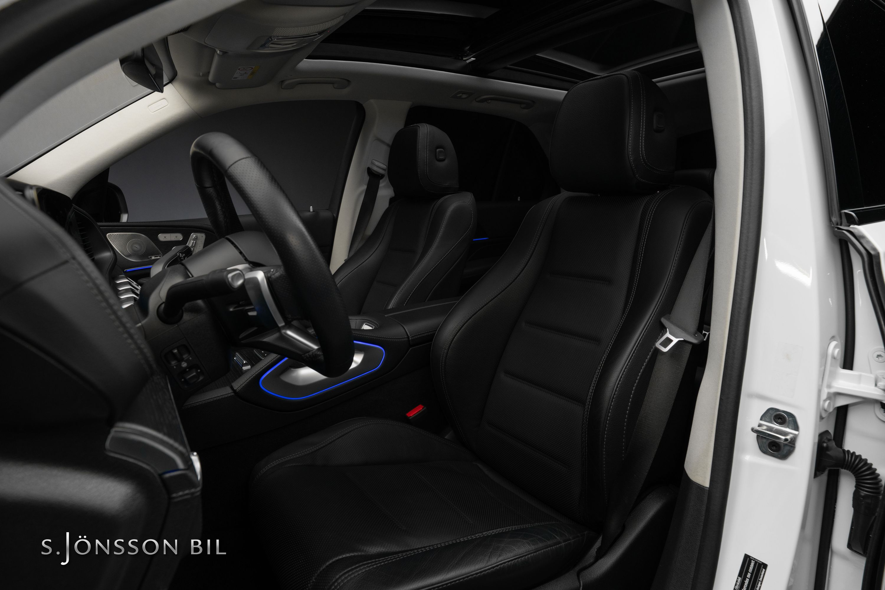 Mercedes-Benz GLE 450 d 4MATIC lackerad i Opalith White metallic. Inredning med svart läder och grå kontrastsömmar.