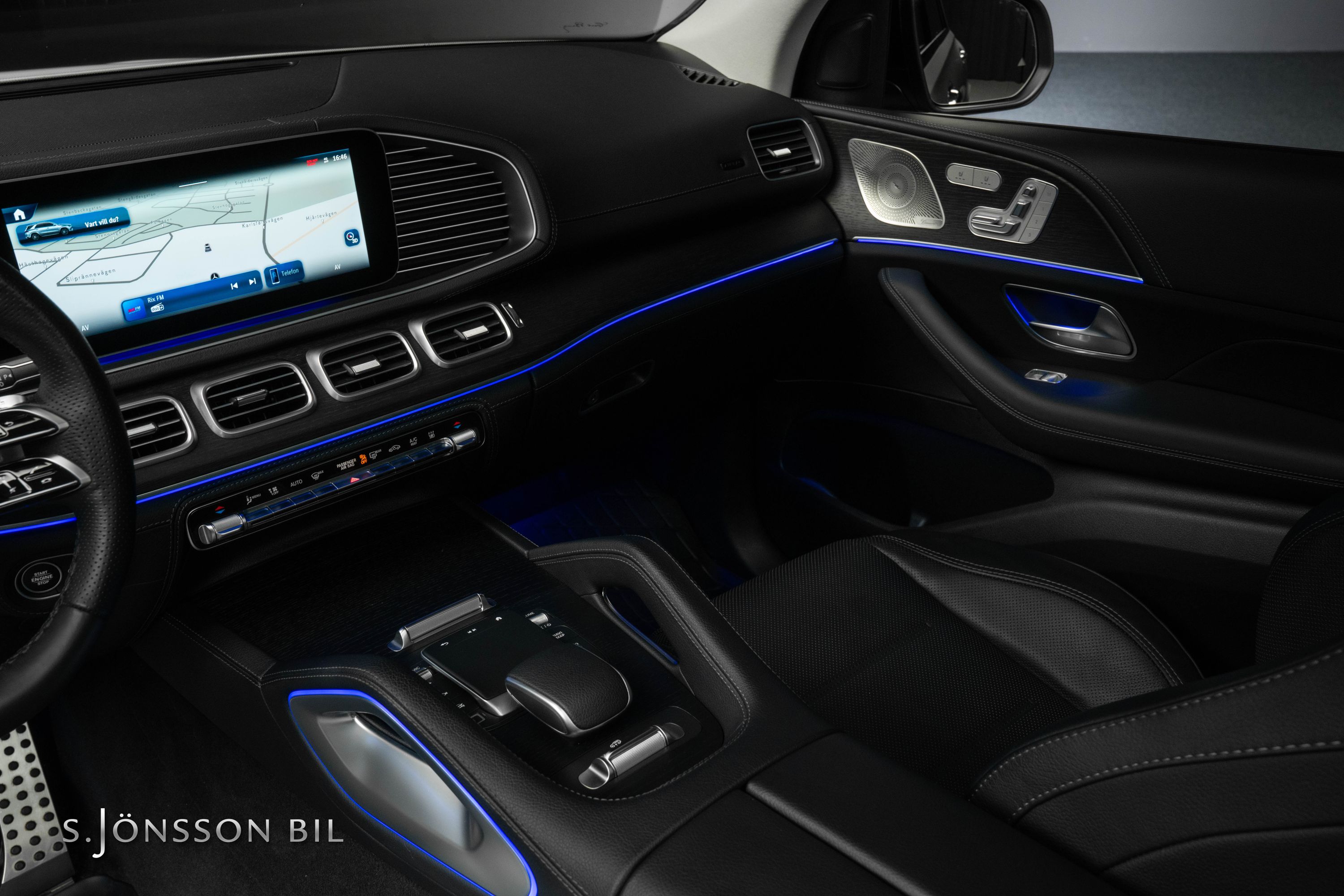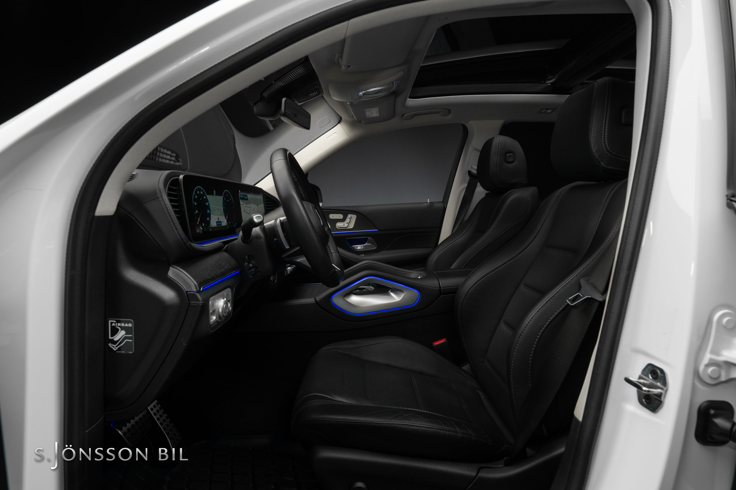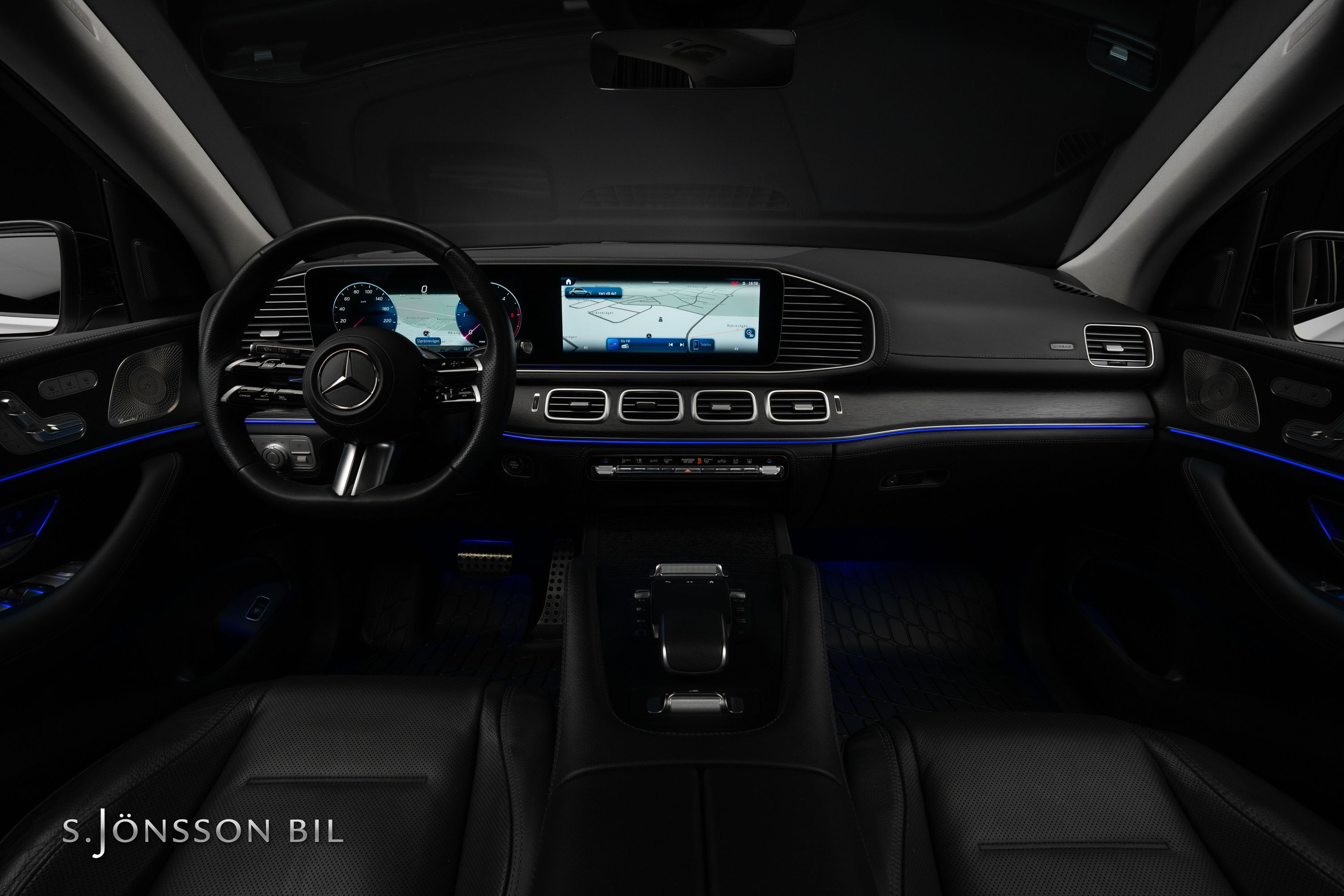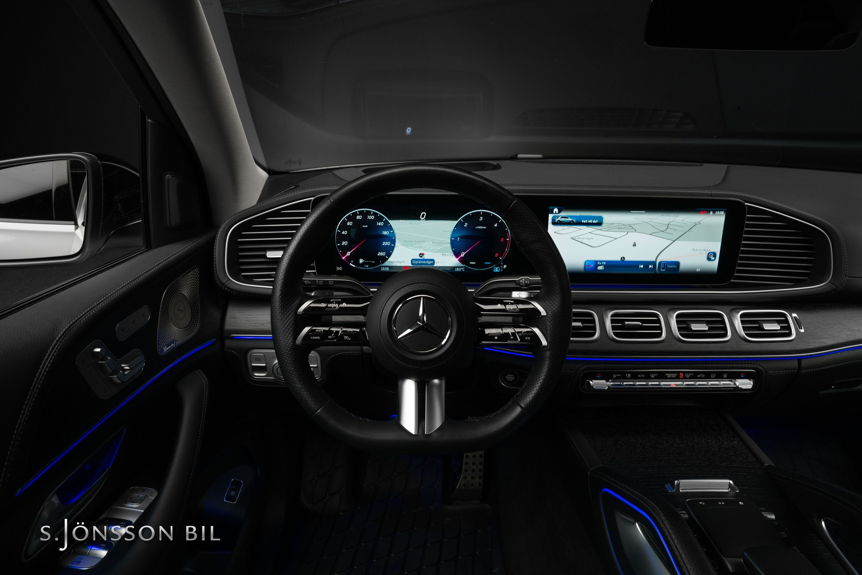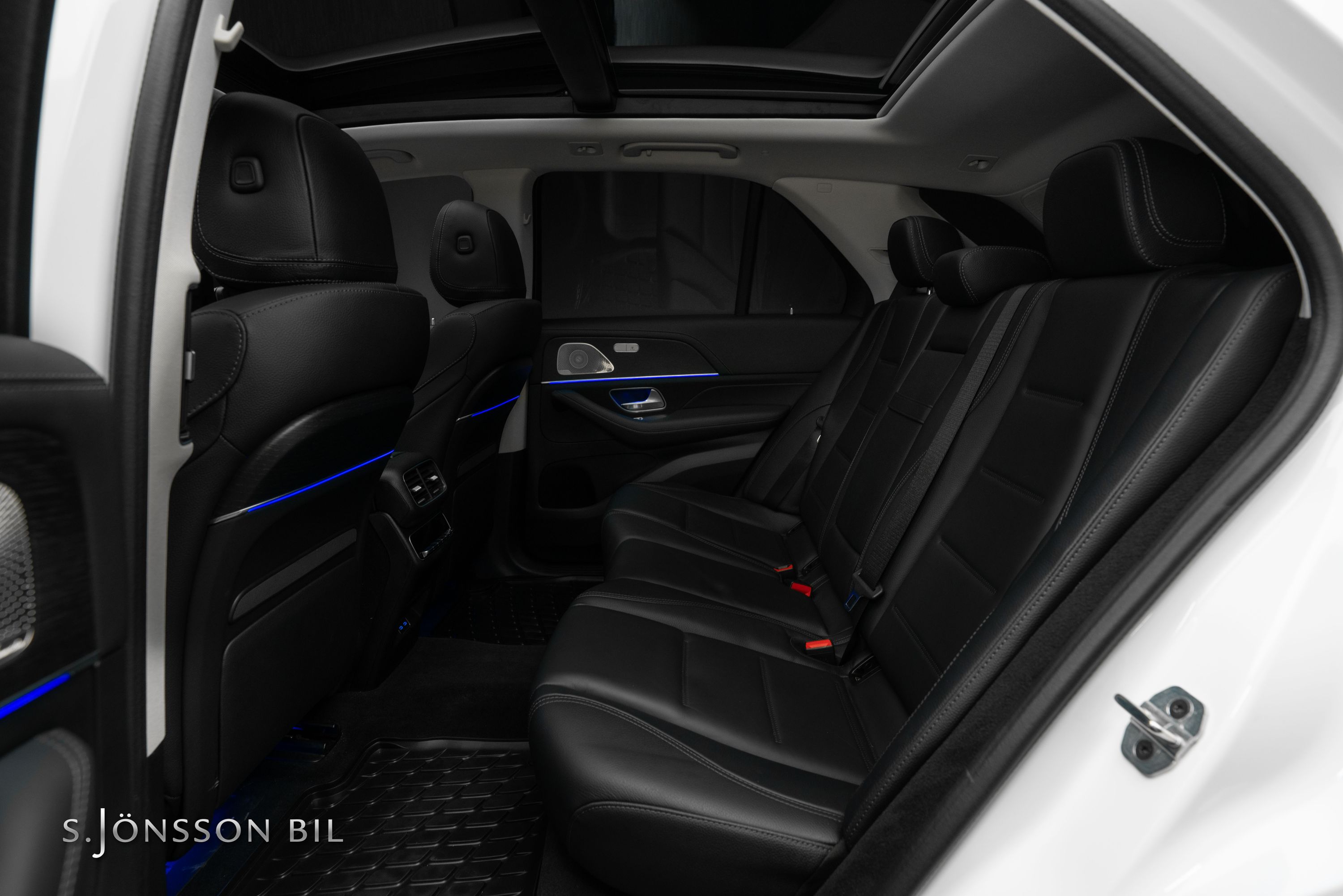 Mercedes-Benz GLE 450 d 4MATIC lackerad i Opalith White metallic. Inredning med svart läder och grå kontrastsömmar.