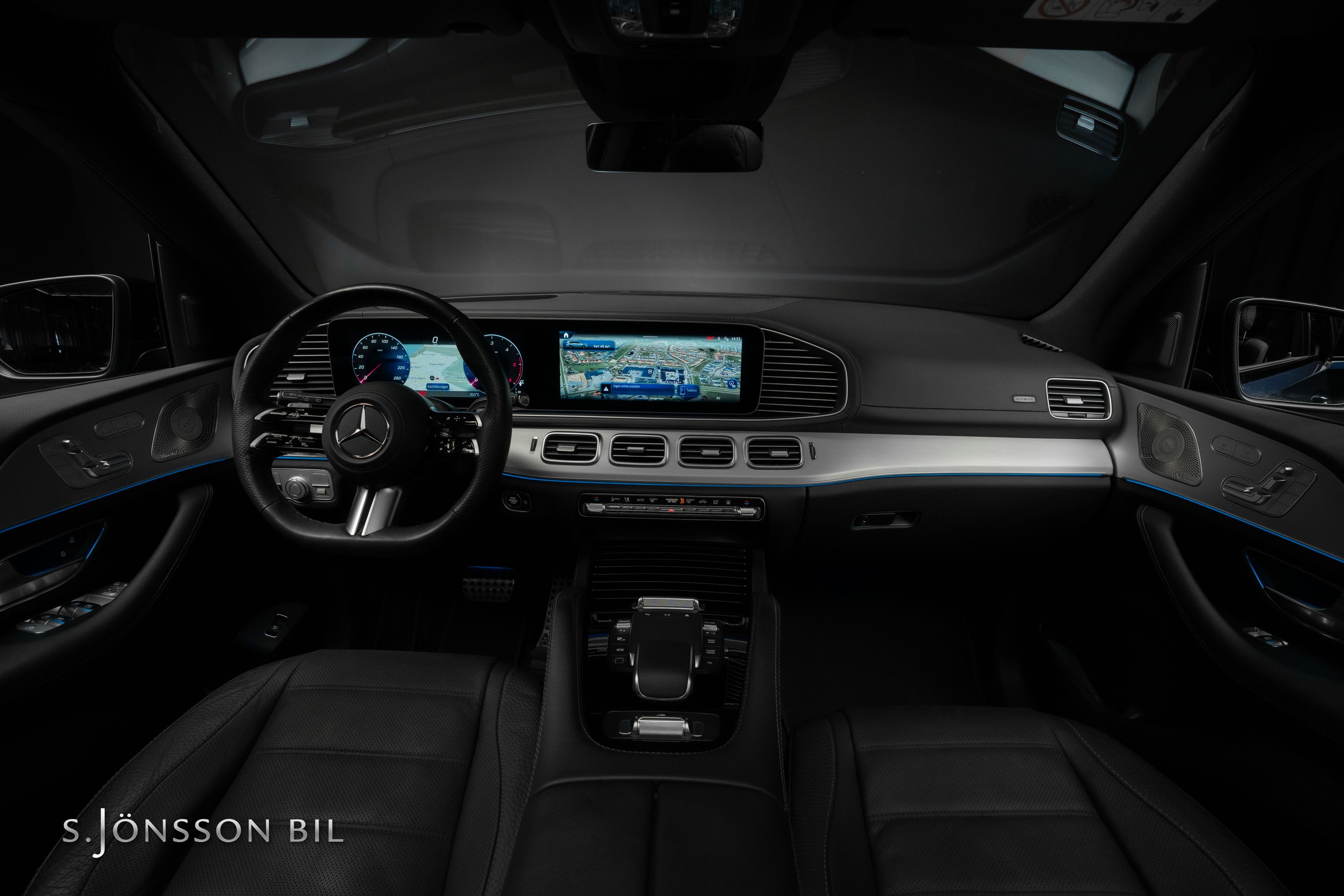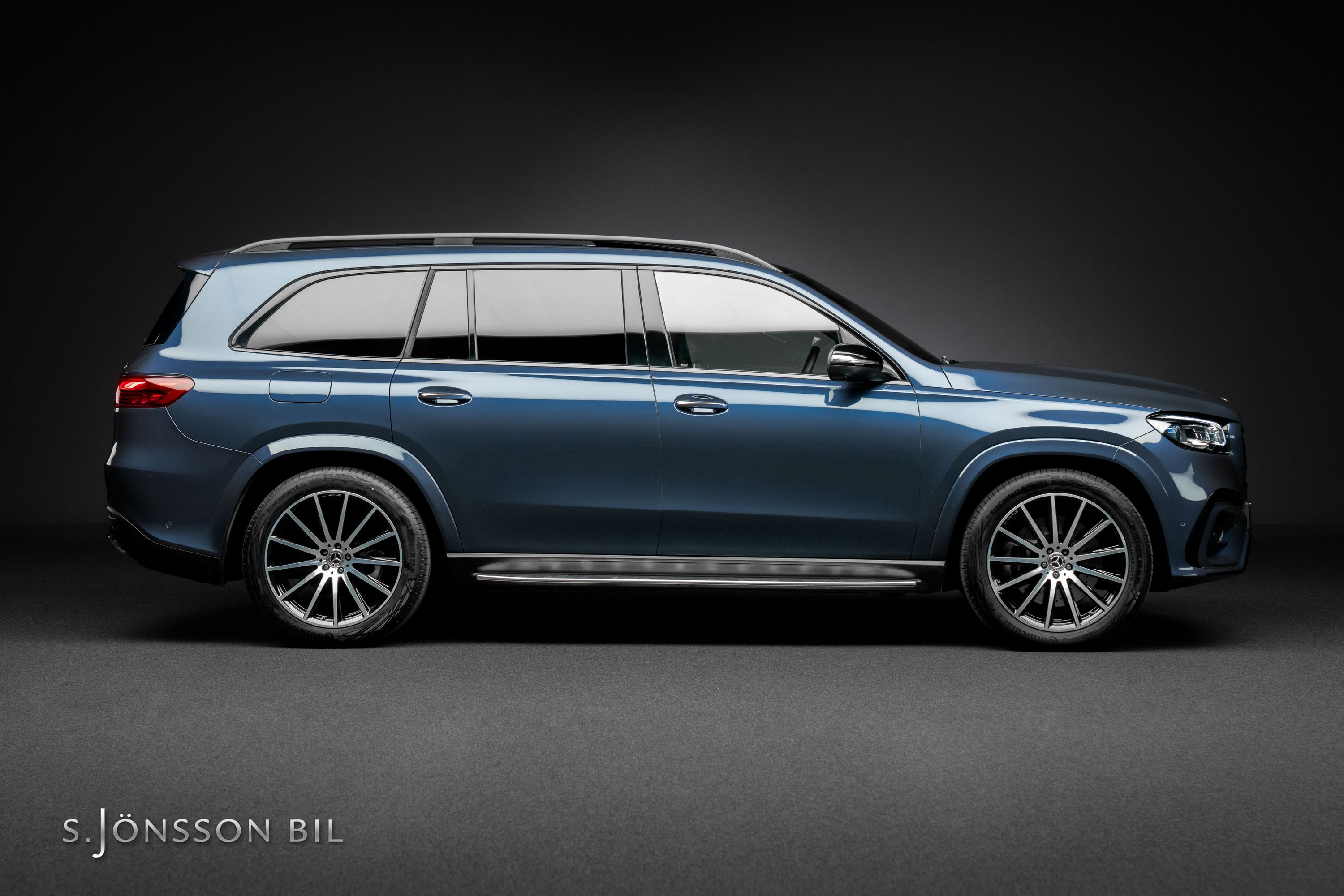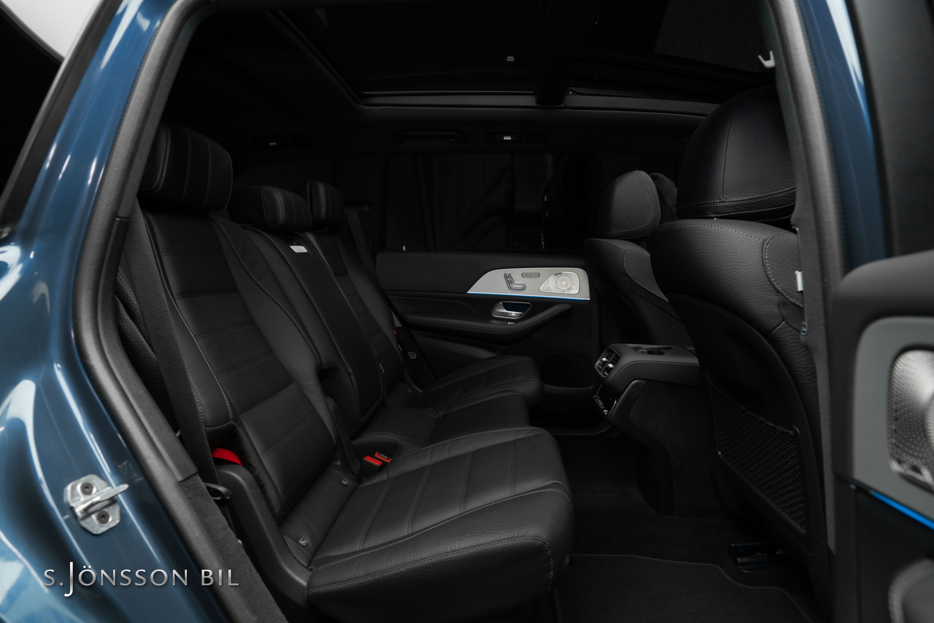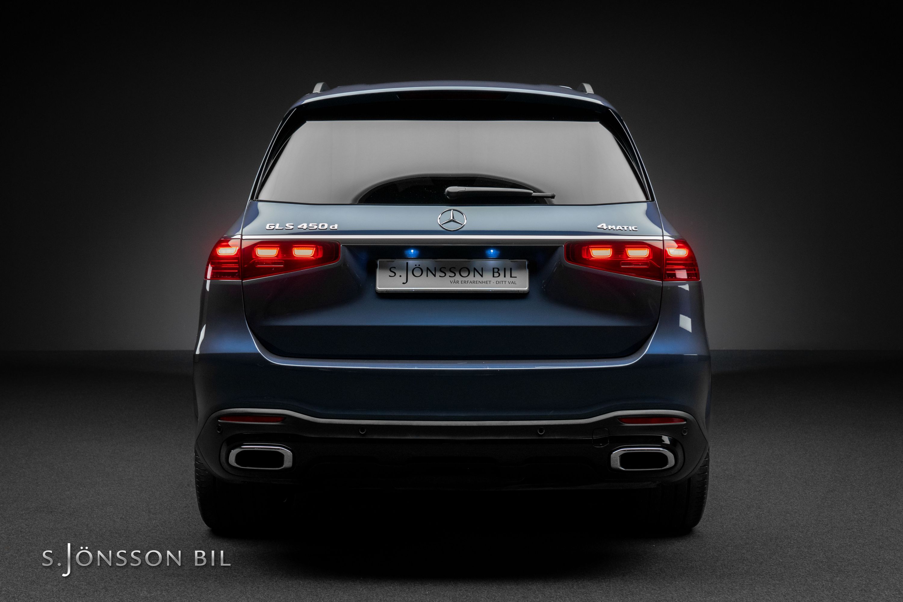 Mercedes-Benz GLS 450 d AMG 4MATIC Facelift, lackerad i Sodalite Blue Metallic med läderinteriör i svart. Under huven sitter en rak sexcylindrig dieselmotor som levererar 367 hk och 750 Nm. Bränsleförbrukningen är låga 0.88 liter/mil enligt WLTP, vid landsvägskörning 0.71 liter/mil.