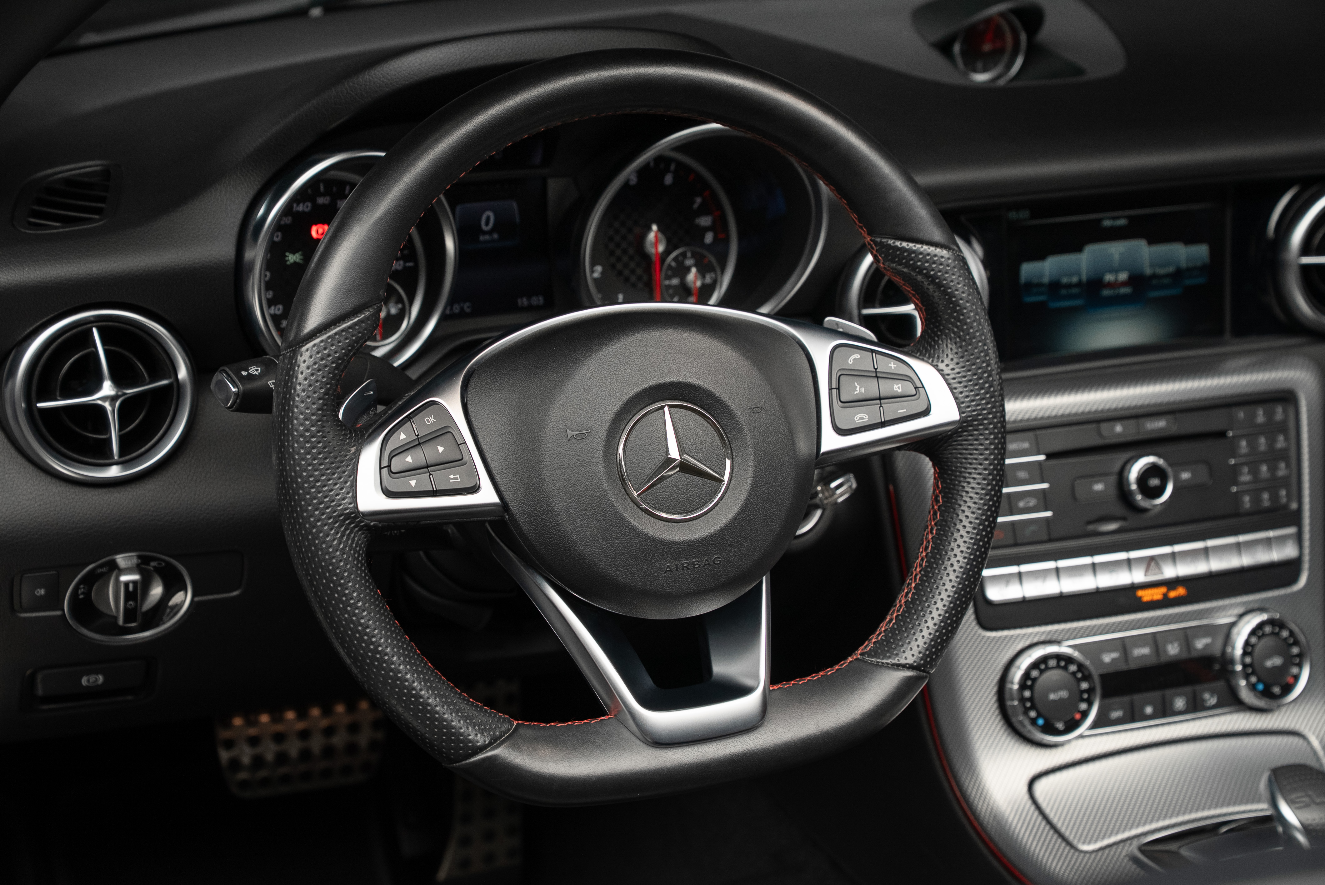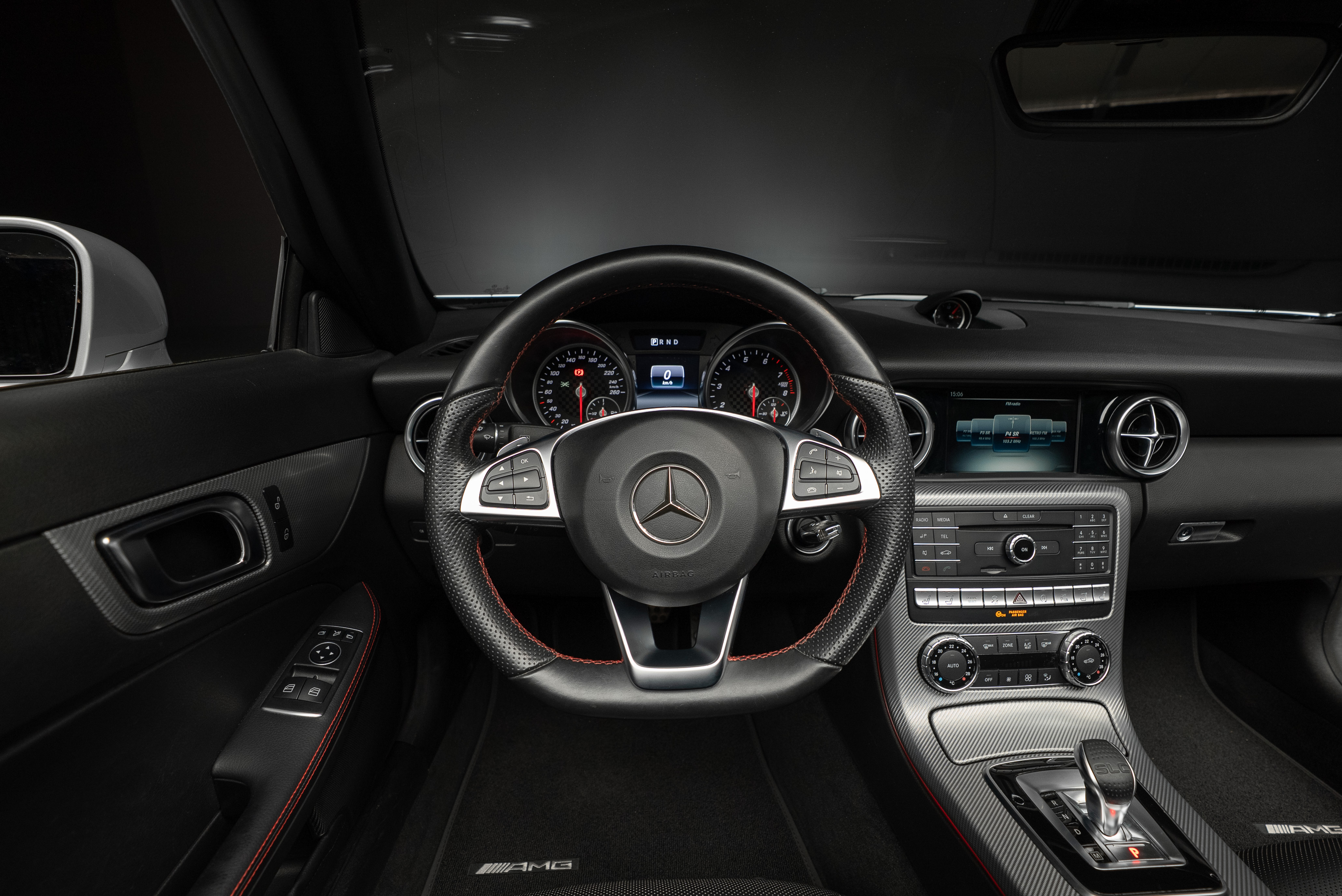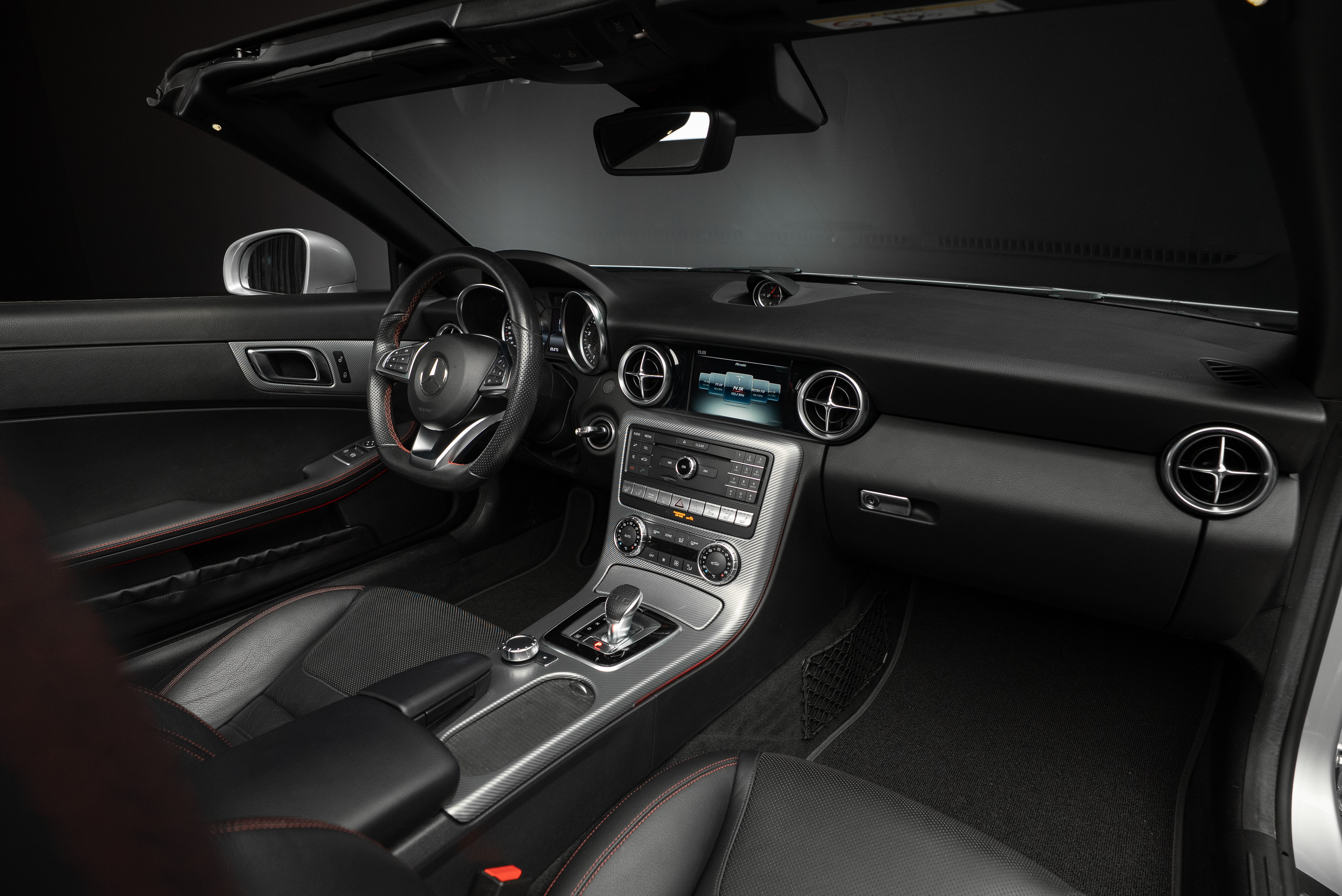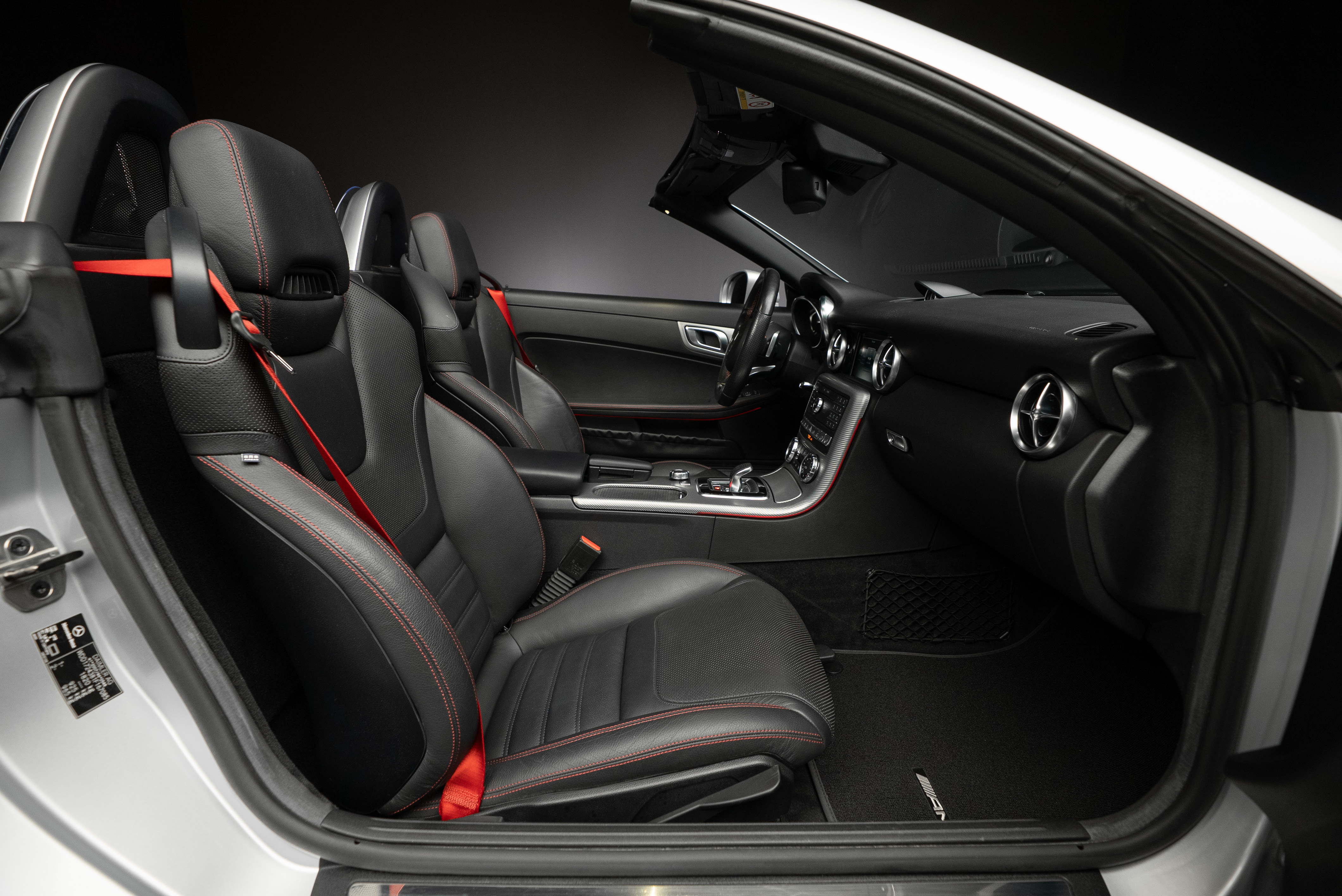 Mercedes-Benz SLC 300 Lackerad i den populära kulören iridium silver metallic med svart läder interiör och röda sömmar.