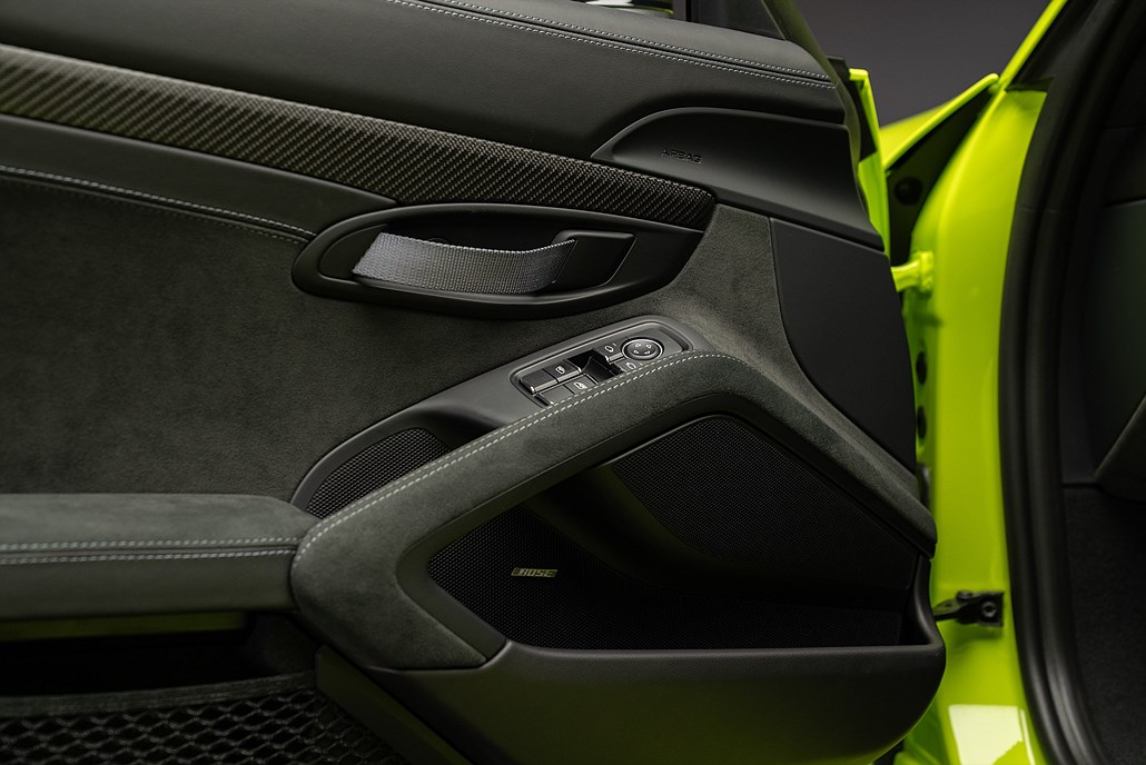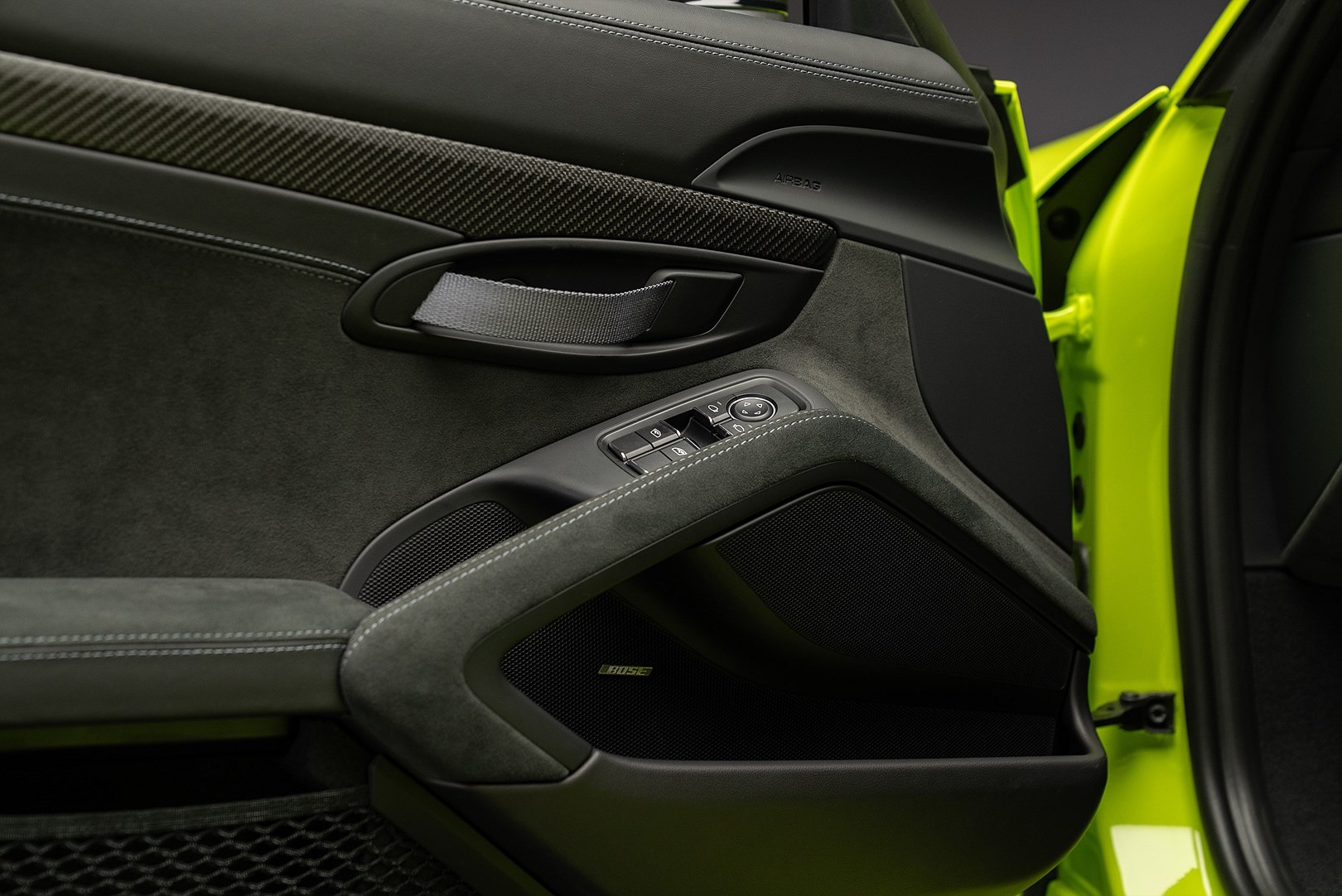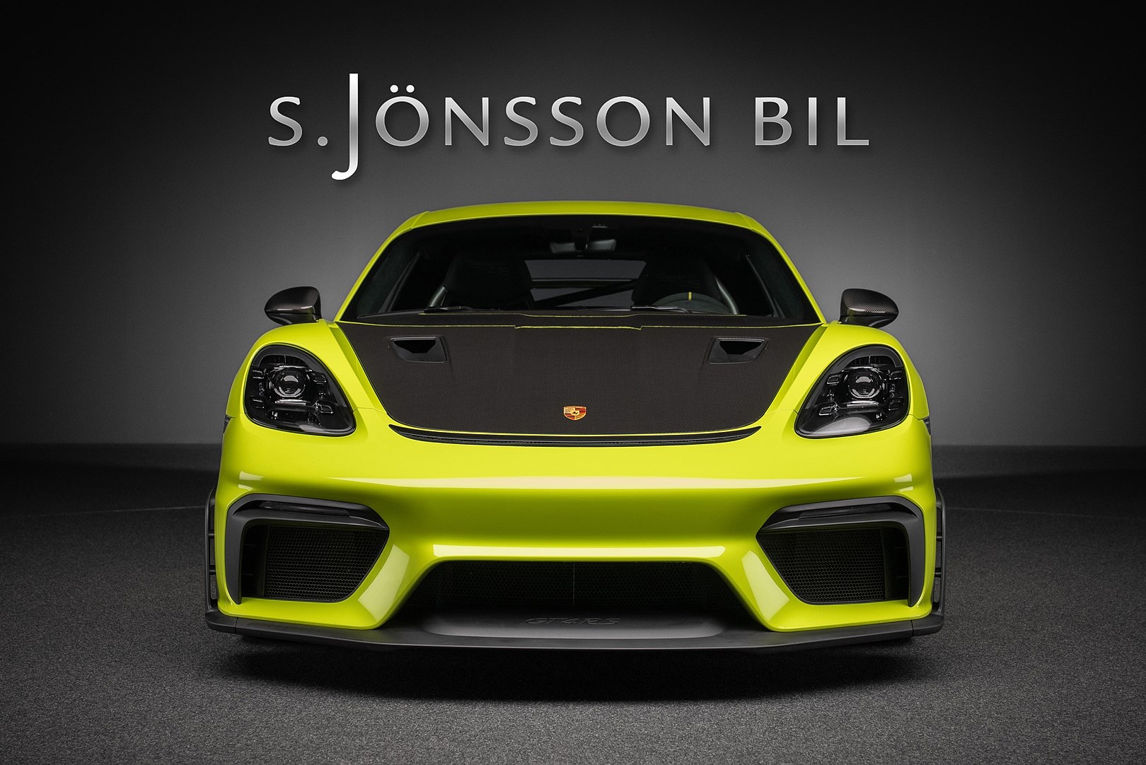 Porsche 718 Cayman GT4 RS lackerad i pts-färgen Acid Green med läderinteriör weissach black/artic grey med utökat läder samt race-tex. Bilen är extrautrustad för 408.100 kr.