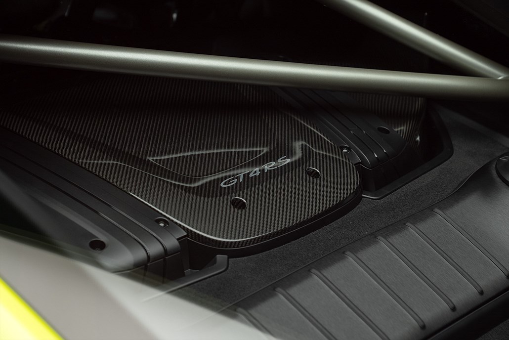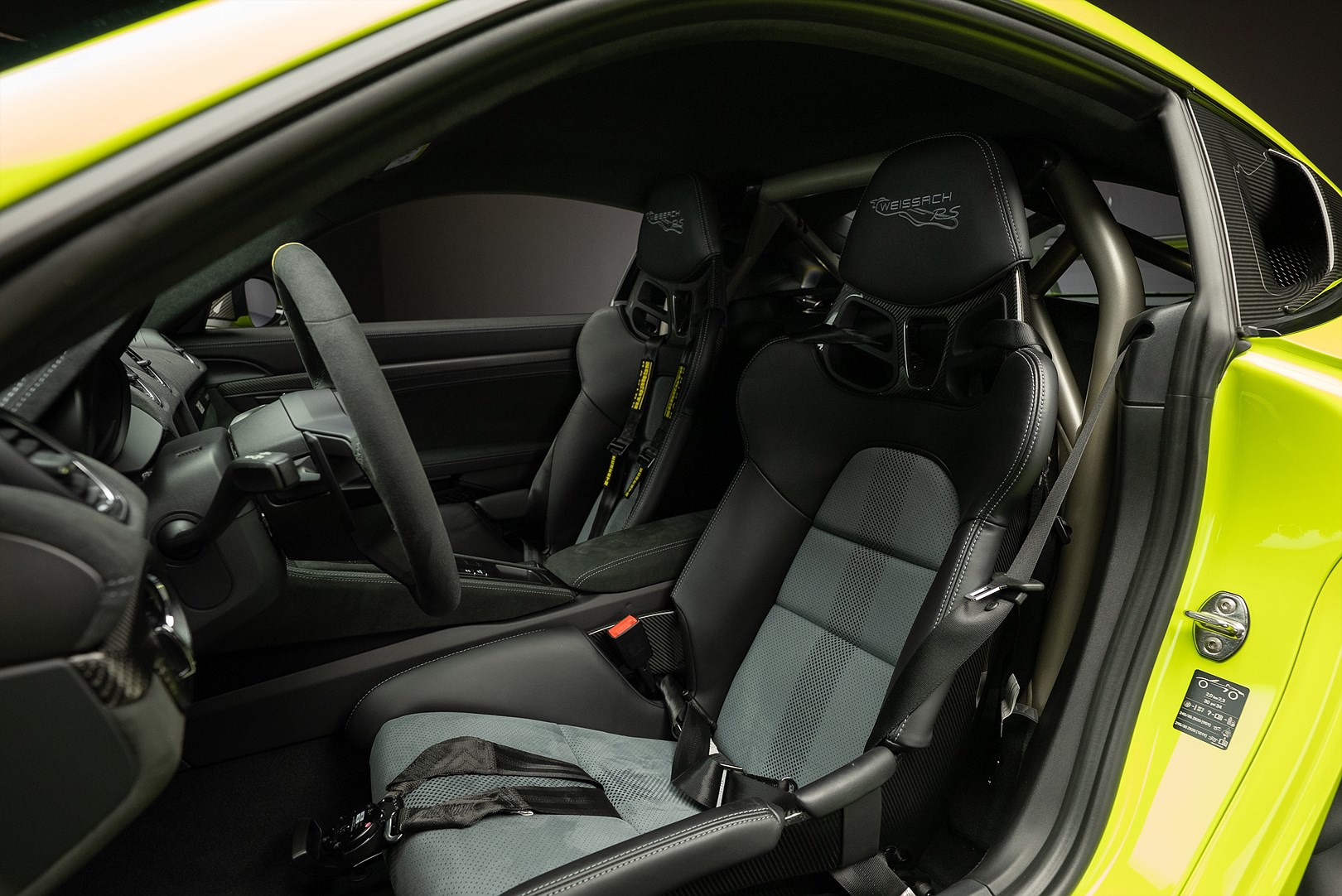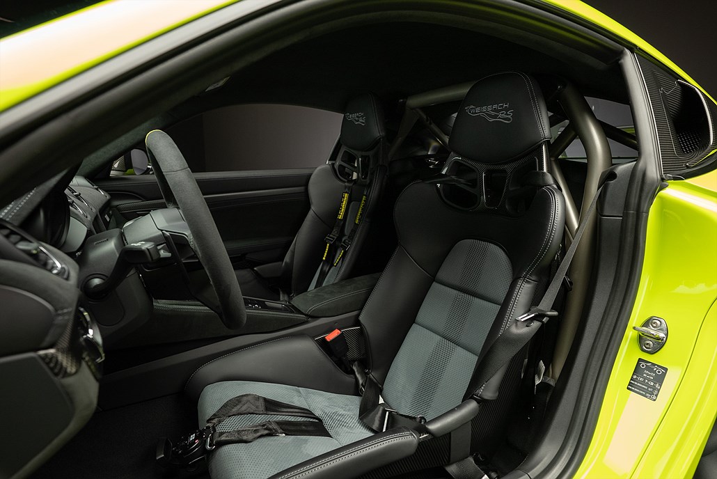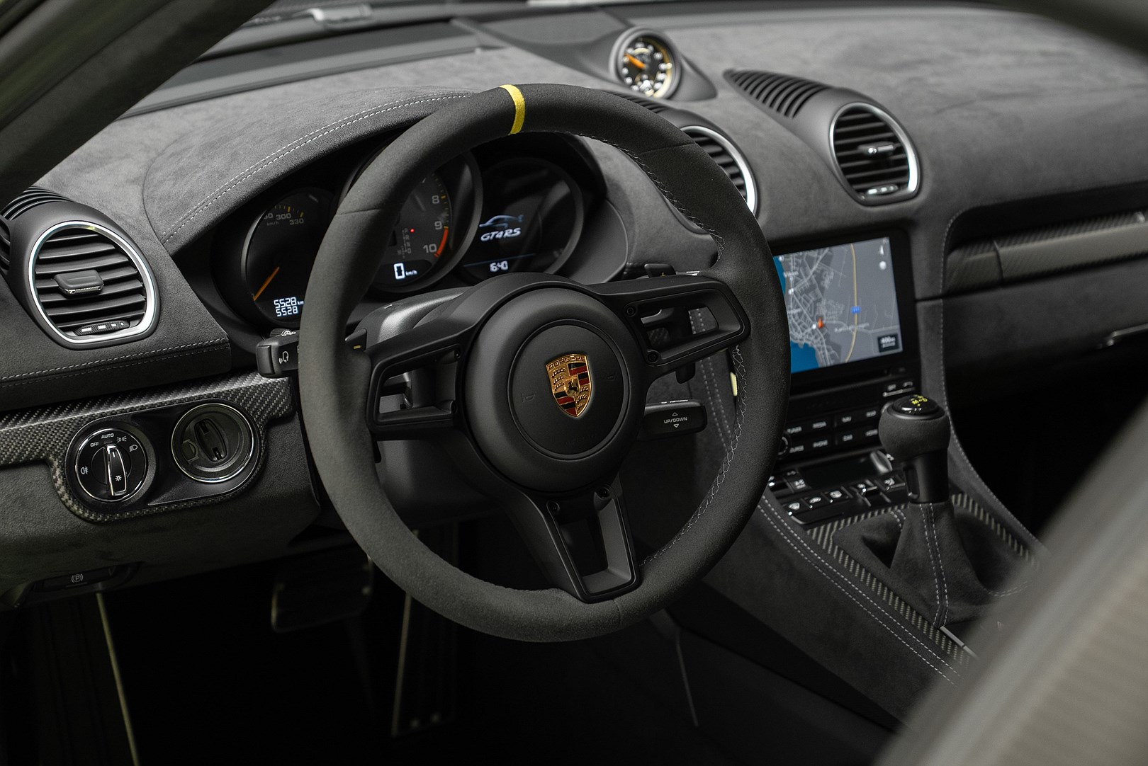 Porsche 718 Cayman GT4 RS lackerad i pts-färgen Acid Green med läderinteriör weissach black/artic grey med utökat läder samt race-tex. Bilen är extrautrustad för 408.100 kr.