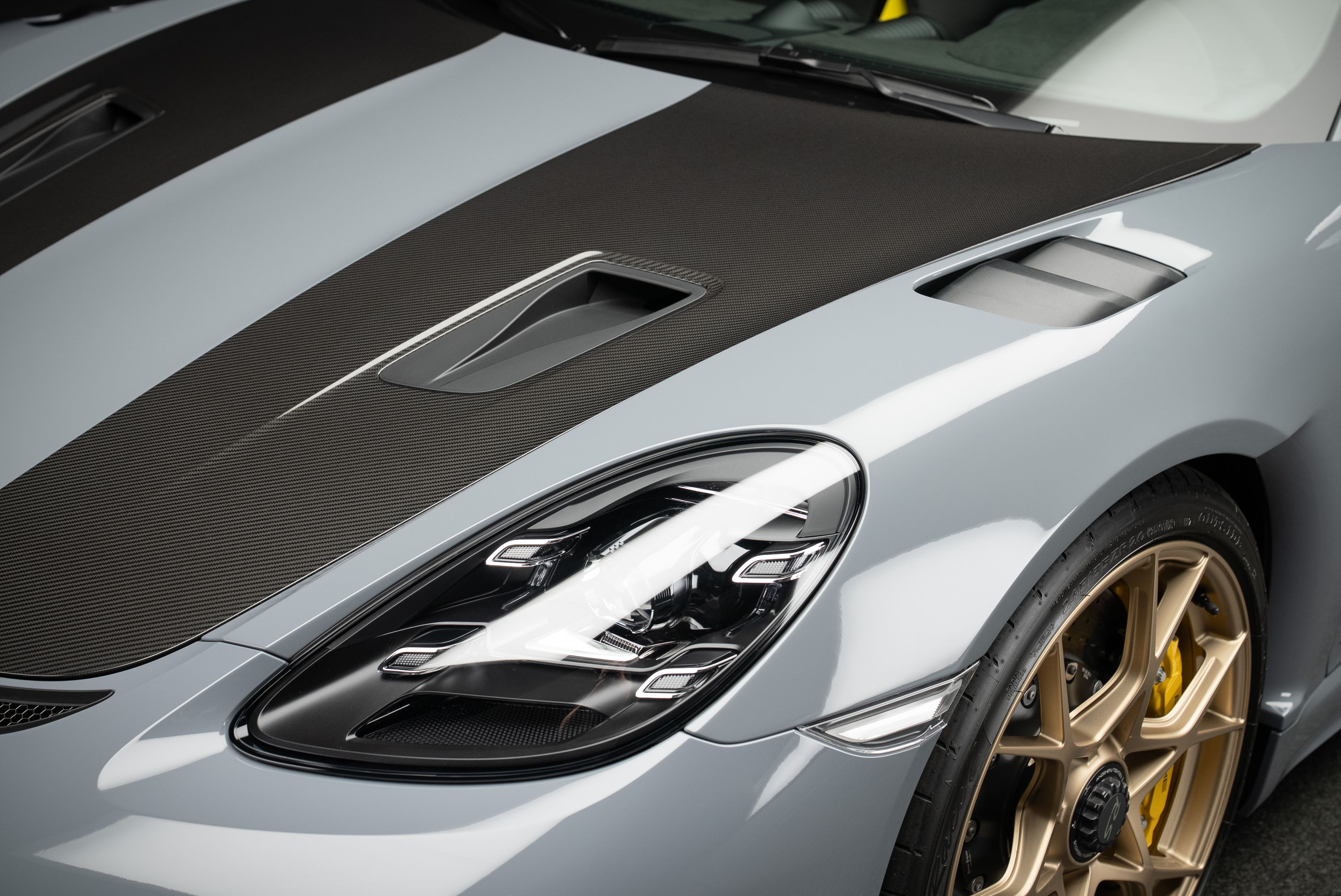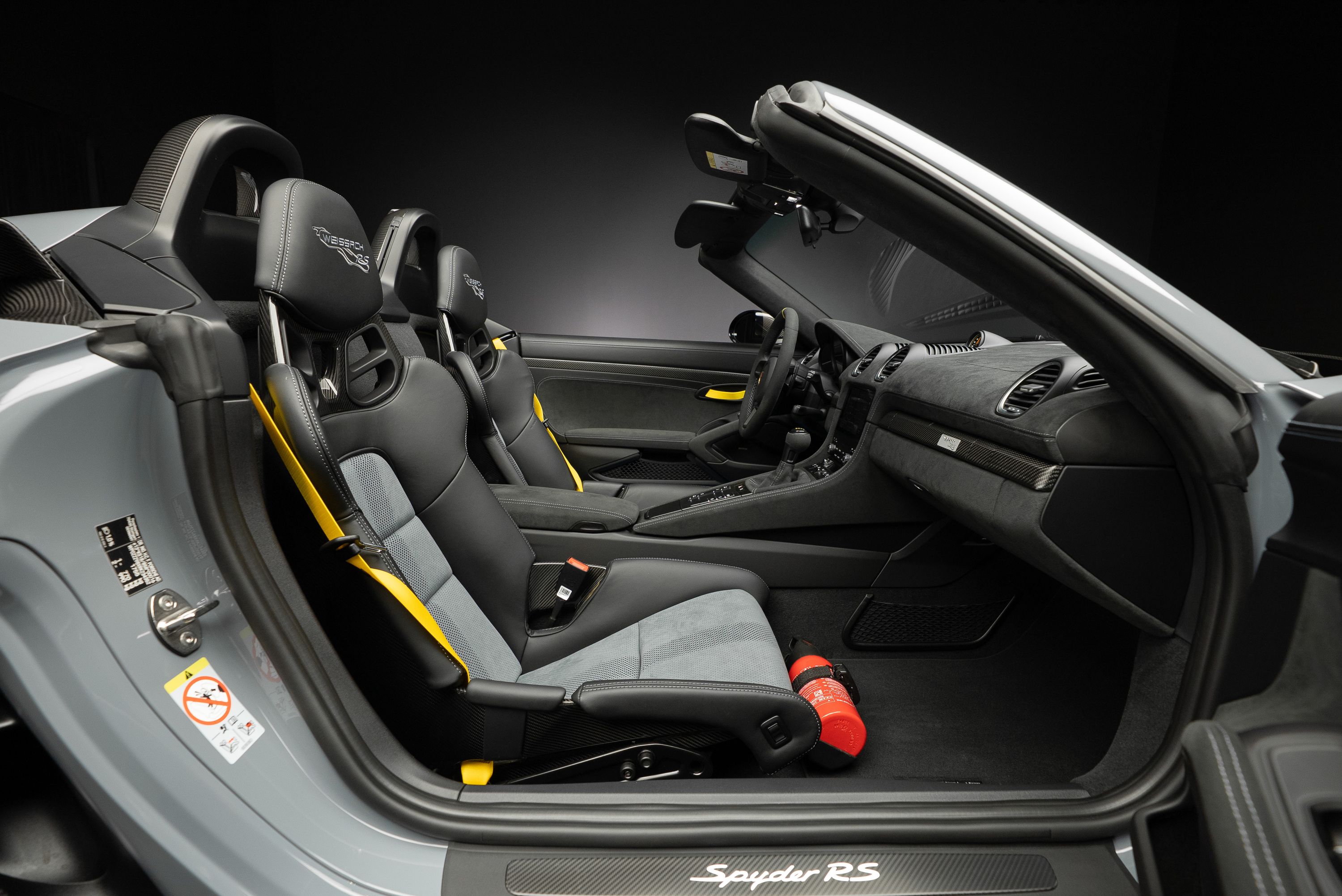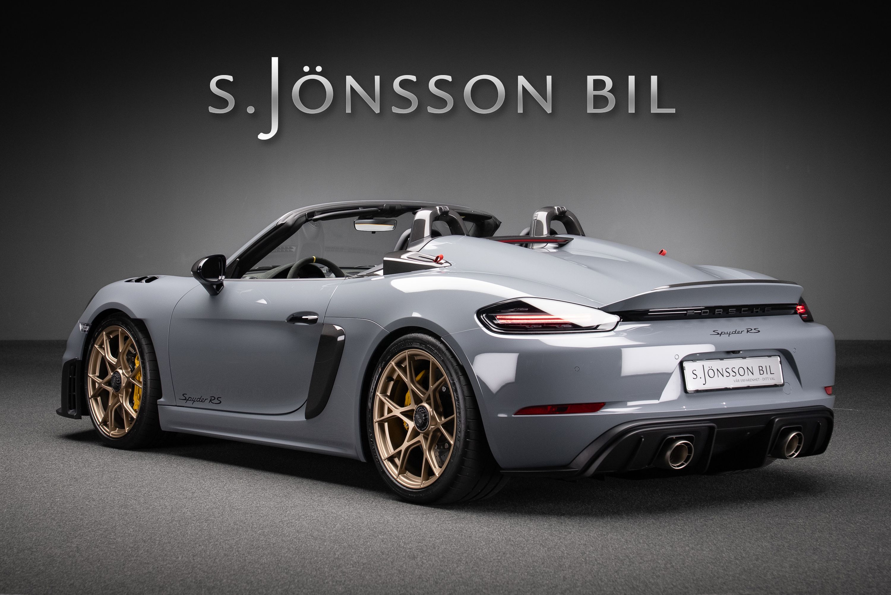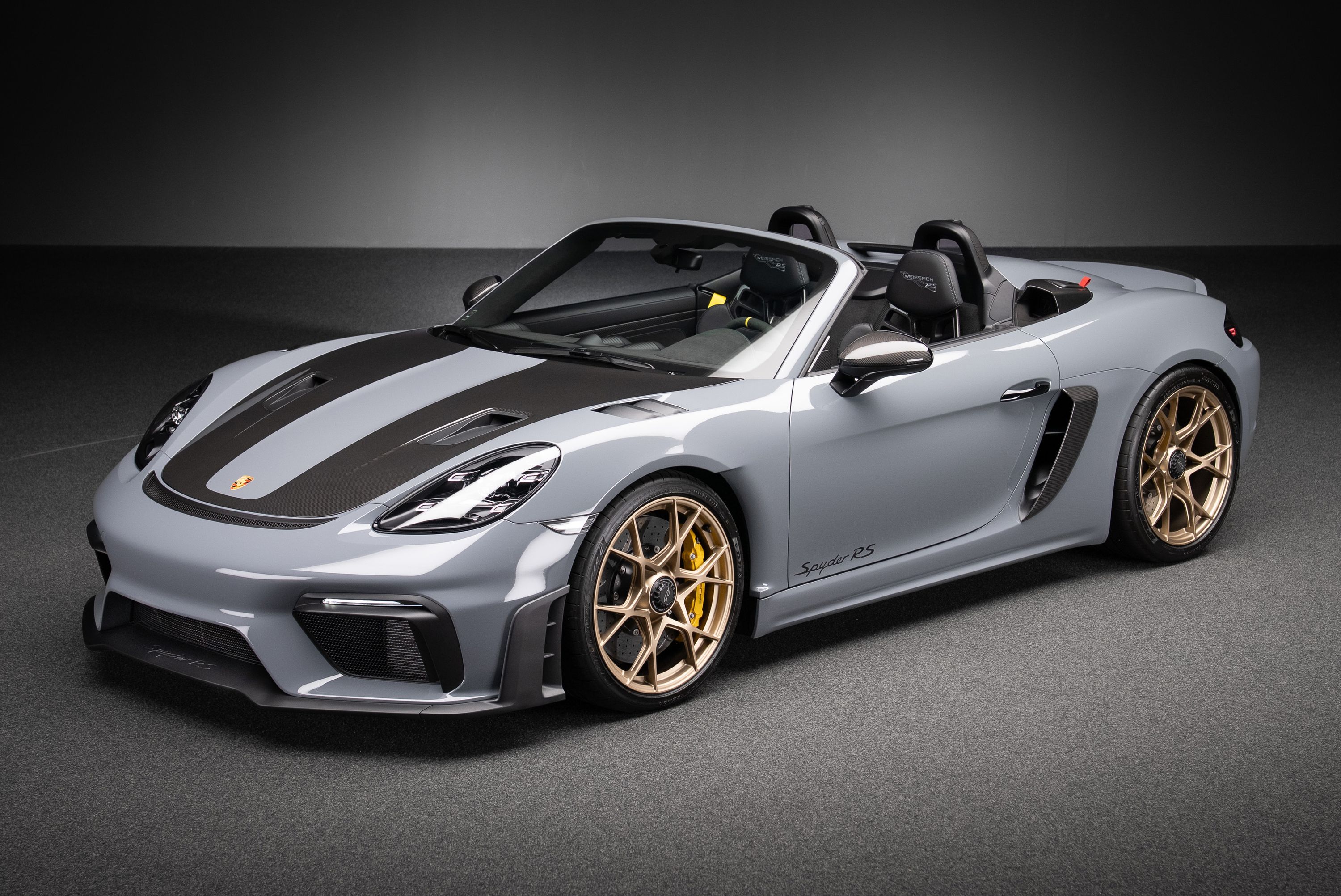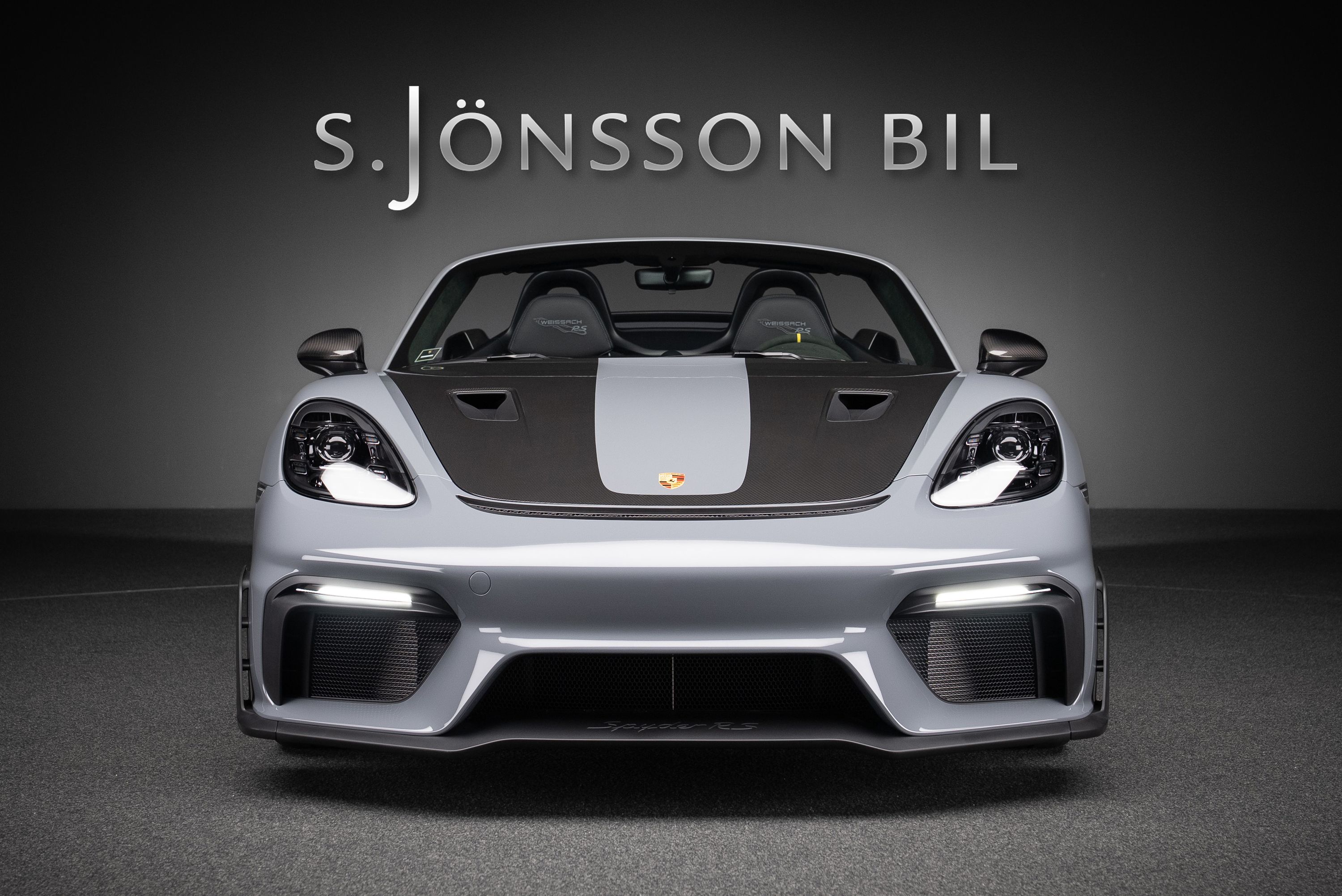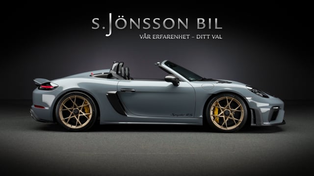 Porsche 718 Spyder RS med Weissach-paket, lackerad i Arctic Grey med fälgar i Satin Neodyme. Utrustad med samma 4.0-liters sexcylindriga boxermotor som används i 911 GT3. Med 500 hästkrafter, 9.000 varvs rödmarkering och en vikt på endast drygt 1.400 kg erbjuder bilen en upplevelse som tidigare var reserverad för renodlade banbilar.