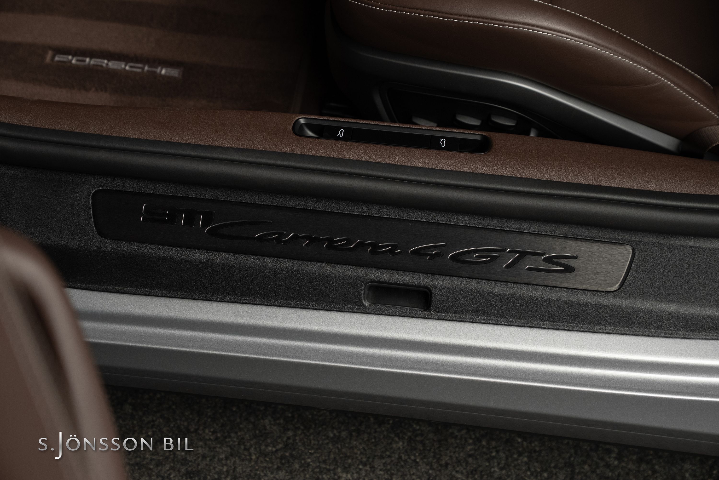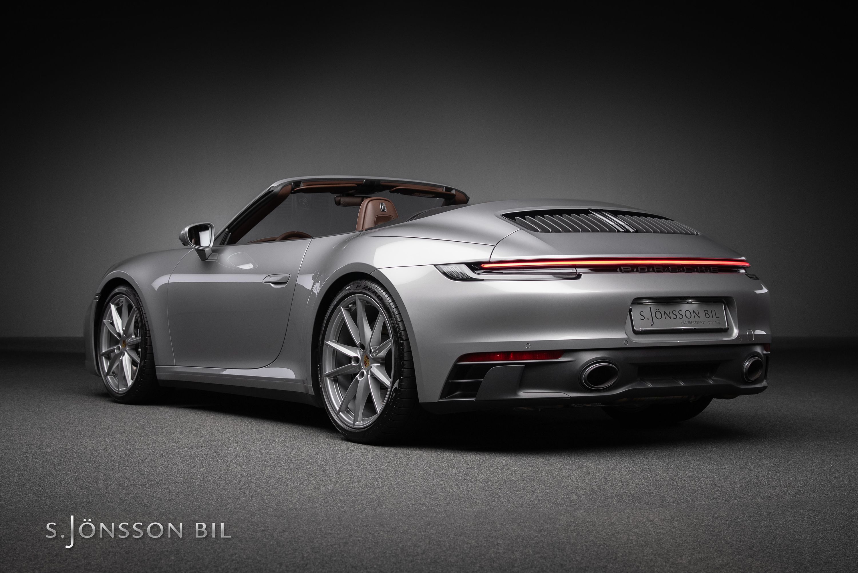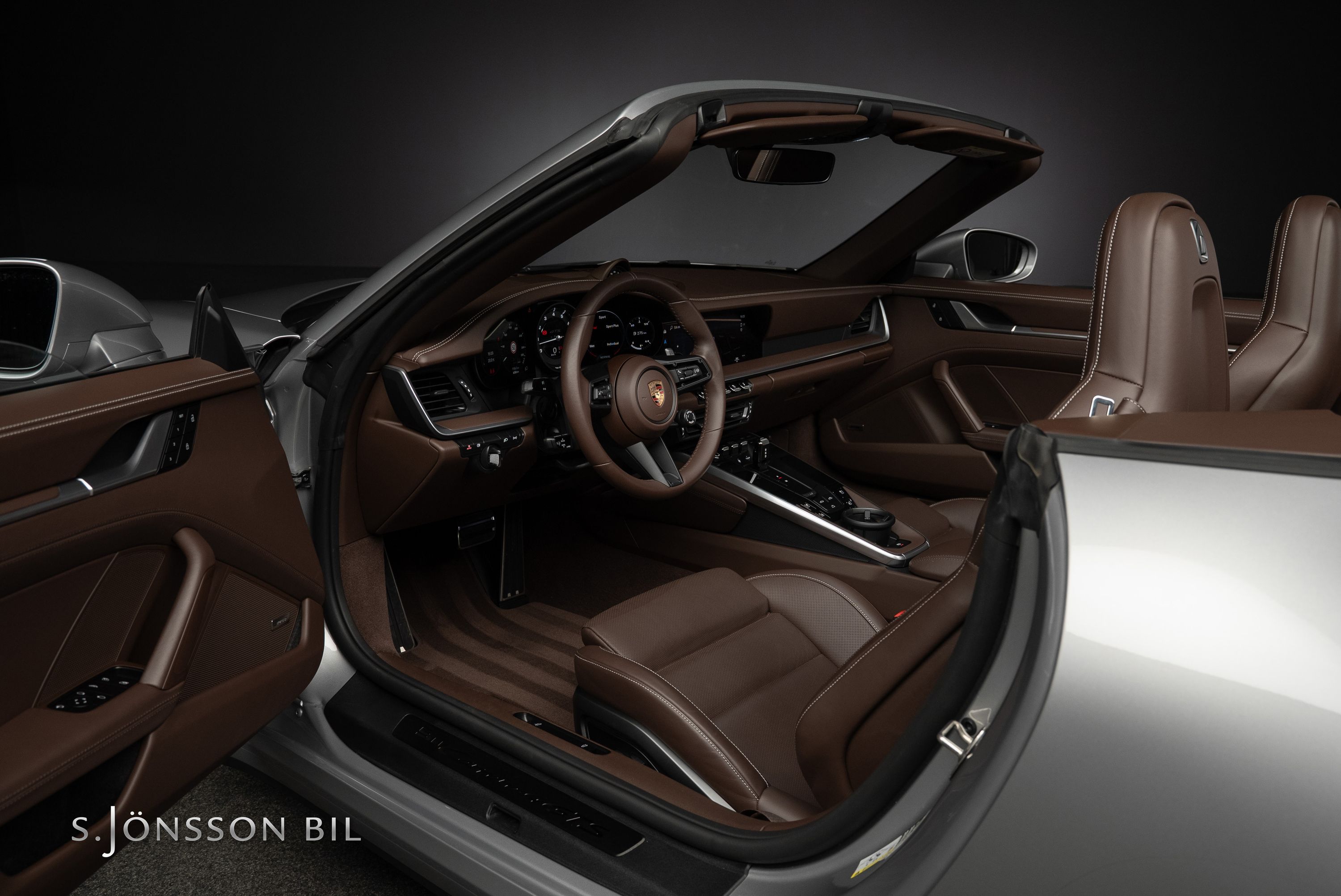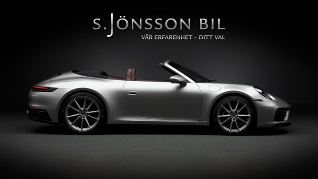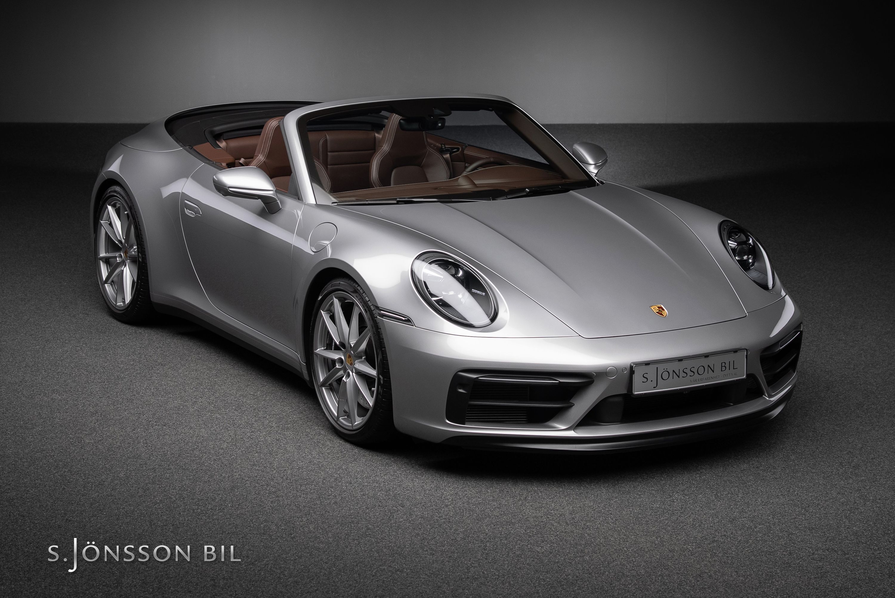 Porsche 992 Carrera 4 GTS Cabriolet, lackerad i den klassiska kulören GT-Silver metallic. Interiör med utökat Club läder i nyansen Truffle Brown och kontrastsömmar i Crayon.